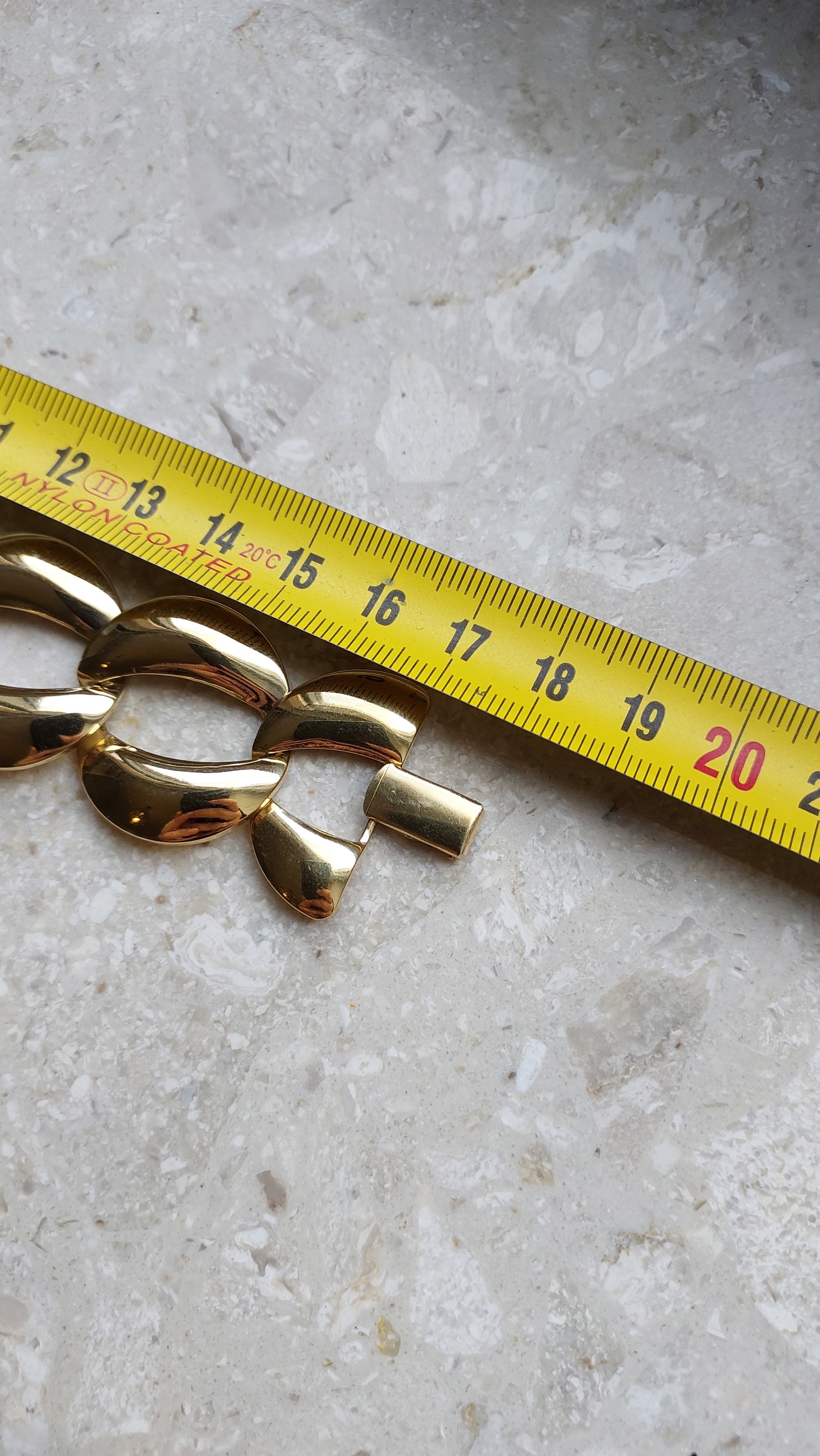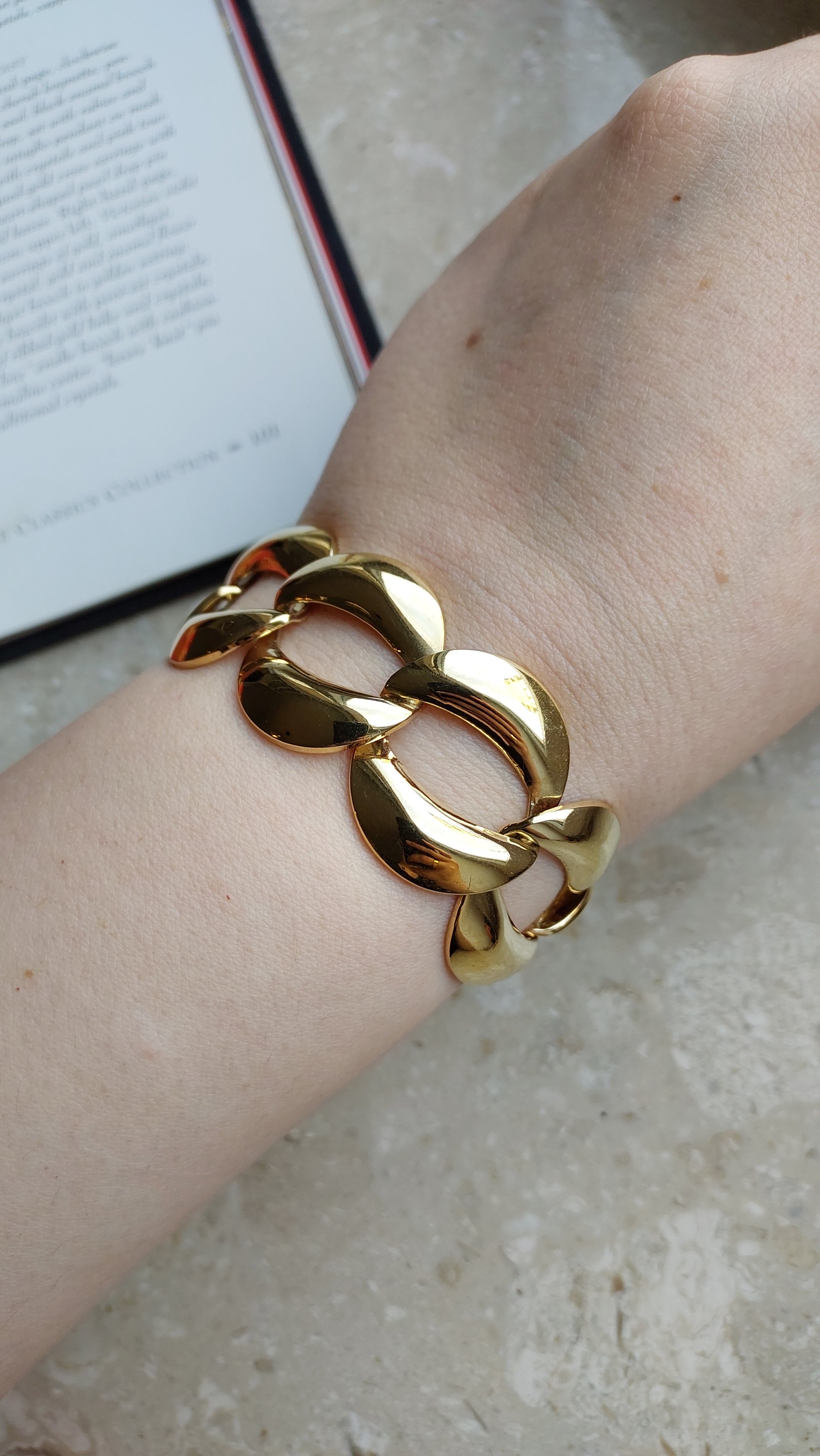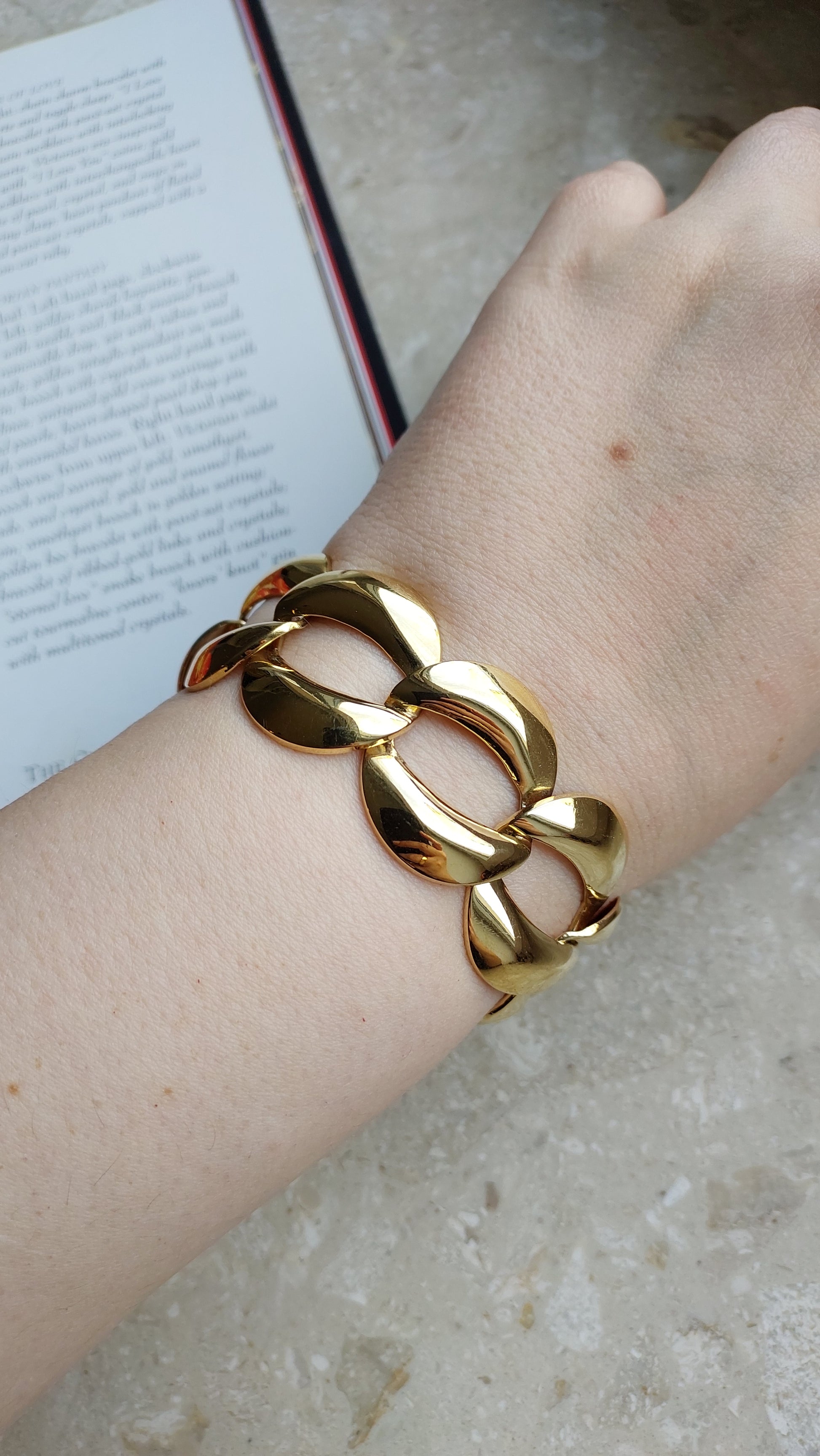 Bransoletka o efektownym designie z dużych ogniw w złocistym odcieniu, z gładką, lustrzaną powierzchnią. Minimalistyczna, a zarazem wyrazista — z łatwością stanie się centralnym akcentem stylizacji. W bardzo dobrym stanie.