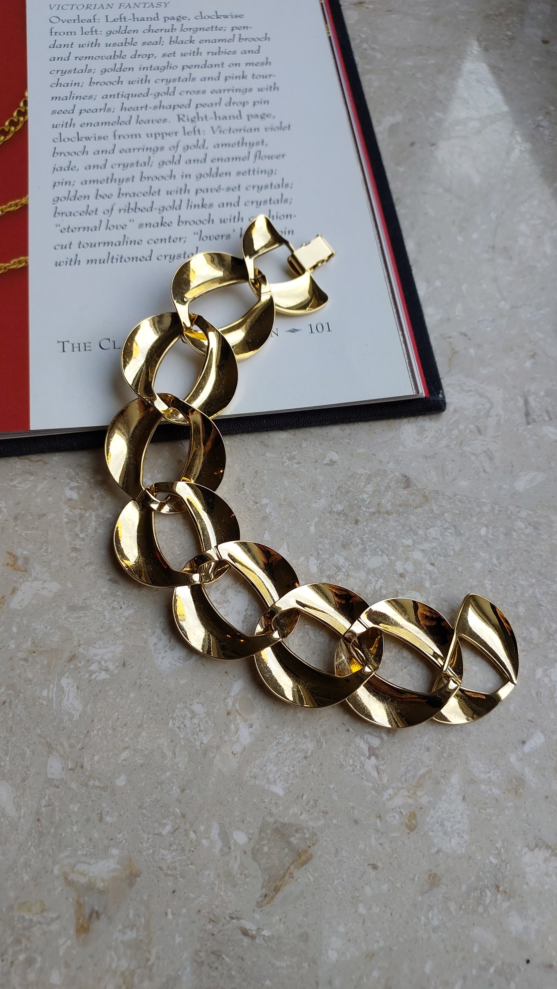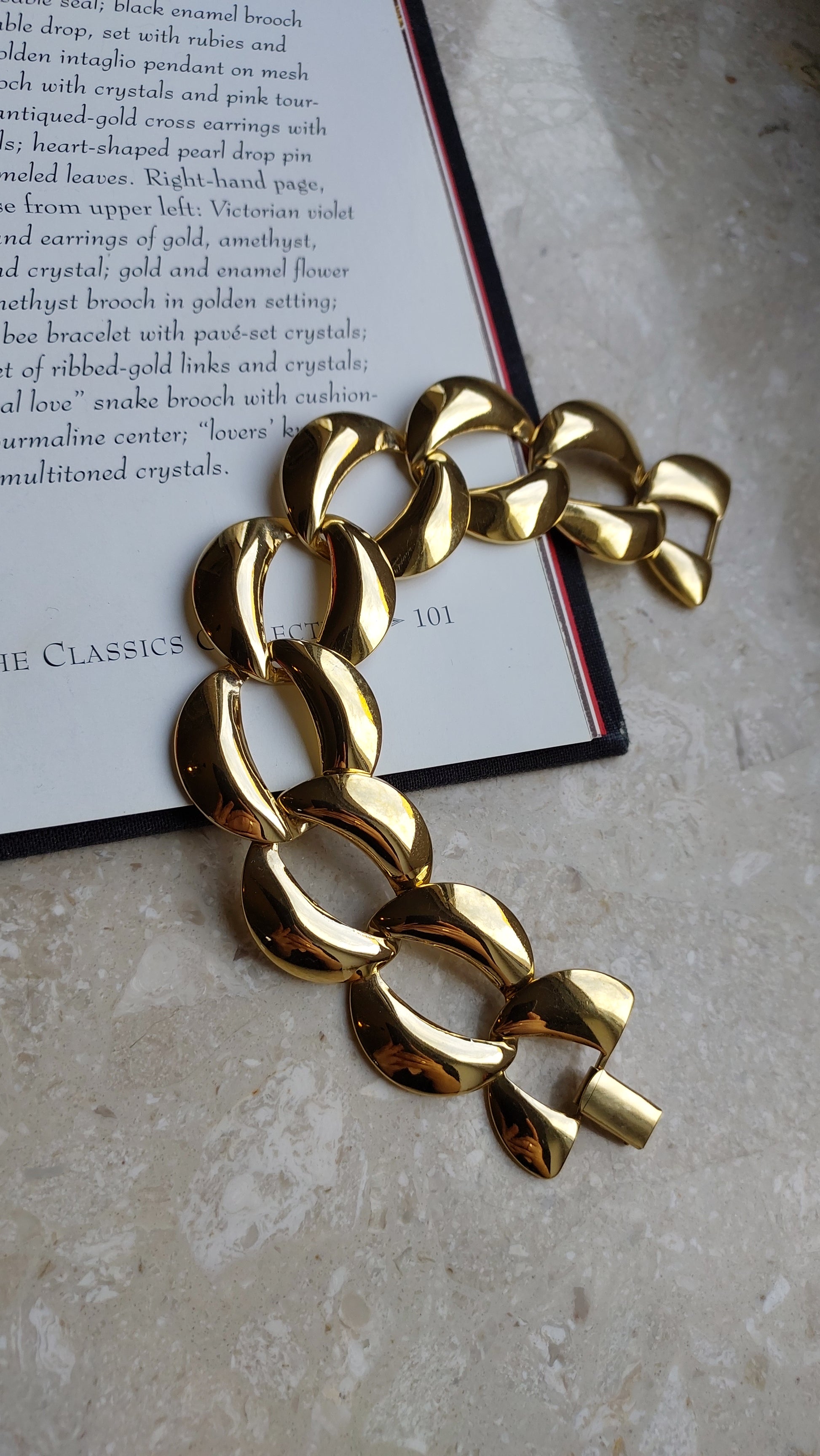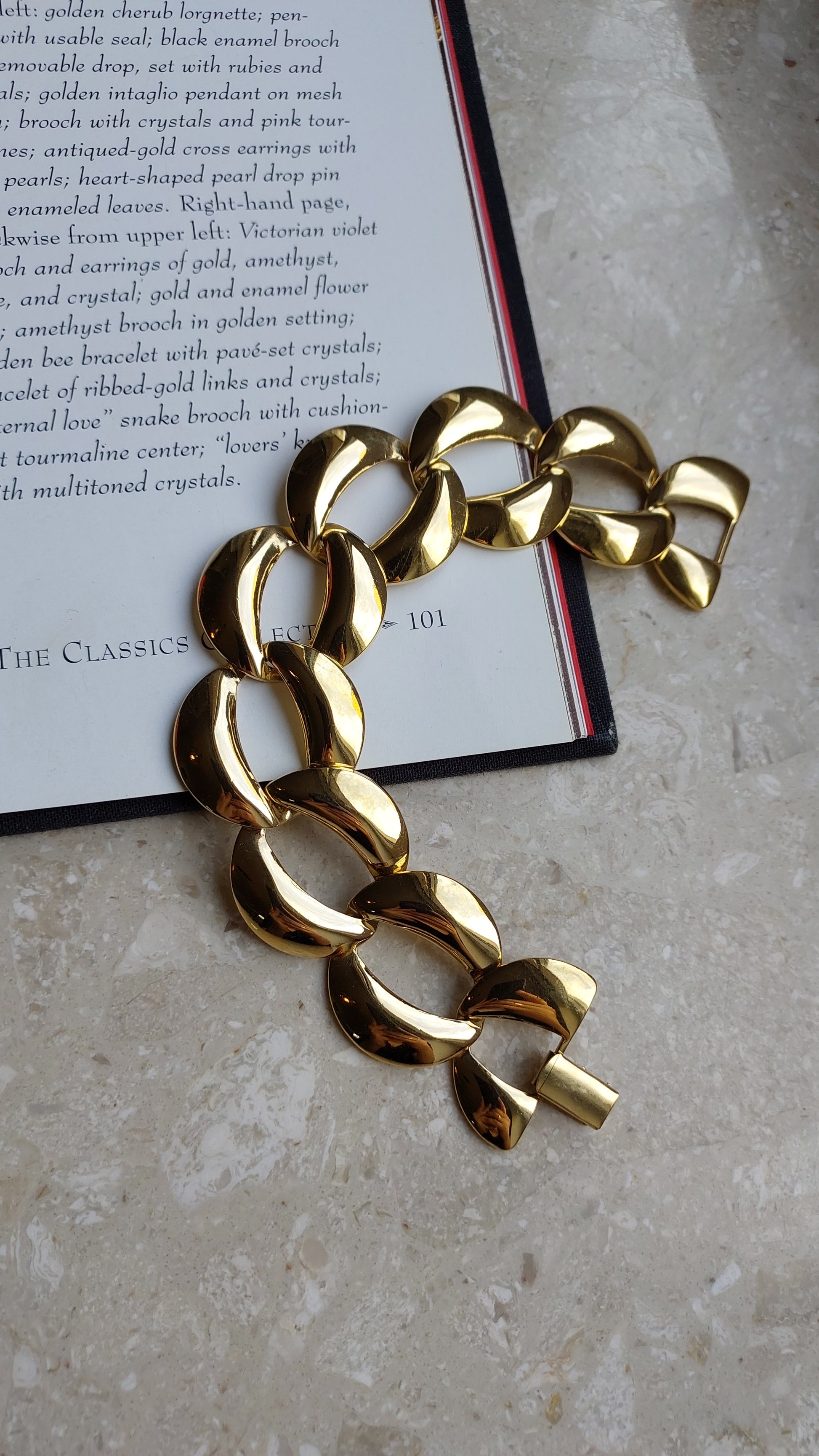 Bransoletka o efektownym designie z dużych ogniw w złocistym odcieniu, z gładką, lustrzaną powierzchnią. Minimalistyczna, a zarazem wyrazista — z łatwością stanie się centralnym akcentem stylizacji. W bardzo dobrym stanie.