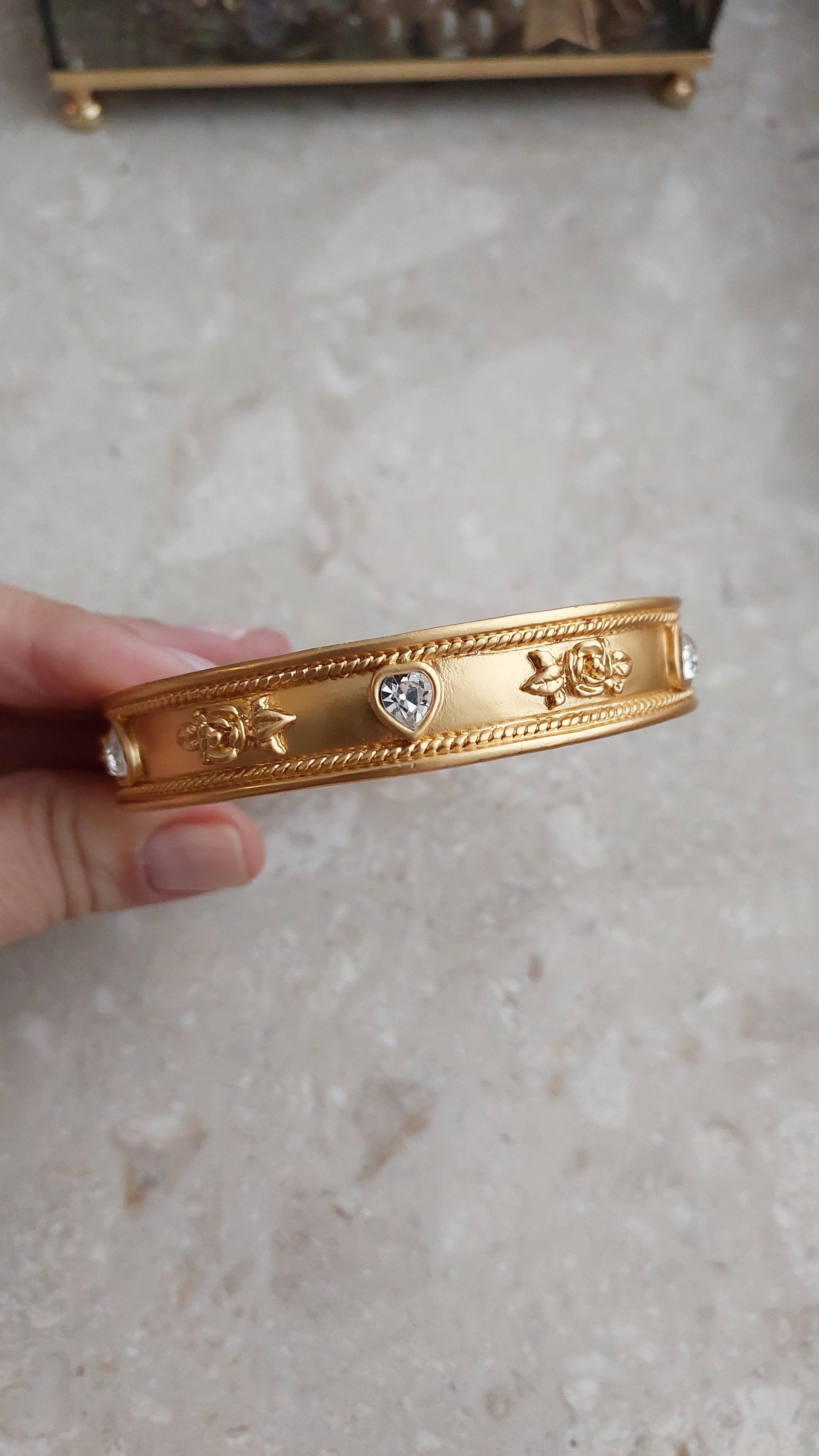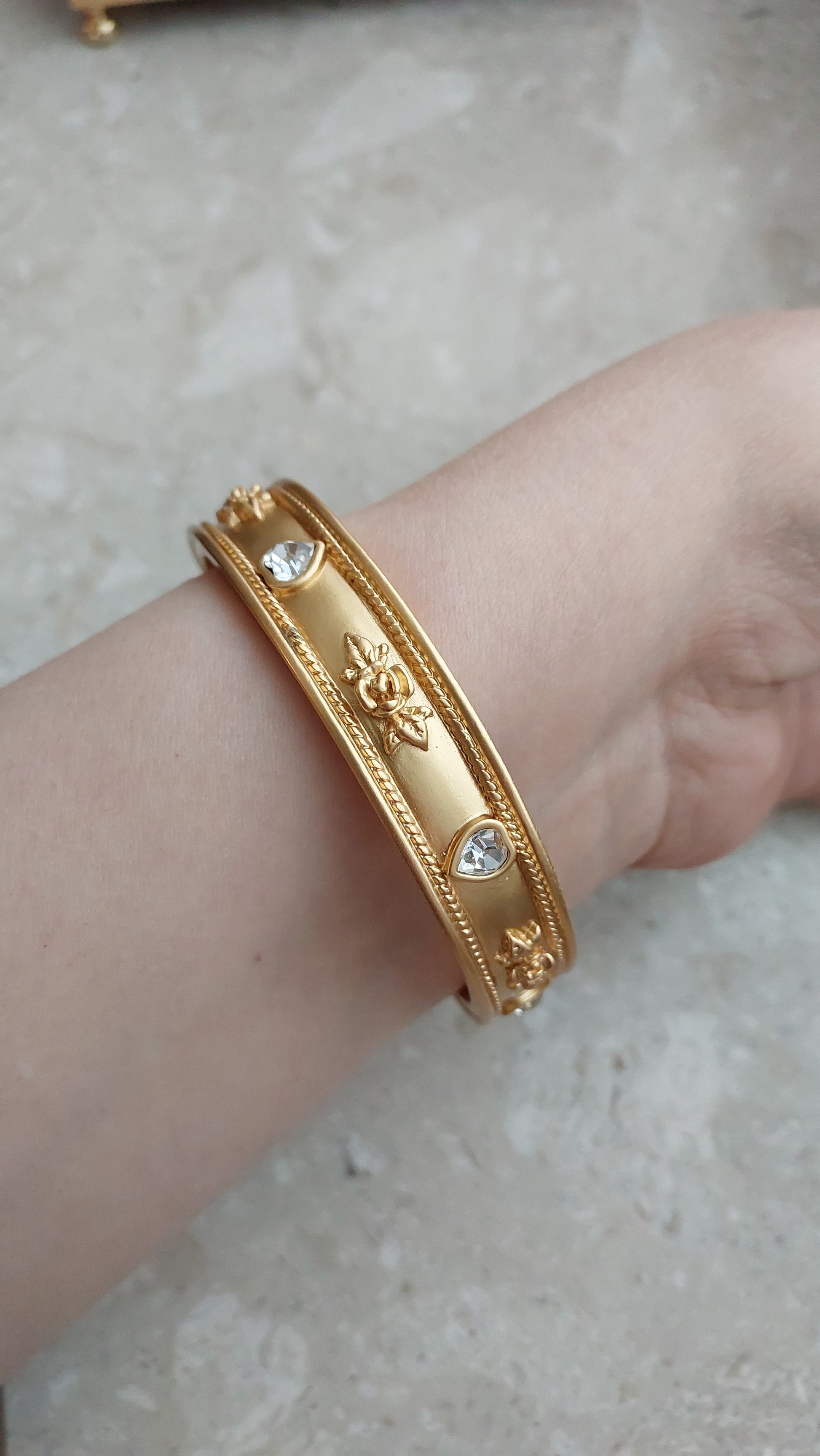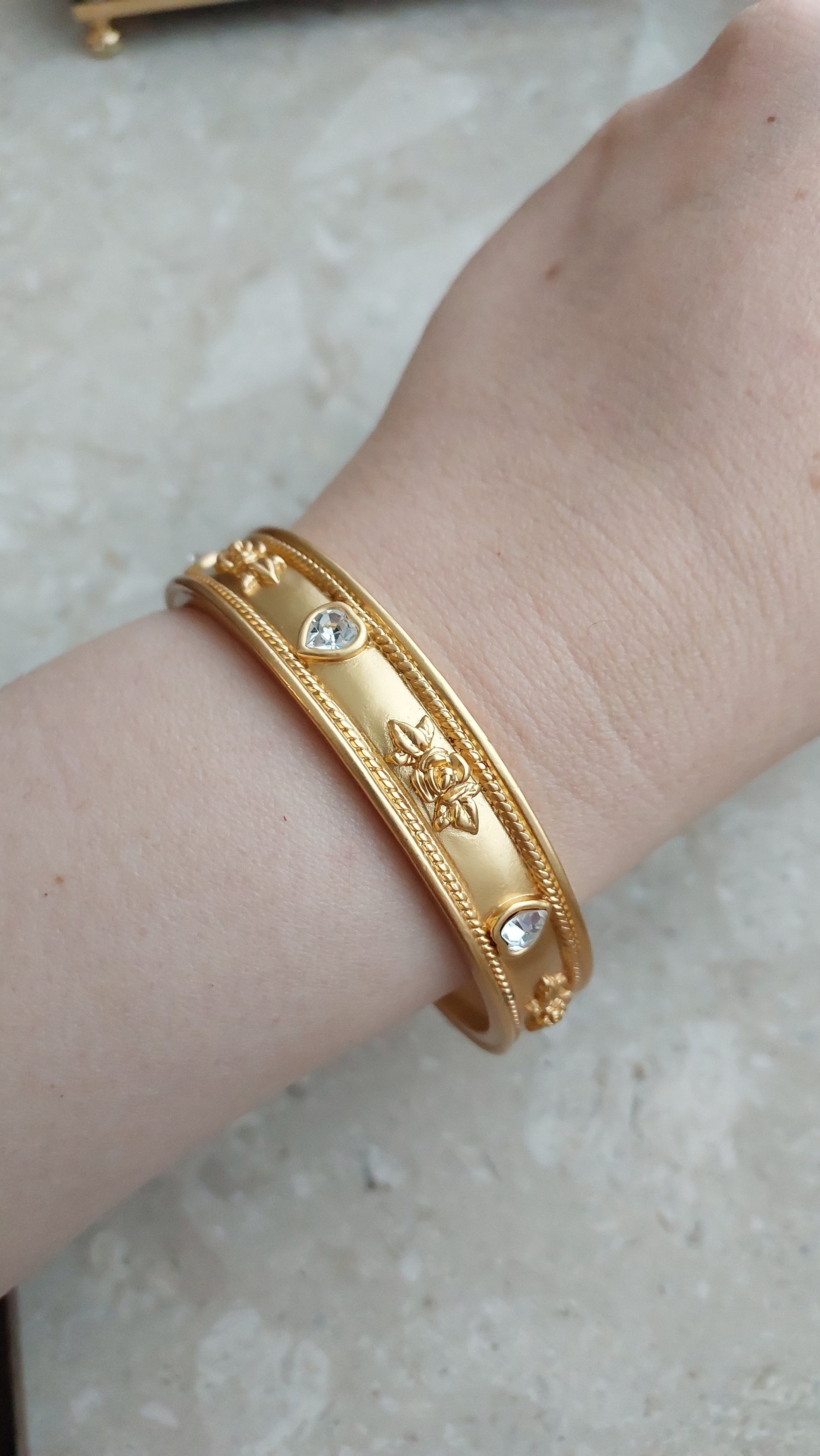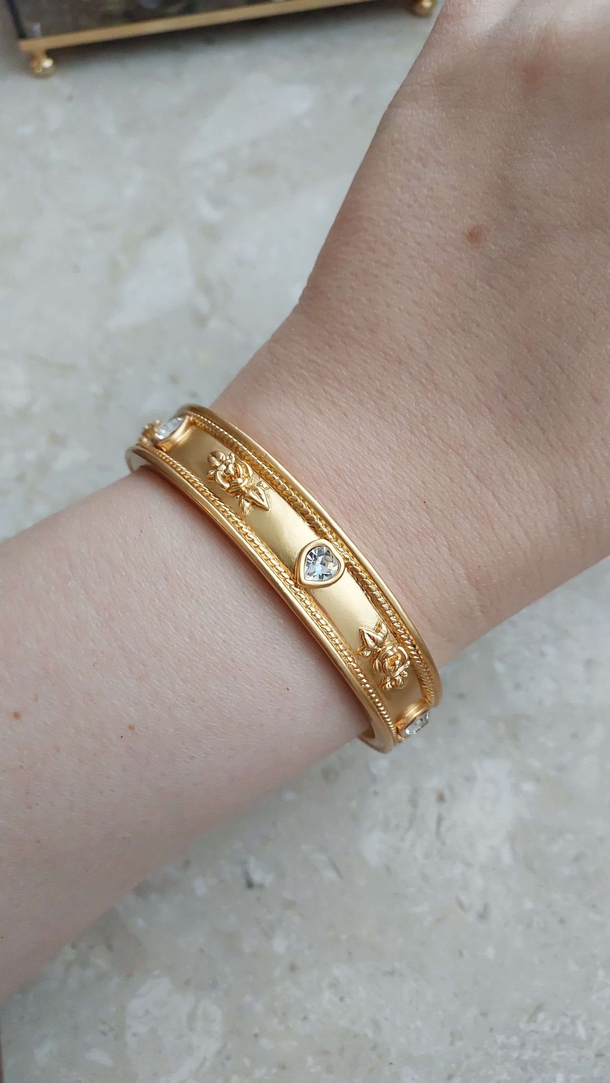 Bransoleta vintage od Elizabeth Taylor for Avon, lata 90. Sztywna bransoleta z aksamitnie matowym złocistym wykończeniem ozdobiona jest eleganckimi detalami: wypukłymi, reliefowymi różami oraz przezroczystymi kryształkami w kształcie serduszek.