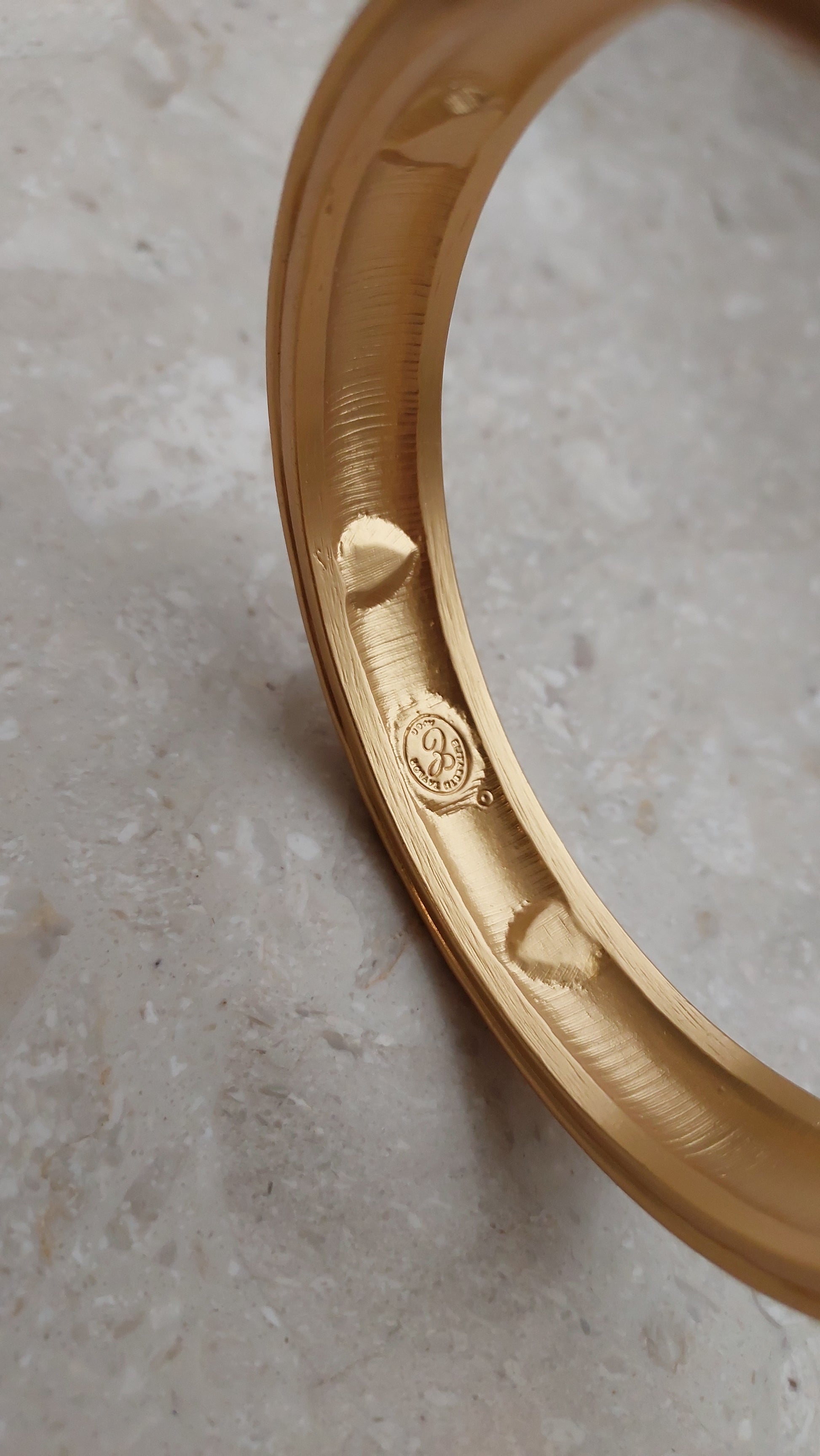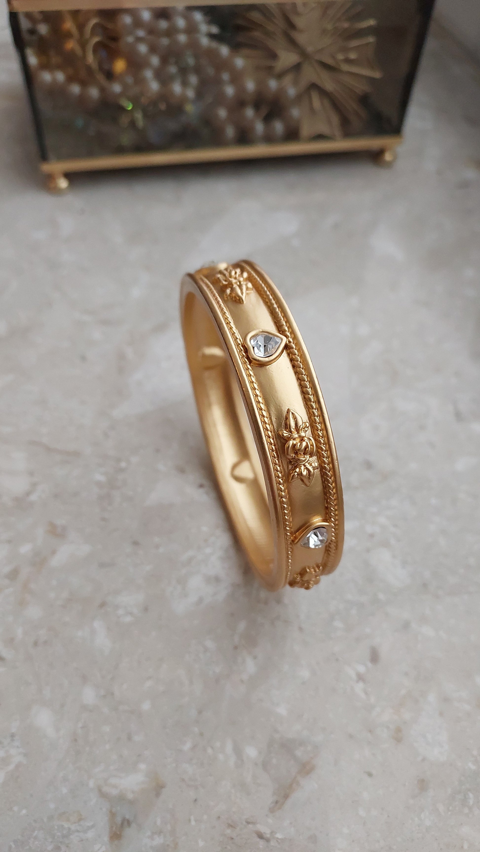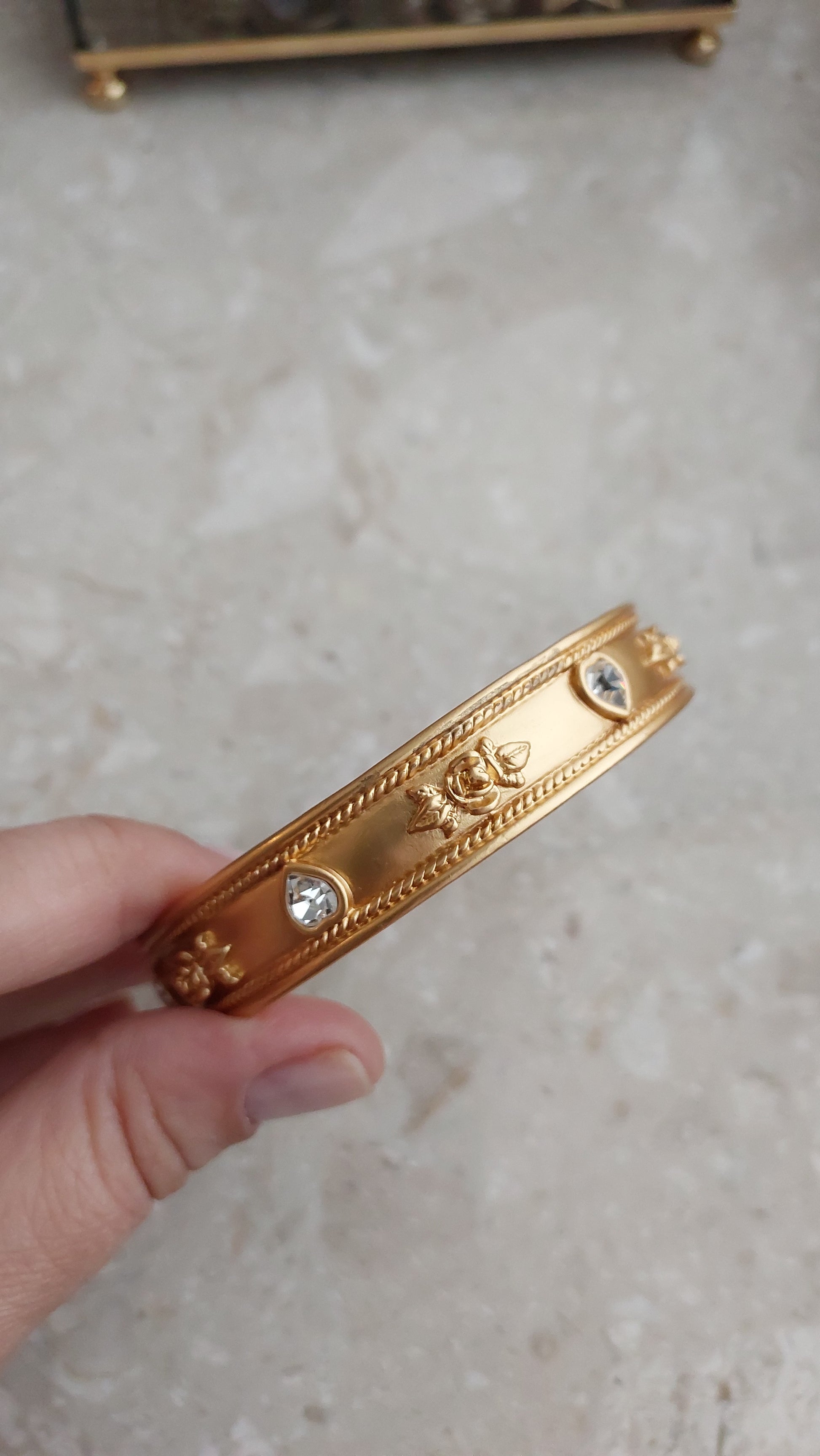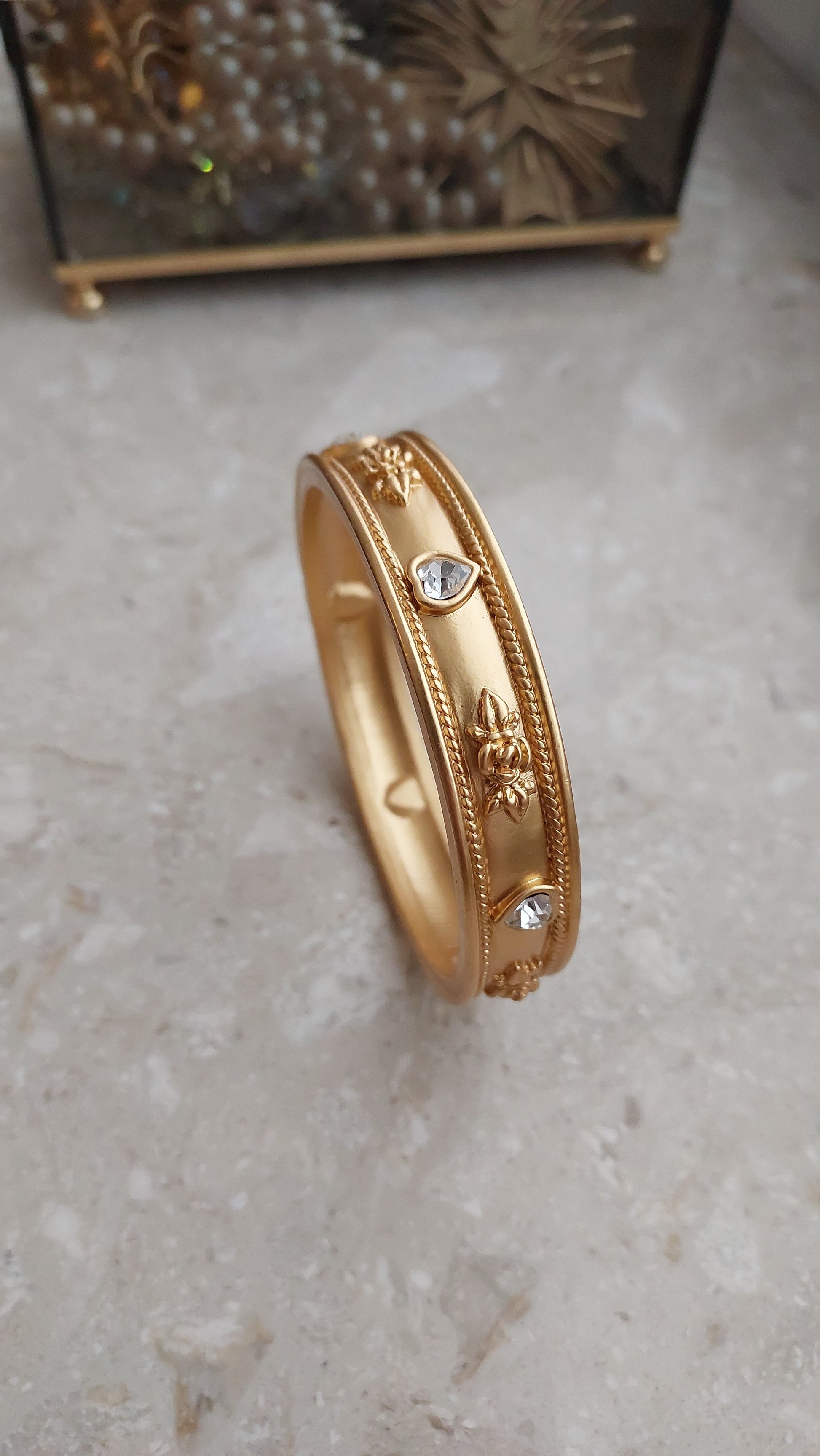 Bransoleta vintage od Elizabeth Taylor for Avon, lata 90. Sztywna bransoleta z aksamitnie matowym złocistym wykończeniem ozdobiona jest eleganckimi detalami: wypukłymi, reliefowymi różami oraz przezroczystymi kryształkami w kształcie serduszek.
