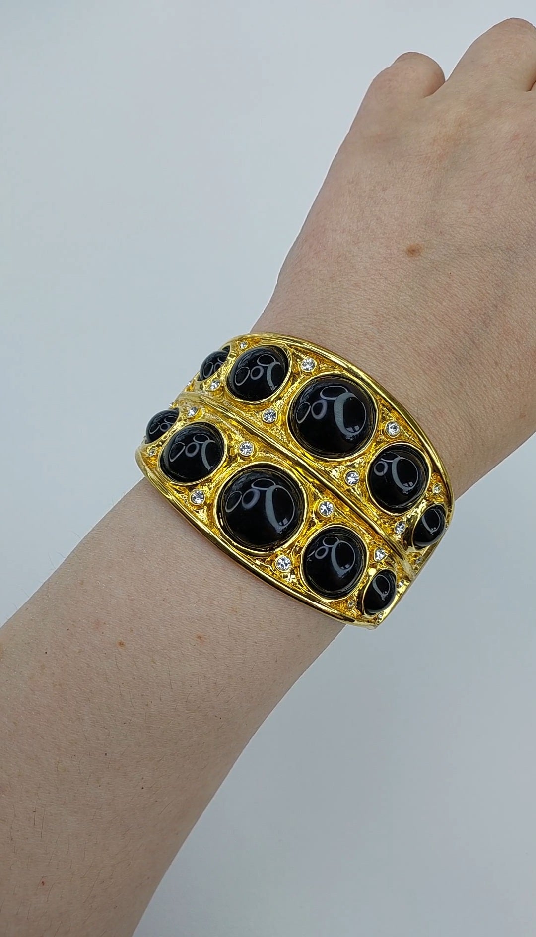 Szeroka forma mankietu utrzymana jest w ciepłym, złocistym tonie i ozdobiona dużymi owalnymi wstawkami w głębokim czarnym kolorze, przypominającymi onyks. Kamienie rozmieszczone są symetrycznie, tworząc wyraźny rytm i mocny akcent wizualny. Pomiędzy nimi znajduje się rozsyp drobnych, przezroczystych kryształów, które dodają szlachetnego blasku i pięknie łapią światło w ruchu.