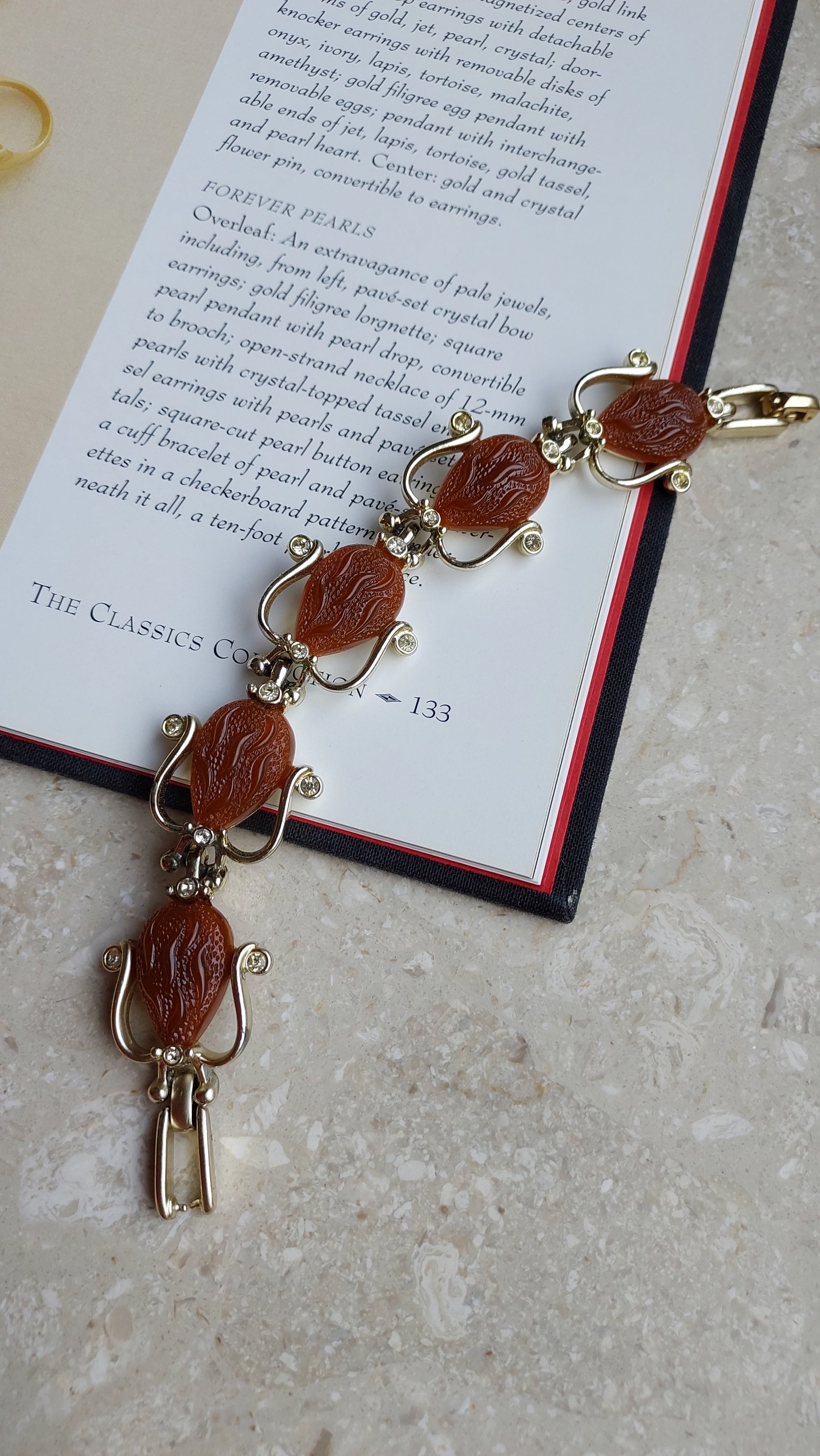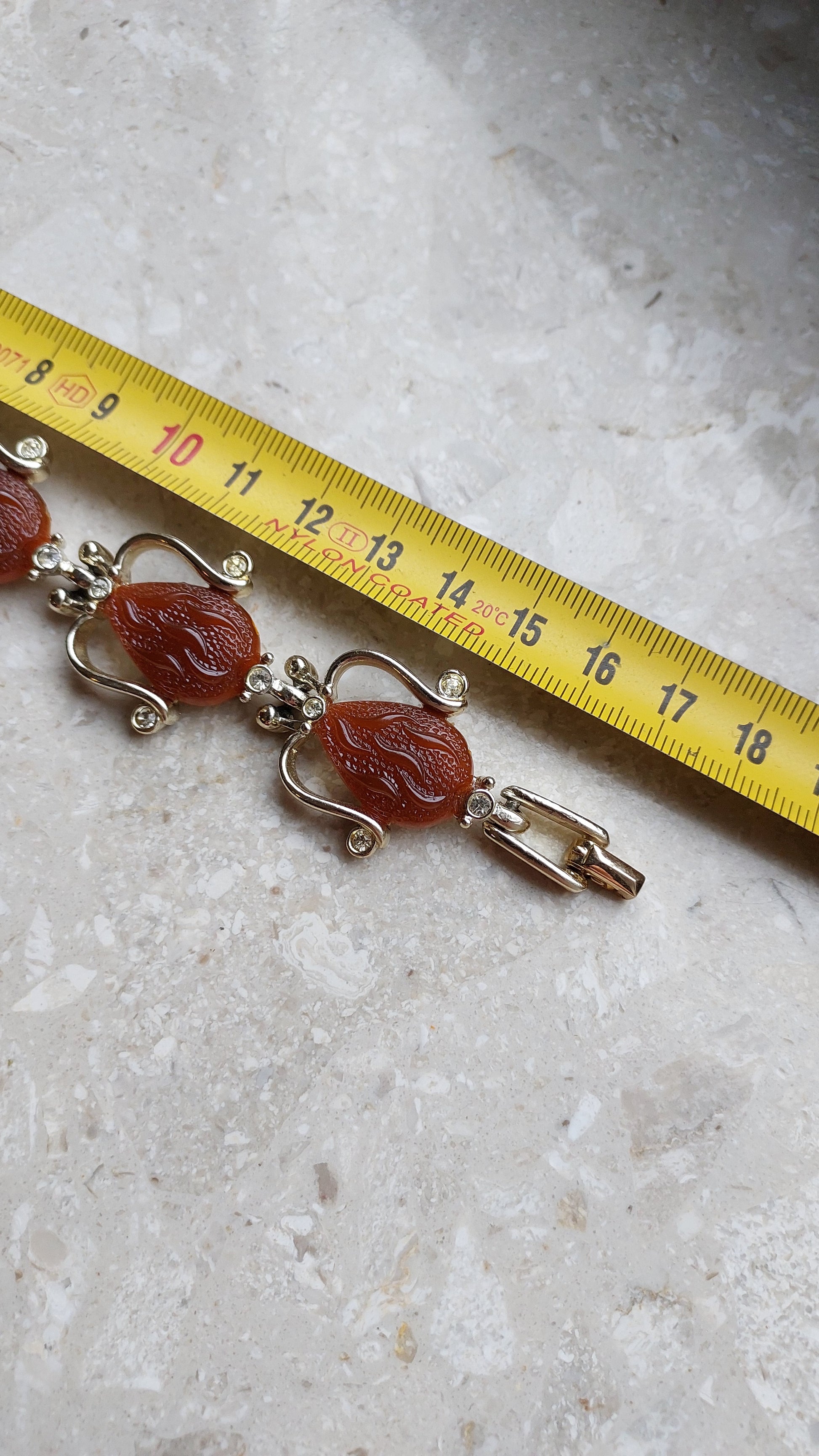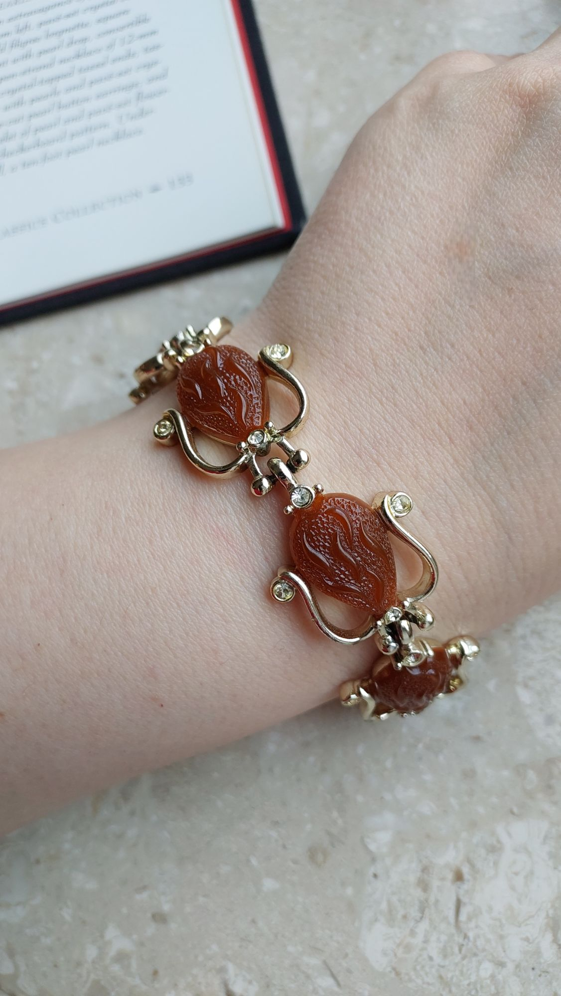 Ta bransoletka vintage Kramer to rzadka i wyrazista ozdoba, wykonana w wyrafinowanym stylu retro, charakterystycznym dla lat 50. i 60. XX wieku. W centrum każdego ogniwa znajduje się dekoracyjny element w kształcie stylizowanej kropli, wykonany z ciepłego, czerwonobrązowego termoplastiku z rzeźbionym wzorem. Kamienie otoczone są delikatną oprawą z miękko wygiętymi liniami, przypominającymi płatki lub zawijasy, ozdobioną przezroczystymi kryształkami, które dodają subtelnego blasku.