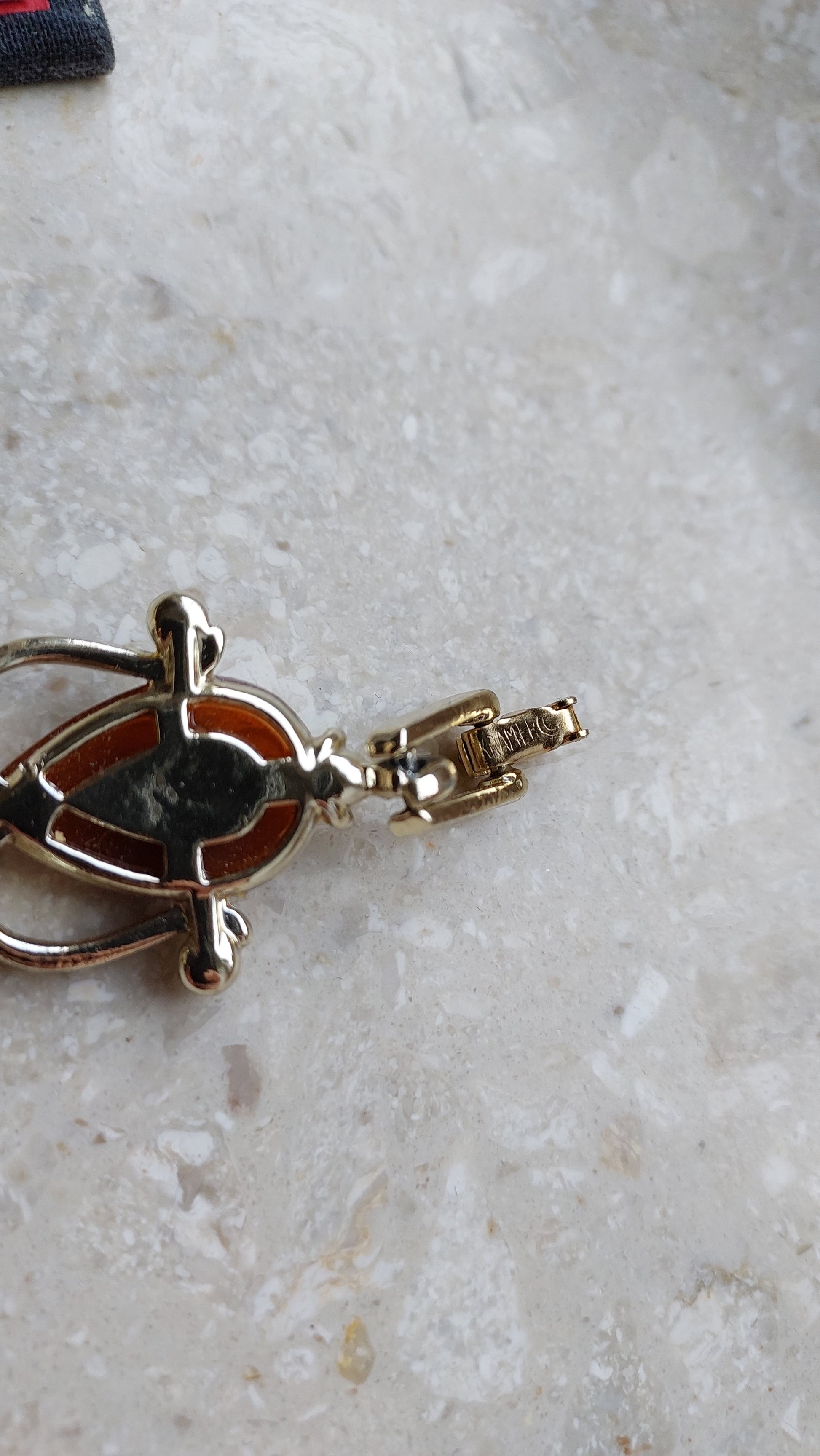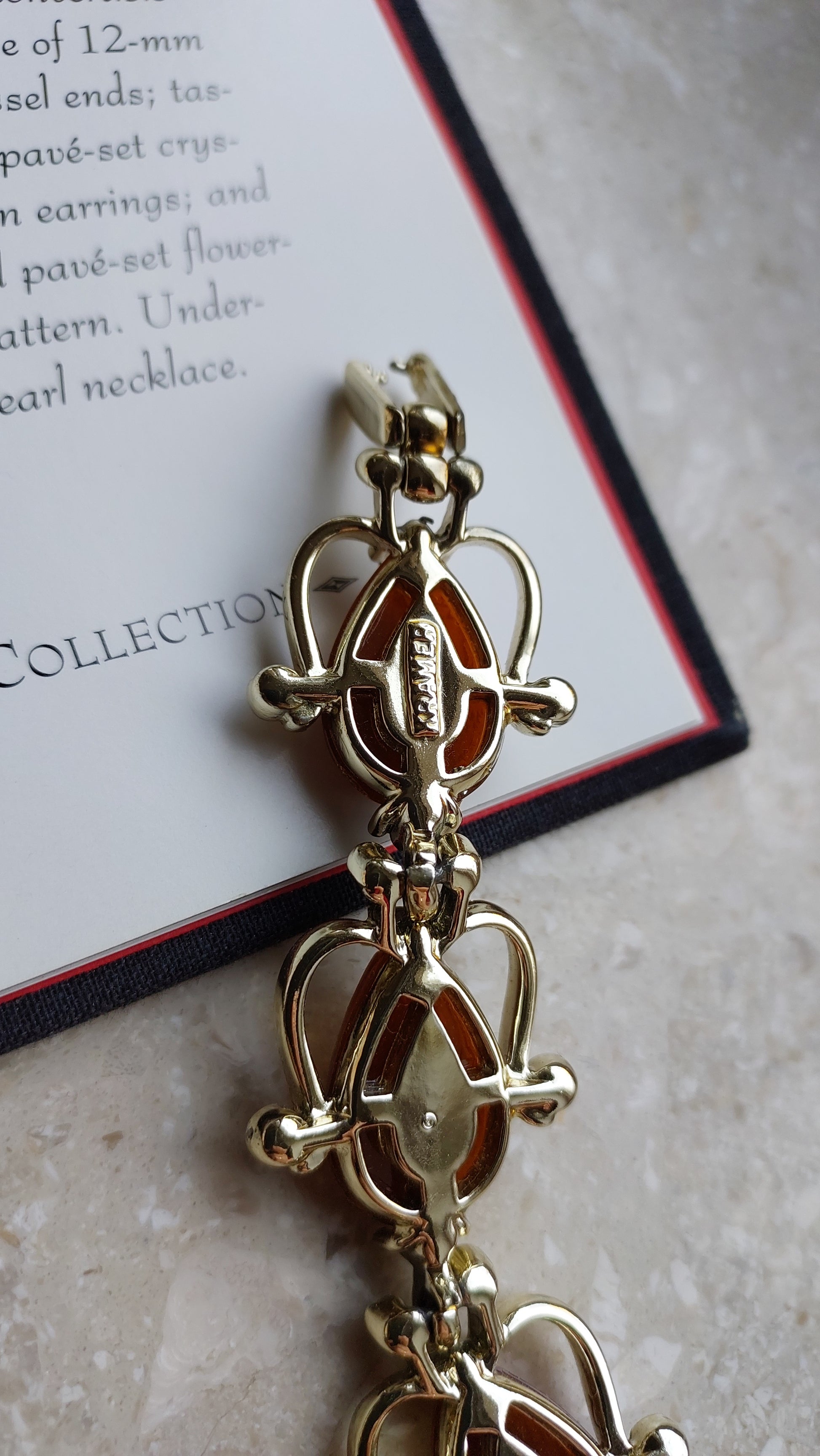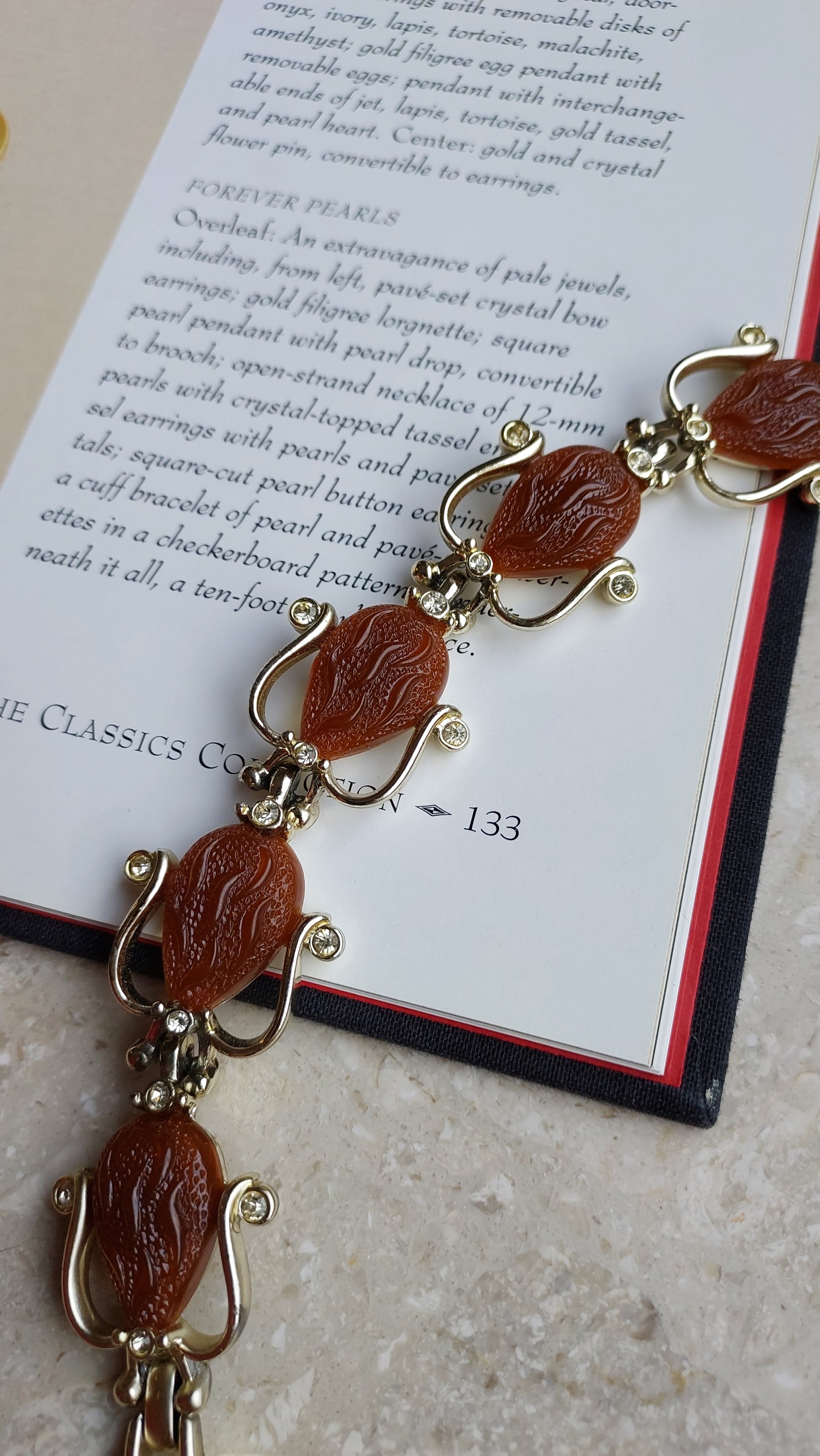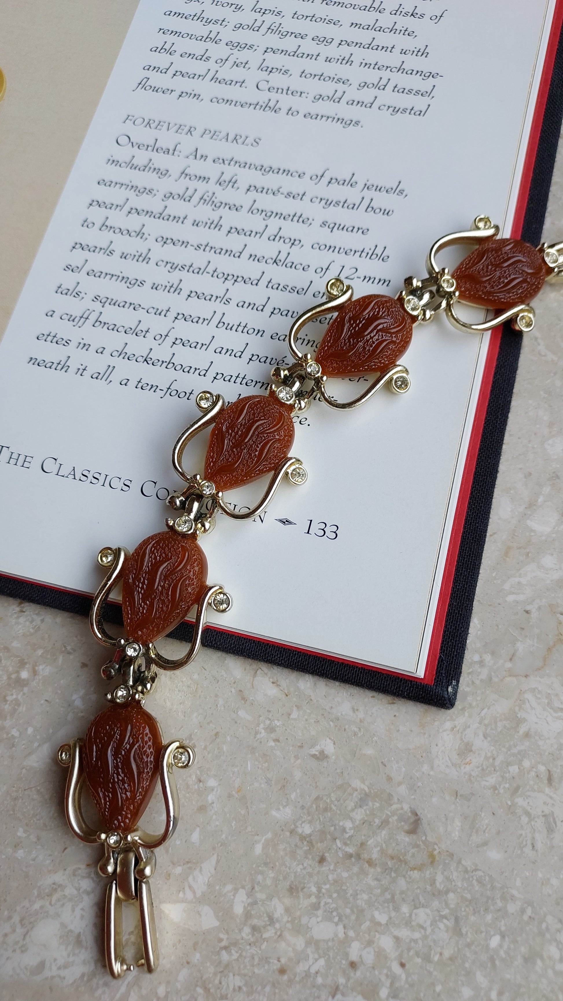 Ta bransoletka vintage Kramer to rzadka i wyrazista ozdoba, wykonana w wyrafinowanym stylu retro, charakterystycznym dla lat 50. i 60. XX wieku. W centrum każdego ogniwa znajduje się dekoracyjny element w kształcie stylizowanej kropli, wykonany z ciepłego, czerwonobrązowego termoplastiku z rzeźbionym wzorem. Kamienie otoczone są delikatną oprawą z miękko wygiętymi liniami, przypominającymi płatki lub zawijasy, ozdobioną przezroczystymi kryształkami, które dodają subtelnego blasku.