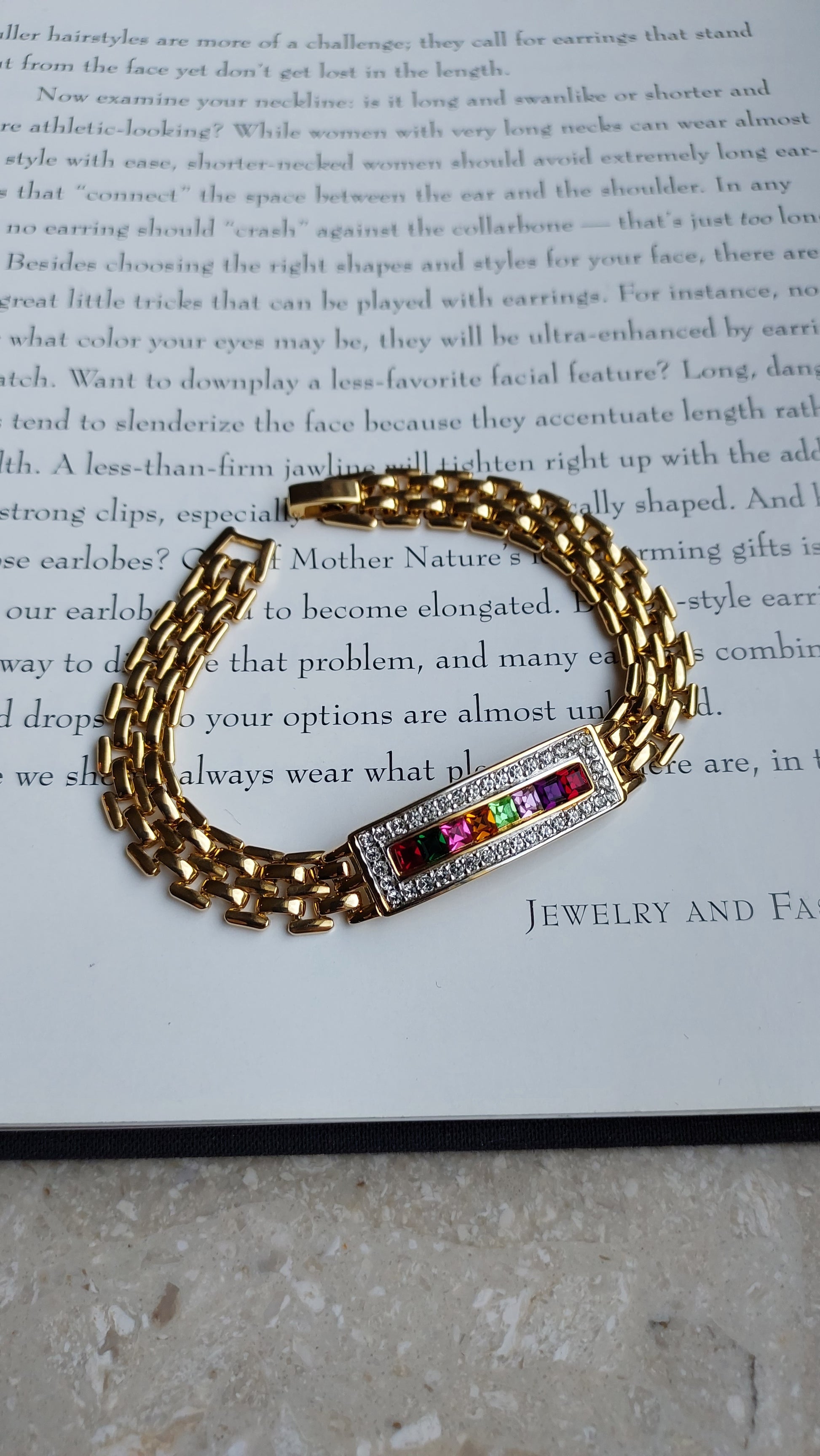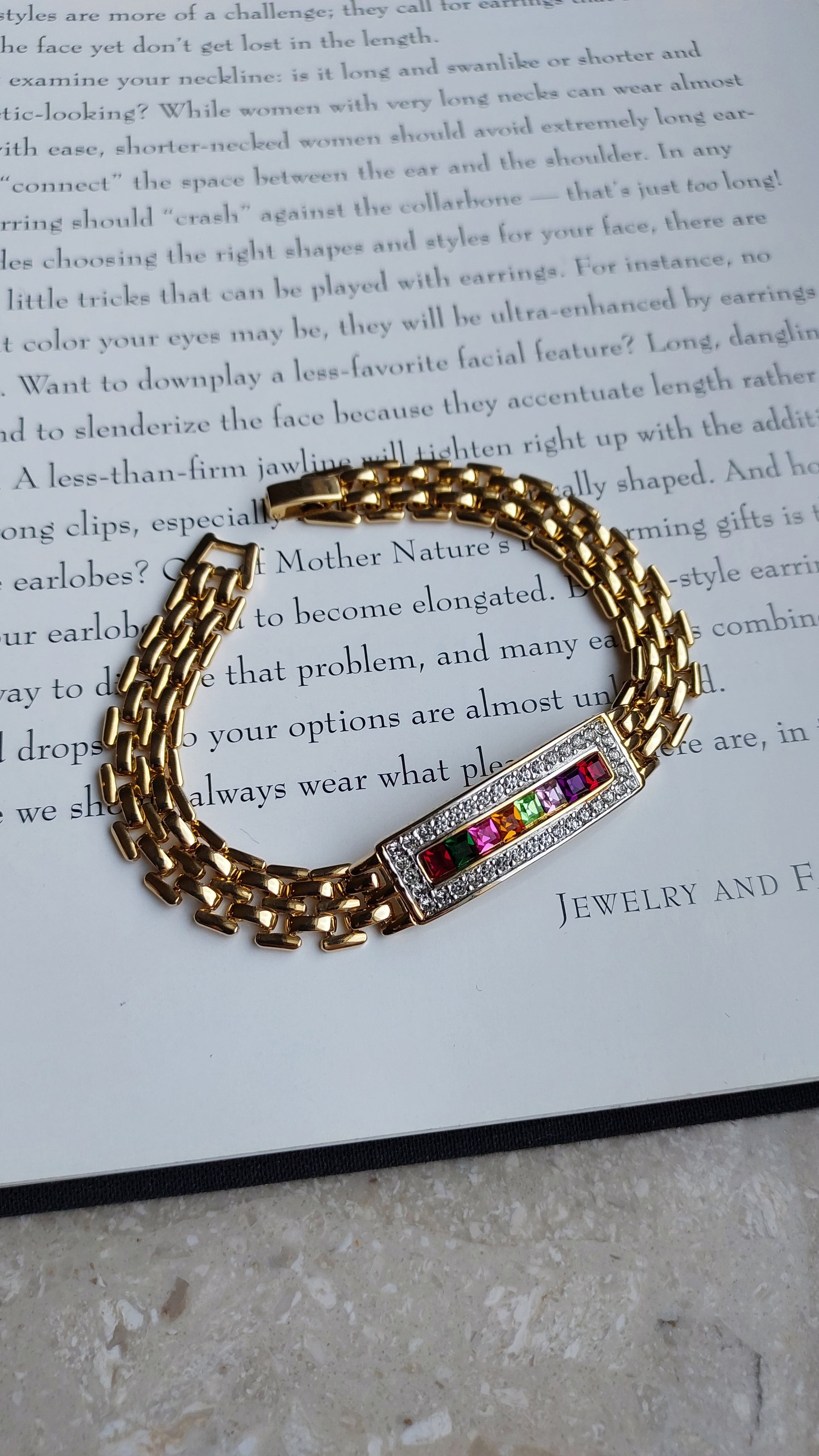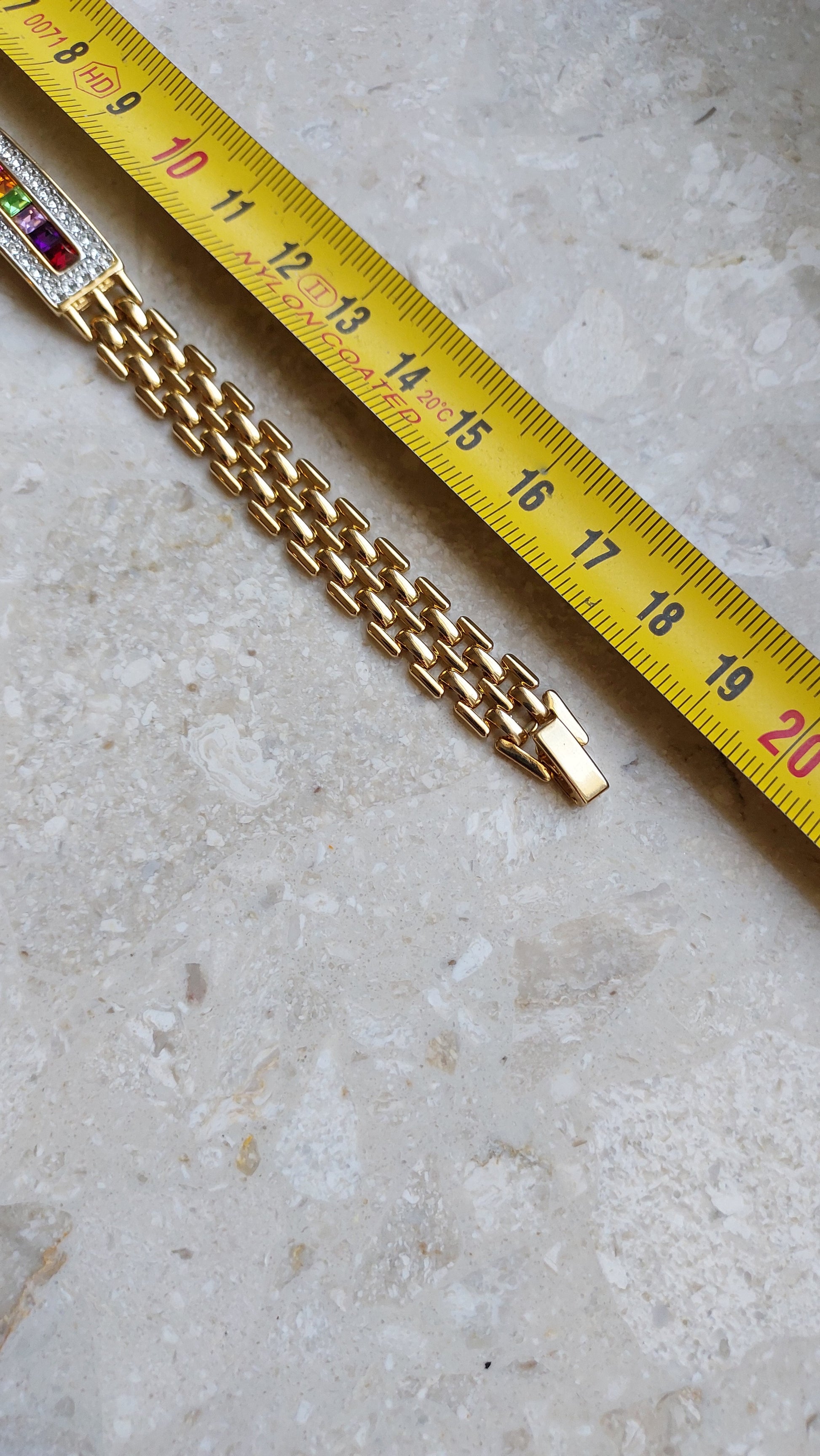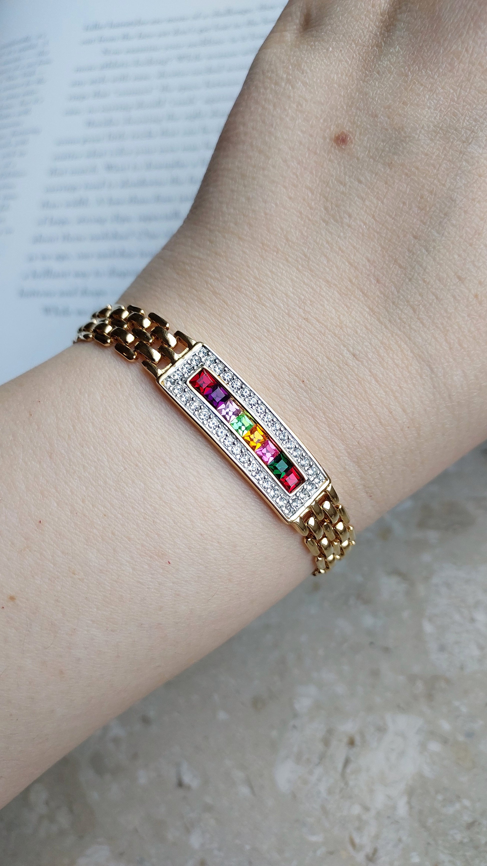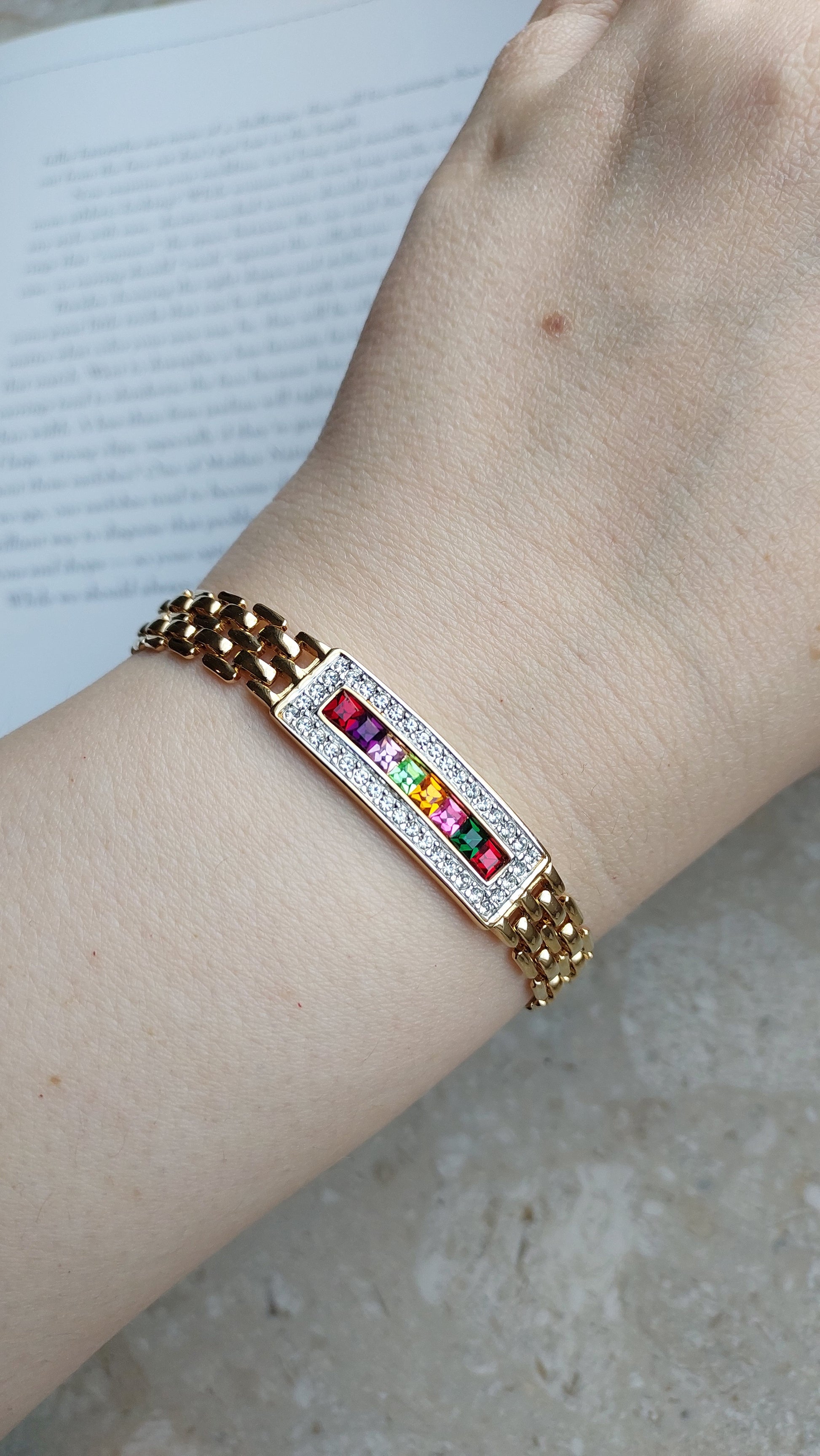 Bransoletka Louis Stern o wyrazistym, eleganckim charakterze. Złociste, plecione ogniwa tworzą dobrze wyważoną strukturę, która pięknie układa się na nadgarstku i nadaje całości szlachetny wygląd. Centralny element ma formę prostokątnego panelu z kompozycją wielobarwnych, kwadratowych kryształów — nasycone odcienie tworzą wyrazisty akcent i elegancką grę kolorów. Panel został obramowany rzędem przezroczystych kryształów, które dodają czystego blasku i podkreślają geometryczny charakter formy.