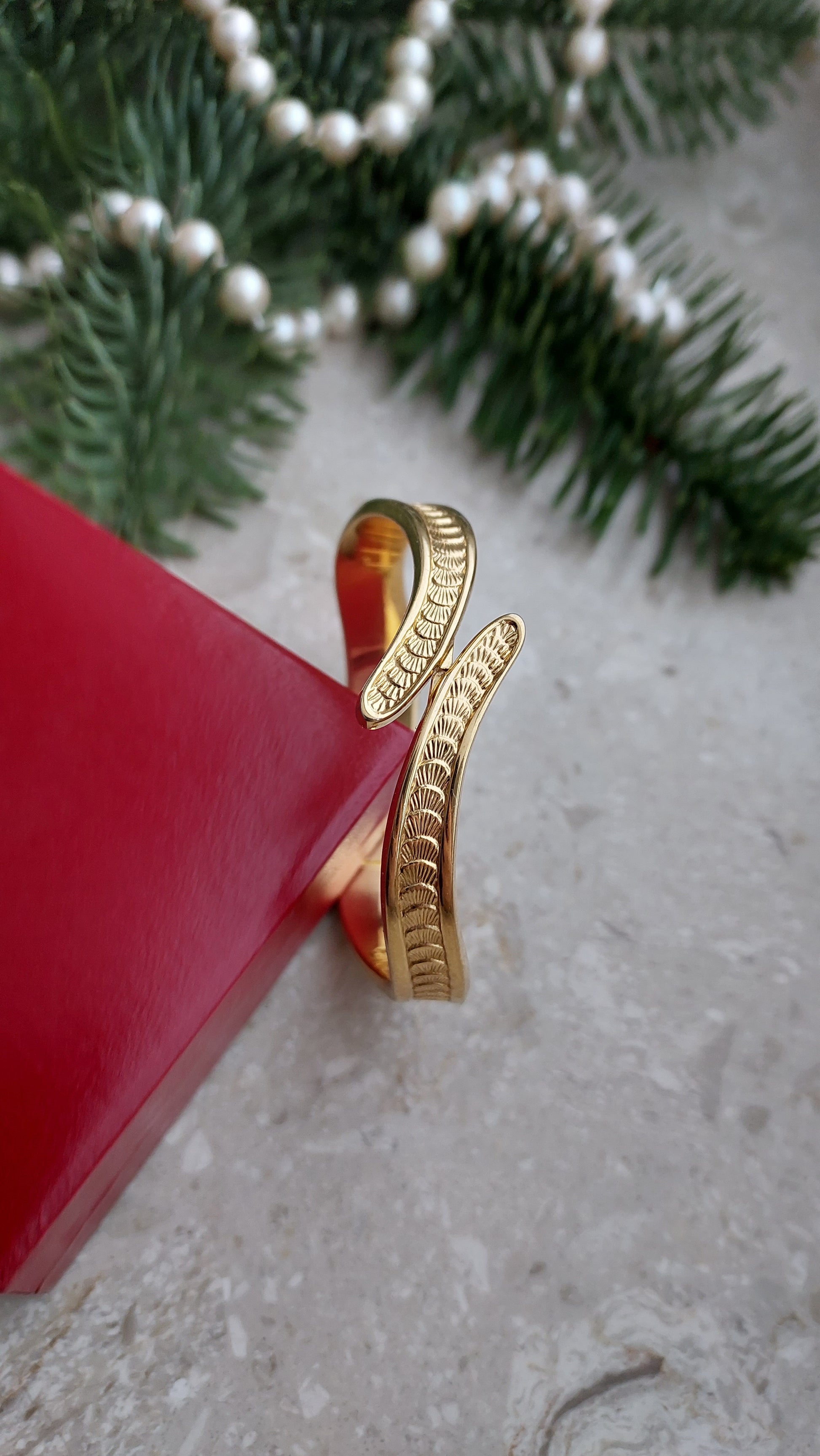 Projekt opiera się na płynnie wygiętych liniach z reliefowym, powtarzalnym ornamentem, który pięknie łapie światło i podkreśla fakturę metalu. Bransoletka efektownie układa się na nadgarstku, wygląda elegancko i wyraziście, a jednocześnie pozostaje uniwersalna — pasuje zarówno do stylizacji wieczorowych, jak i do minimalistycznych, codziennych zestawów. Klasyczna biżuteria vintage Monet z charakterystycznym, szlachetnym blaskiem. Obwód 15,5 cm.