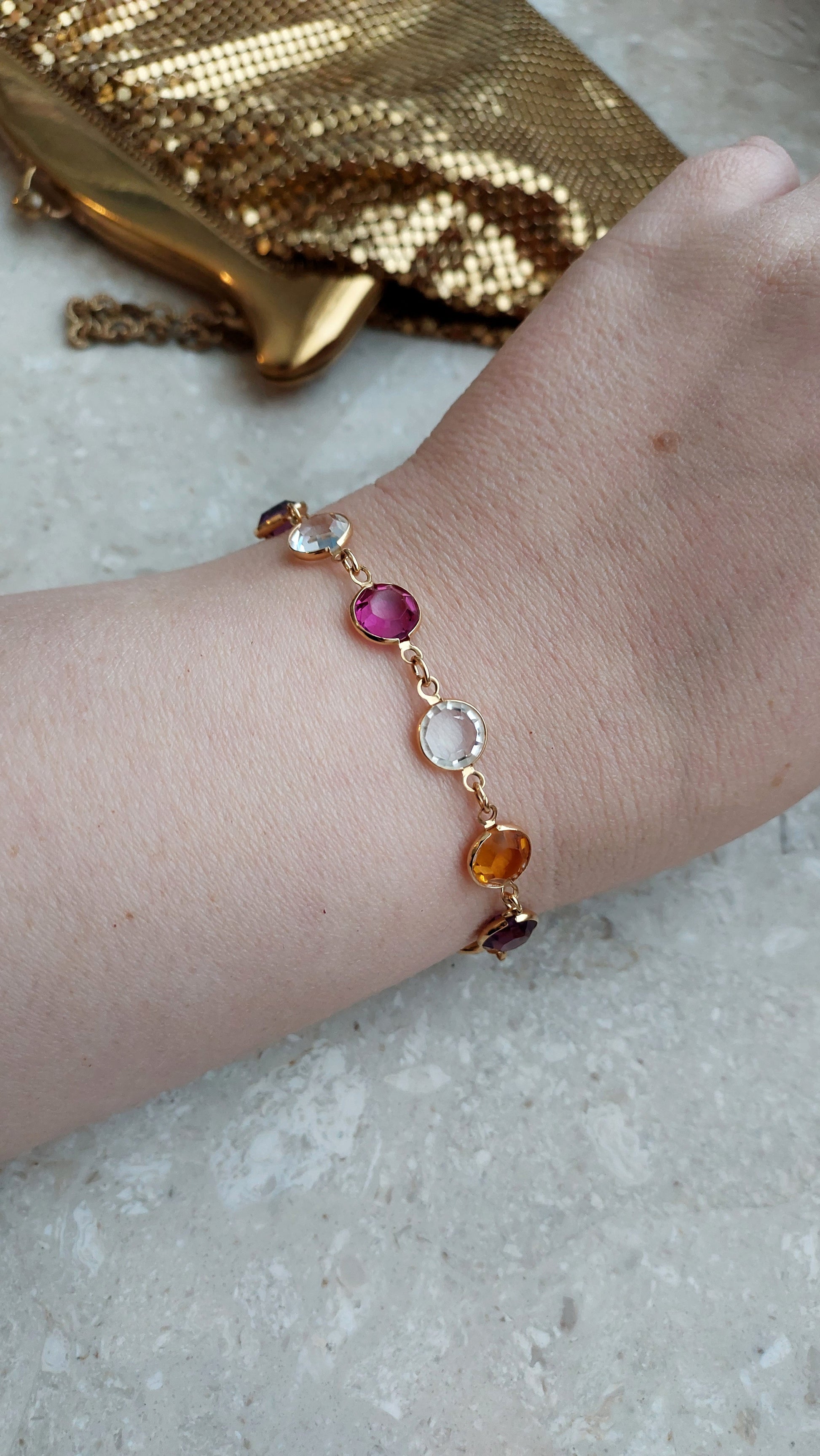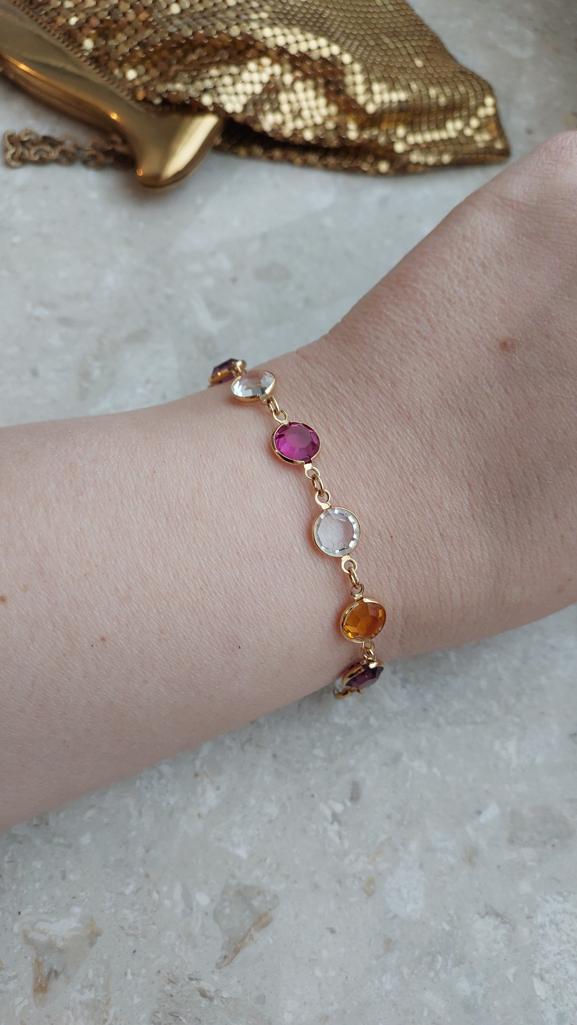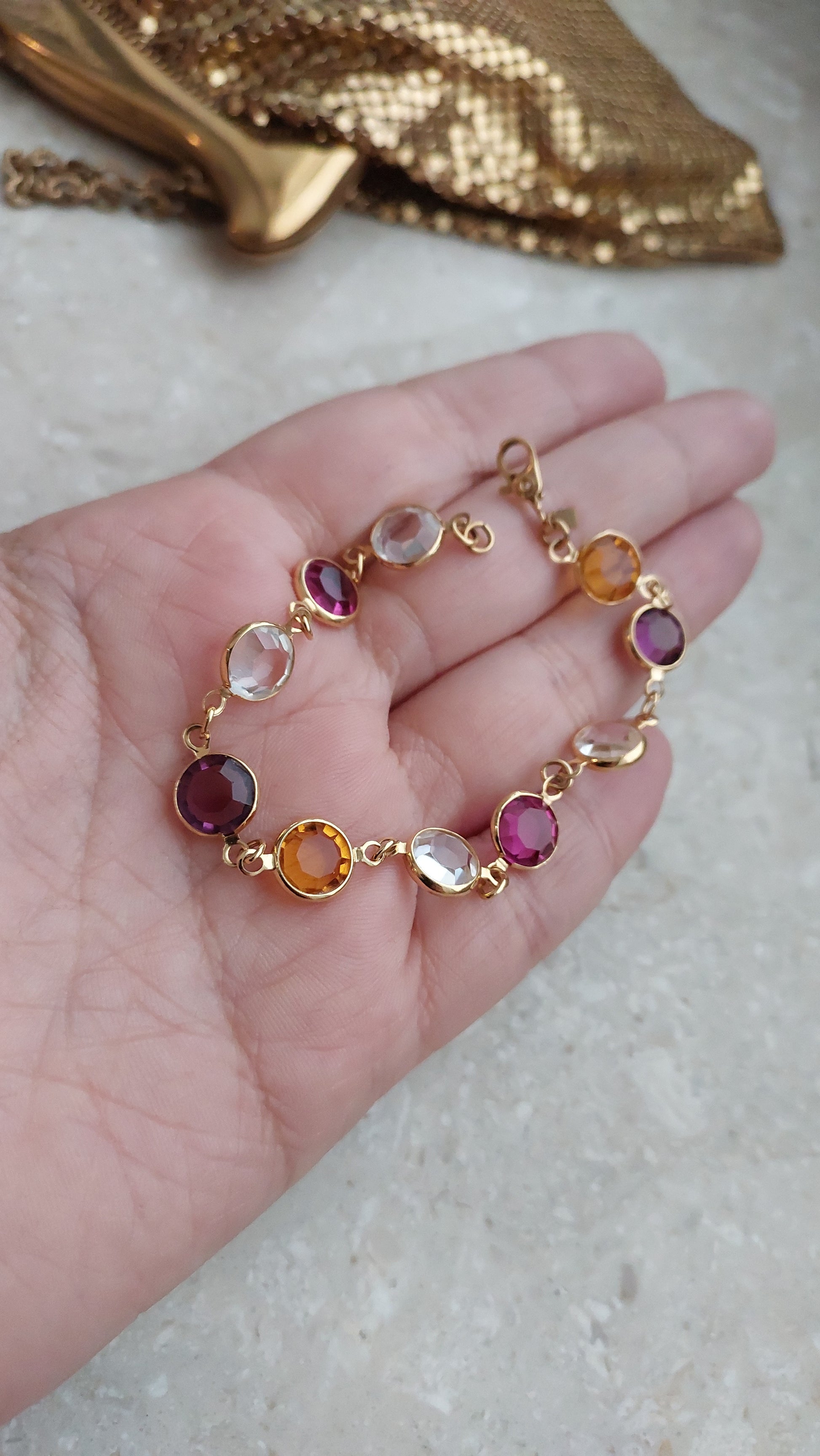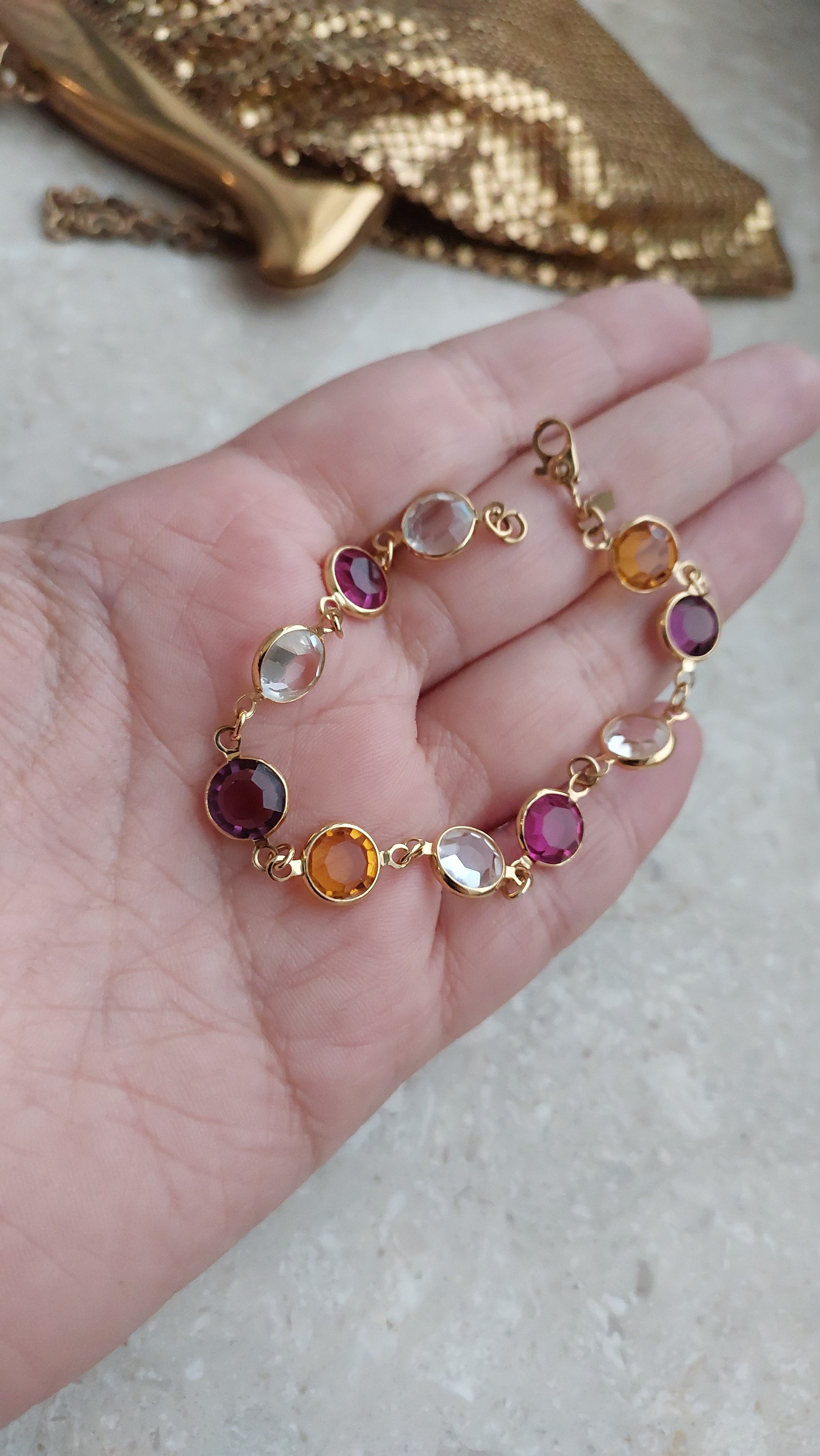 Bransoletka bezel Monet z przezroczystymi, rubinowymi, winnymi i żółtymi kryształami w złocistej oprawie.