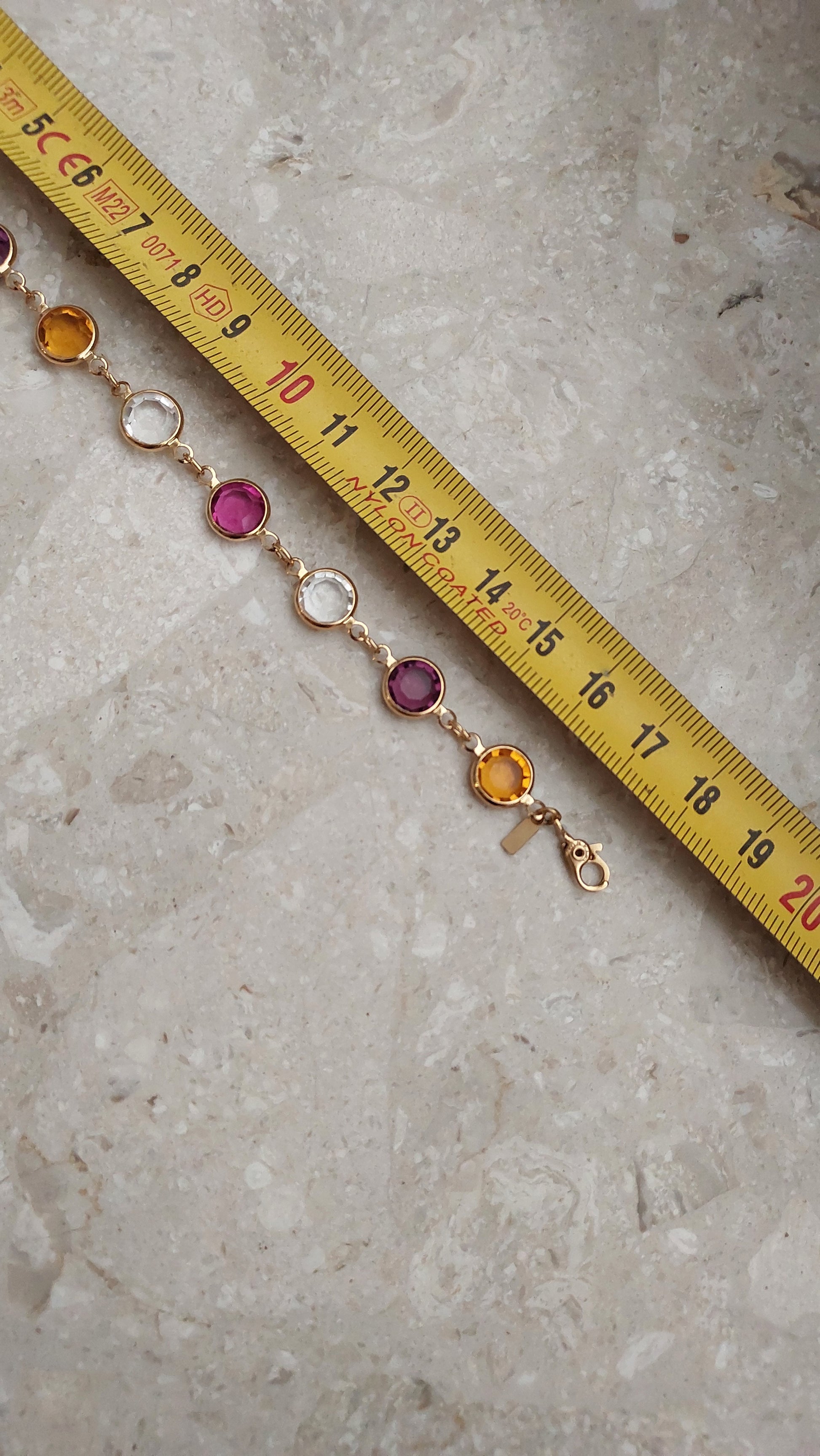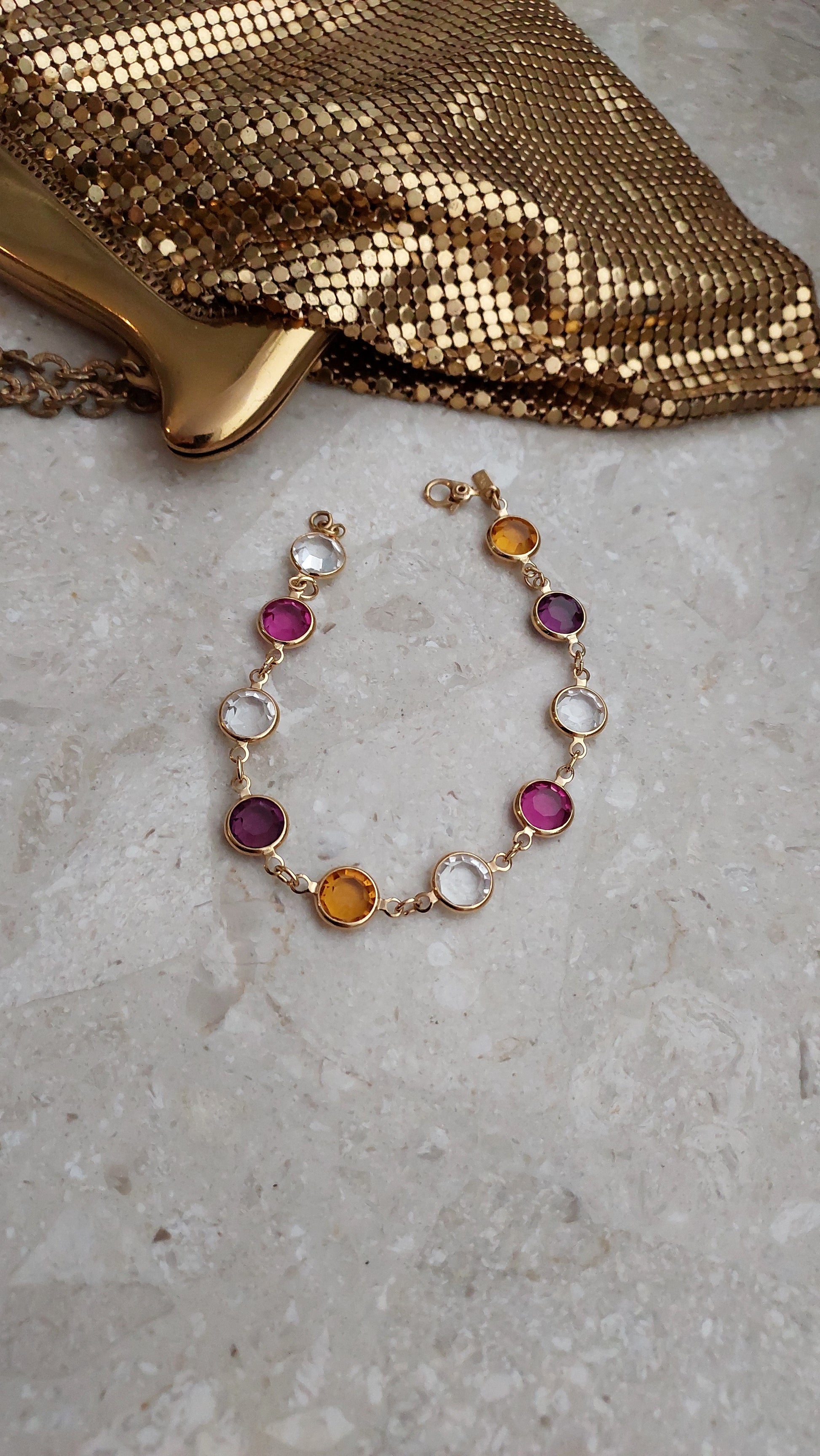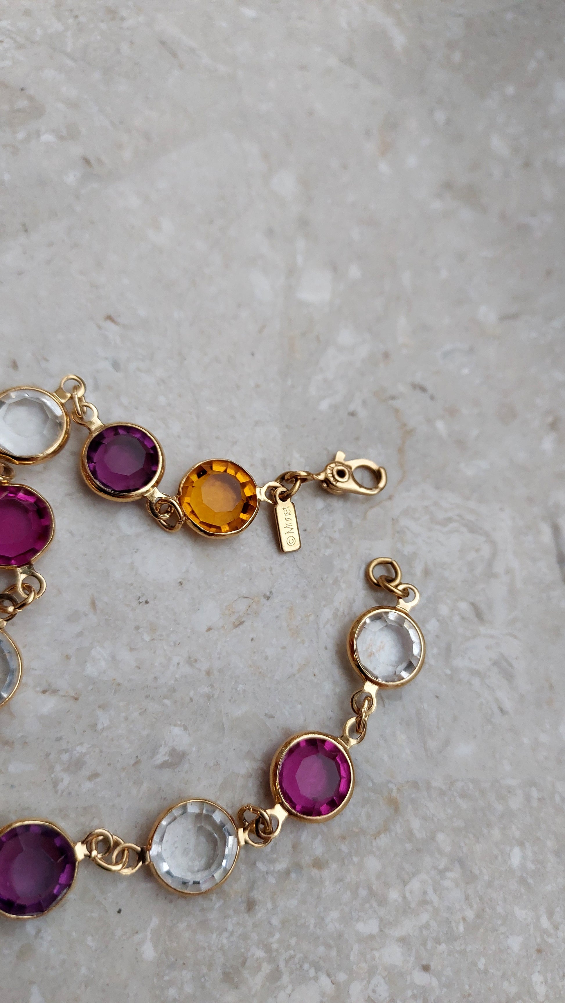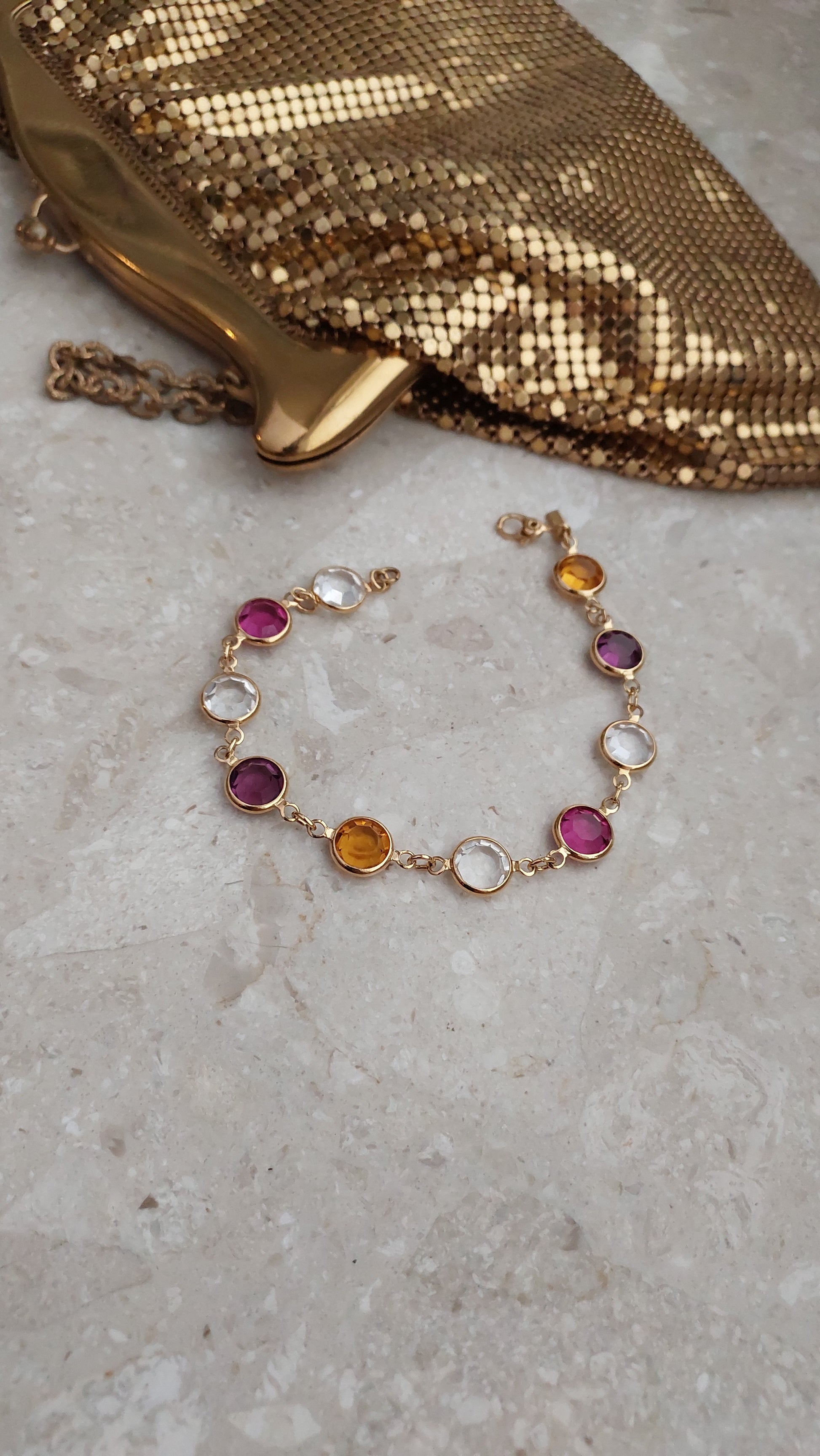 Bransoletka bezel Monet z przezroczystymi, rubinowymi, winnymi i żółtymi kryształami w złocistej oprawie.