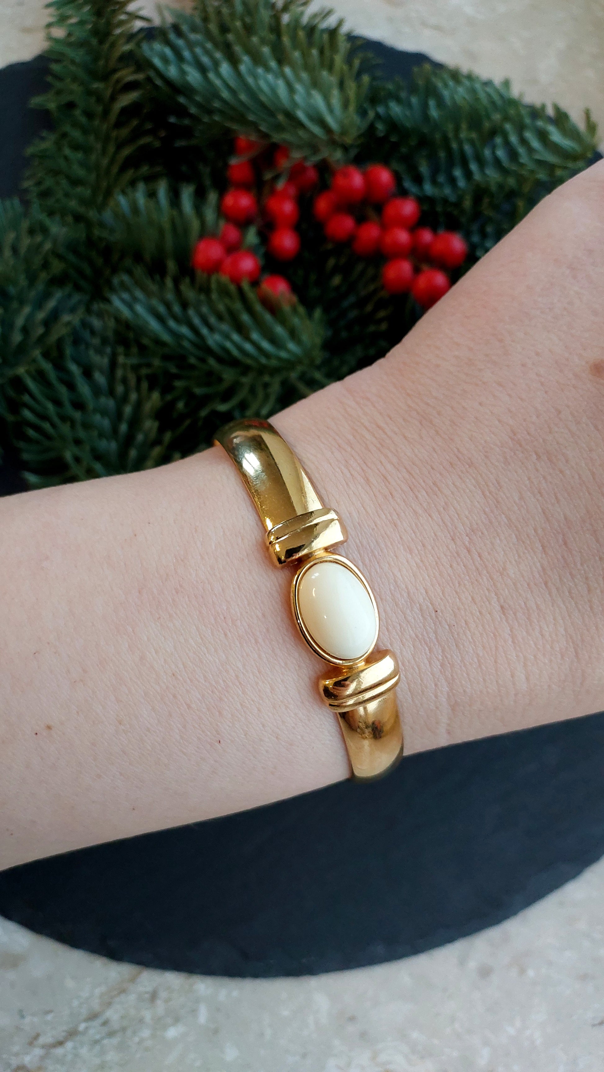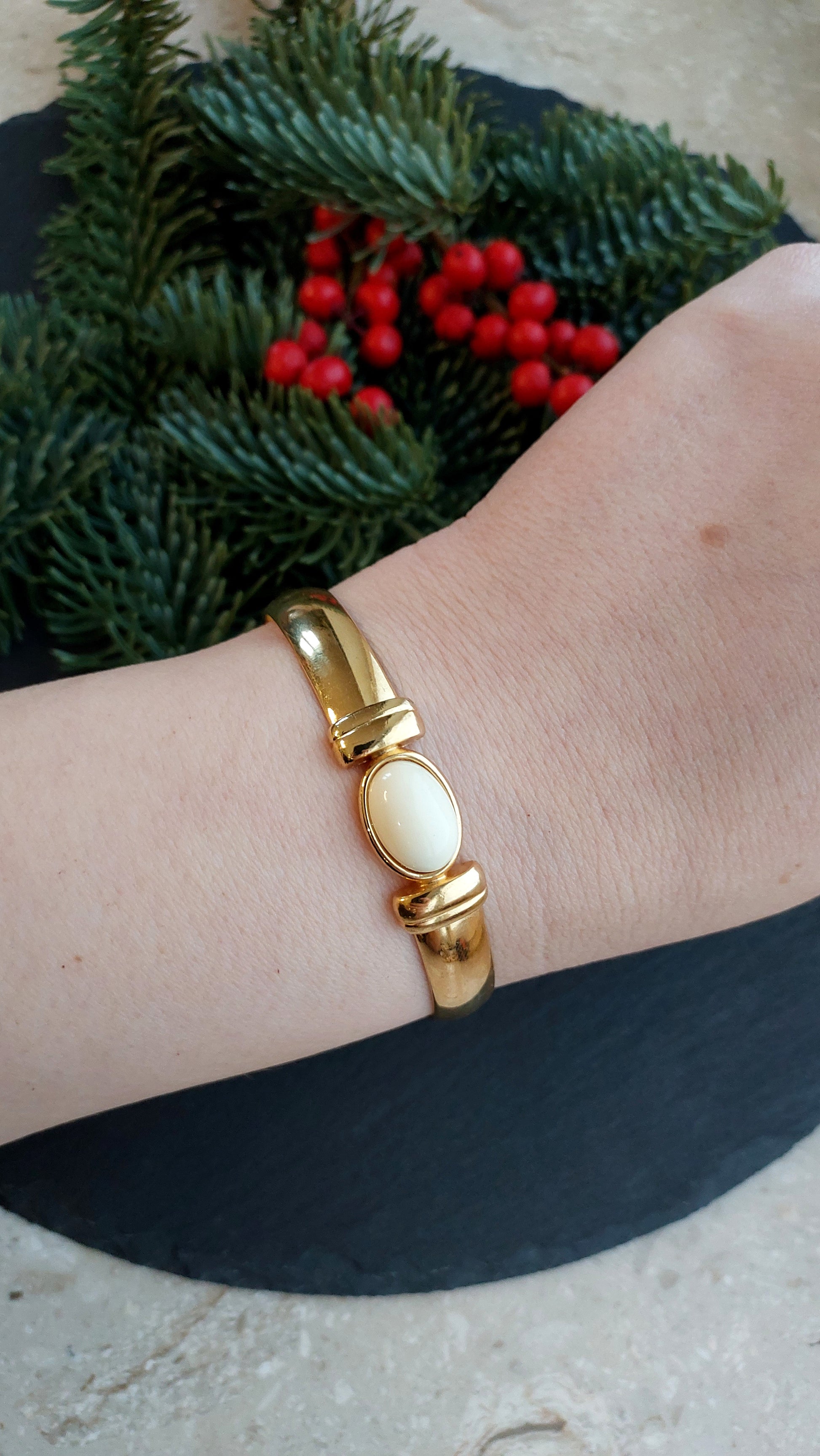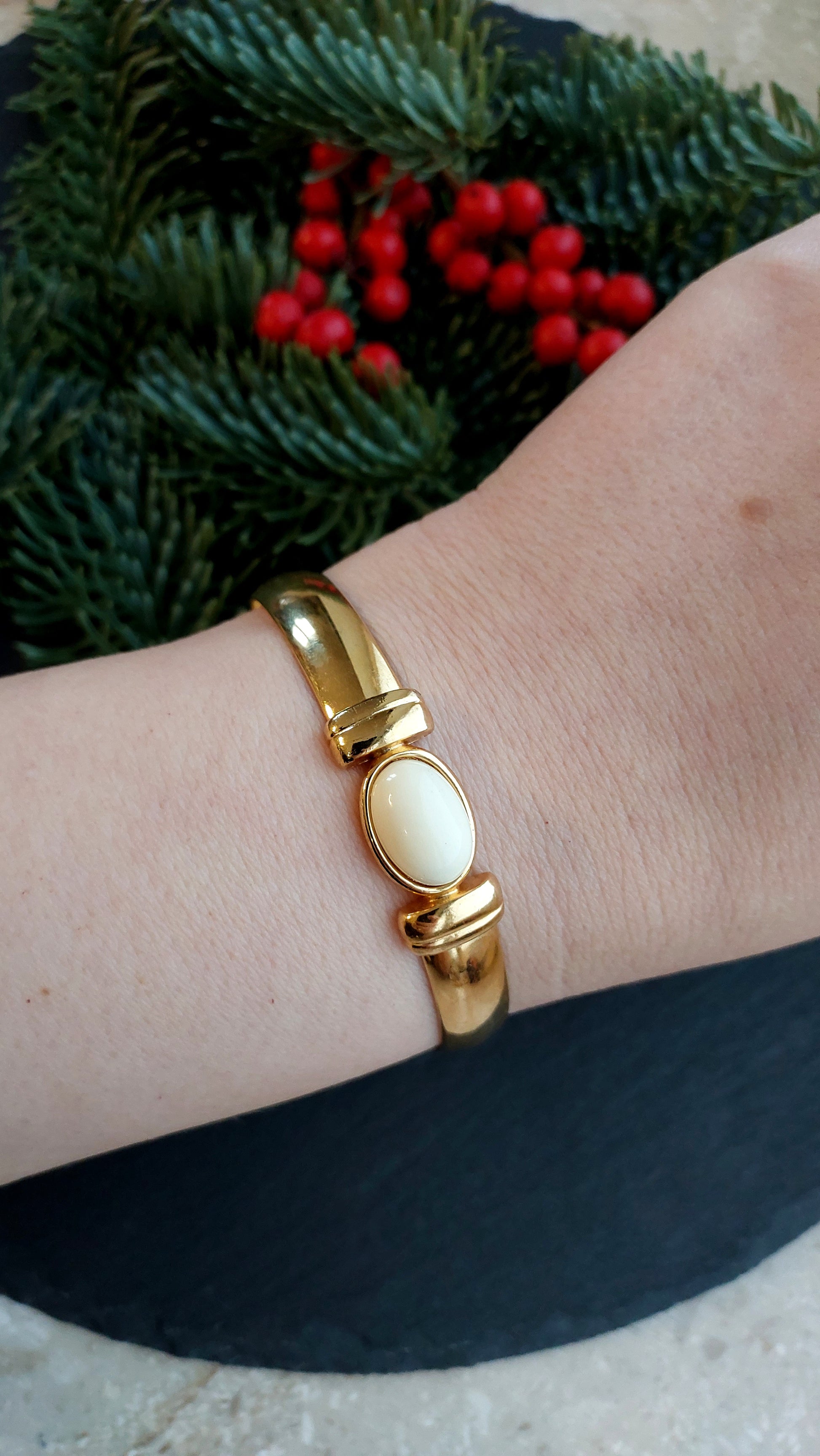 Bransoletka Monet z gładką, złocistą bazą i owalną kremową wstawką.