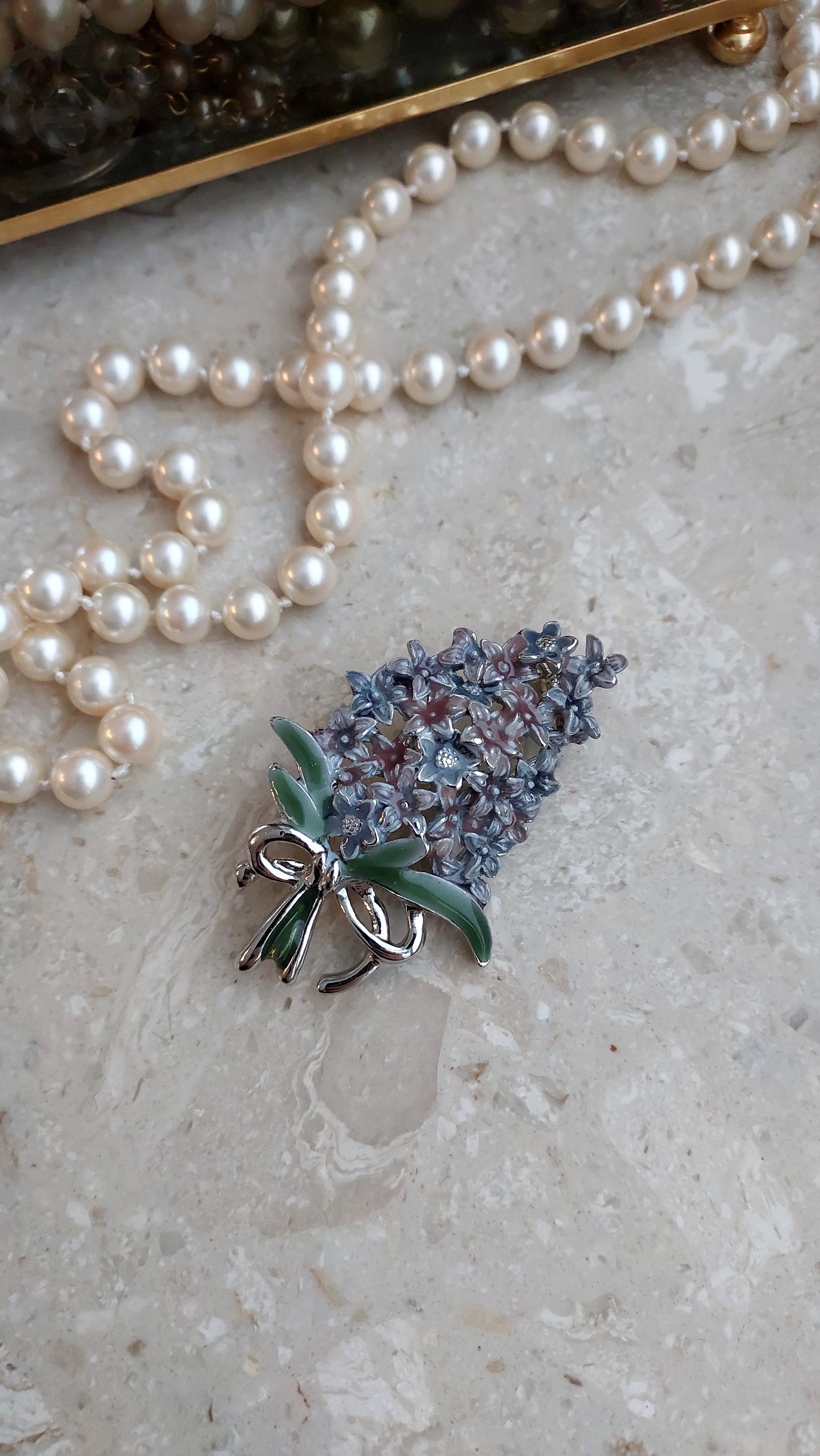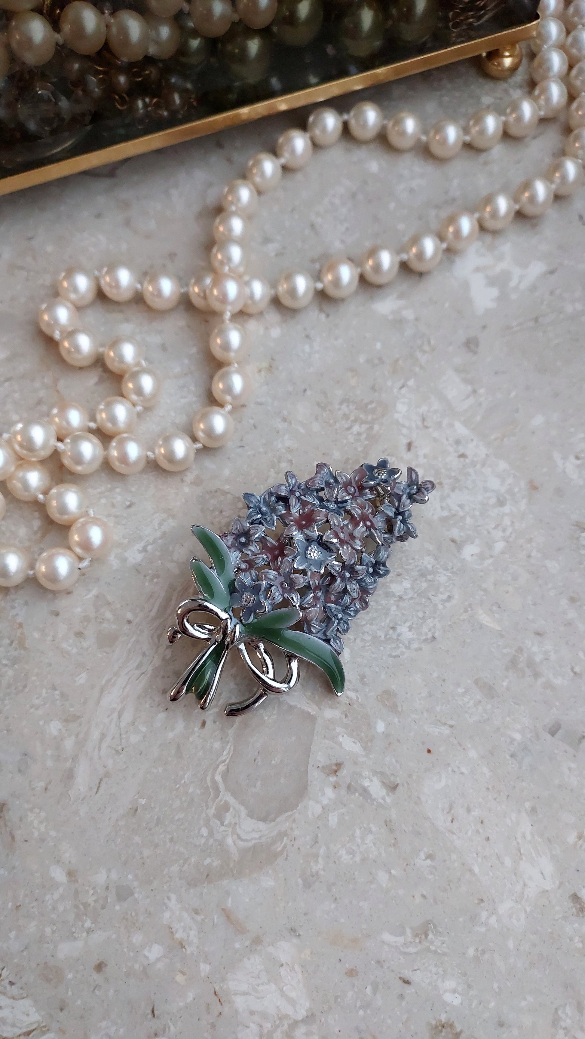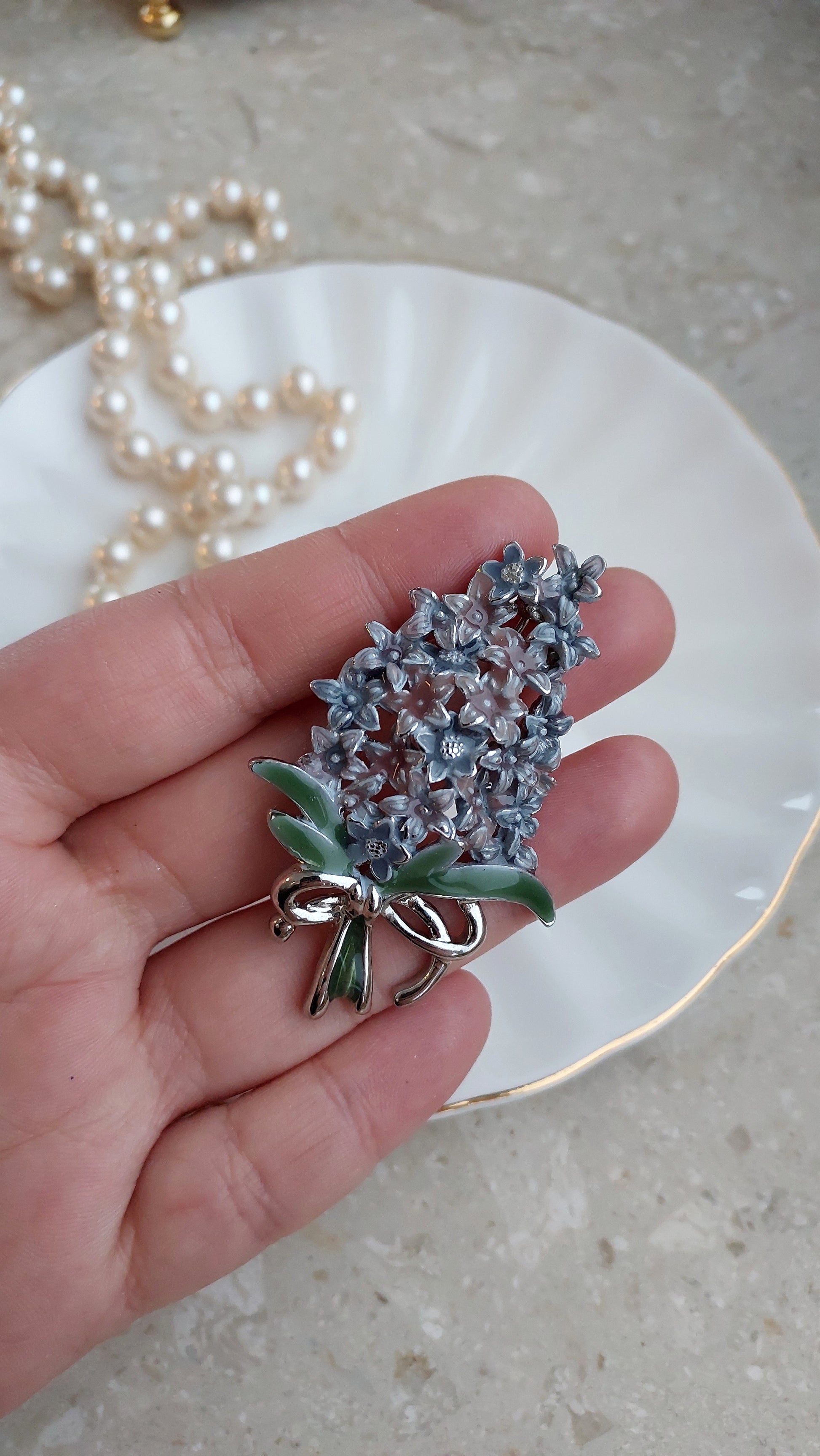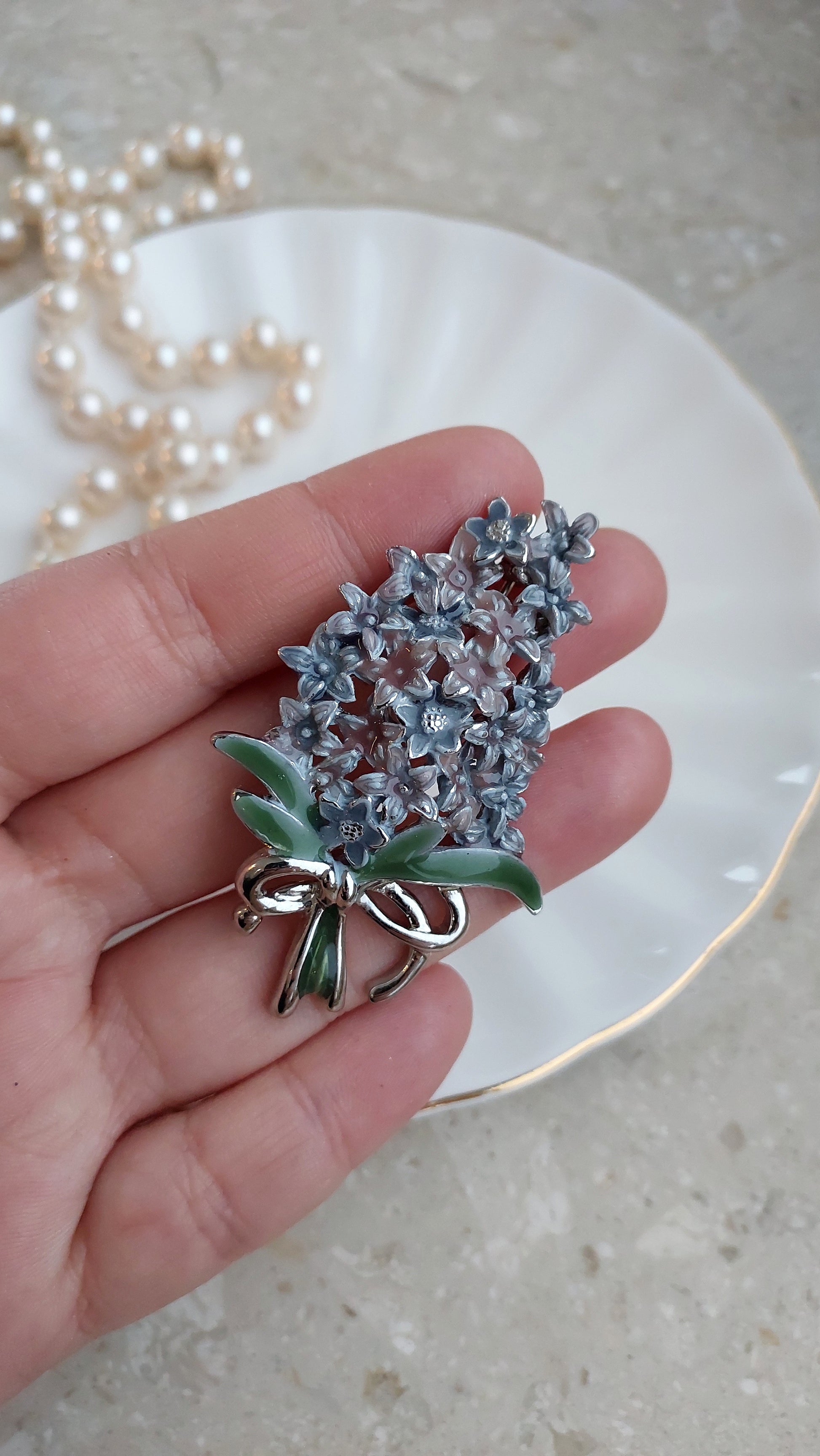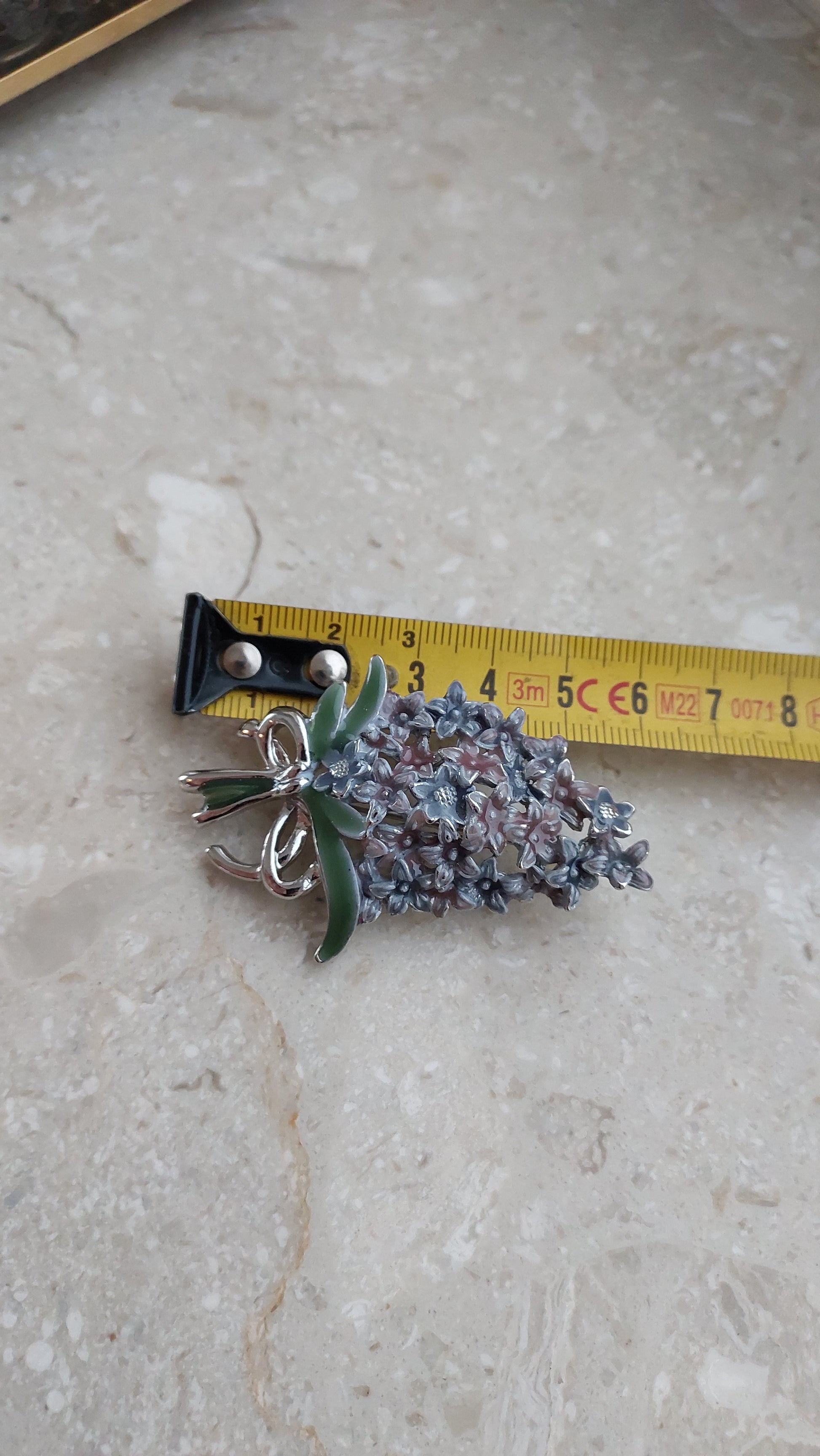 Delikatna broszka w formie gałązki bzu, ozdobiona drobnymi, przestrzennymi kwiatami w liliowo-niebieskich odcieniach. U dołu znajduje się kokardka z zieloną emalią. Stan doskonały.