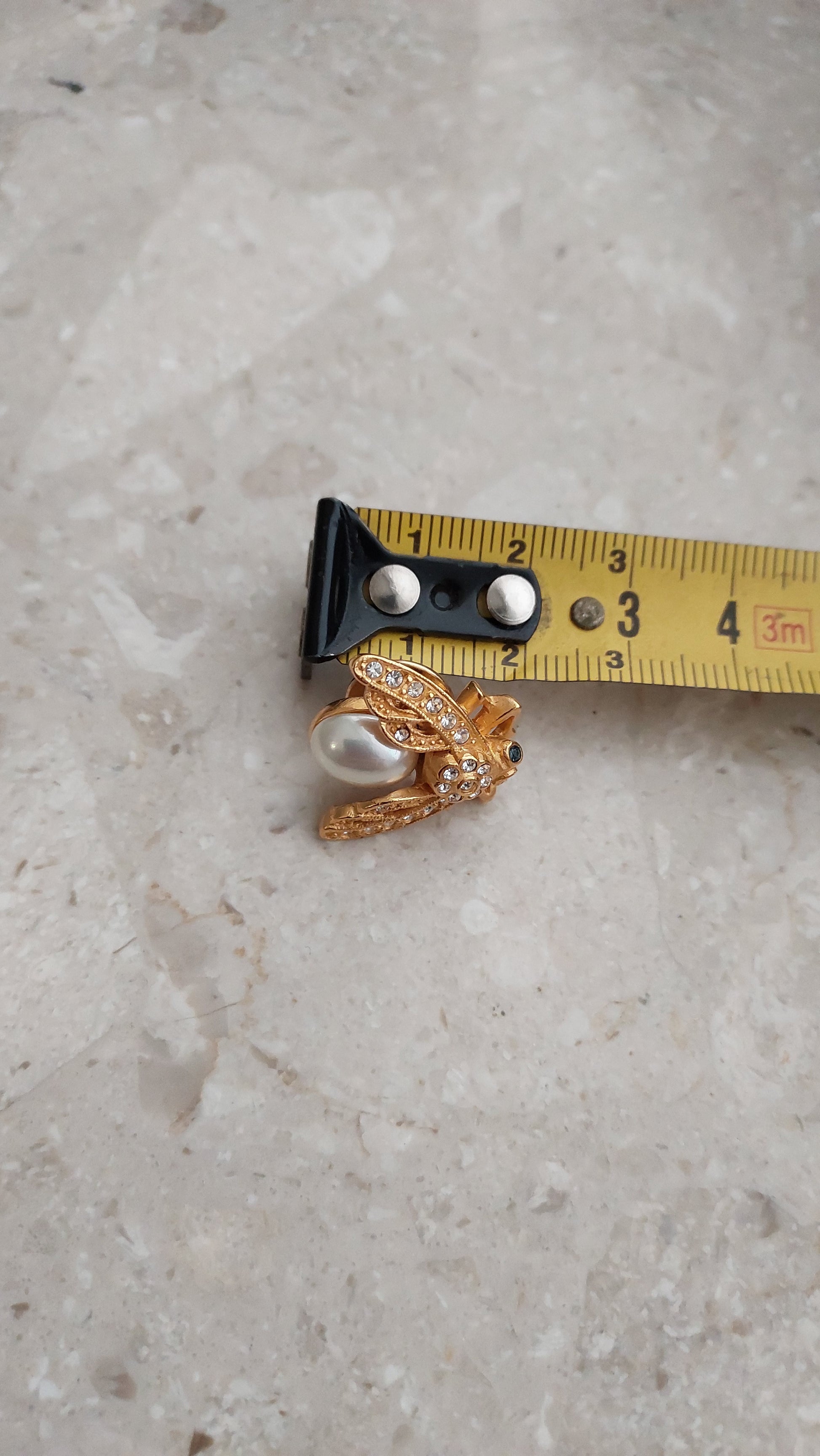 Wykonana w ciepłym, złocistym tonie i wysadzana przezroczystymi kryształkami, które nadają skrzydełkom i korpusowi subtelny blask.