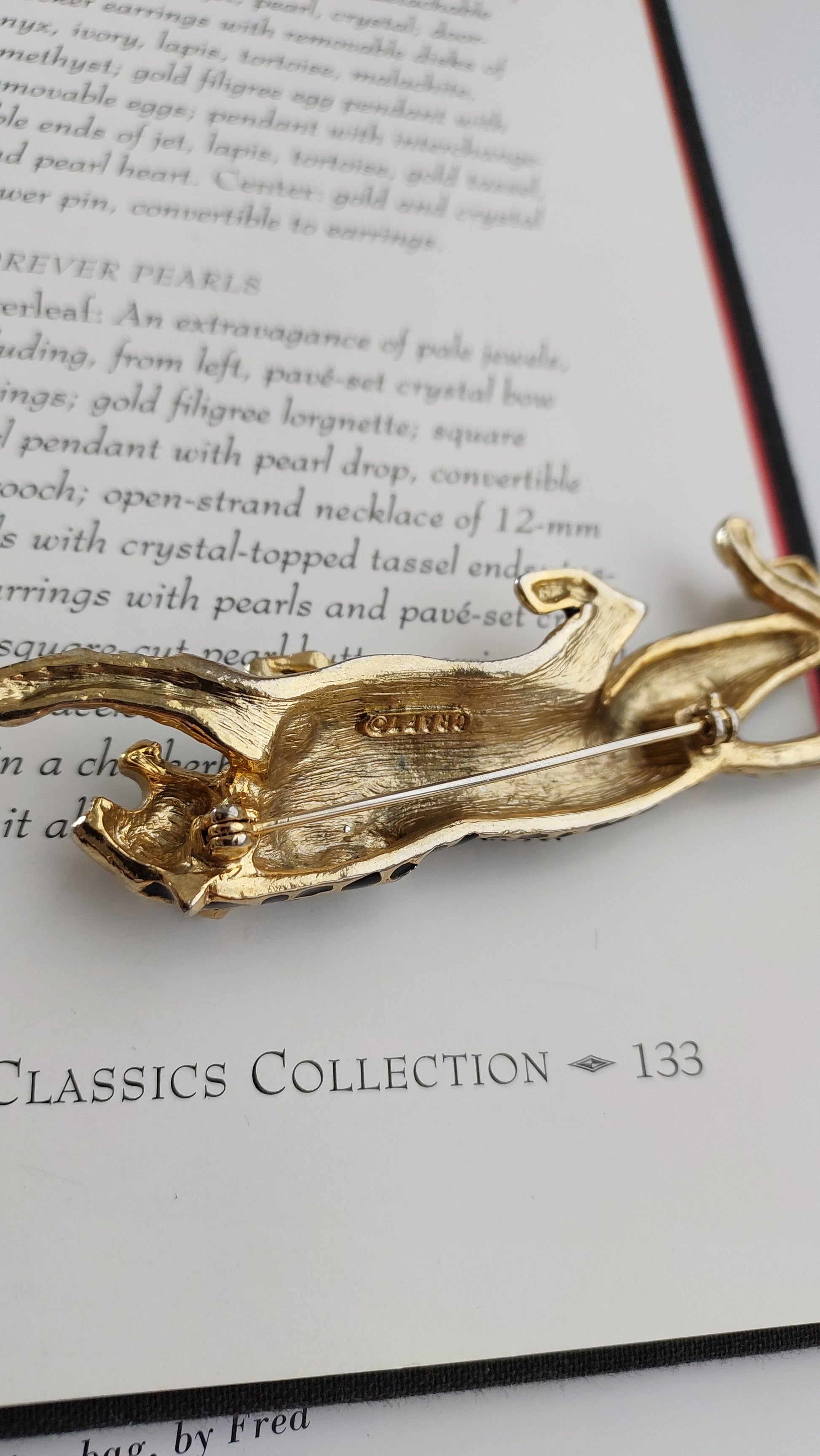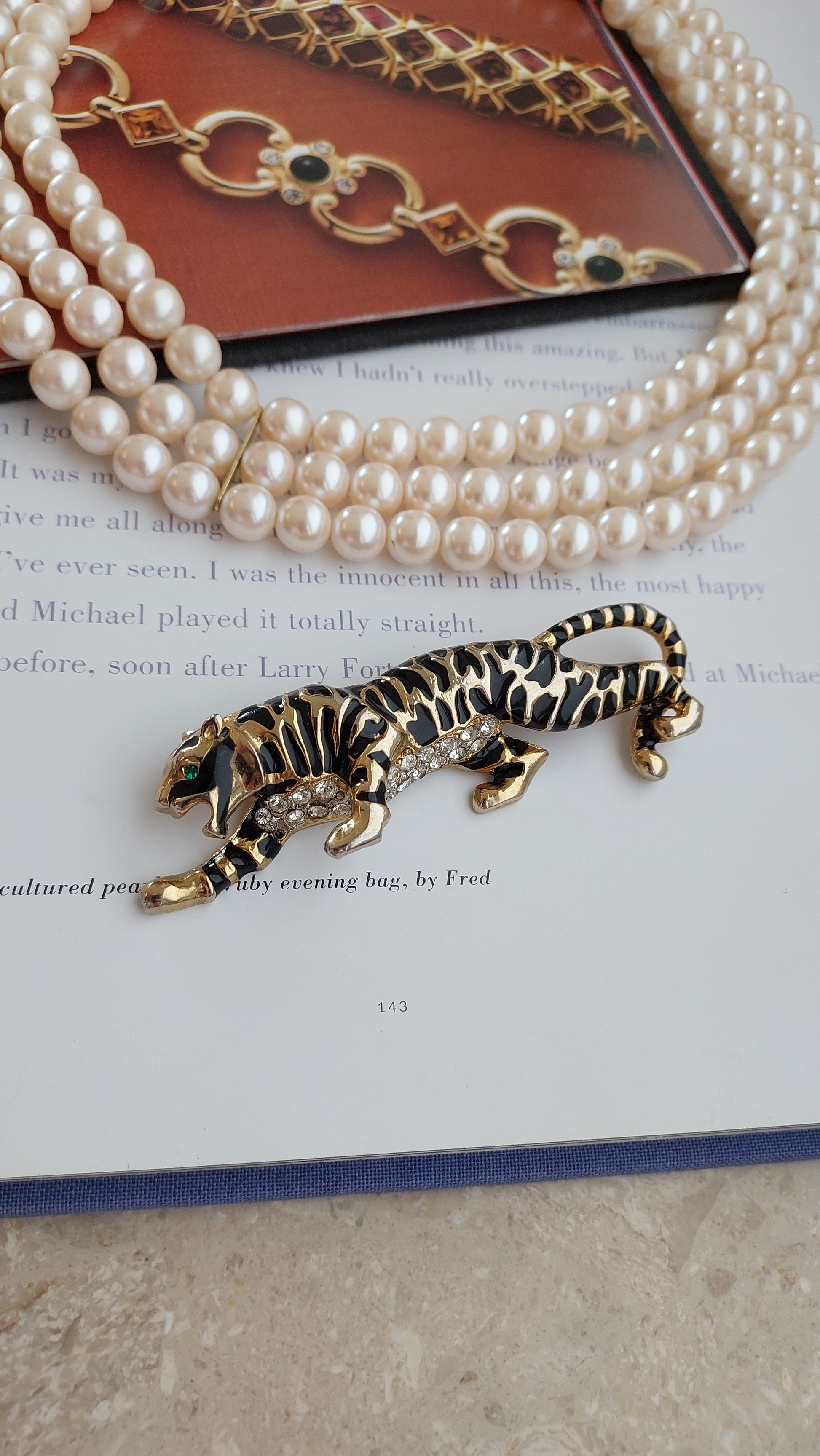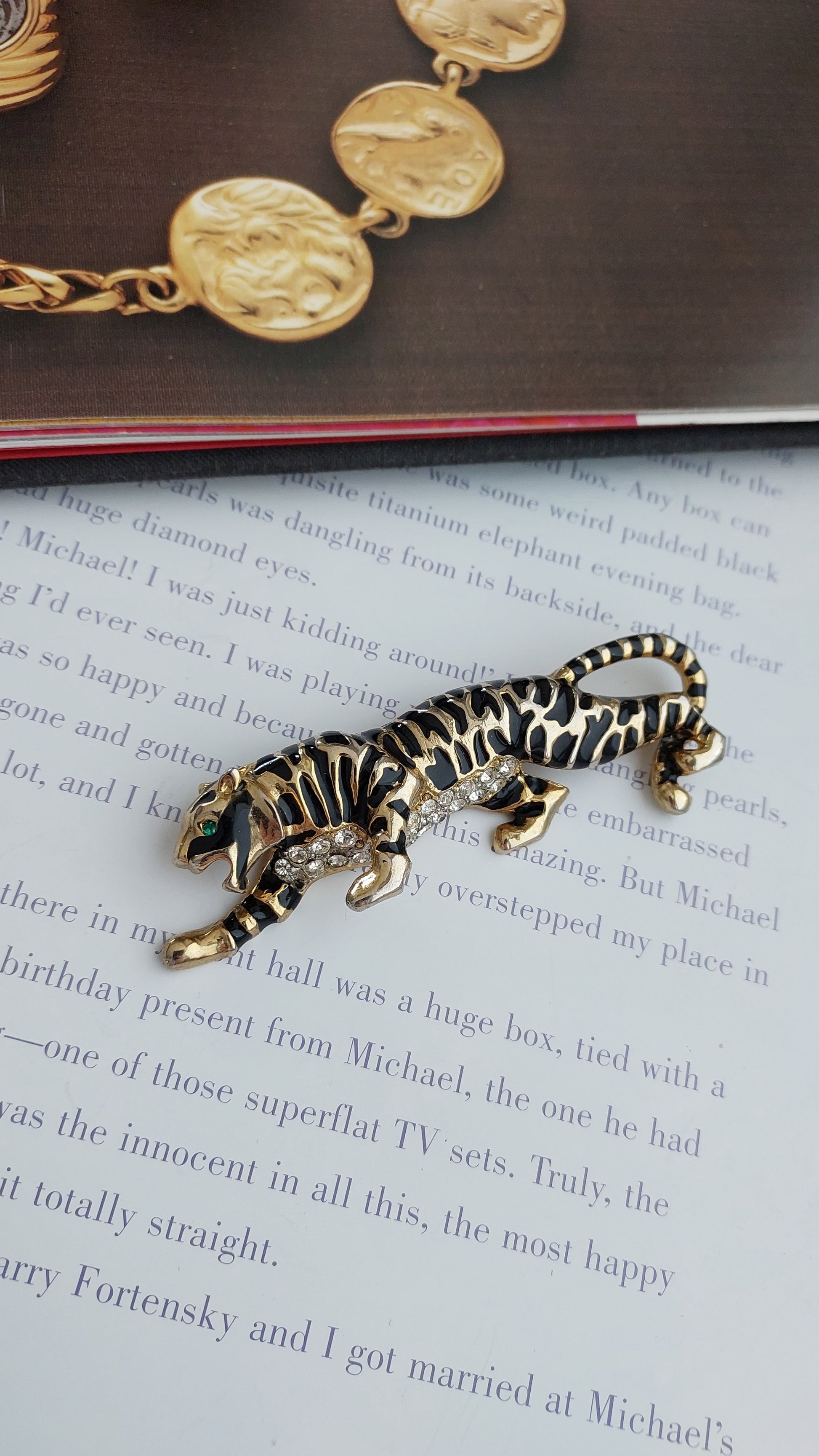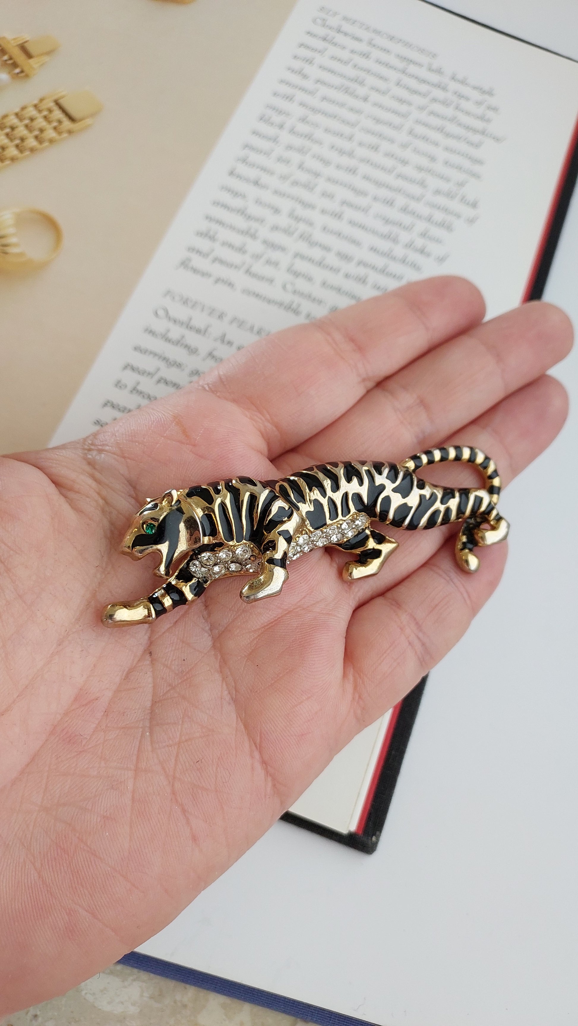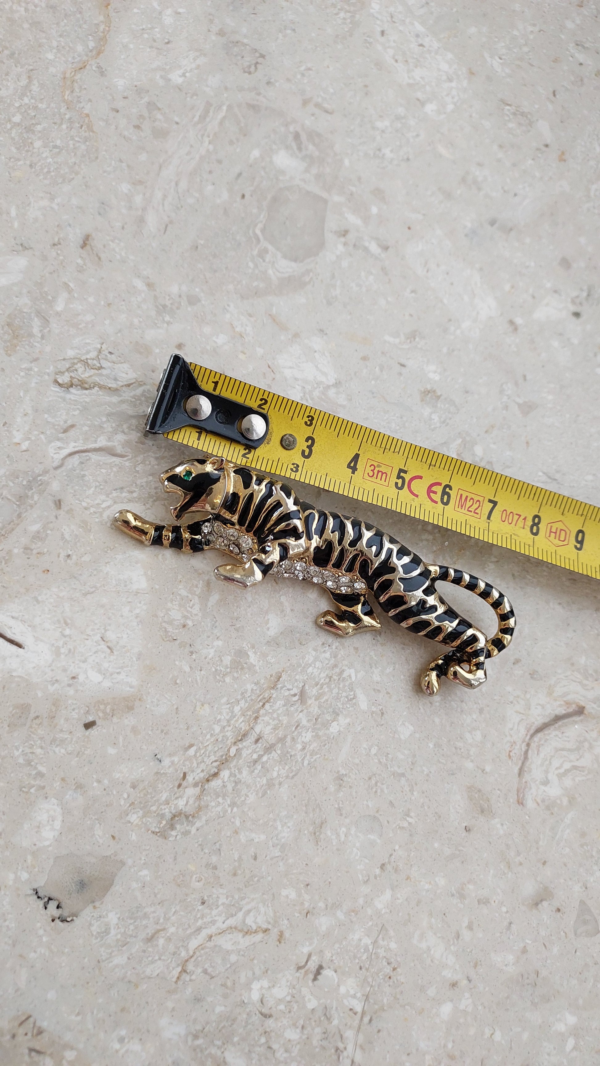 Wyrazista, dynamiczna broszka Craft w formie tygrysa, utrzymana w połączeniu złota, czerni i połyskujących cyrkonii. W świetnym stanie