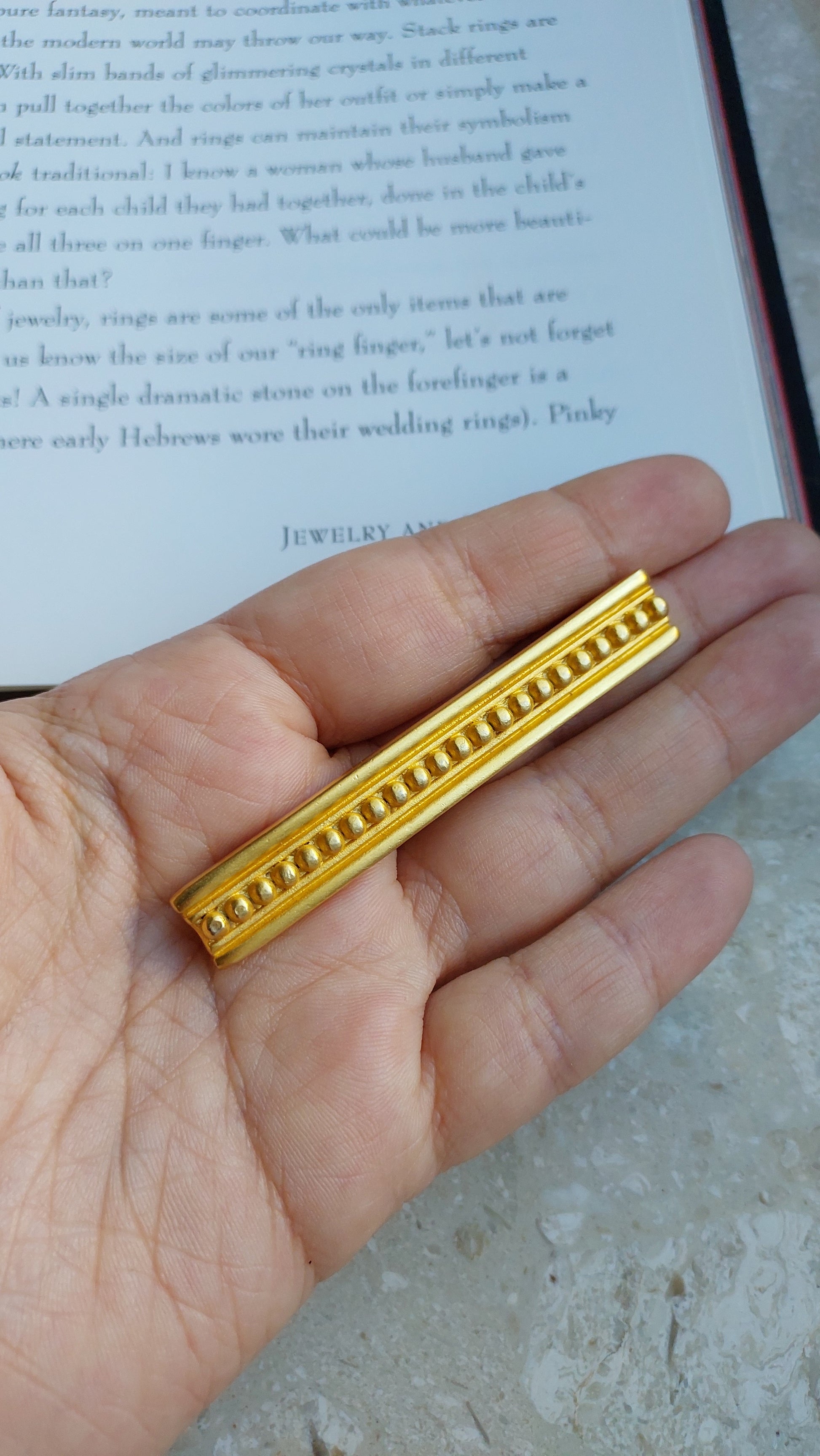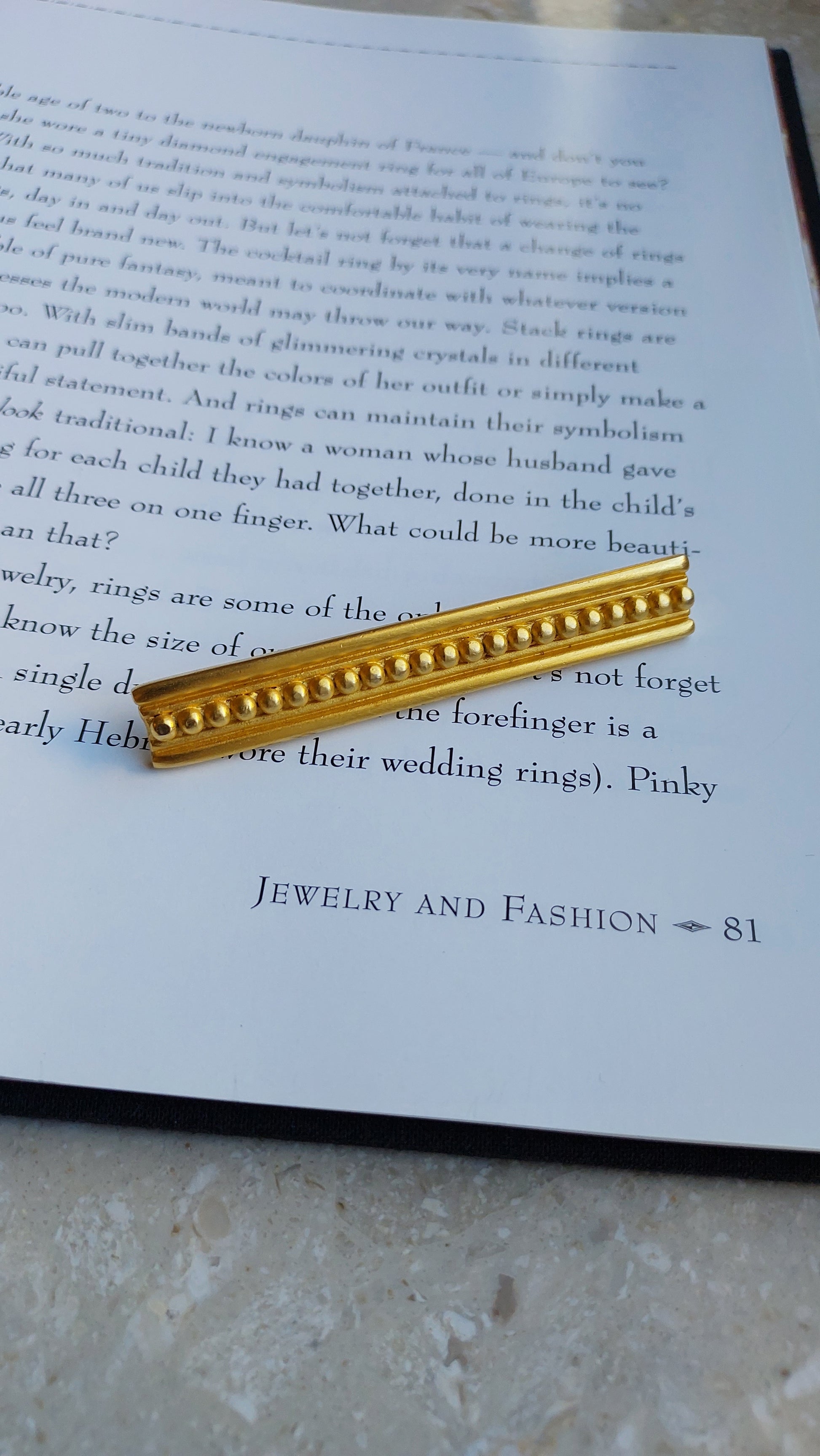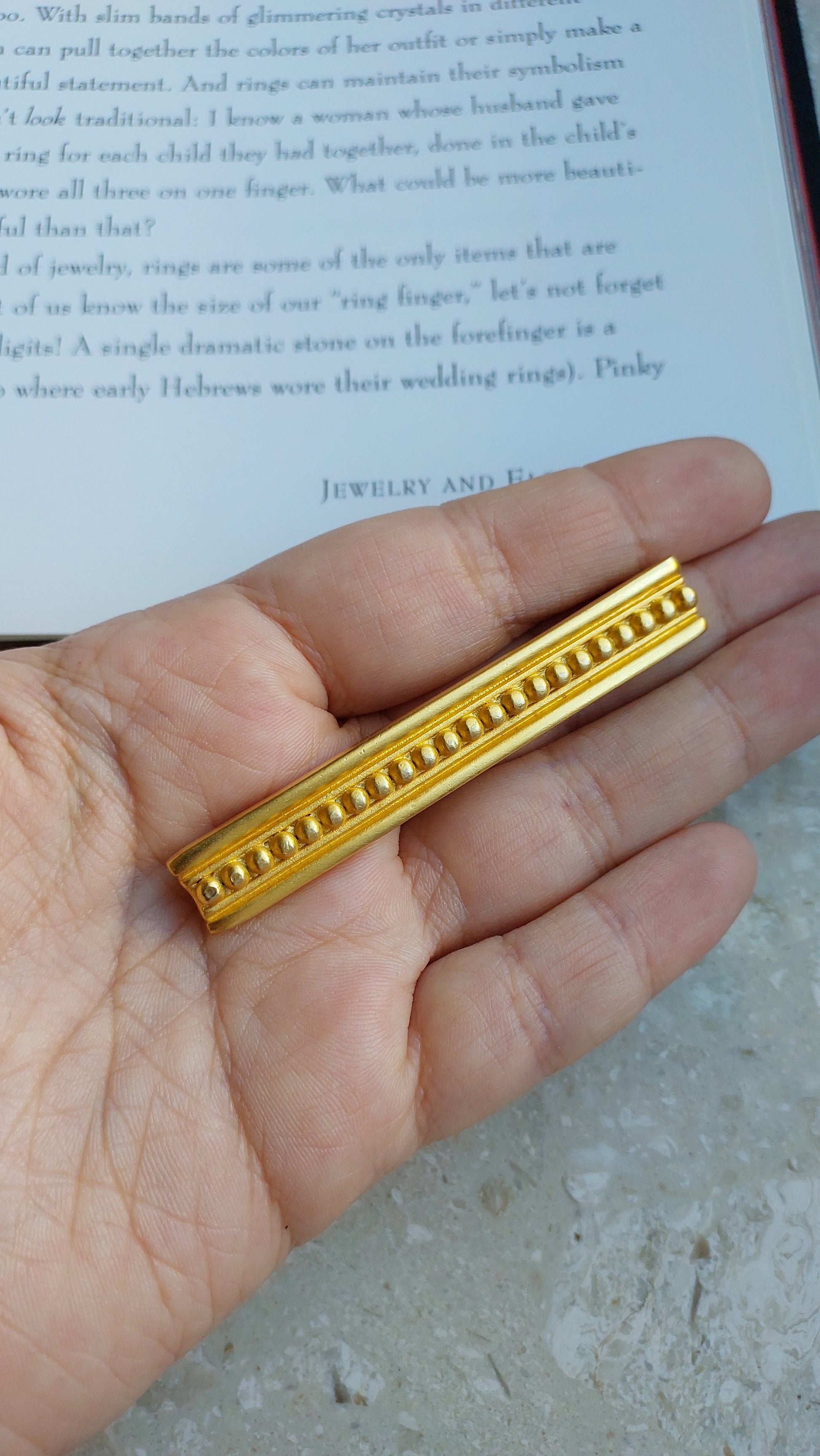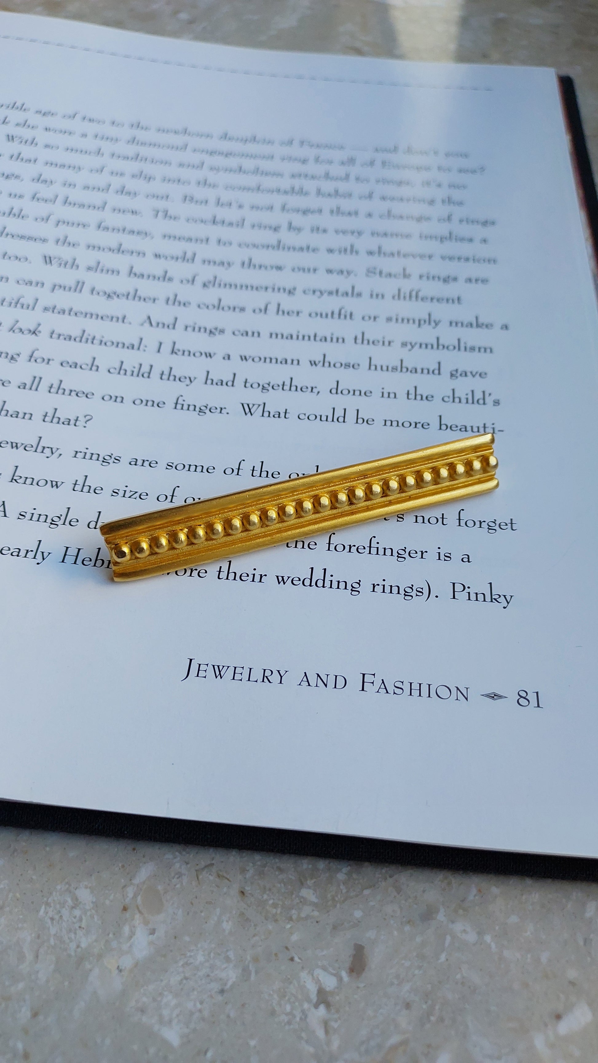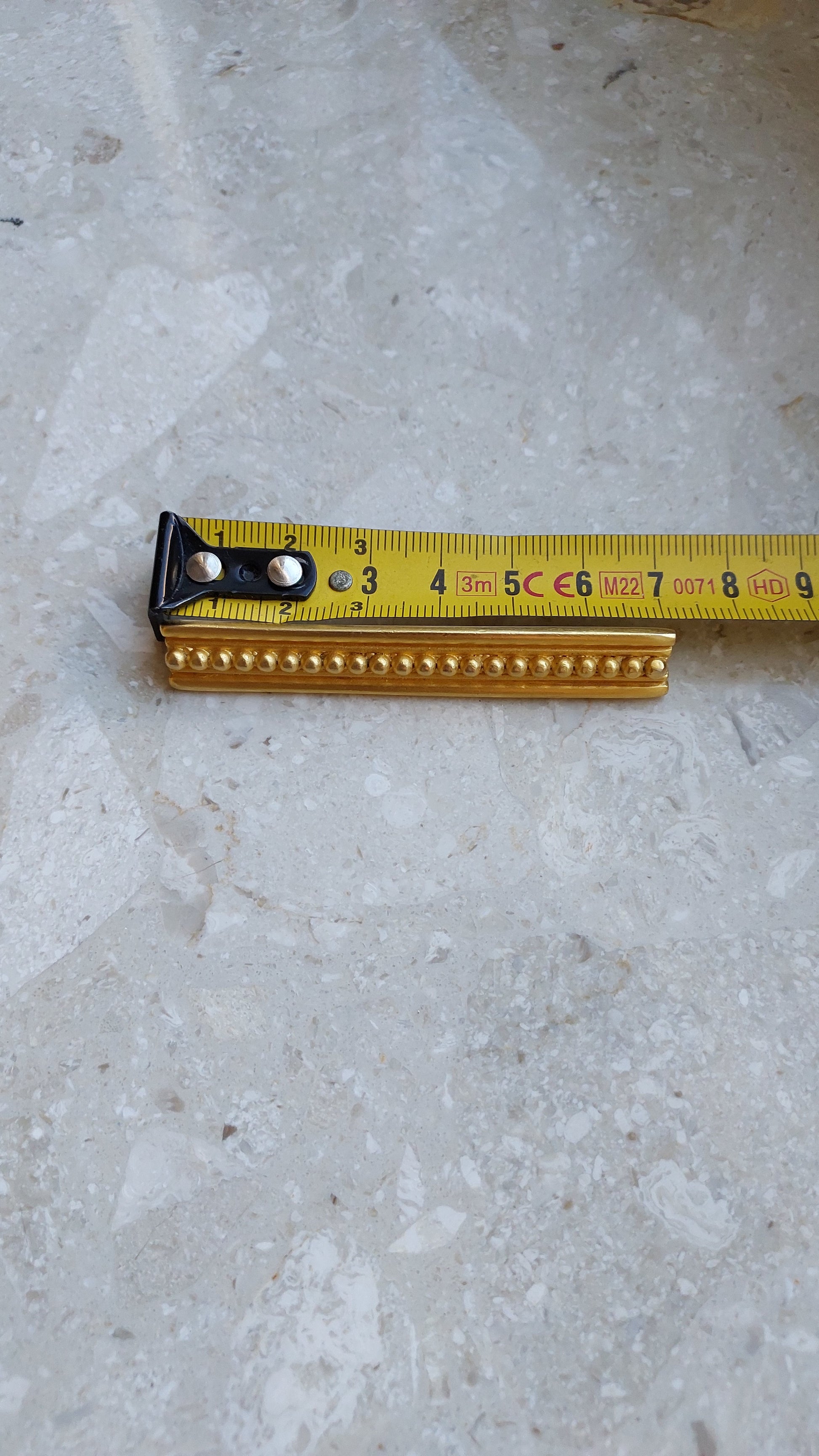 Broszka vintage Givenchy w formie eleganckiego, wydłużonego paska z geometrycznym reliefem. Pozłacany metal i wyraźna symetria nadają ozdobie stylowy, architektoniczny charakter. Minimalistyczna forma sprawia, że broszka jest uniwersalna — doskonale prezentuje się zarówno w zestawieniu z garniturem, jak i z wieczorową stylizacją. Stan bardzo dobry.