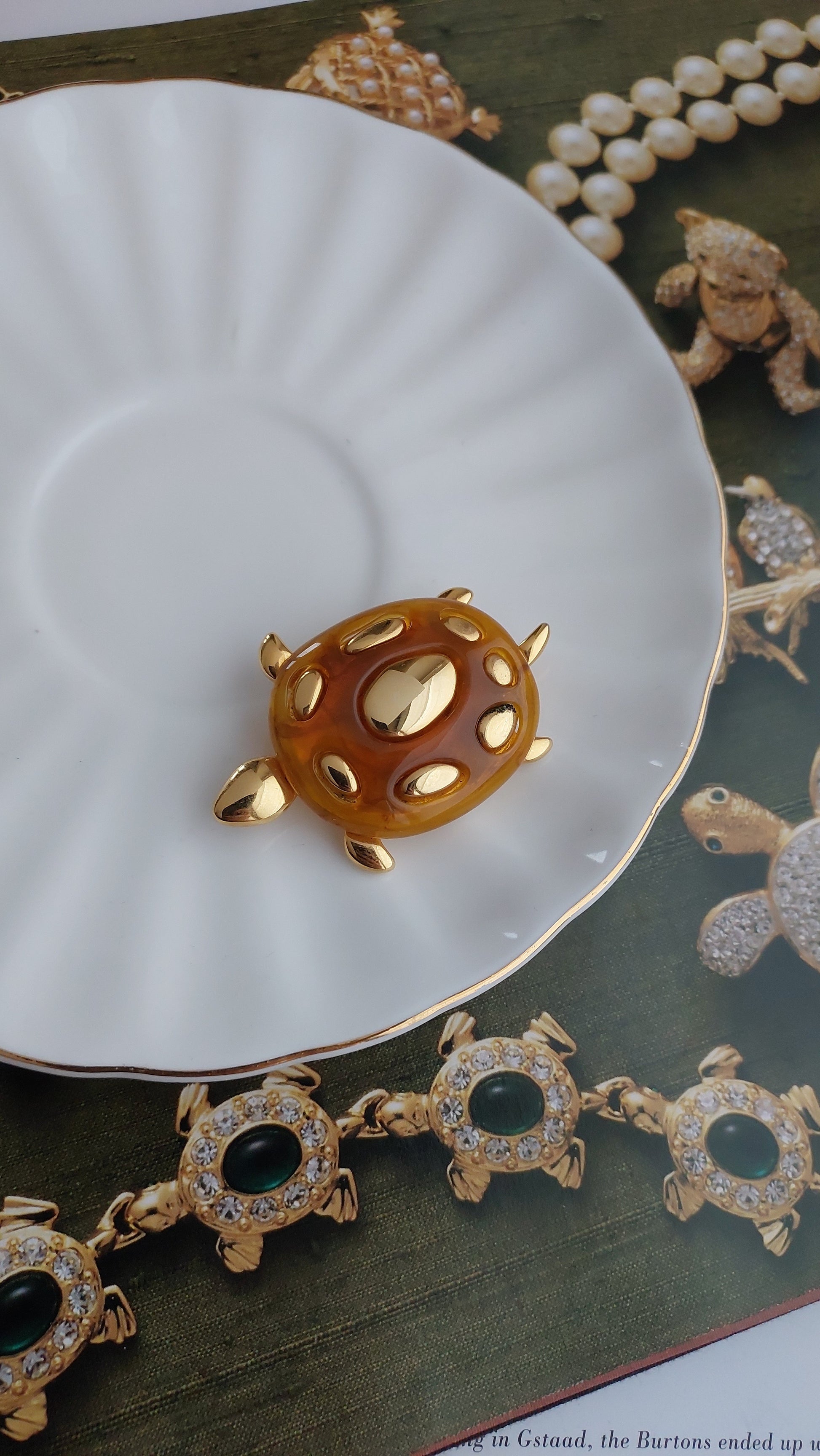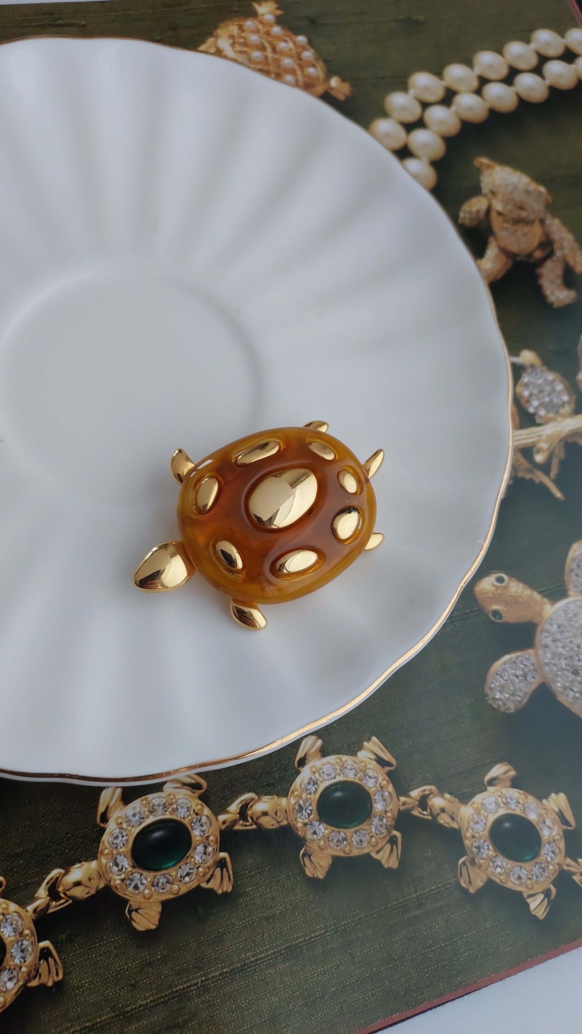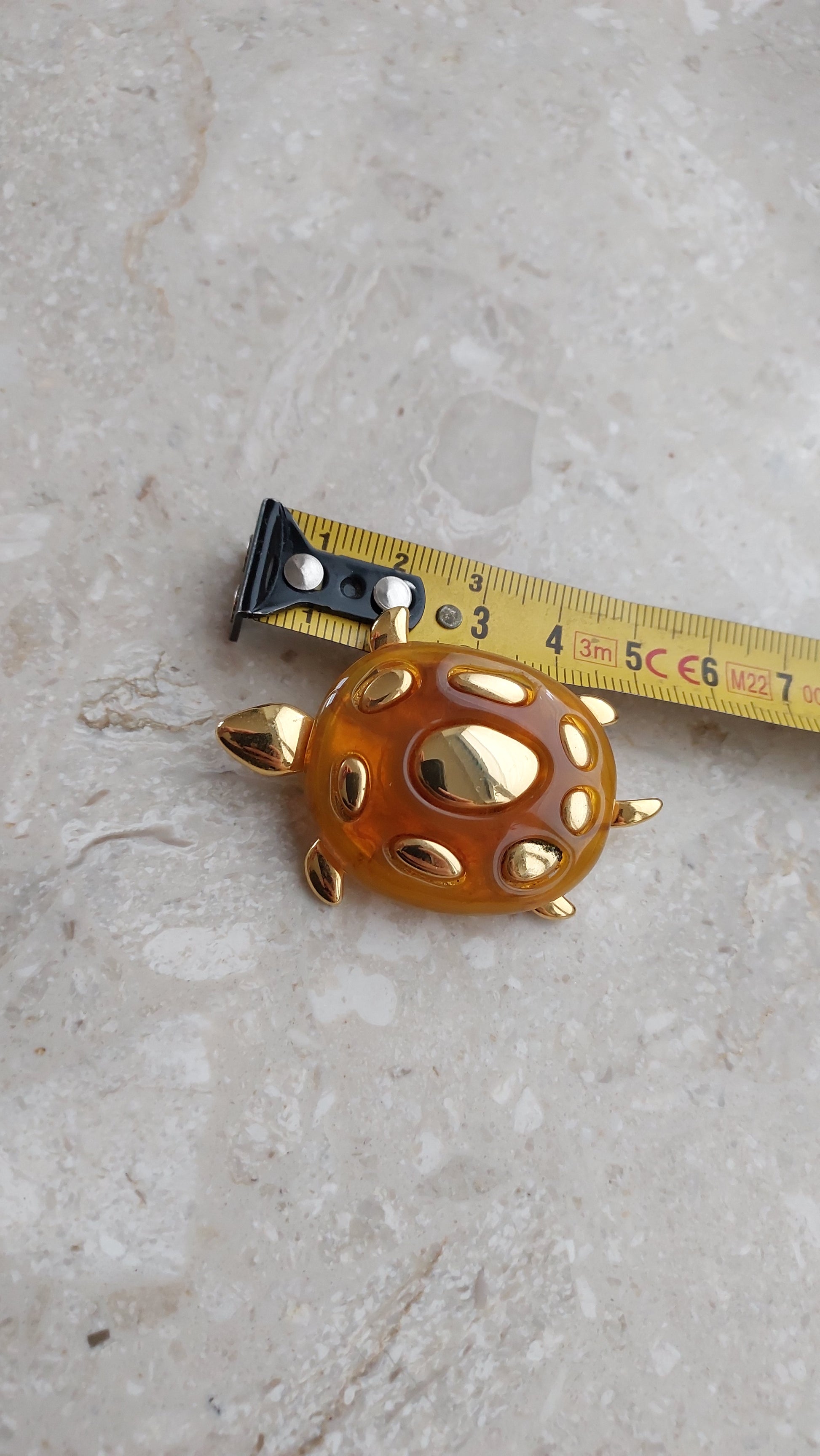 Urocza broszka Liz Claiborne w formie żółwia z półprzezroczystym pancerzem w bursztynowym odcieniu i złocistymi akcentami. W świetnym stanie