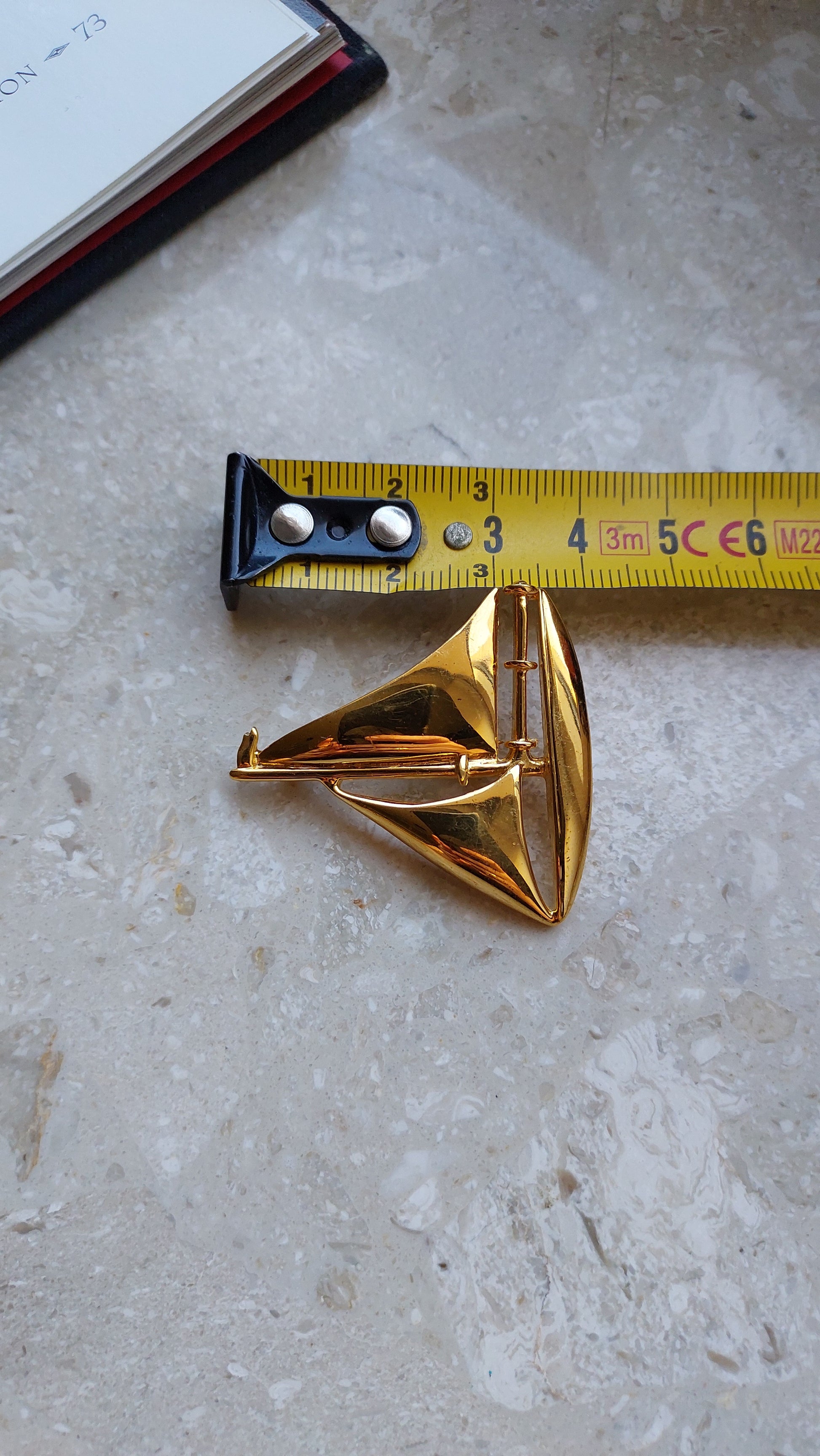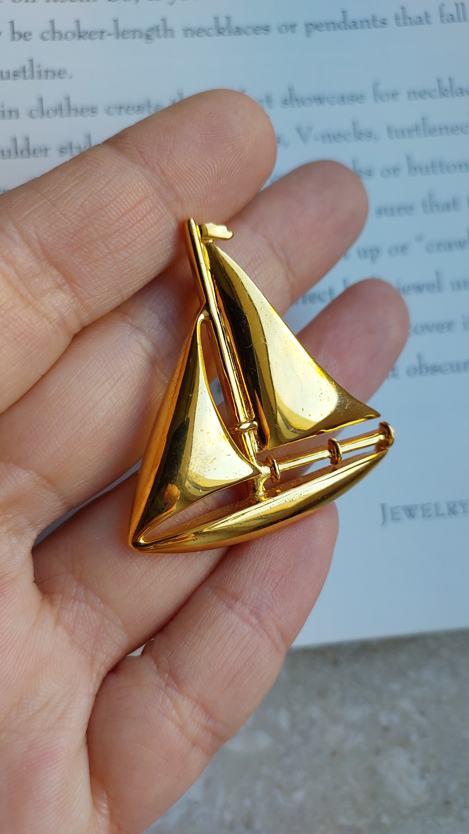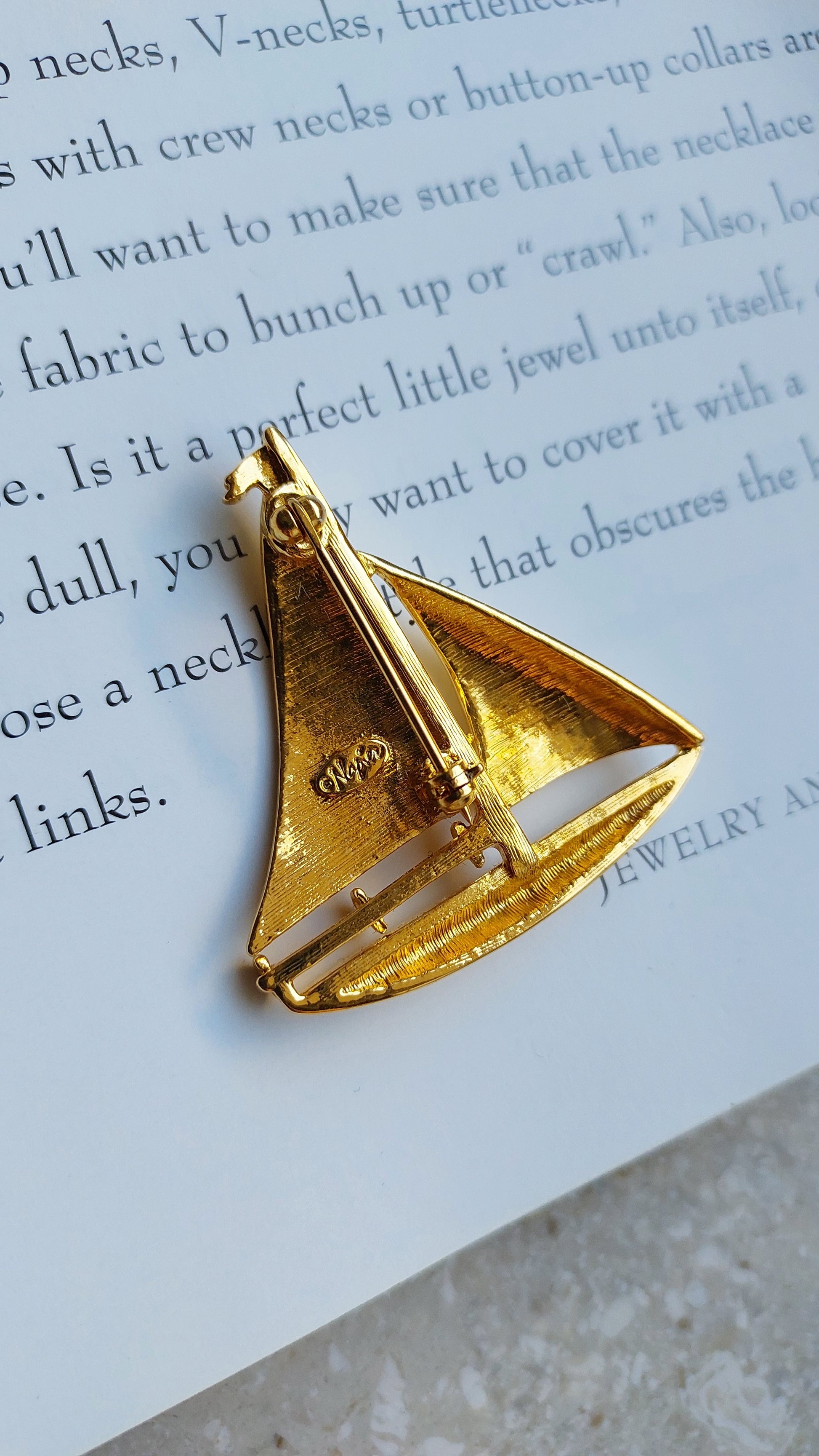 Broszka vintage Napier w kształcie żaglówki w złotym odcieniu. Są przetarcia na powłoce w kolorze złota z przodu