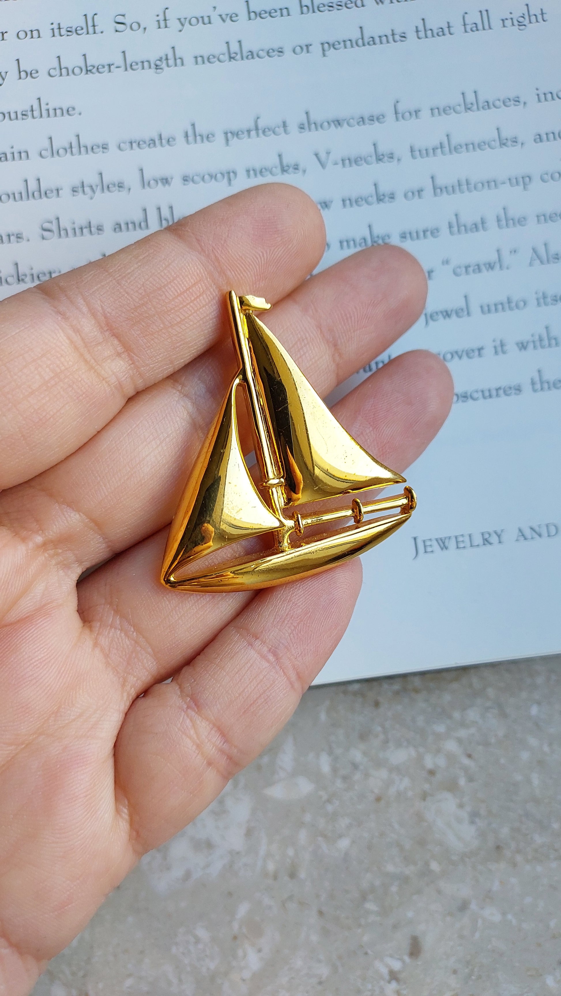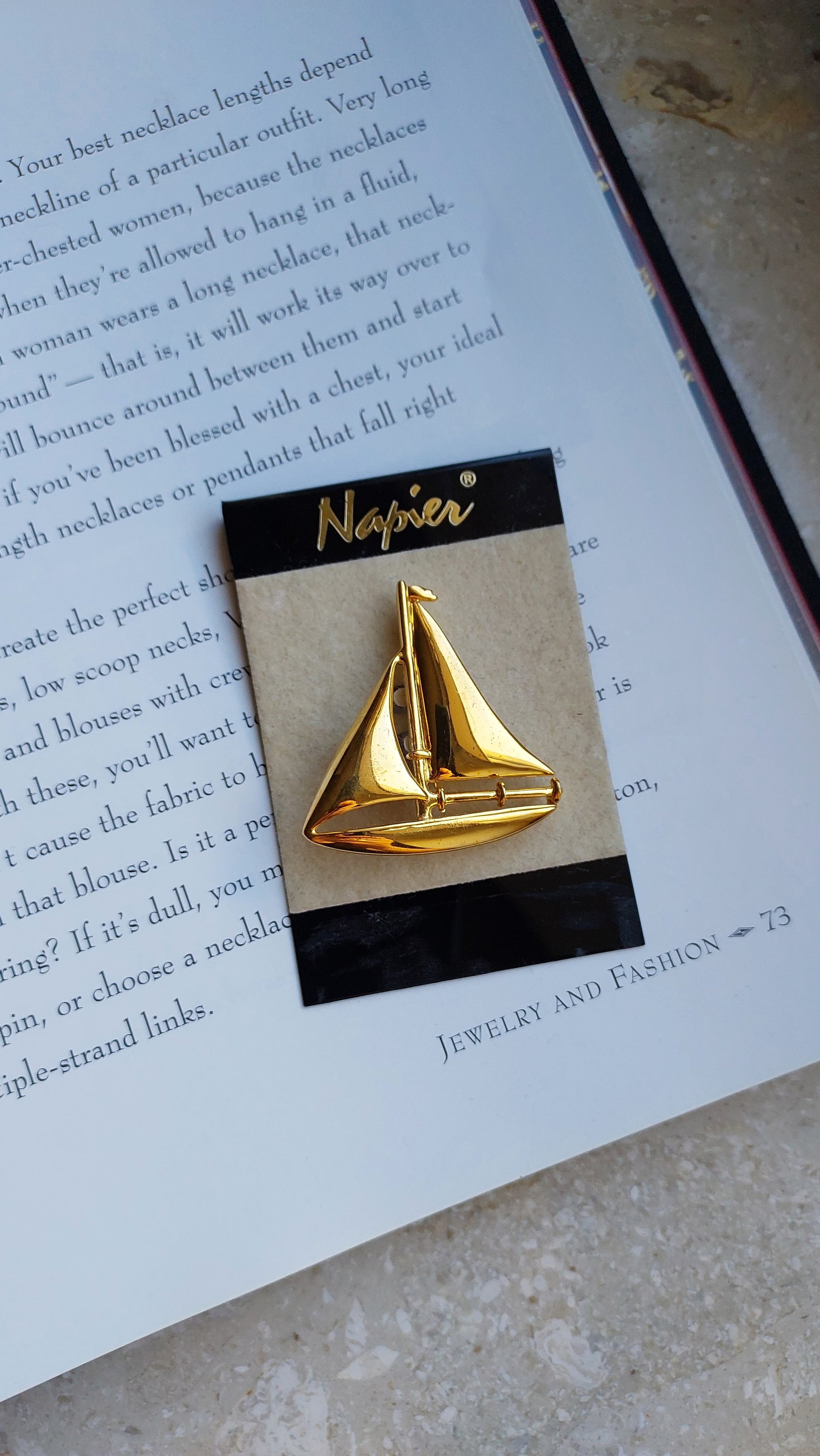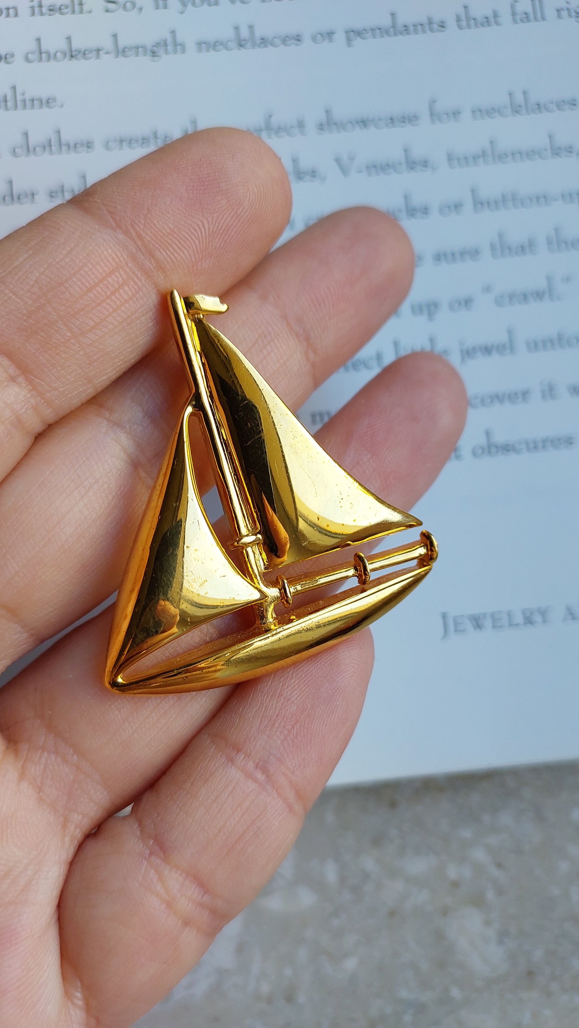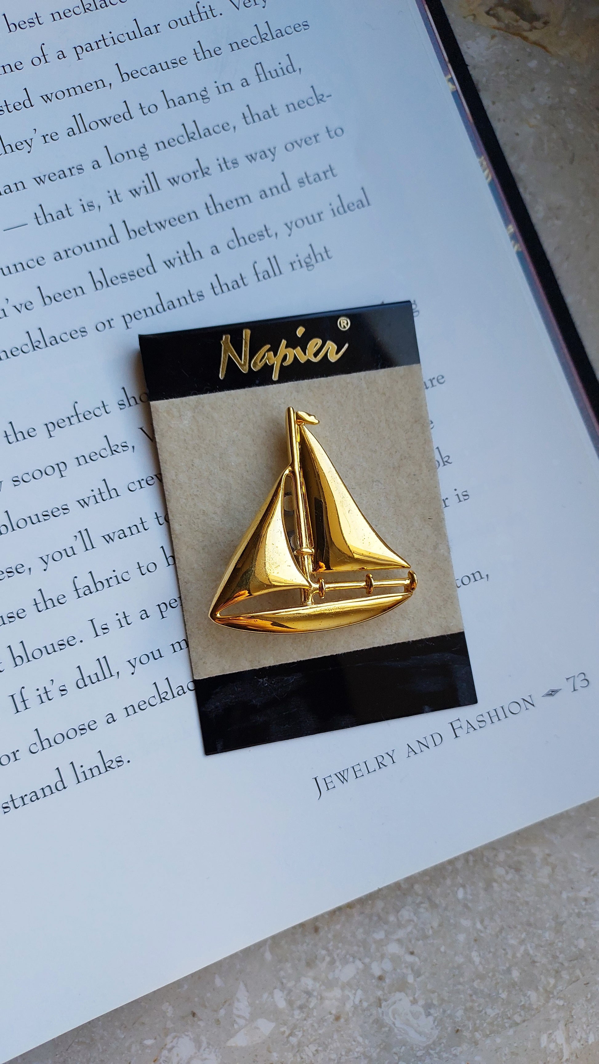 Broszka vintage Napier w kształcie żaglówki w złotym odcieniu. Są przetarcia na powłoce w kolorze złota z przodu