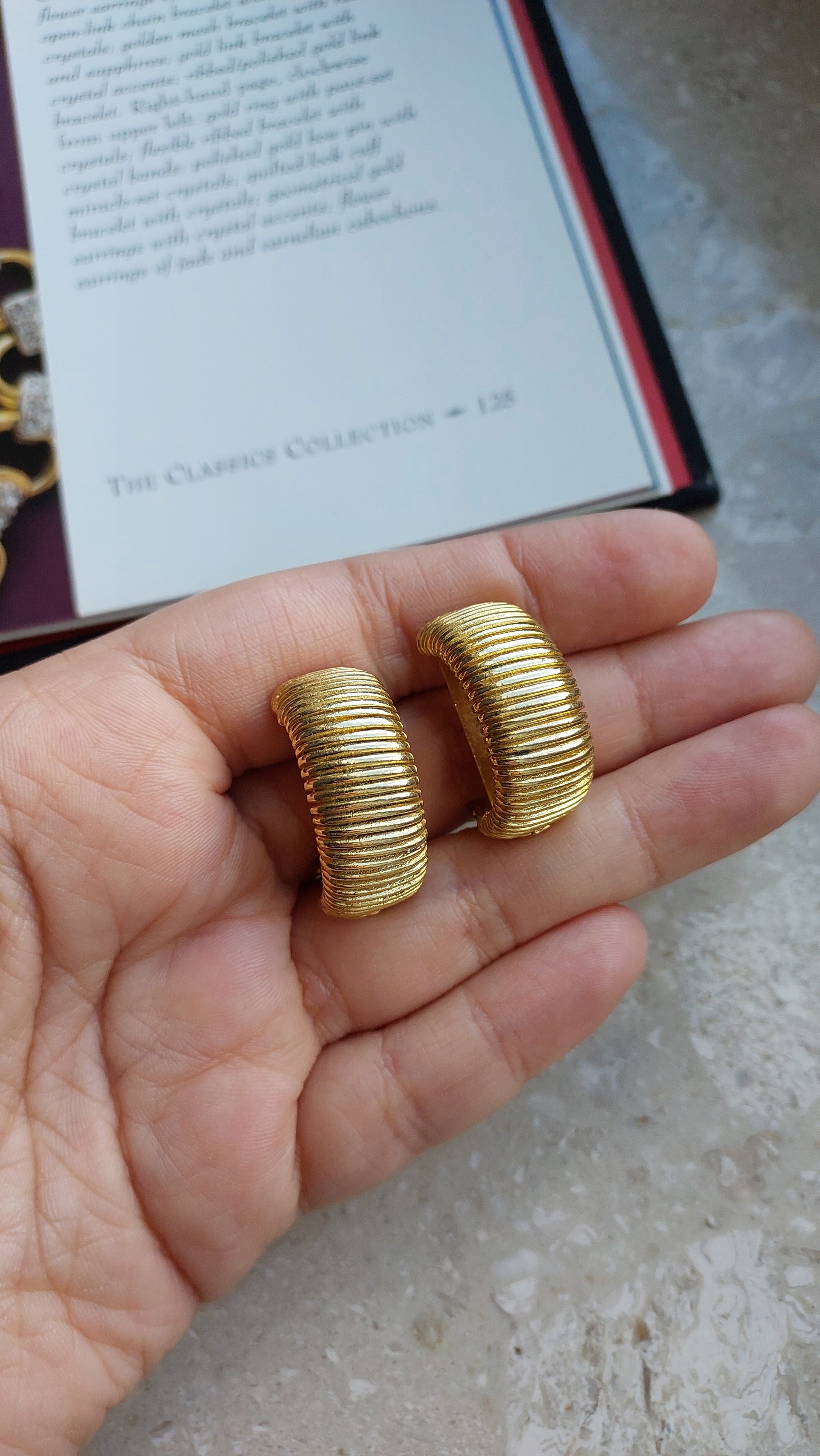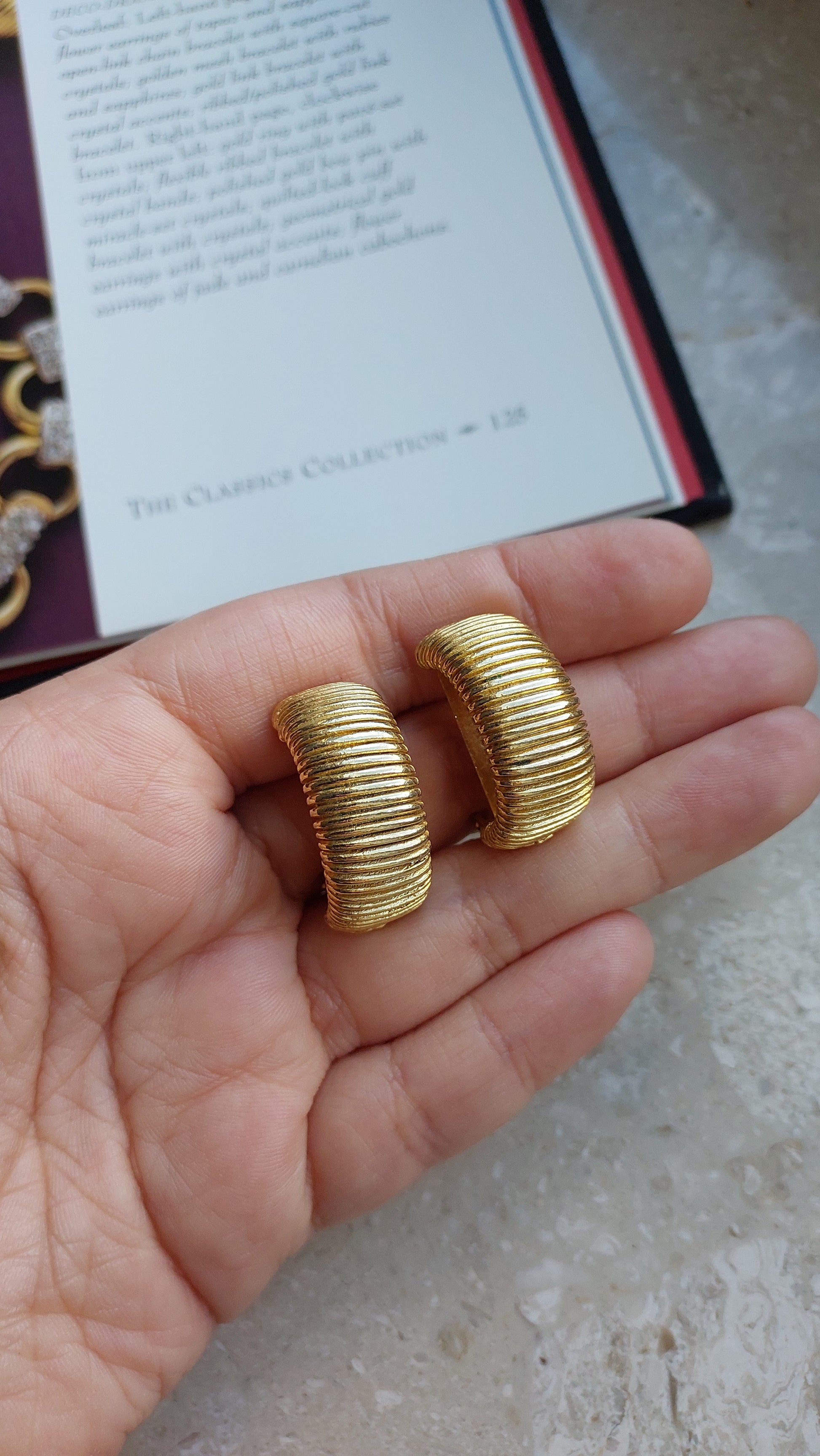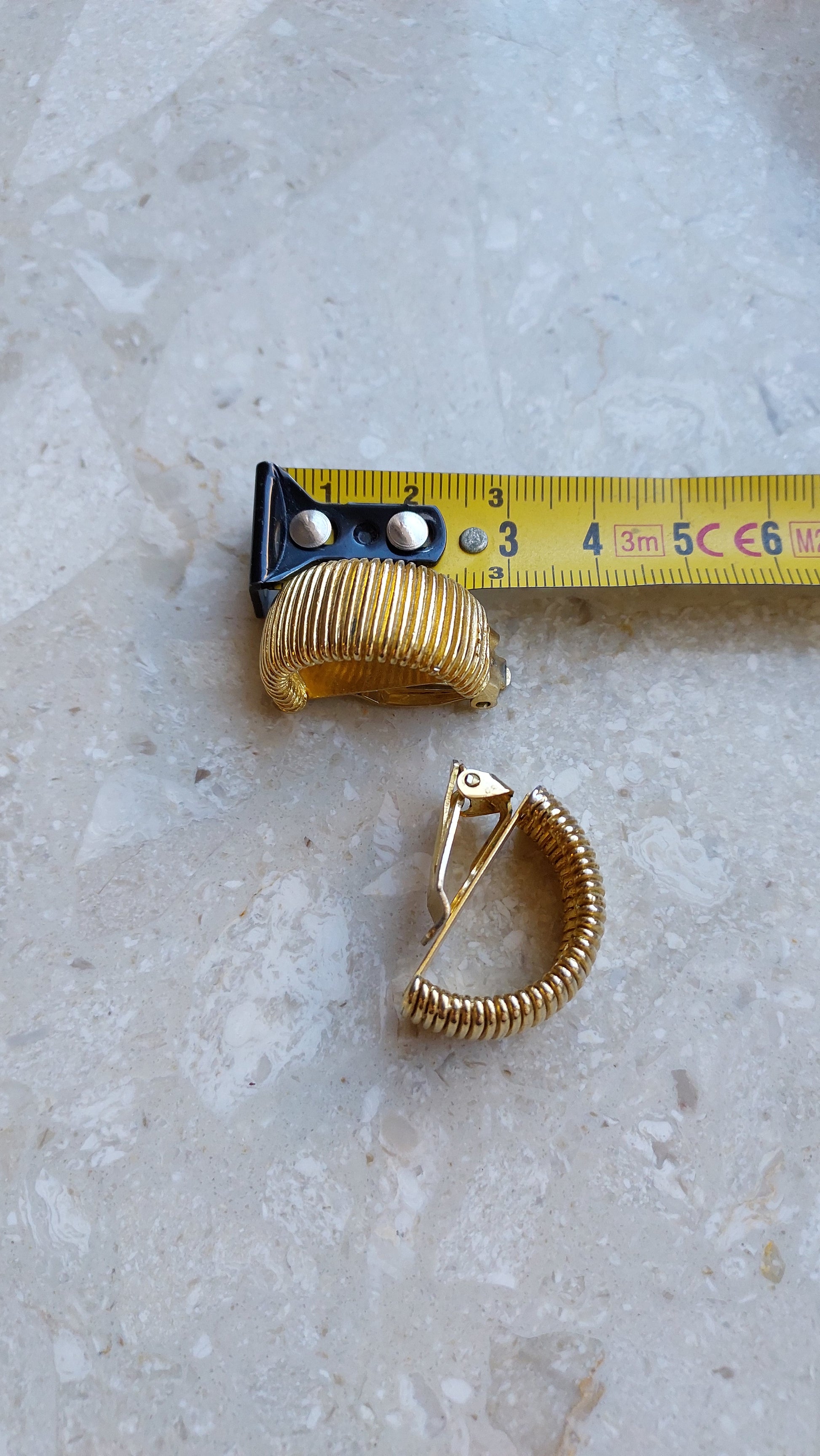 Minimalistyczne klipsy o półokrągłym kształcie z reliefową fakturą. W dobrym stanie, na wewnętrznej stronie widoczne są drobne przyciemnienia.