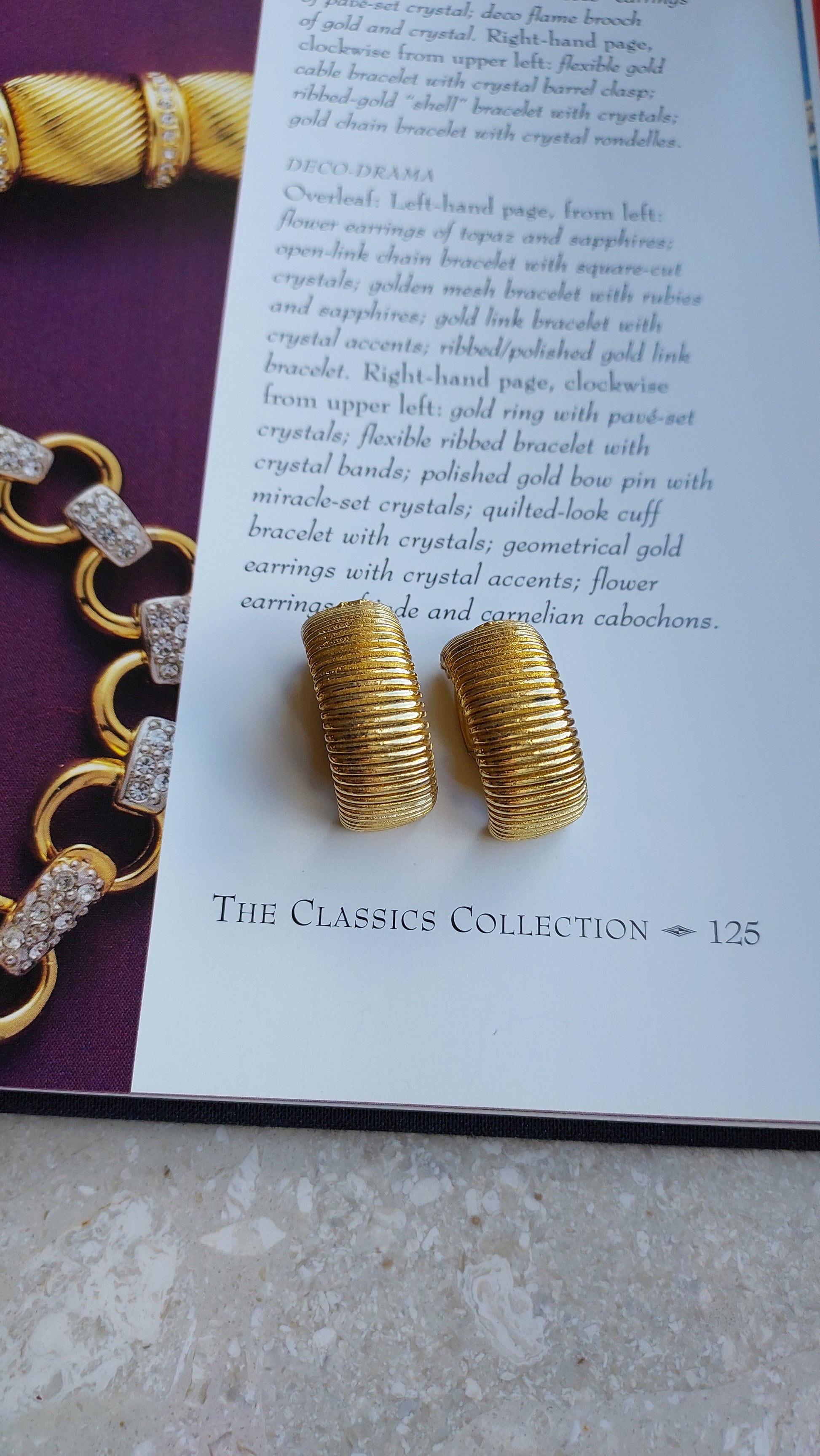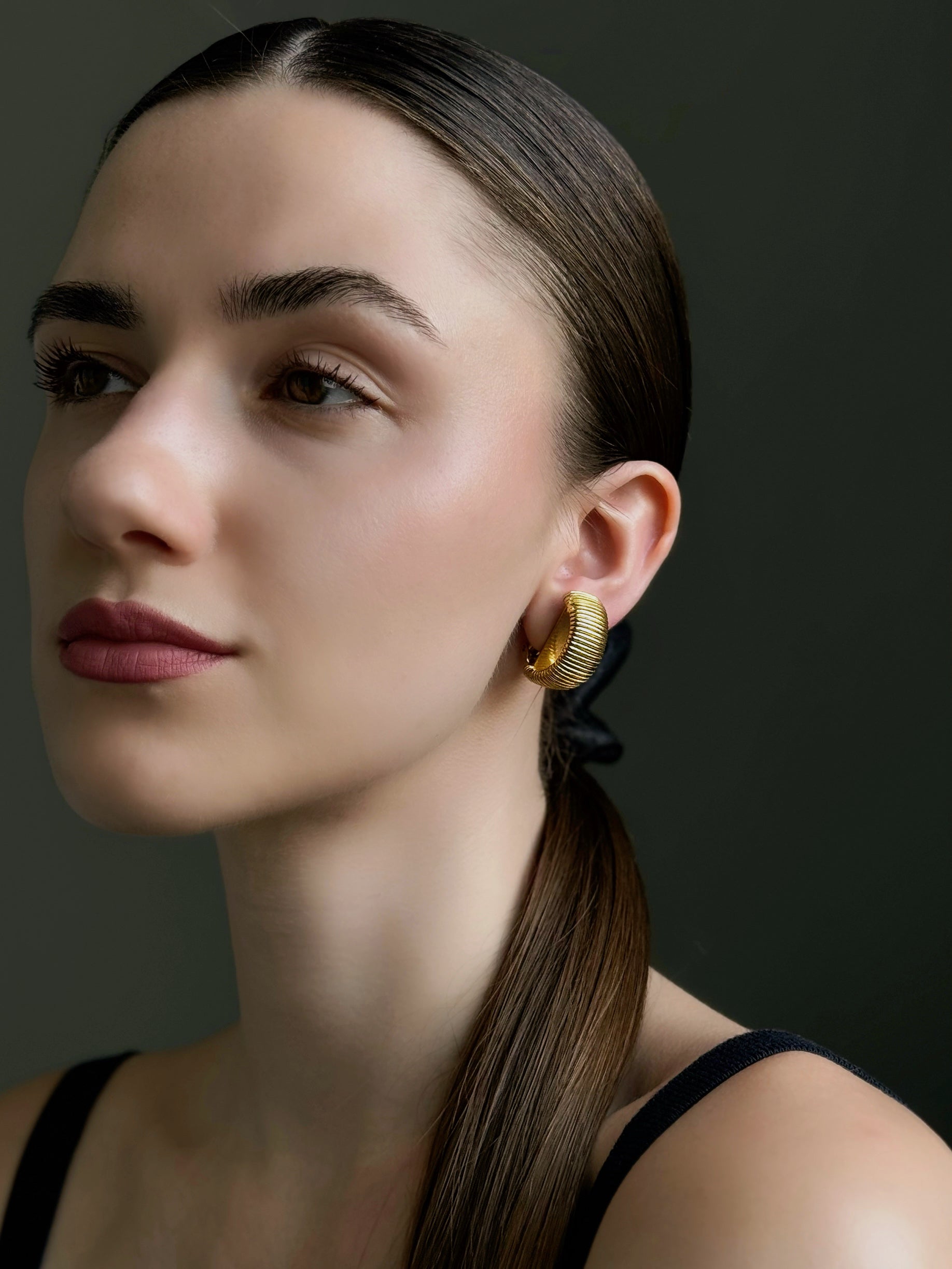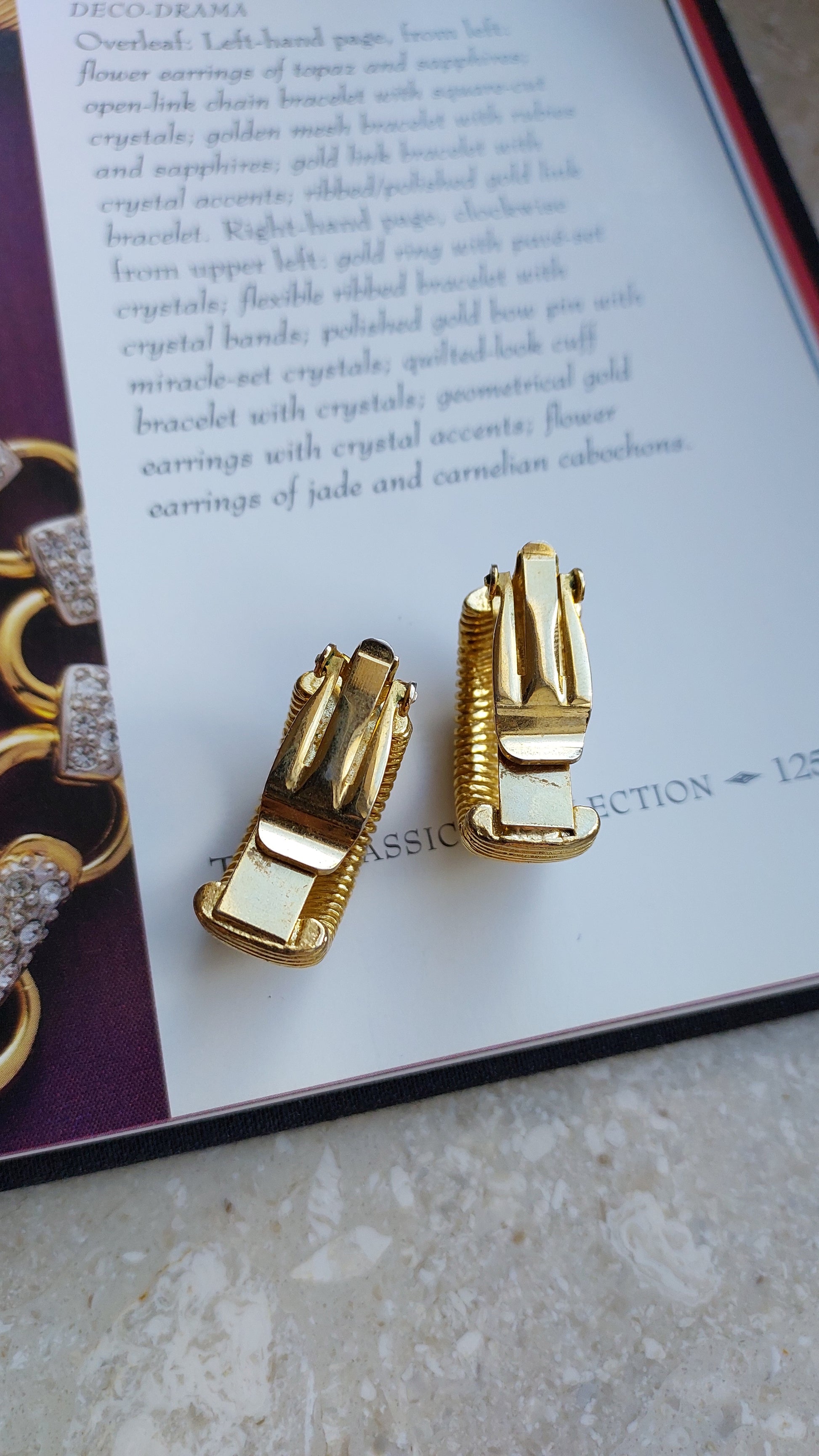 Minimalistyczne klipsy o półokrągłym kształcie z reliefową fakturą. W dobrym stanie, na wewnętrznej stronie widoczne są drobne przyciemnienia.