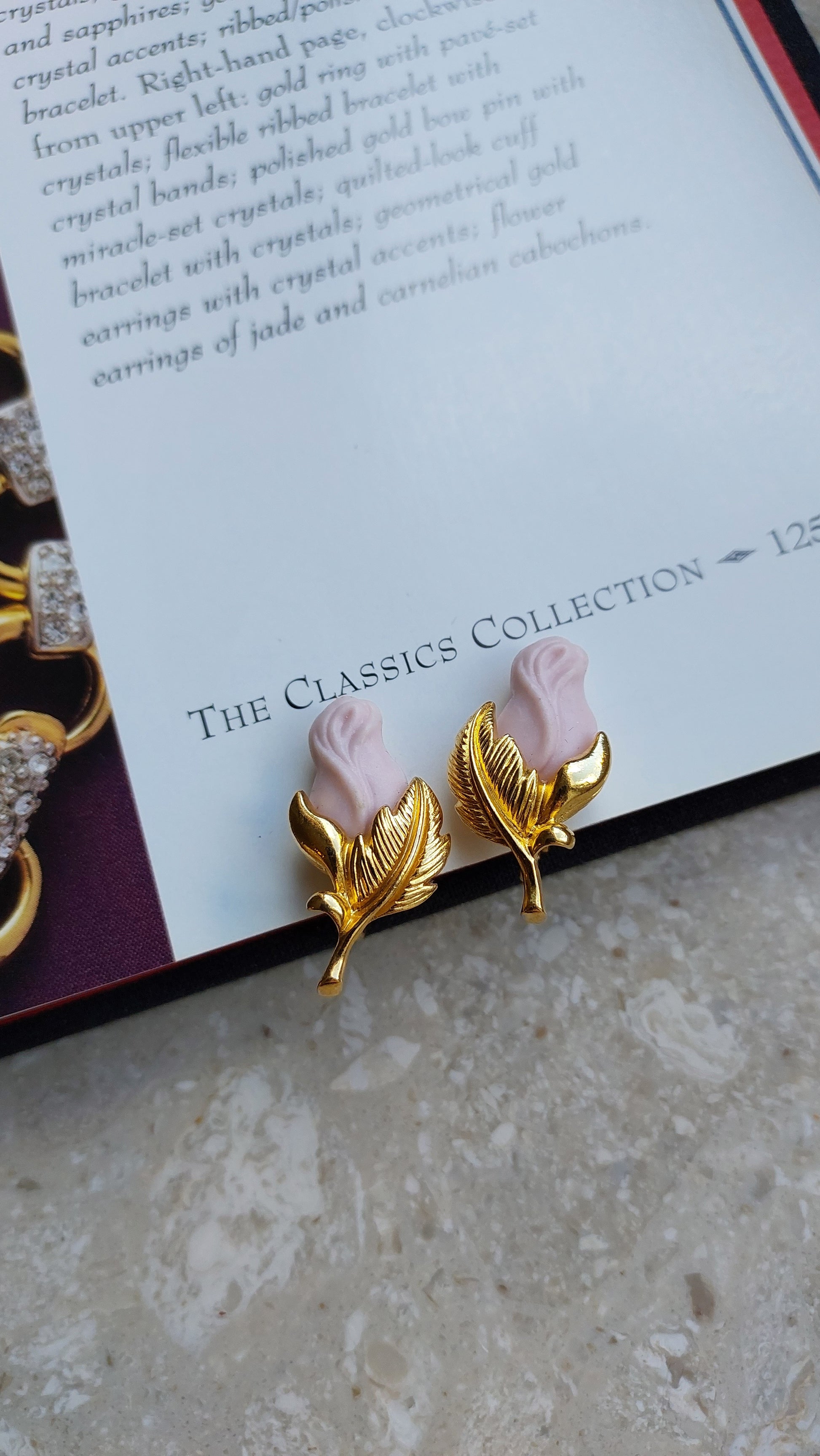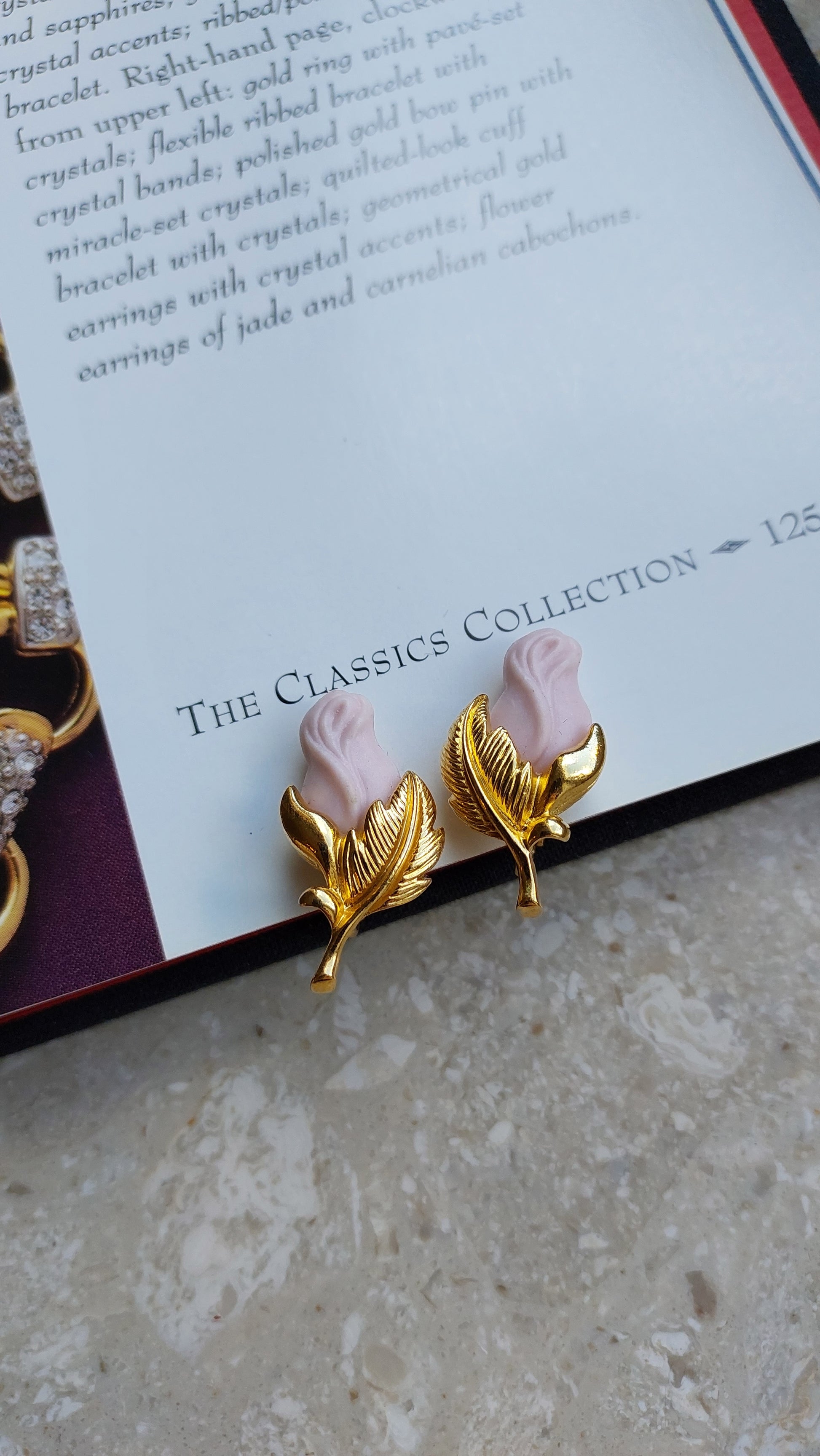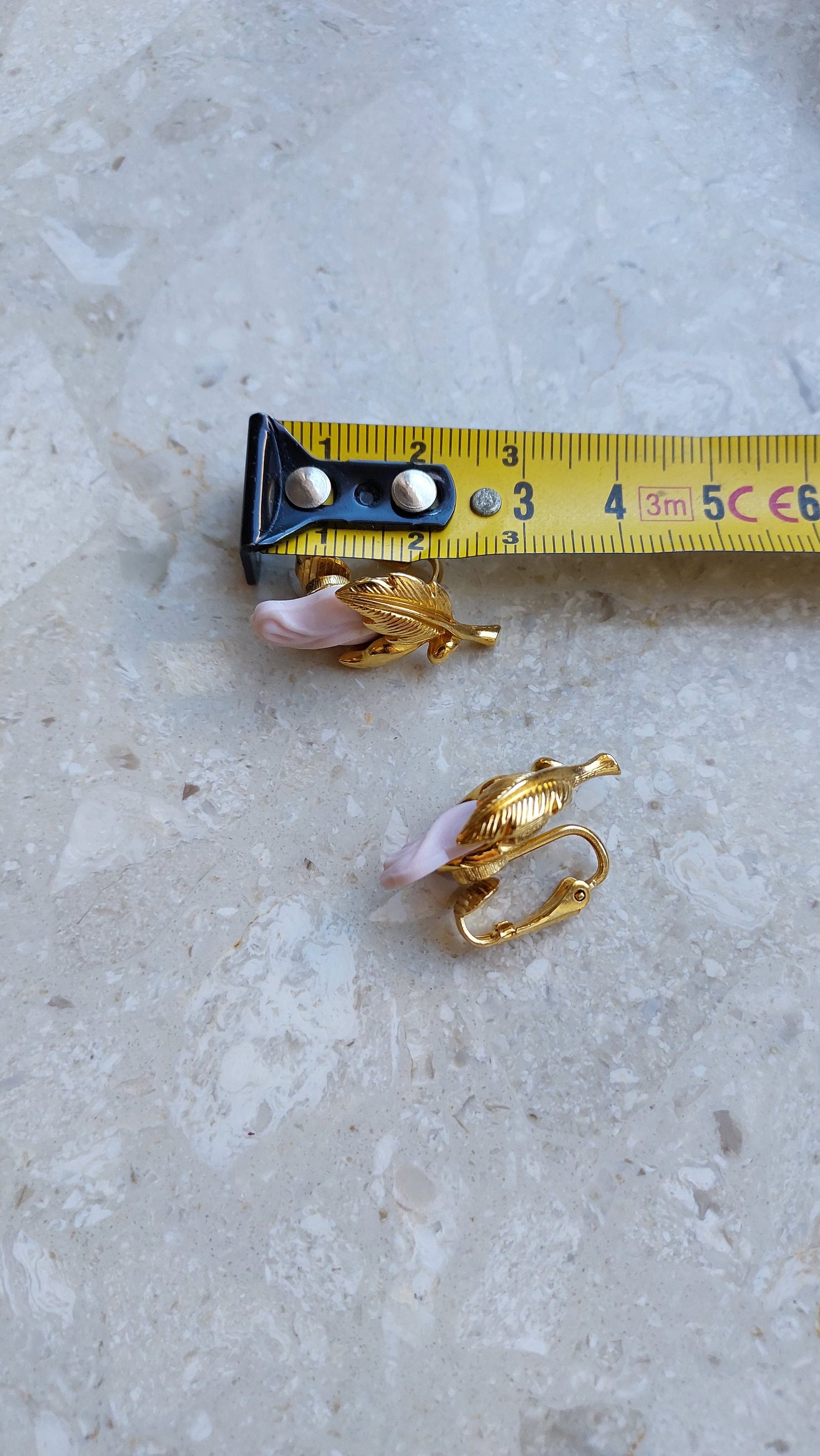 Klipsy vintage Avon( lata 90-te)o subtelnym, romantycznym designie. Każda klipsa ma formę delikatnej róży, której płatki wykonane są z jasnoróżowego akrylu, tworzącego efekt naturalnego kamienia.