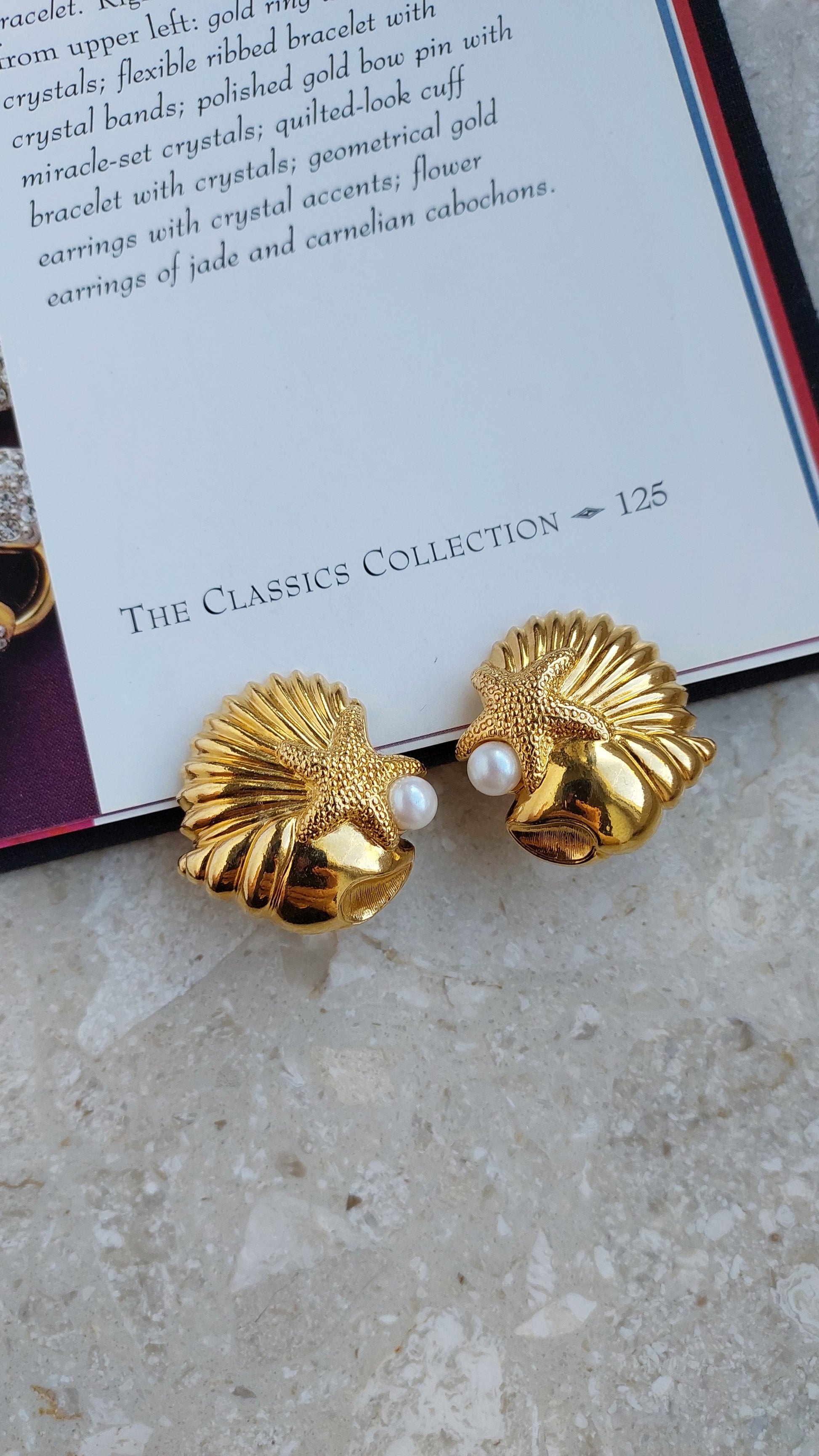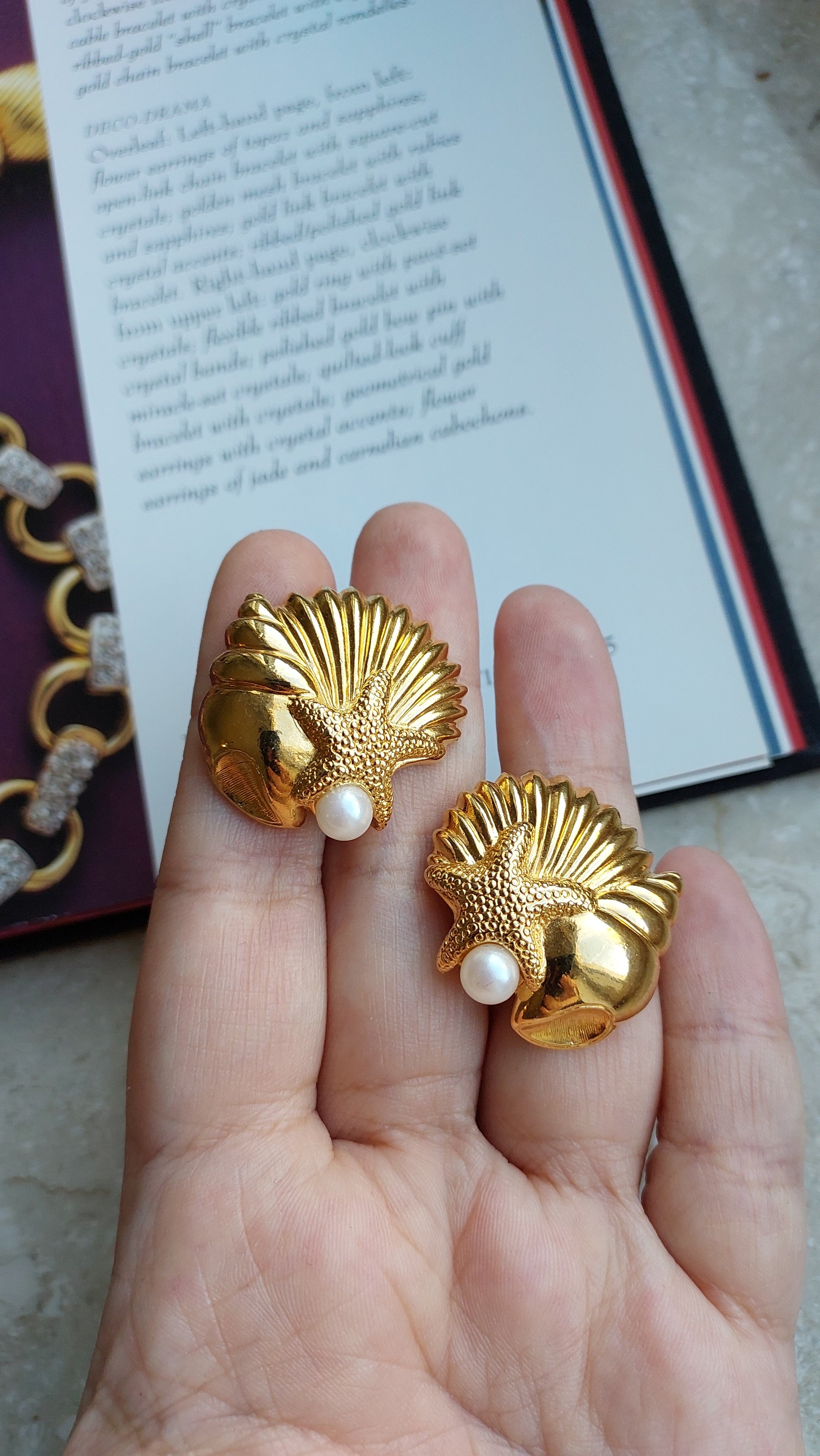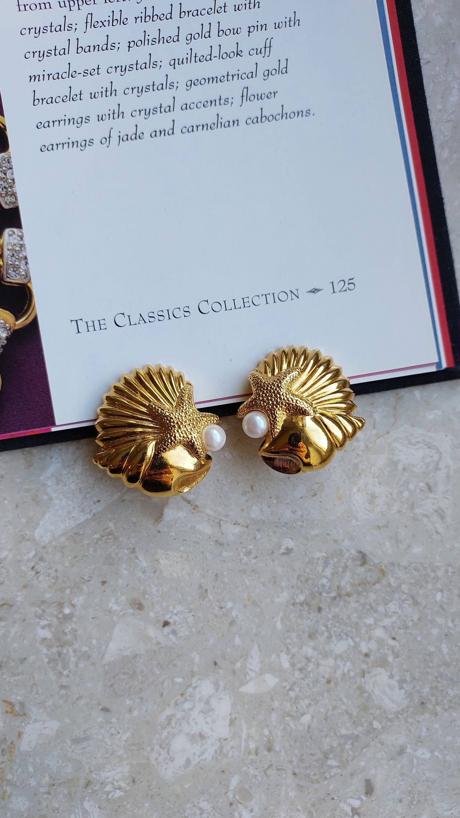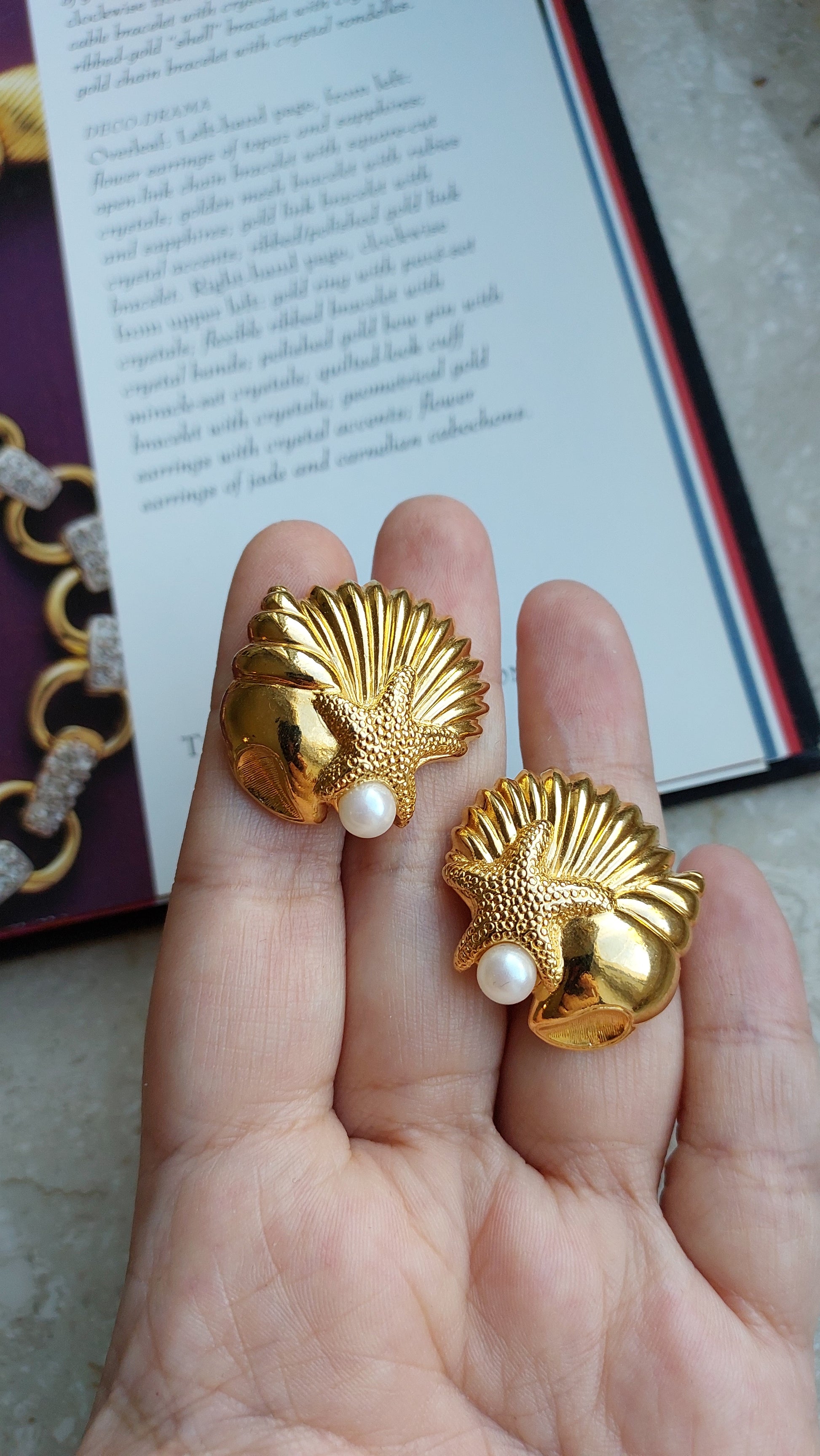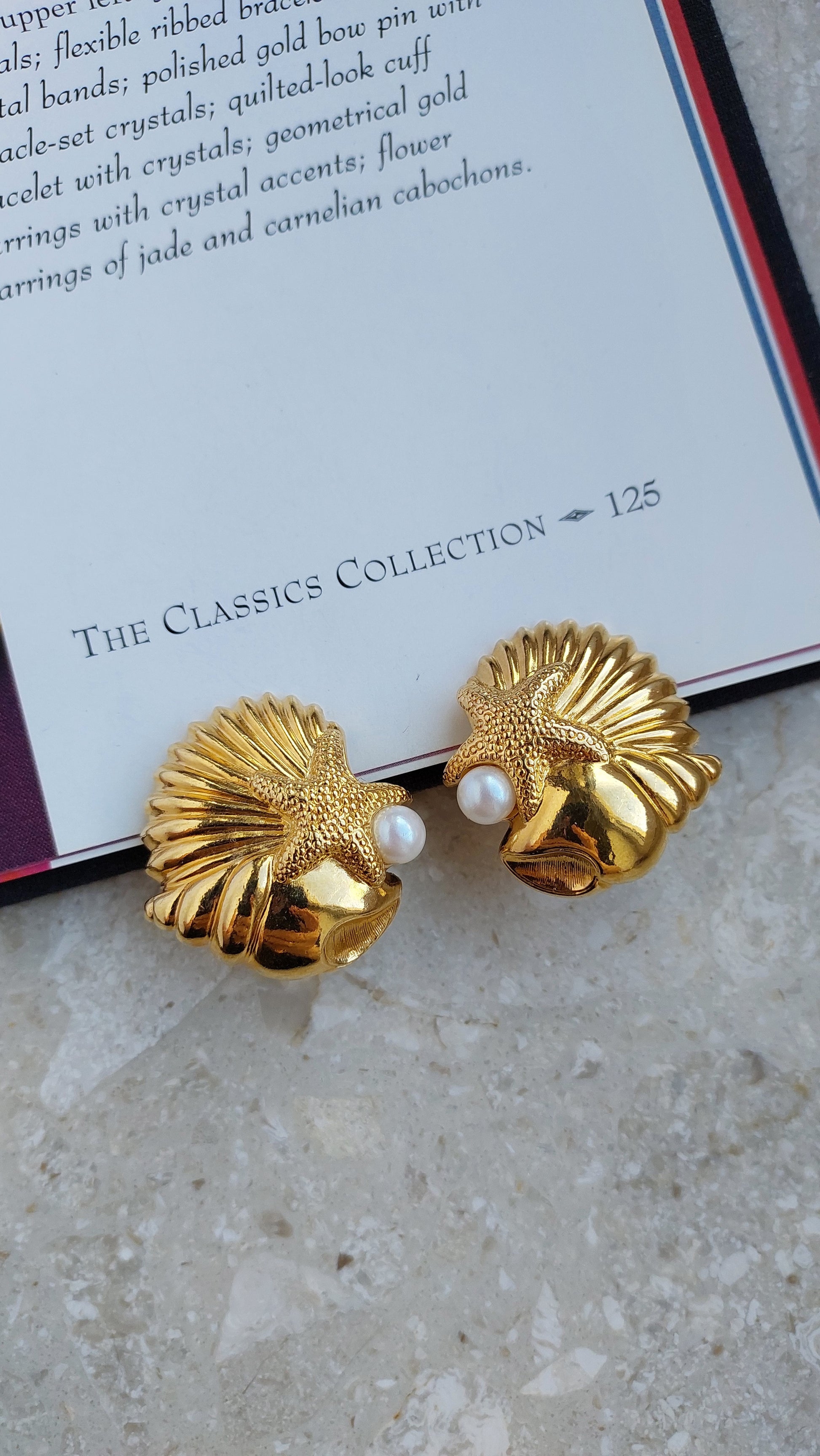 Fakturowane muszle ozdobione są wypukłymi rozgwiazdami o matowej powierzchni i dekorowane imitacją pereł.