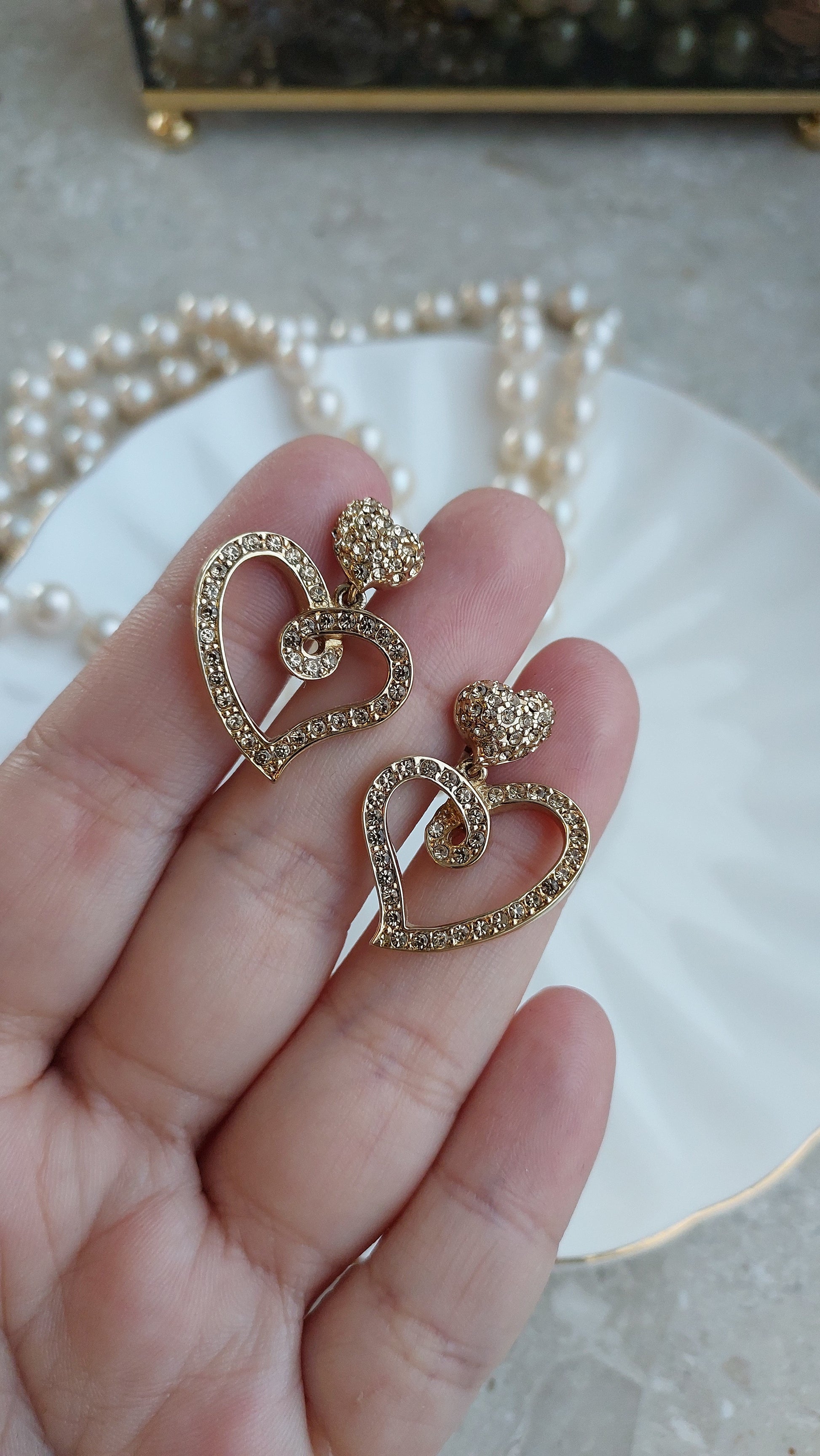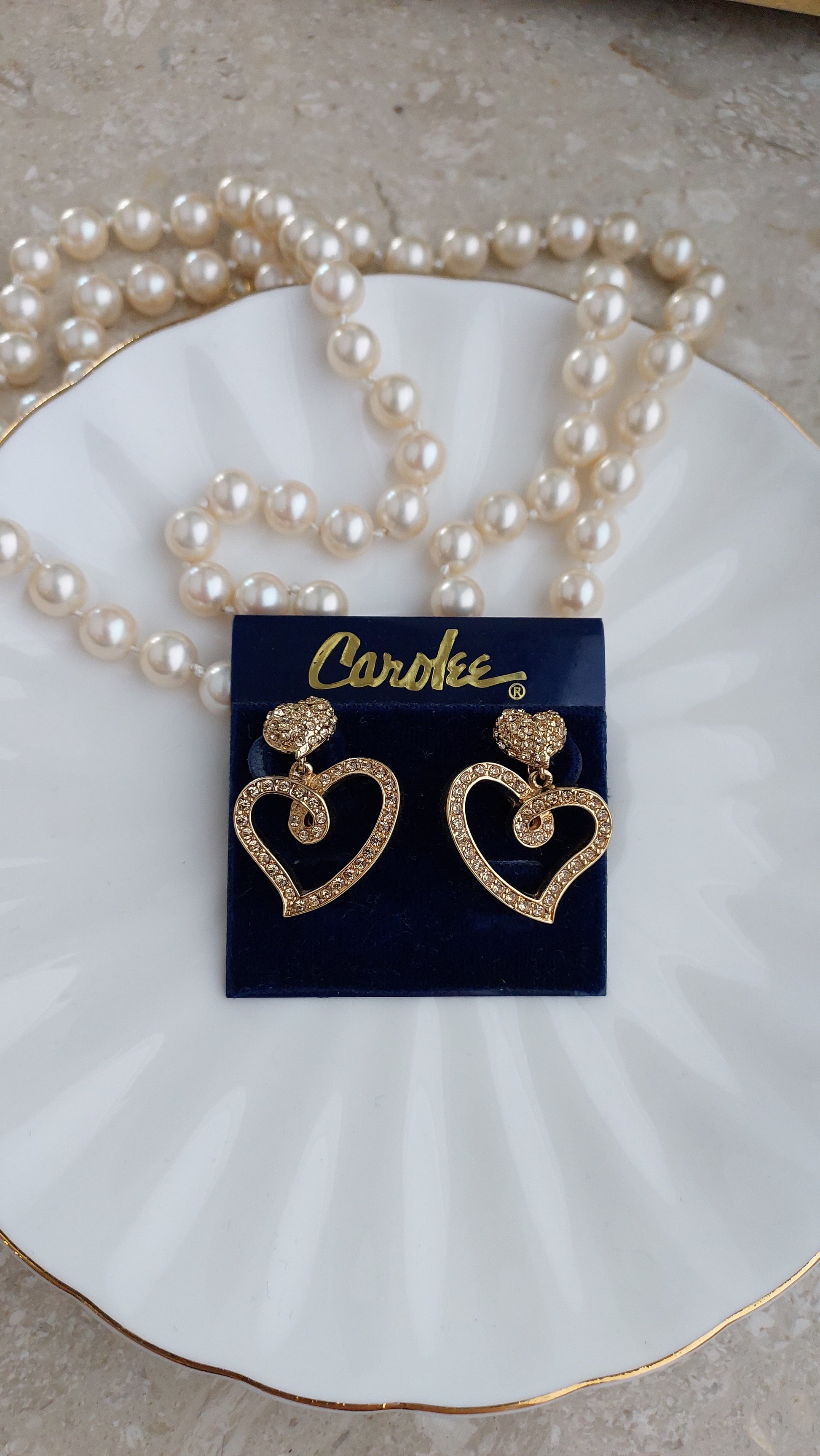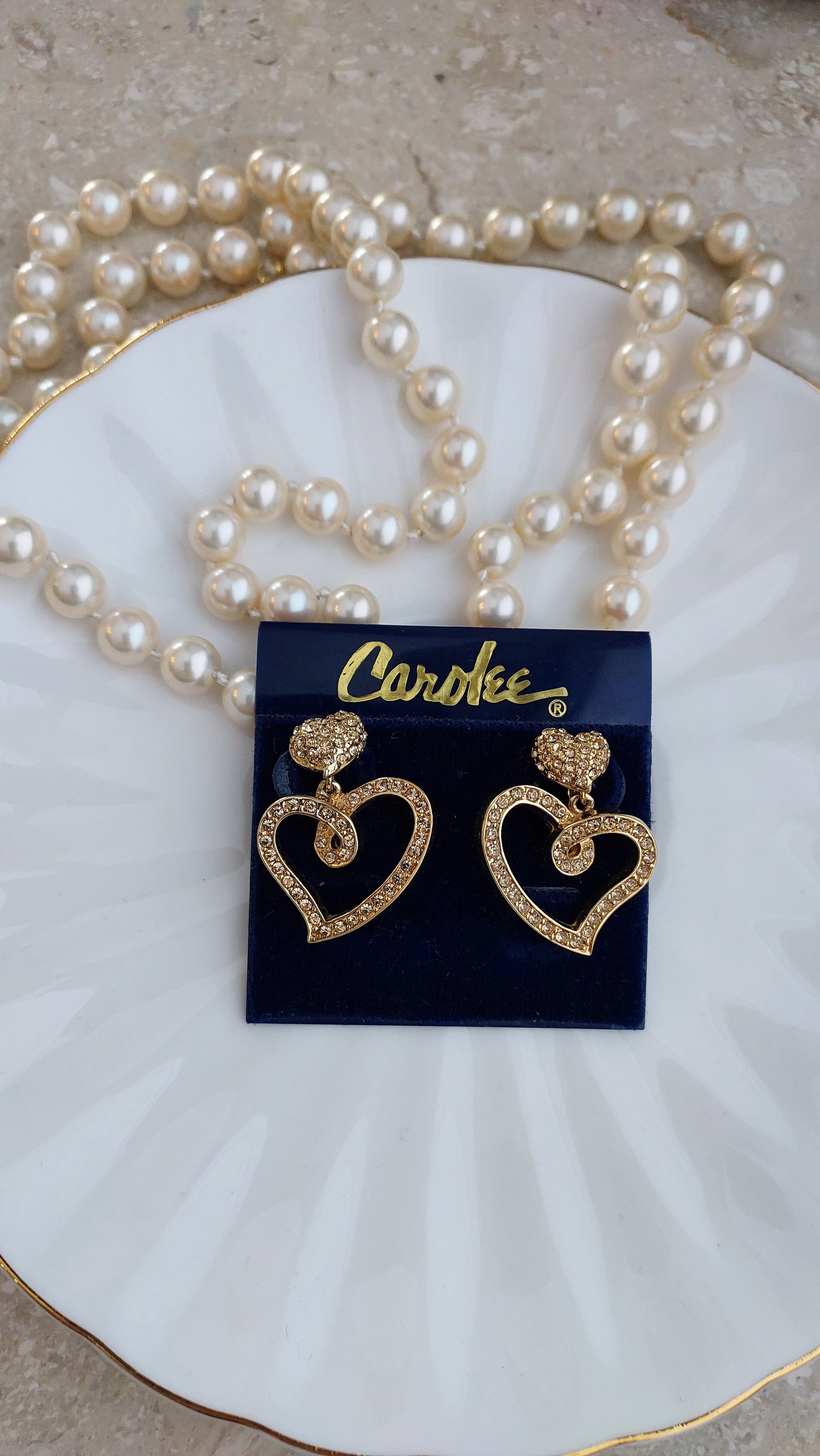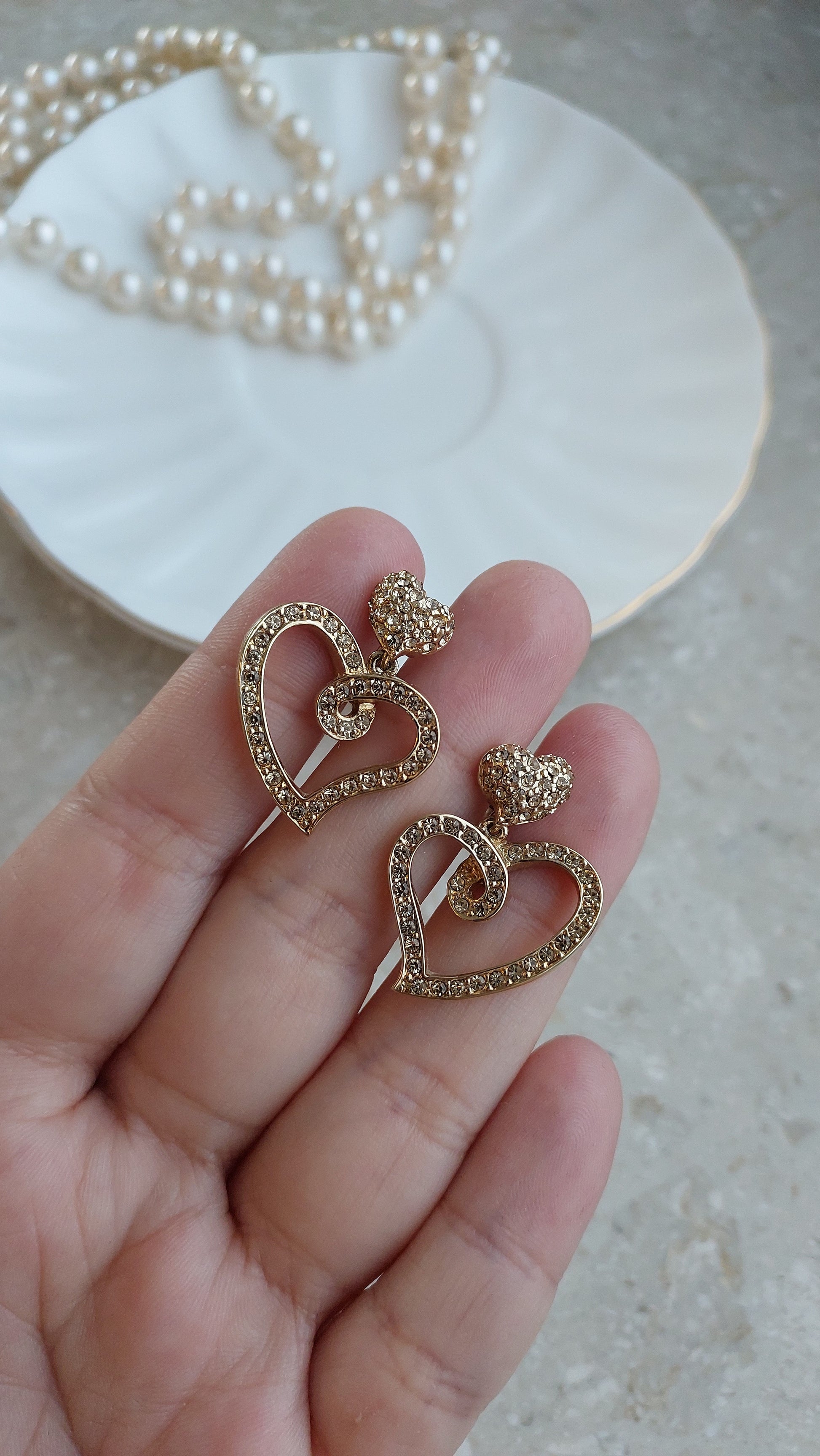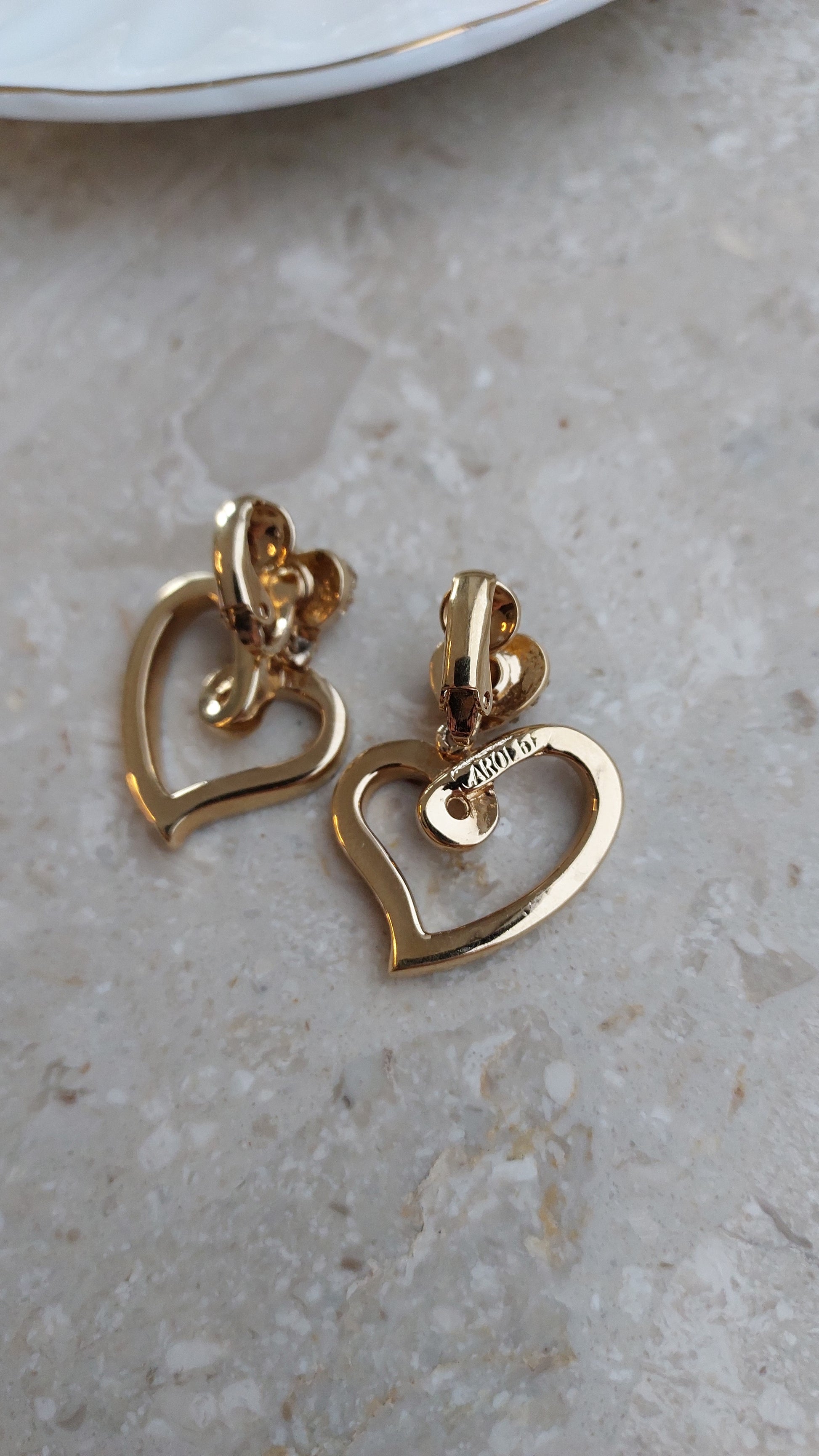 Klipsy Carolee w formie stylizowanych serc, wykonane w złocistym tonie. Ażurowy kontur inkrustowany jest kryształami w jasno-miedzianym odcieniu, które tworzą miękki, subtelny blask.