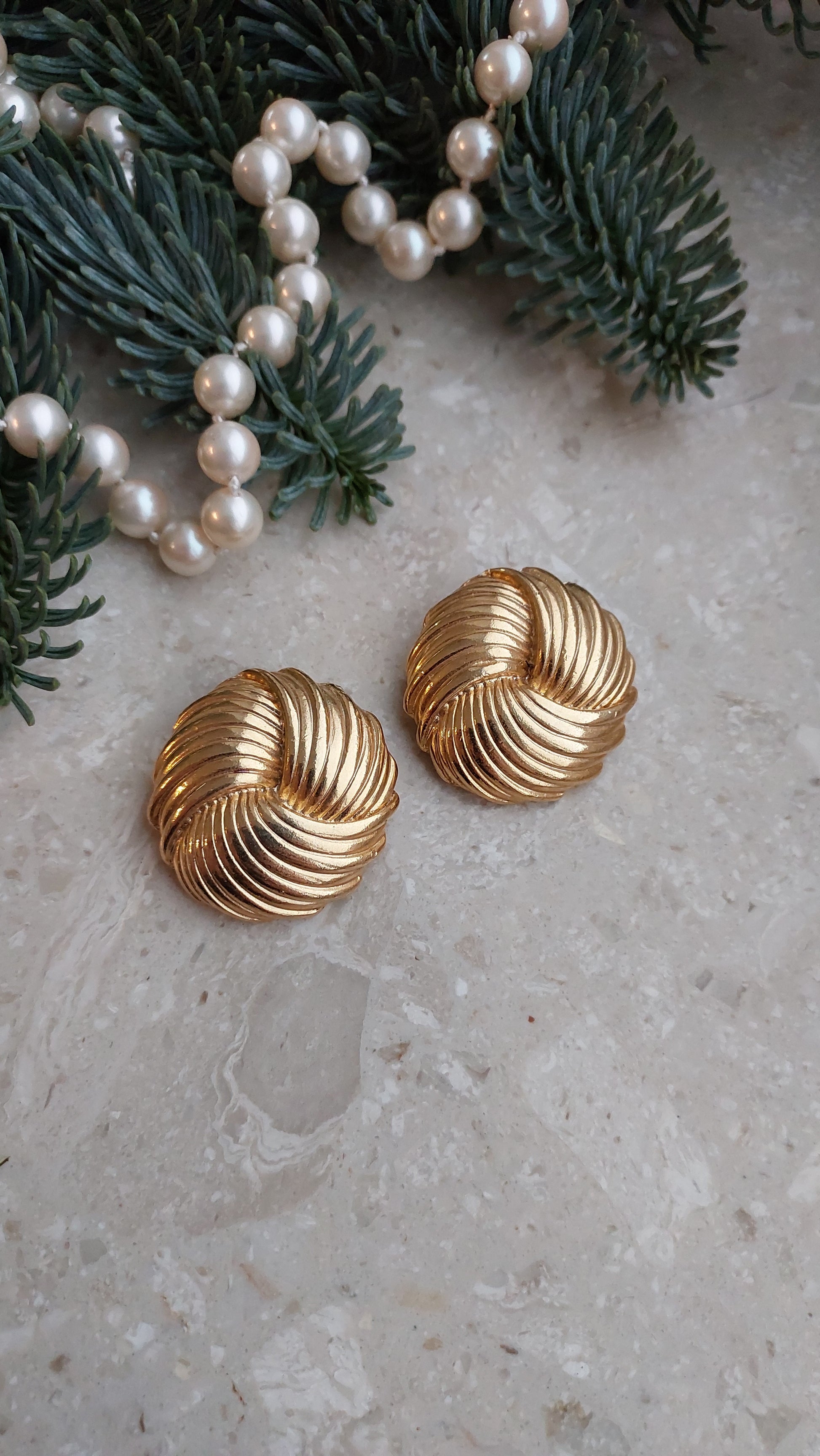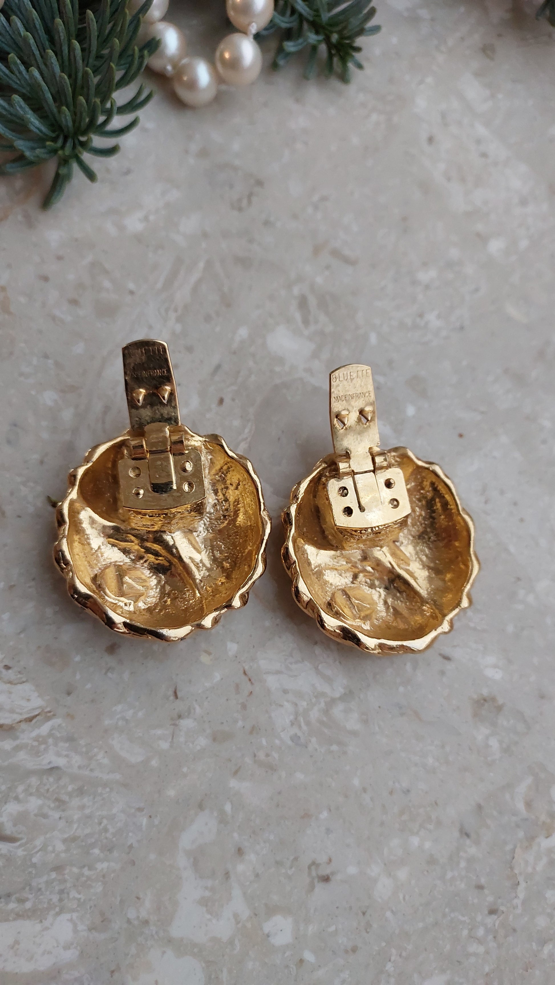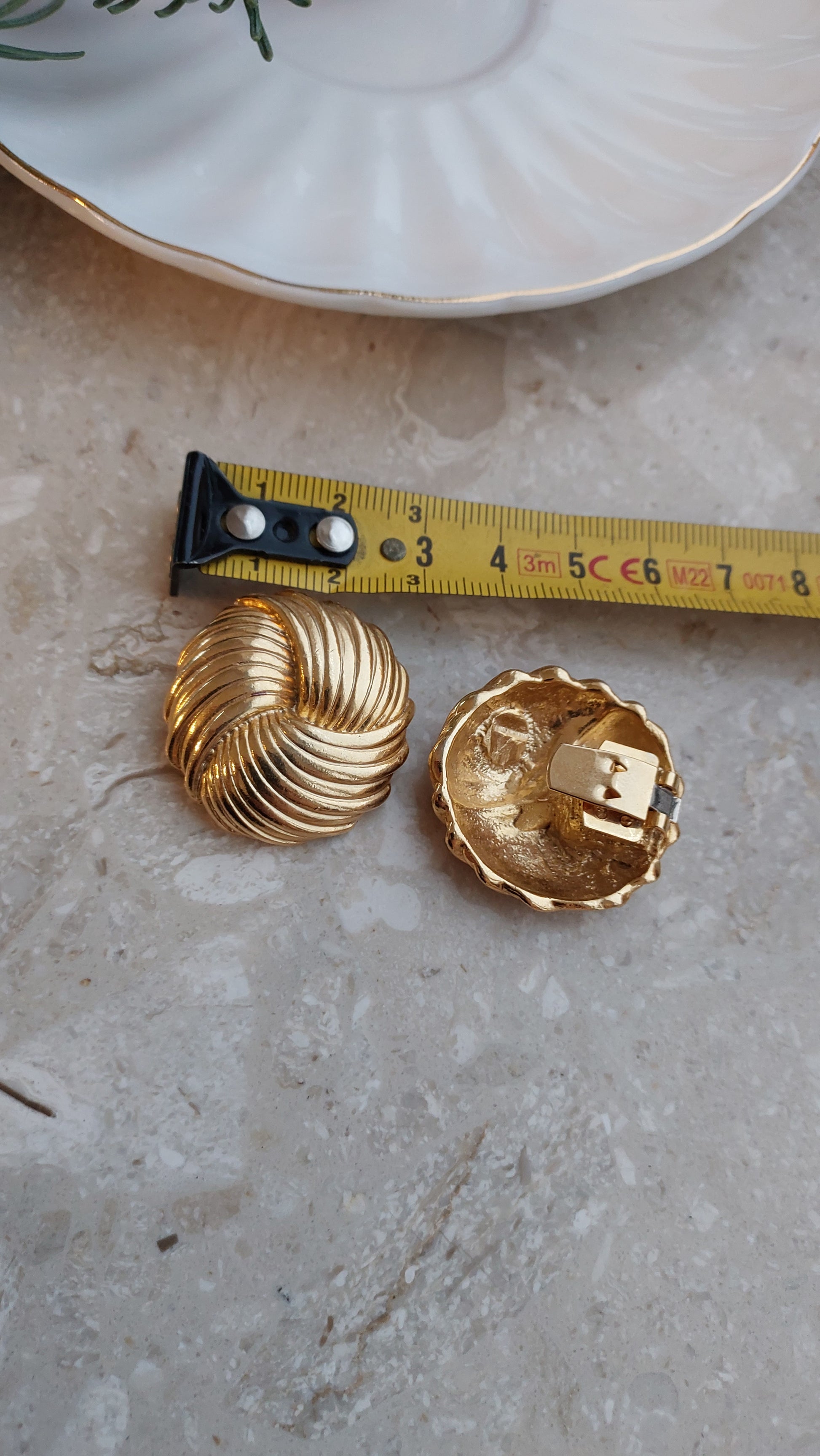 Klipsy do butów Blueette Made in France. Okrągła forma z wyrazistym, skręconym reliefem w ciepłym, złocistym tonie tworzy efekt głębi i piękną grę światła. Stan bardzo dobry