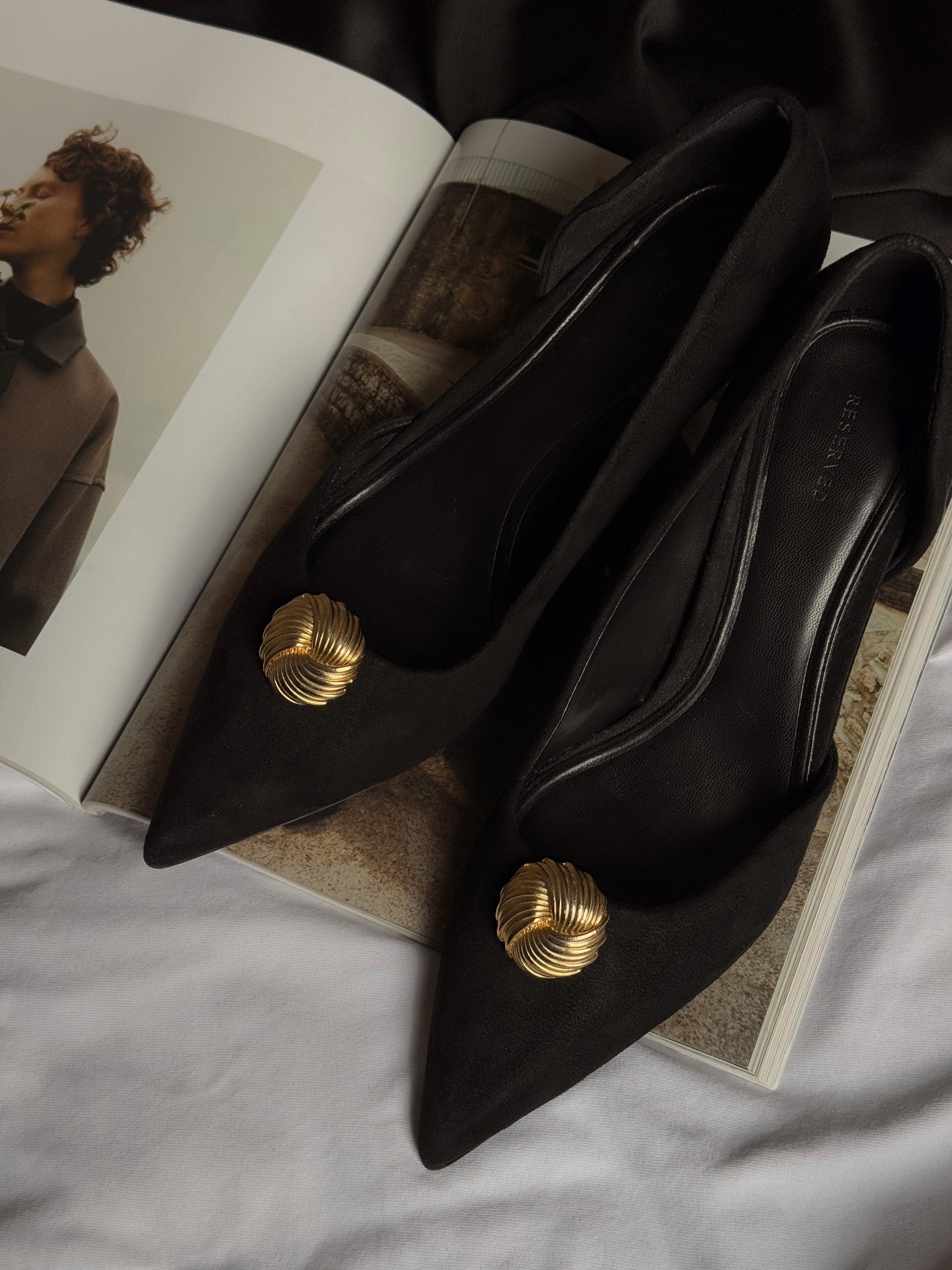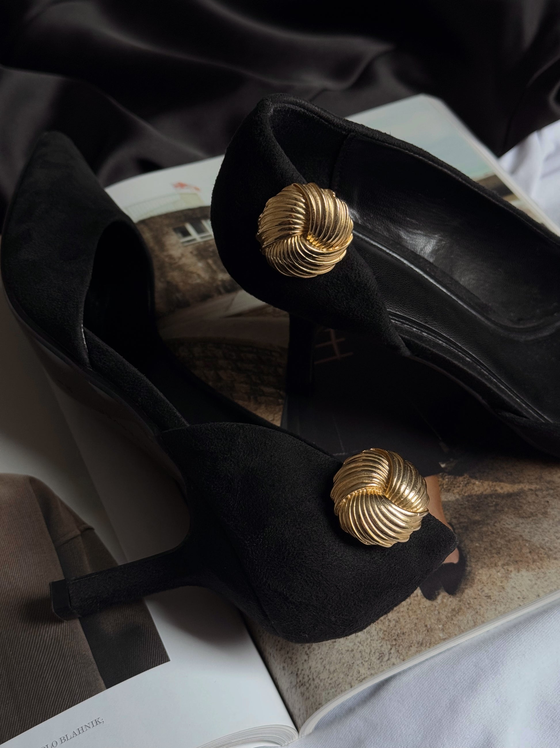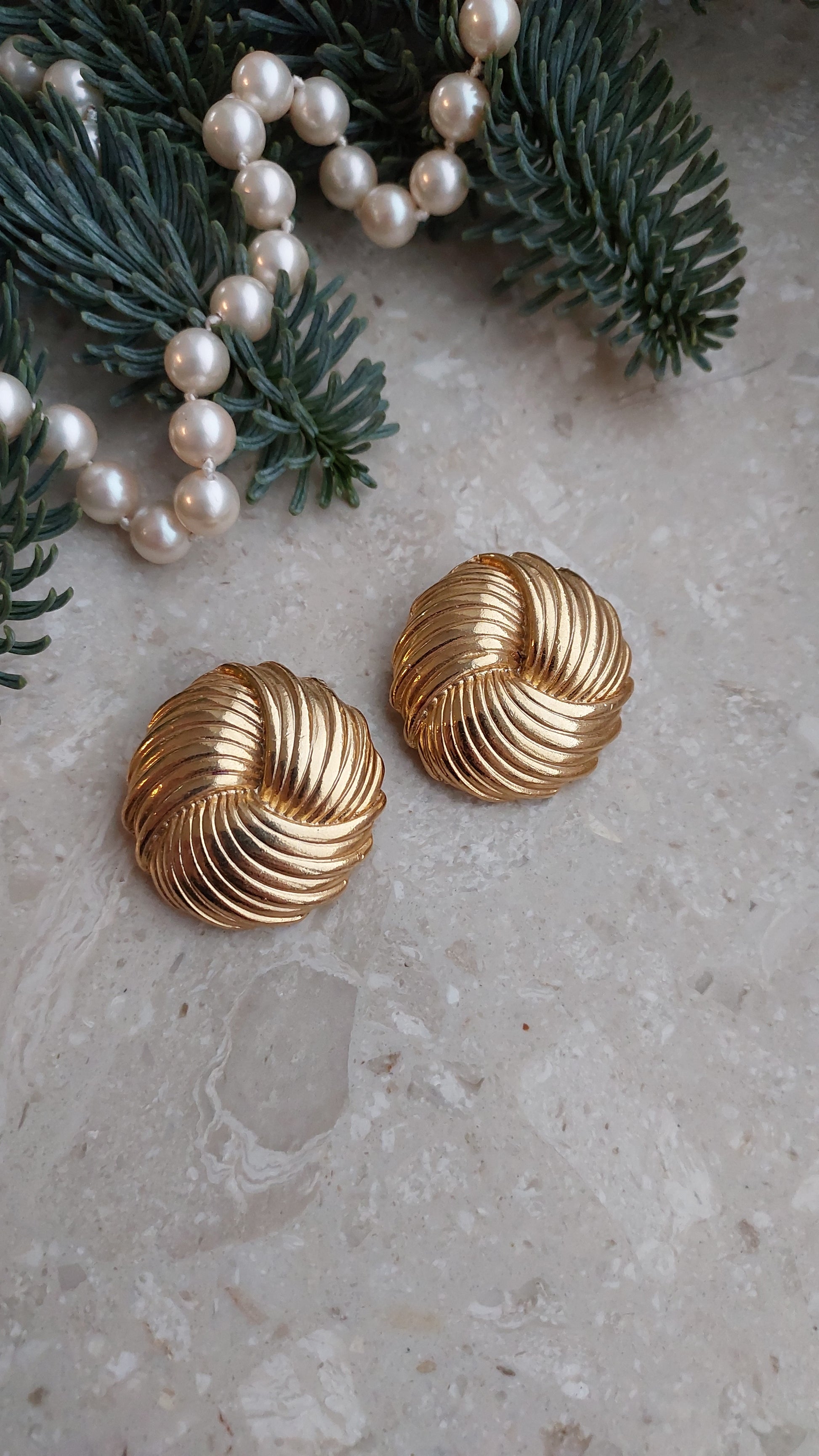 Klipsy do butów Blueette Made in France. Okrągła forma z wyrazistym, skręconym reliefem w ciepłym, złocistym tonie tworzy efekt głębi i piękną grę światła. Stan bardzo dobry