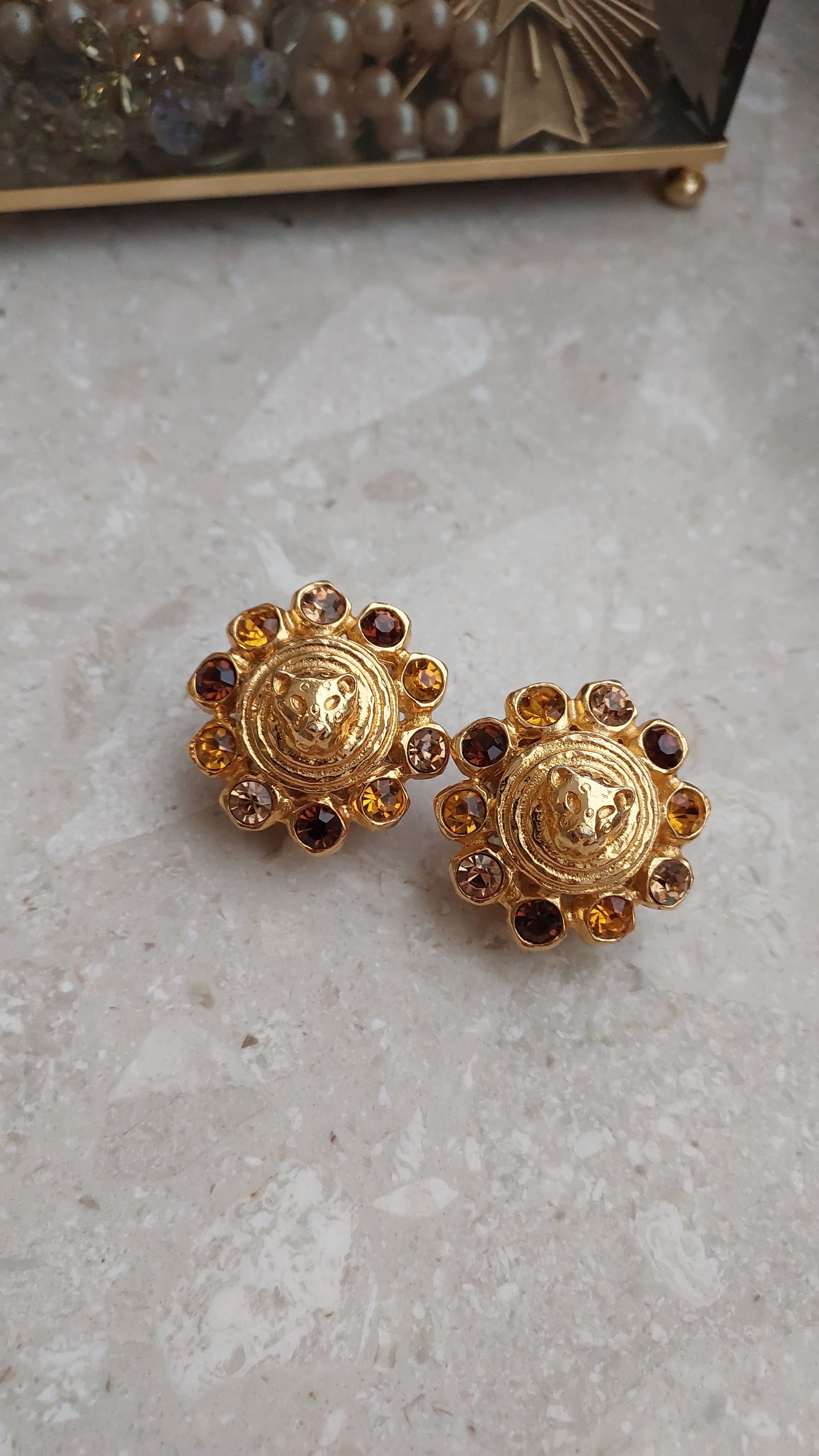 Centralnym elementem ozdoby jest wypukła głowa pantery, otoczona pierścieniem lśniących kryształków w odcieniach miodu, koniaku i szampana.