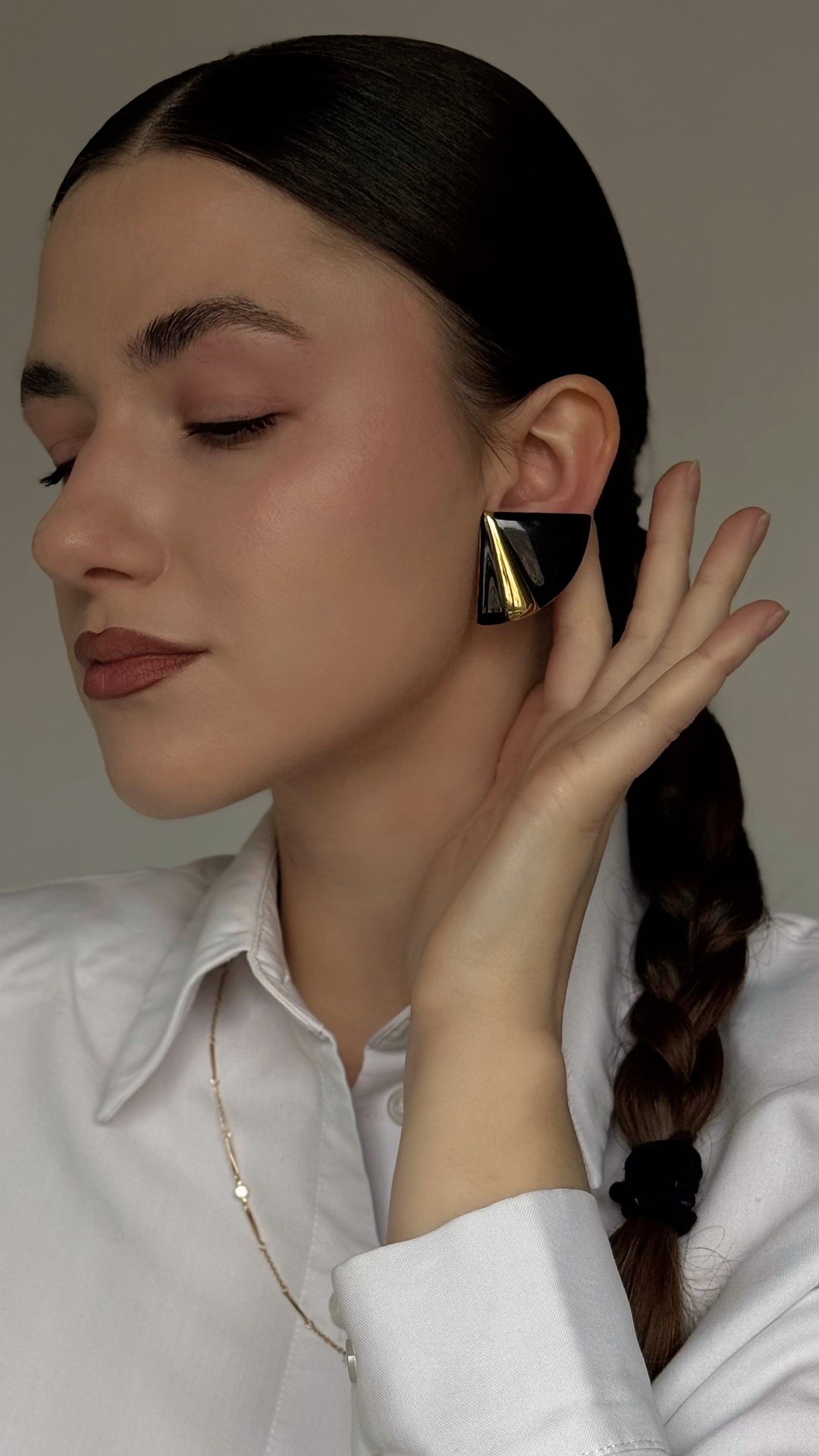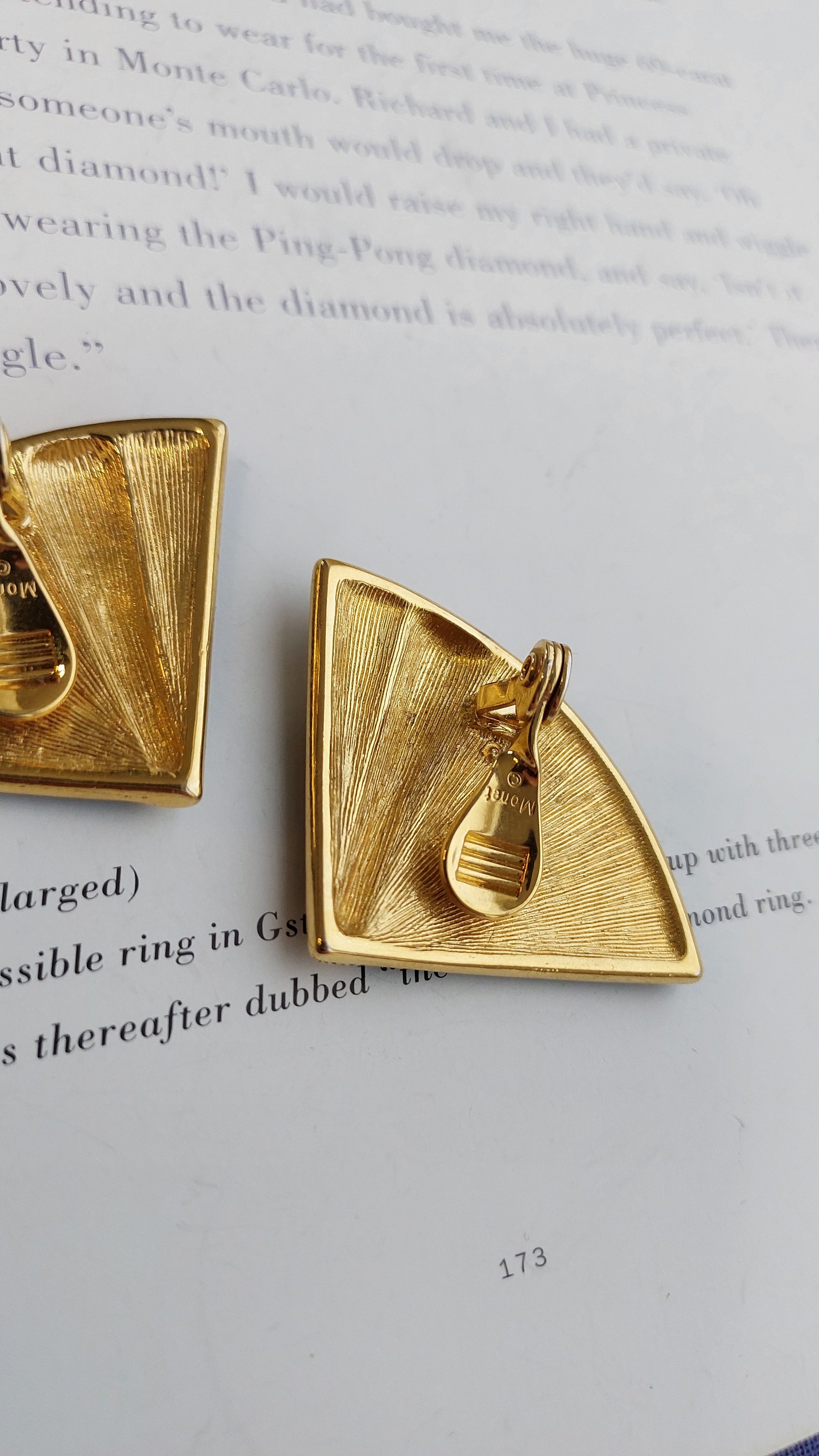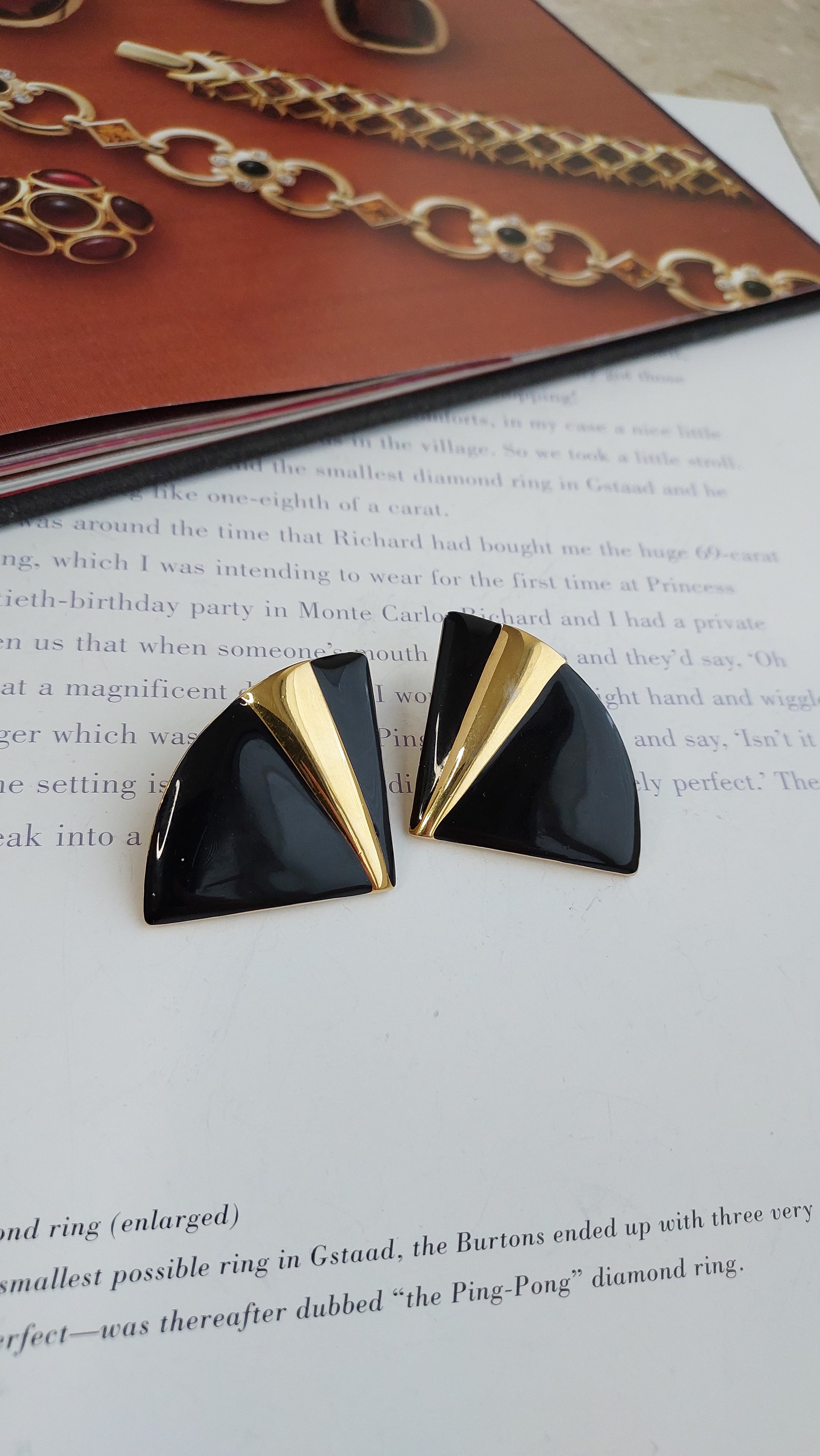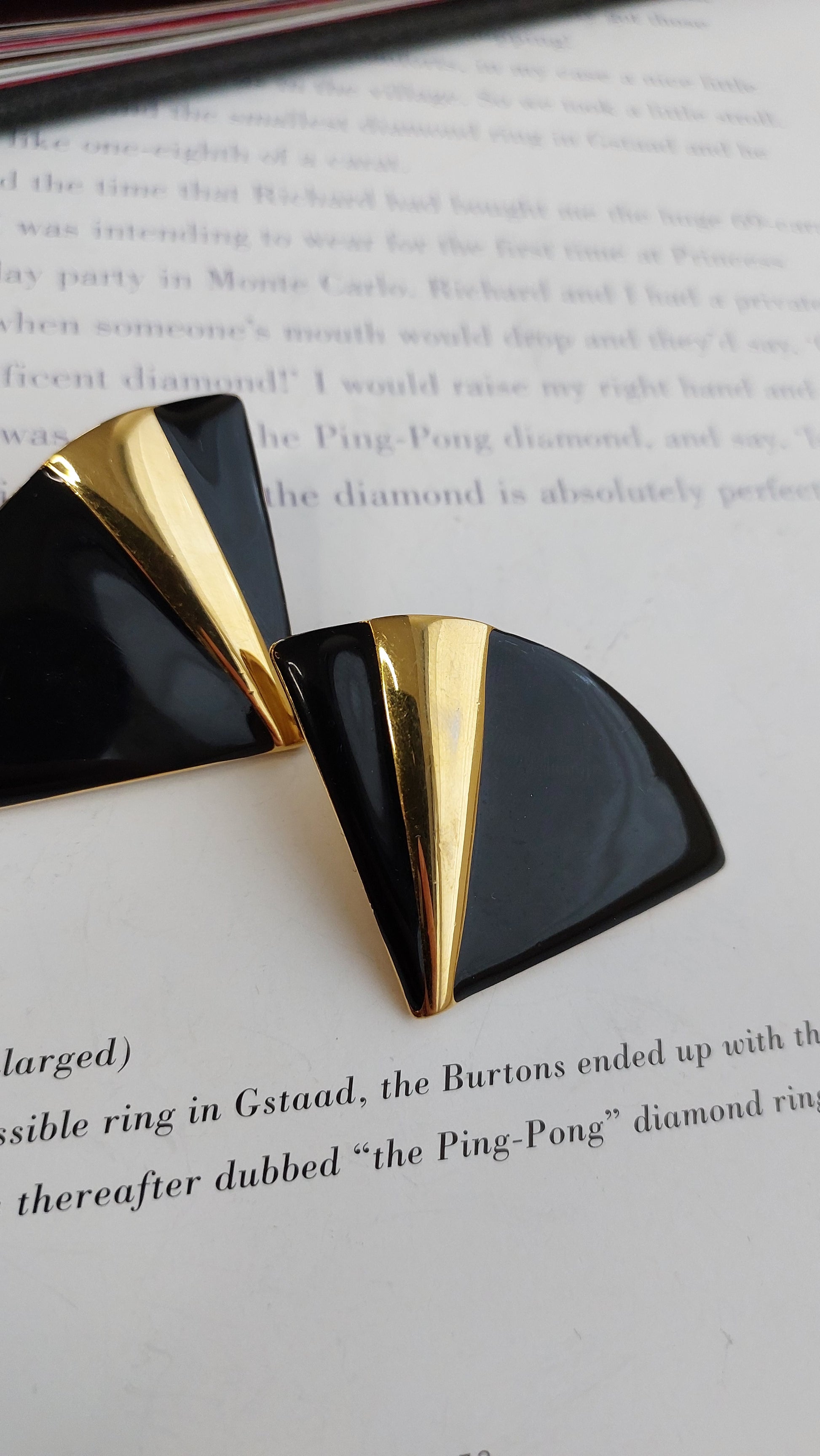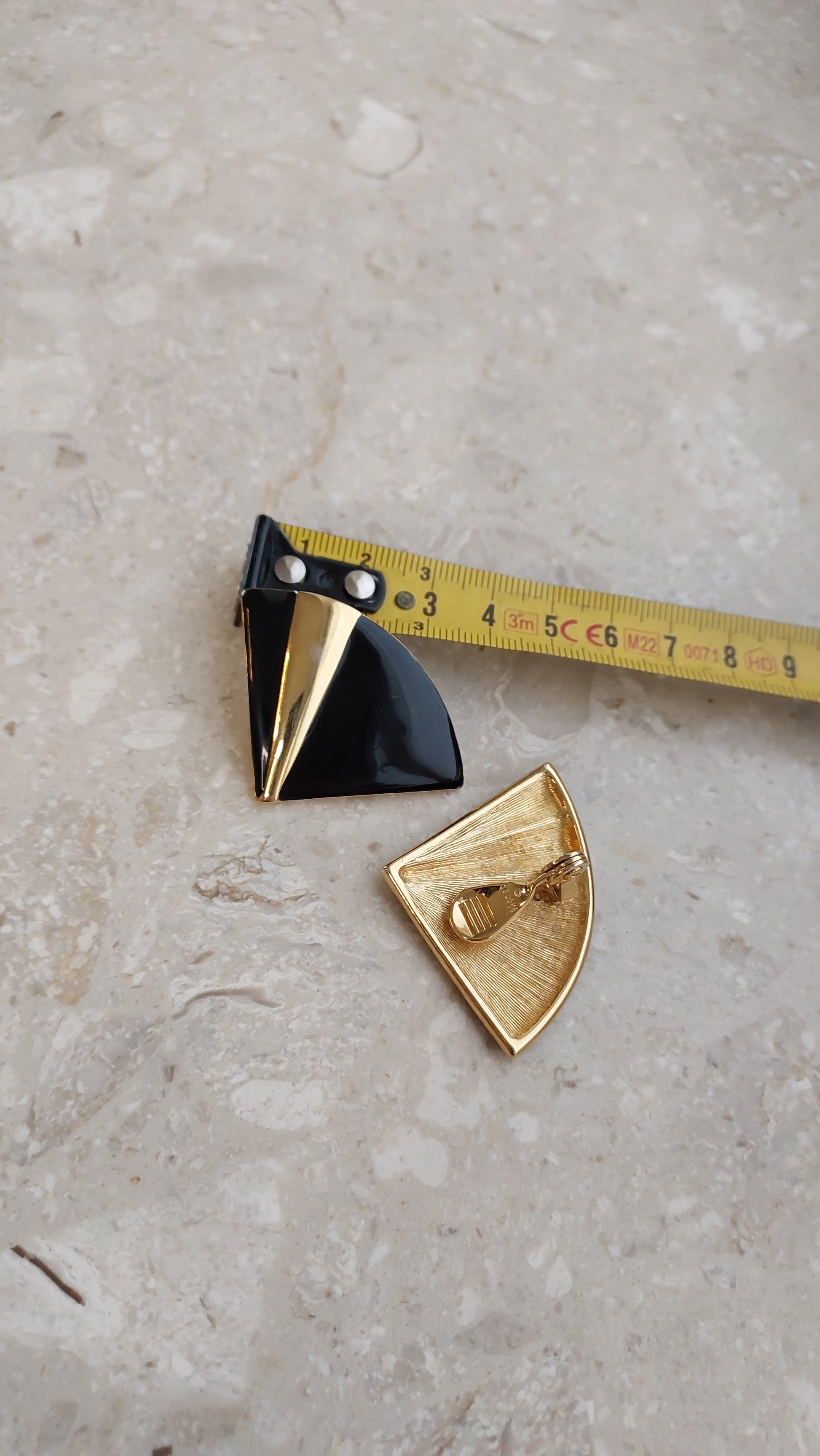 Wyraziste klipsy Monet o graficznej formie, zbudowanej na kontraście czarnej emalii i złocistego wykończenia. Widoczne są niewielkie przetarcia złocistej powłoki