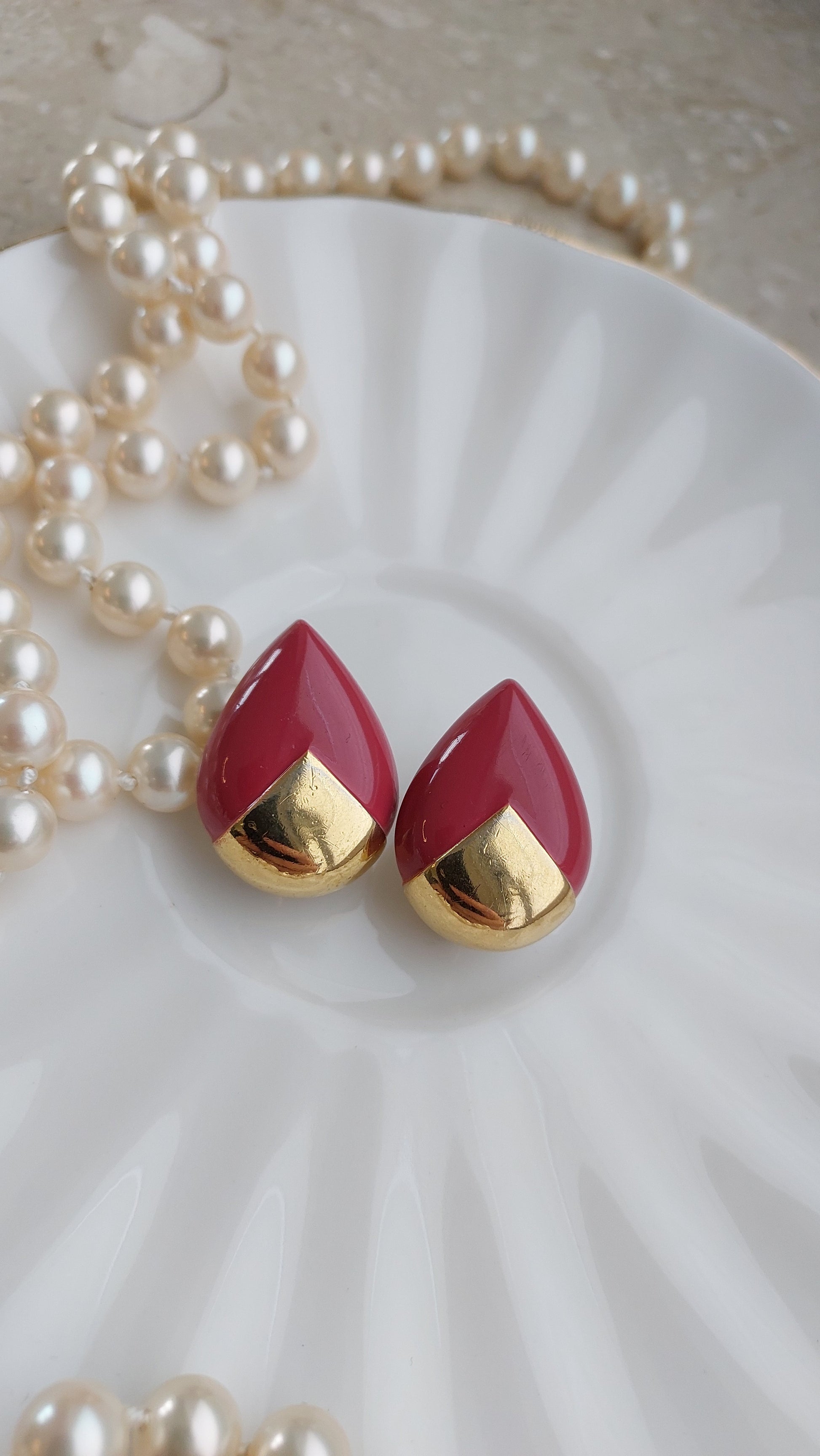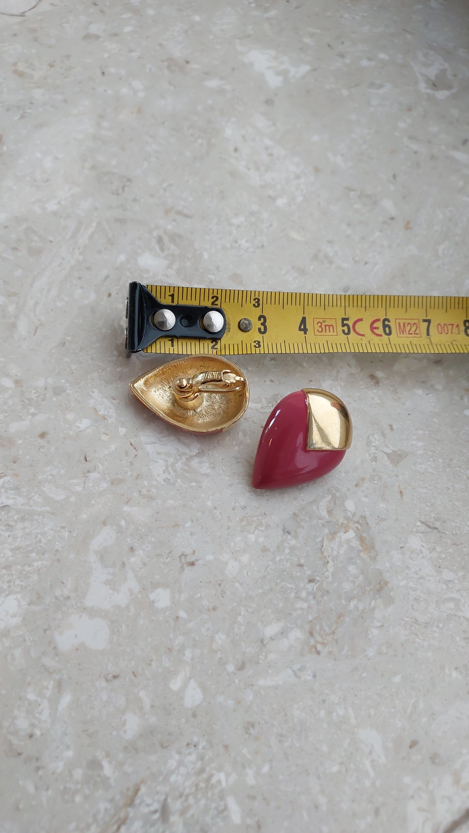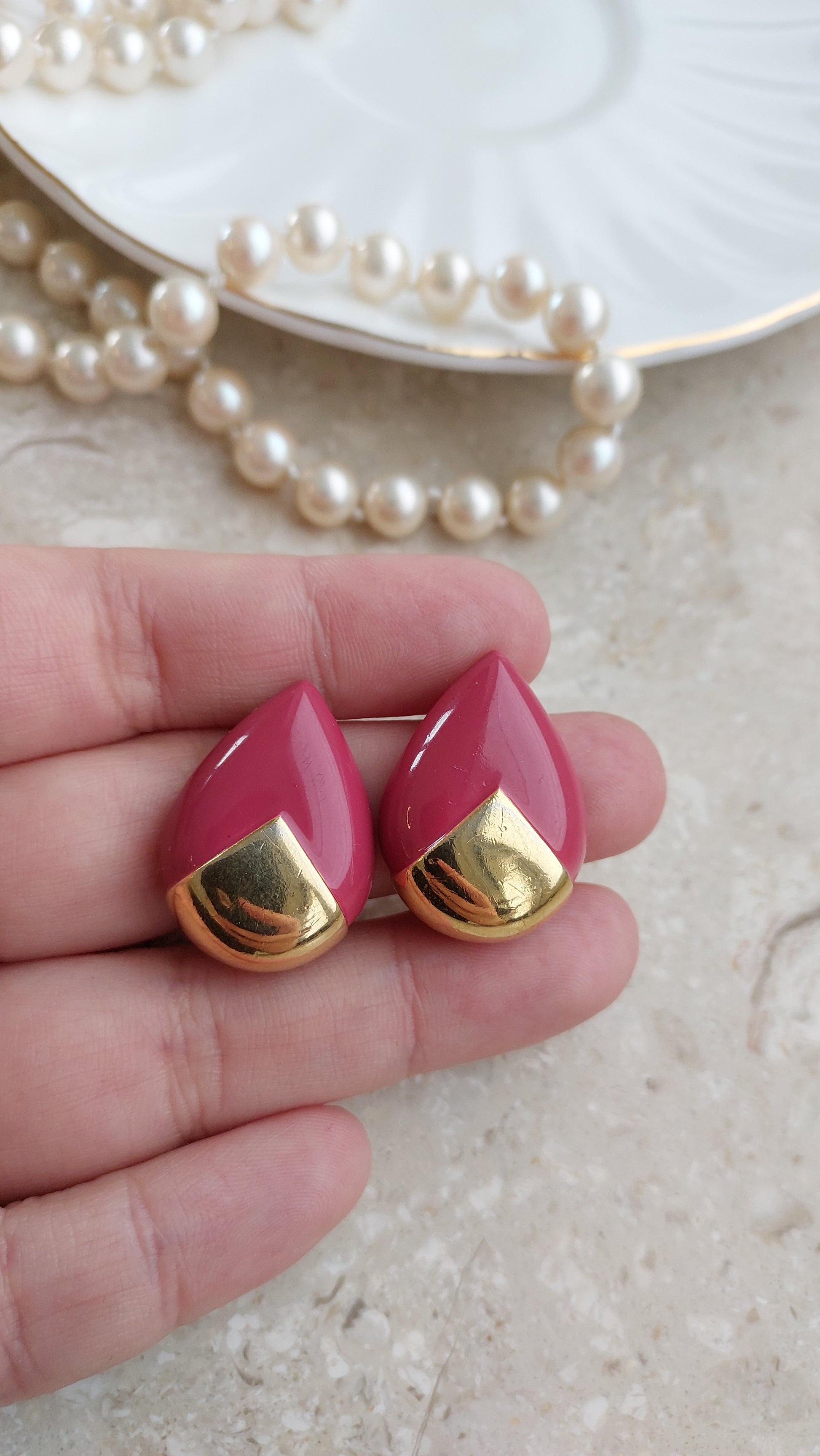 Wyraziste klipsy Trifari w kształcie kropli. Gładka, lśniąca emalia w przydymionym różowym odcieniu efektownie łączy się z bazą w złocistym tonie. Czyste linie i wyważone proporcje tworzą elegancki, pewny akcent — charakterystyczny dla klasycznego designu Trifari.