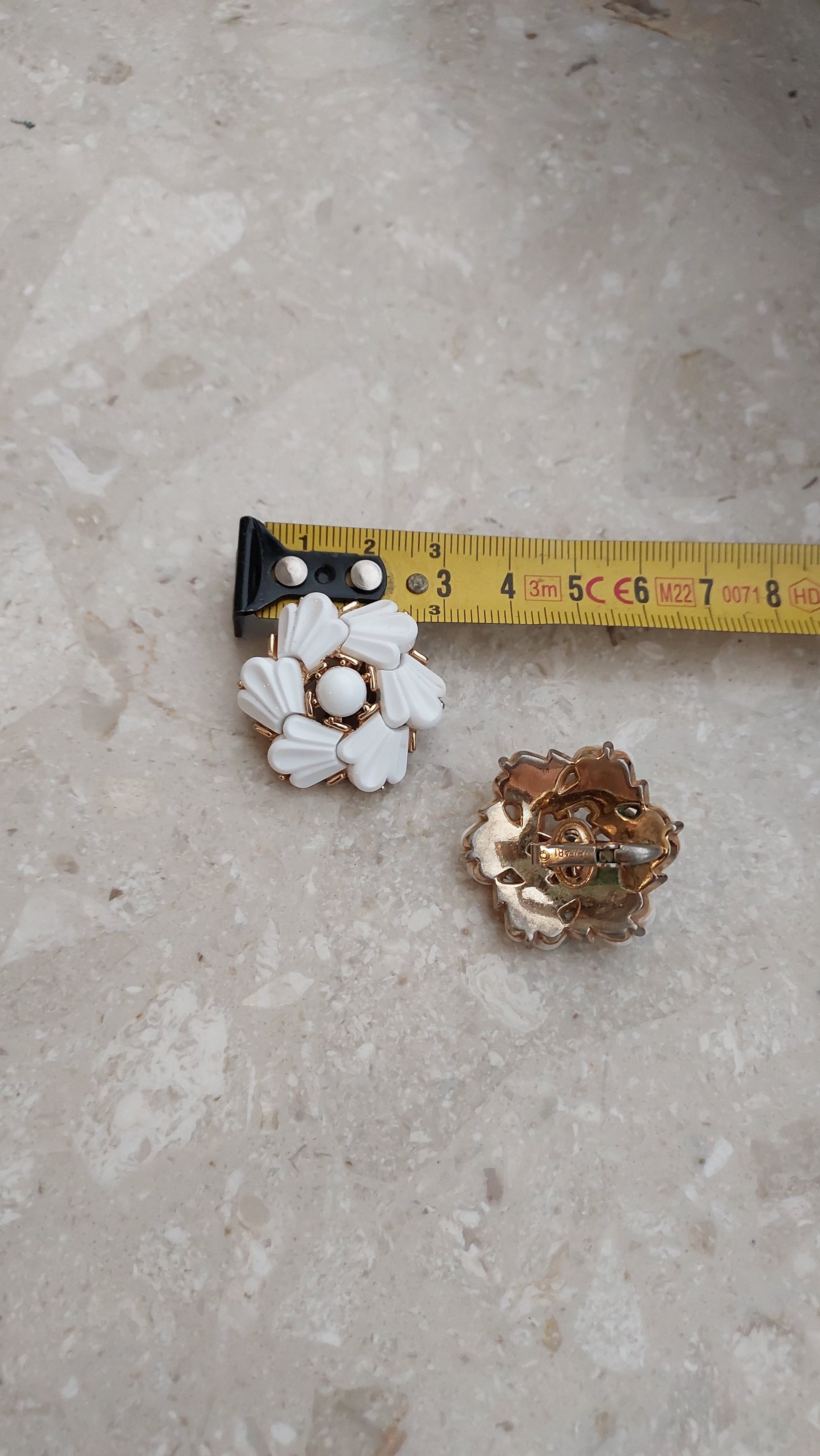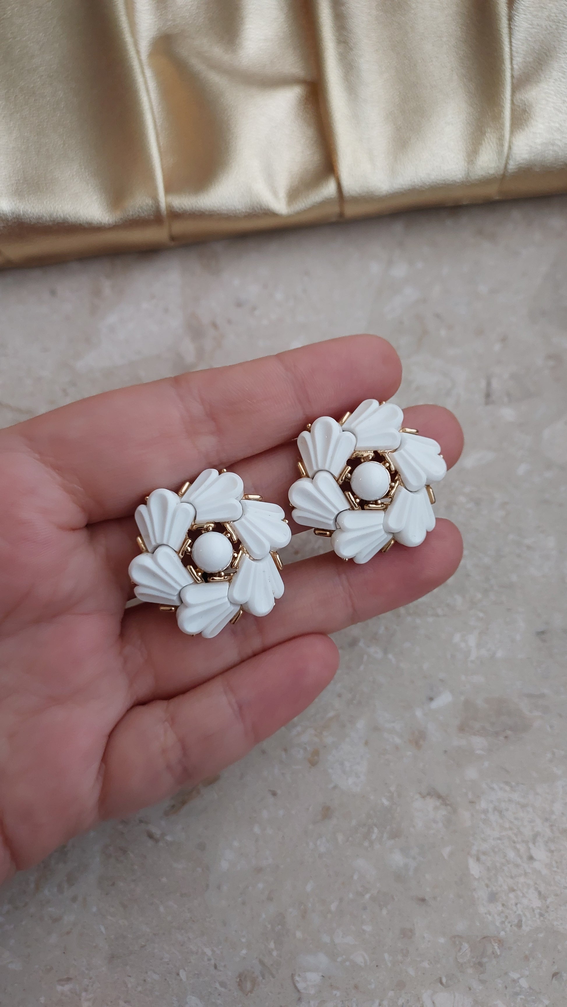Klipsy Trifari Crown z lat 70-tych w kształcie kwiatów z przestrzennymi płatkami z białego plastiku, stylizowanymi na elementy wachlarzowe. W centrum każdego kwiatu znajduje się gładka, biała wstawka–kaboszon, oprawiona w metal w złocistym odcieniu. Połączenie matowej bieli i ciepłego, złocistego blasku tworzy wyrafinowany kontrast i podkreśla harmonijną symetrię projektu.