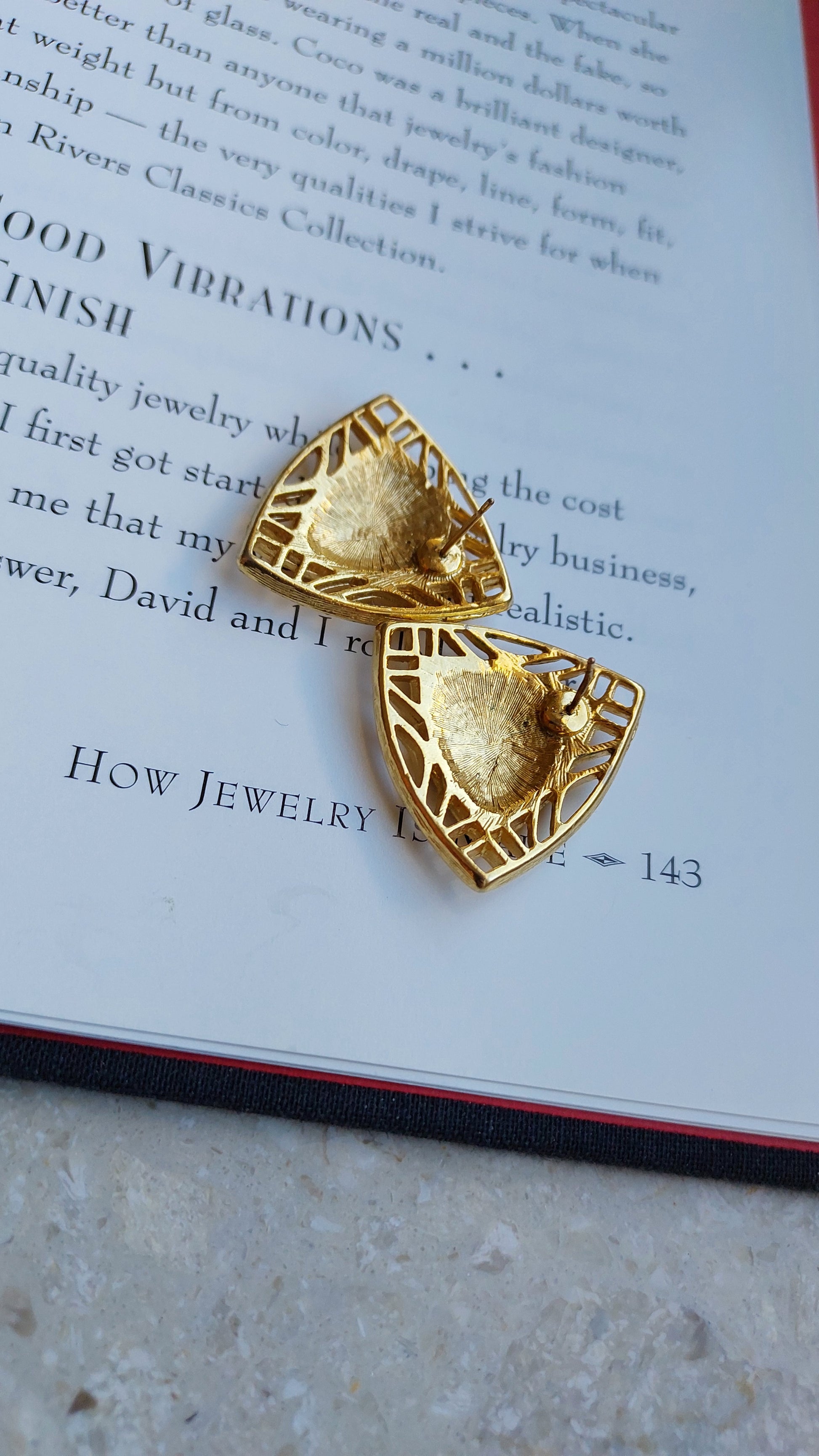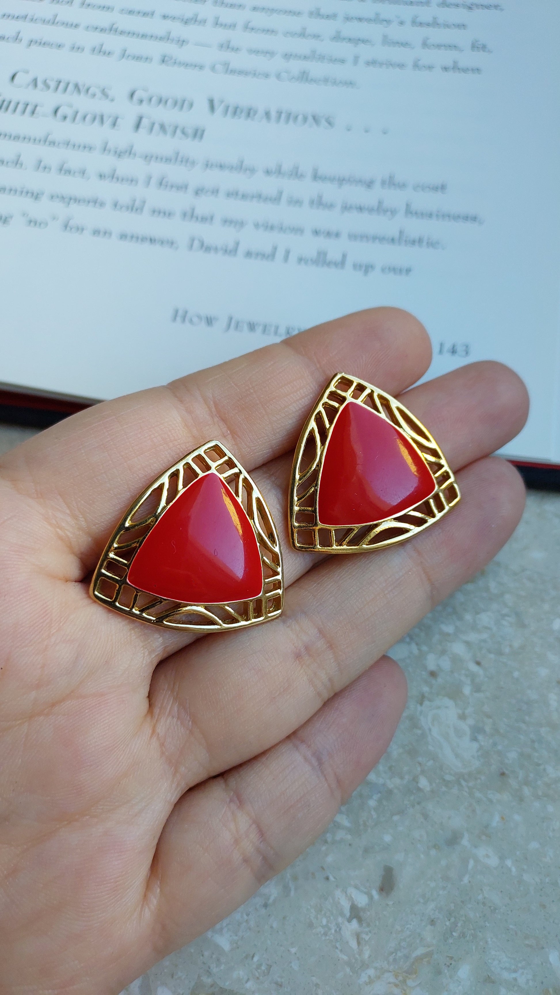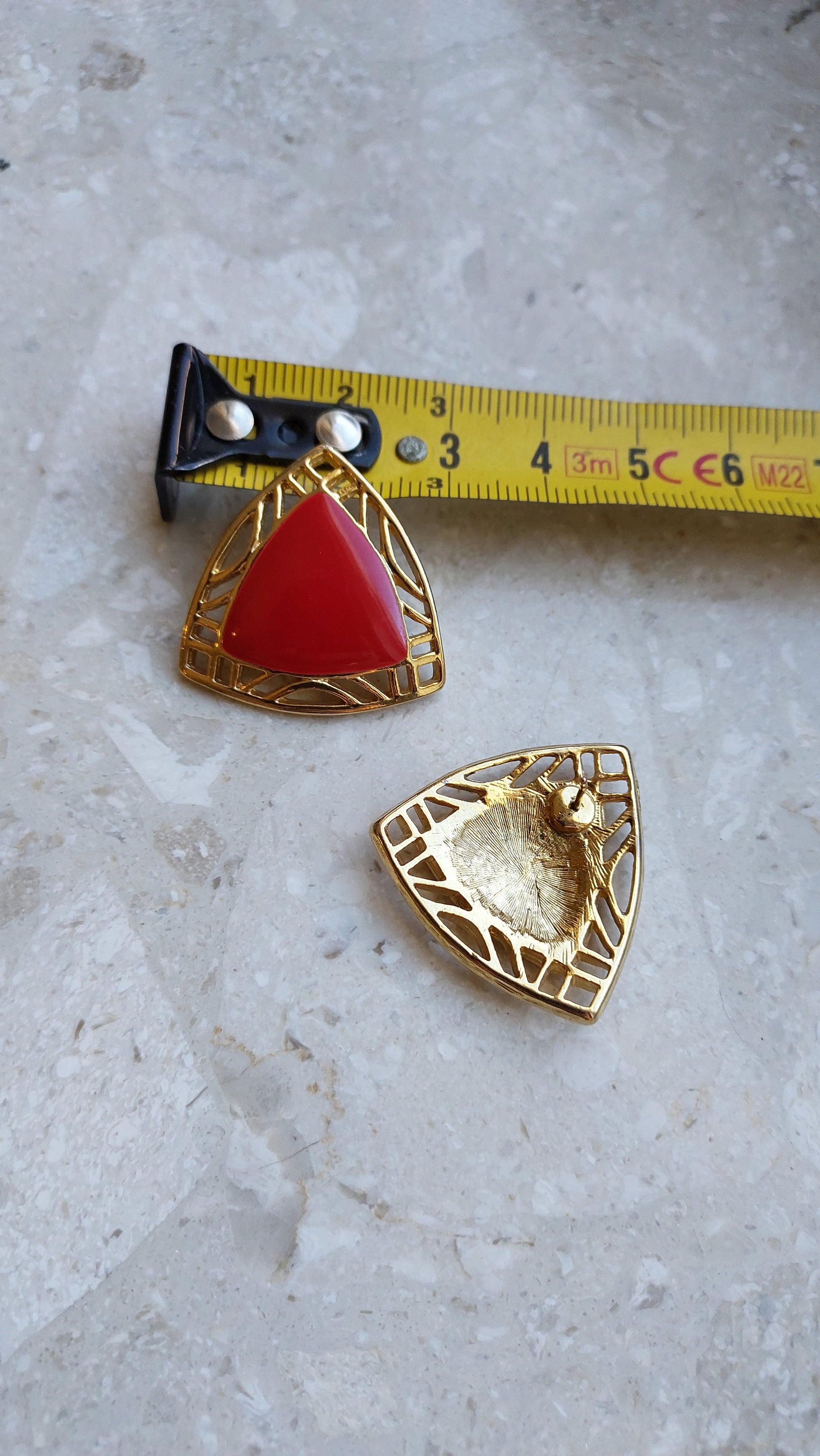 Komfortowe kolczyki z emaliowanym środkiem w intensywnie czerwonym kolorze o błyszczącej powierzchni, otoczone ażurową, złocistą ramką z geometrycznym wzorem. Kontrast czerwieni i złota nadaje biżuterii dynamikę i wyrazistość. Stan bardzo dobry.