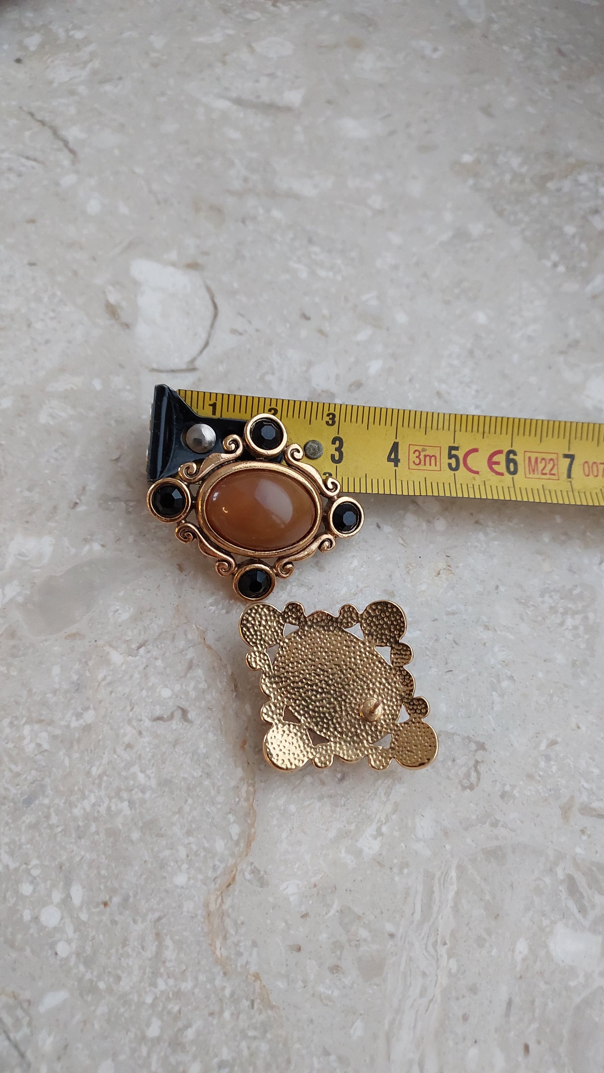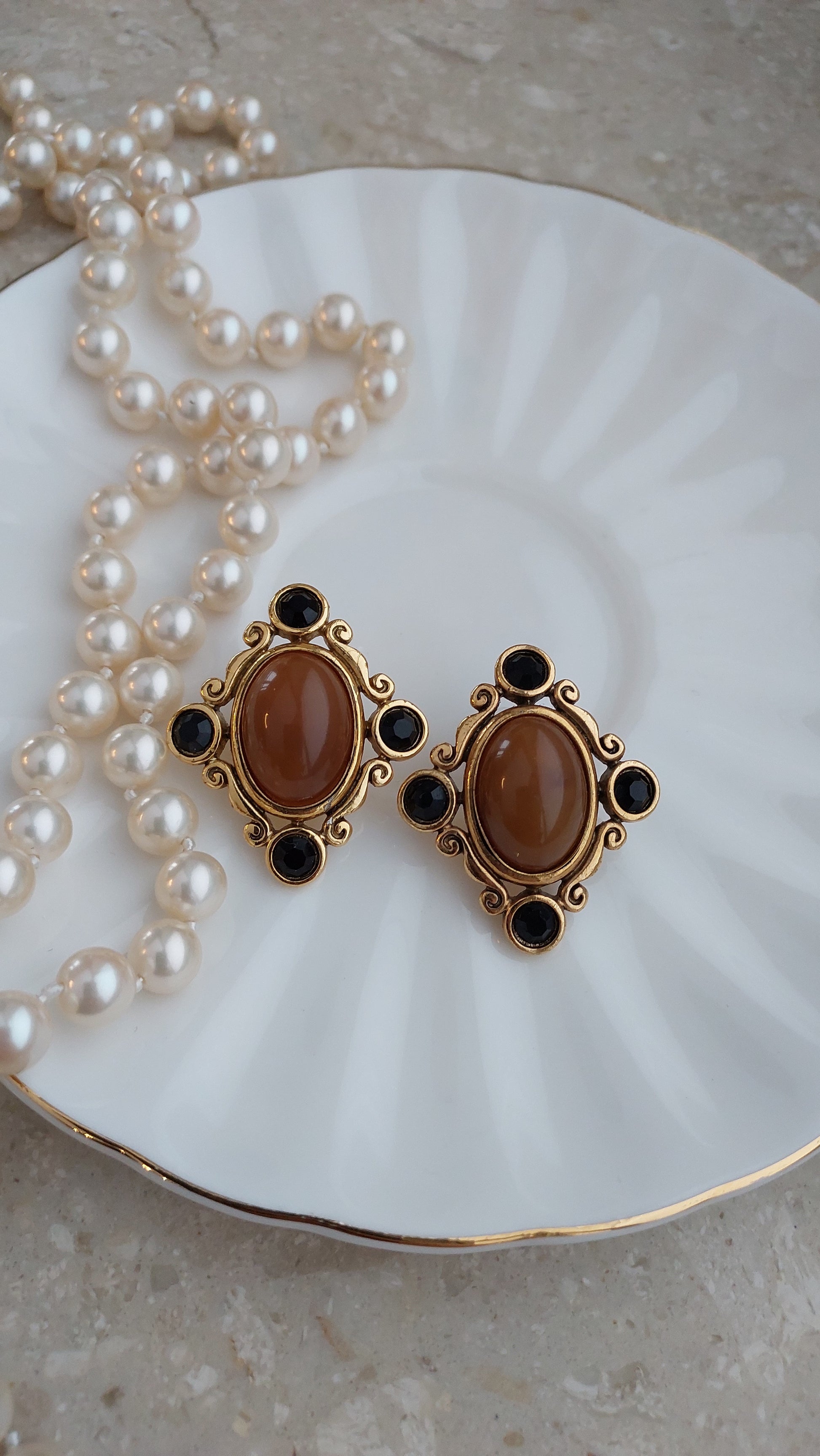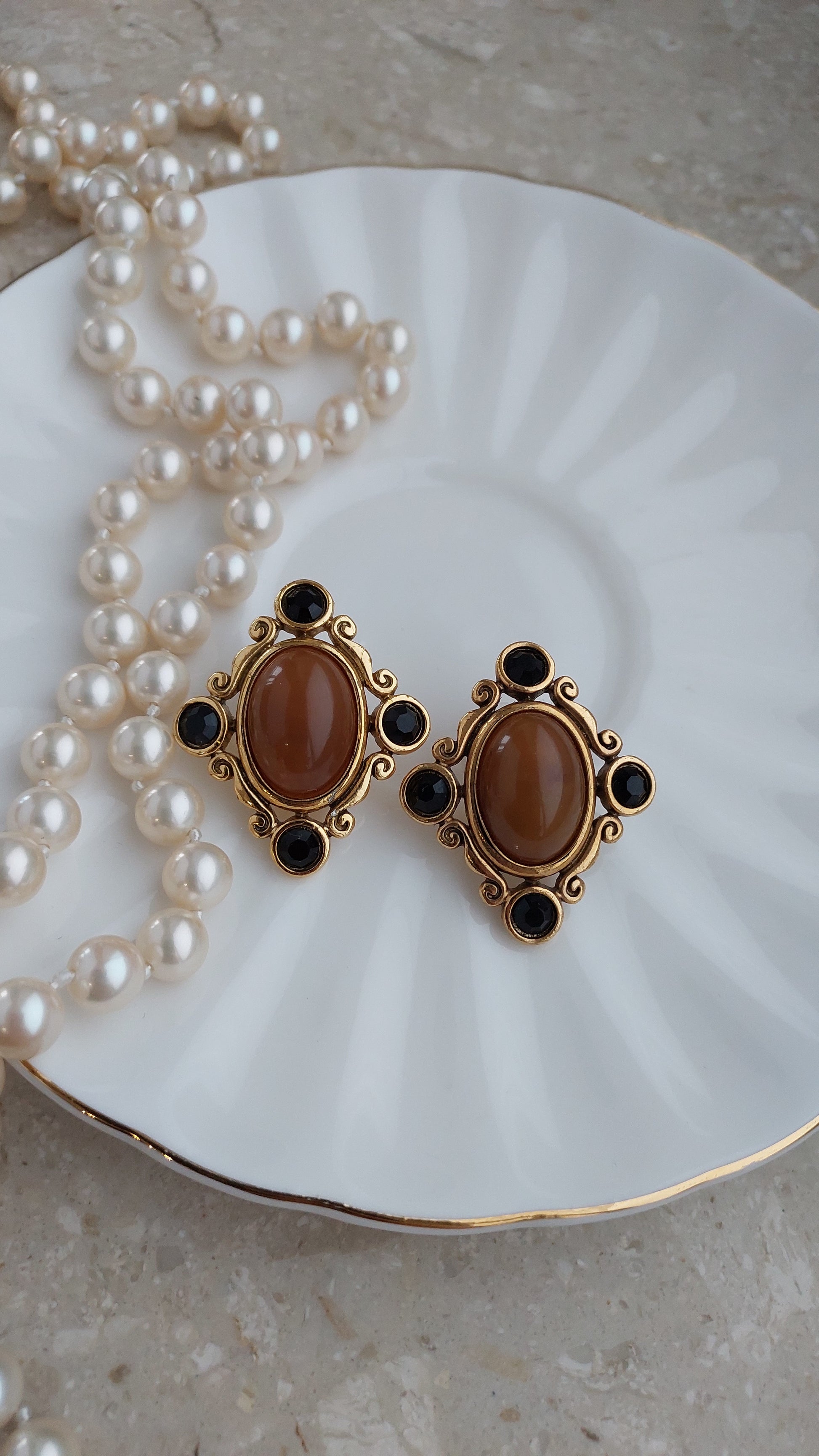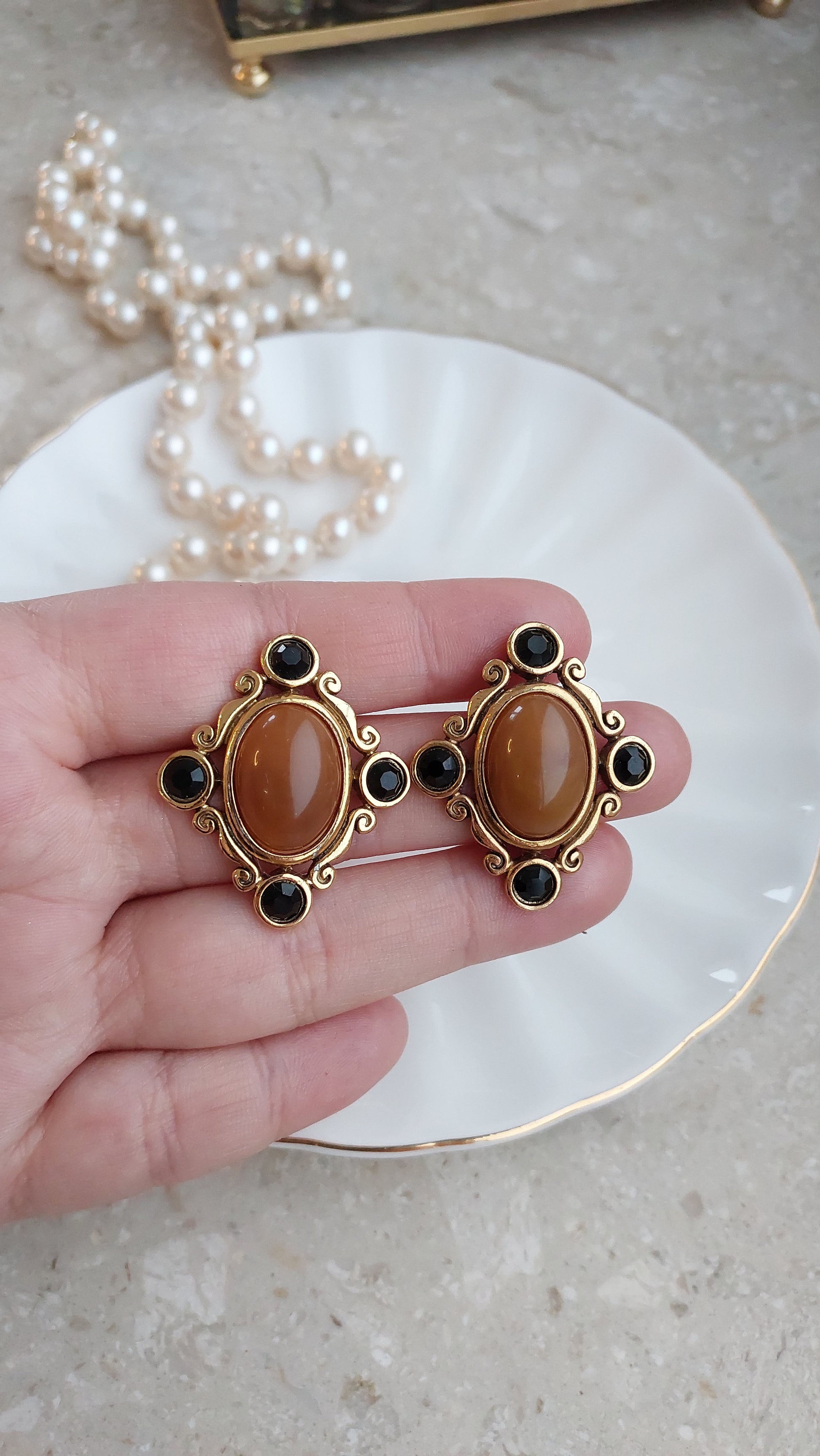 Duże kolczyki z owalnymi kaboszonami w ciepłym, karmelowo-miodowym odcieniu. Centralny element otoczony jest dekoracyjną oprawą z finezyjnymi zawijasami, uzupełnioną drobnymi czarnymi kryształami. Stan bardzo dobry.