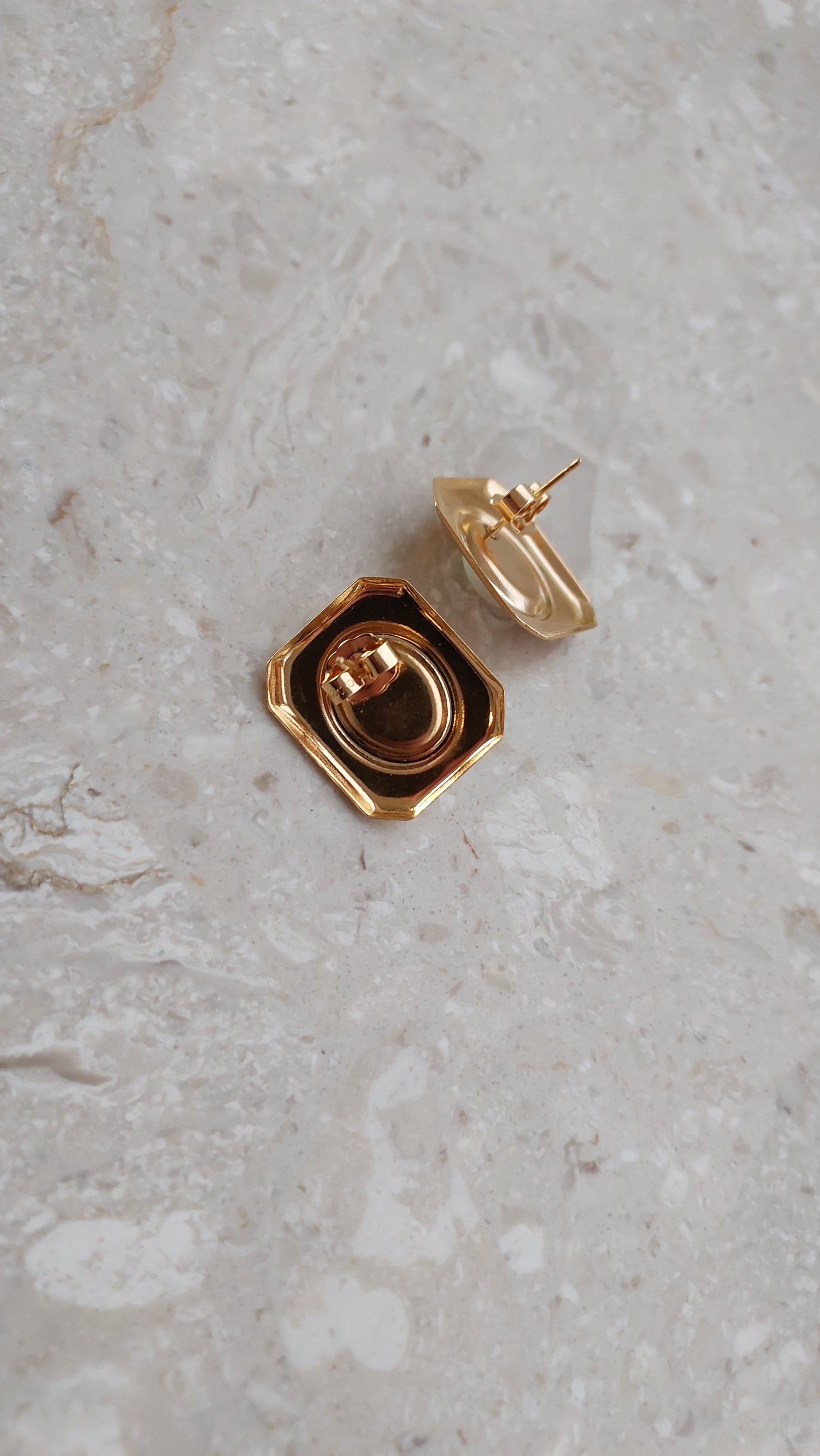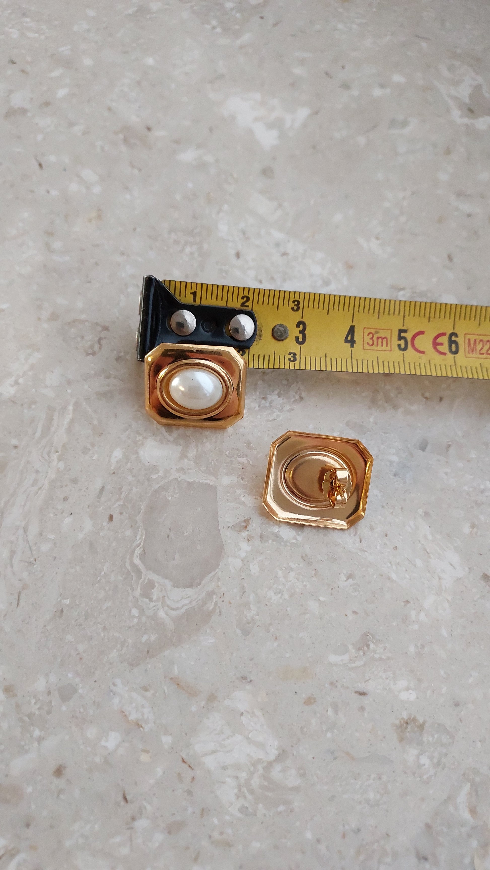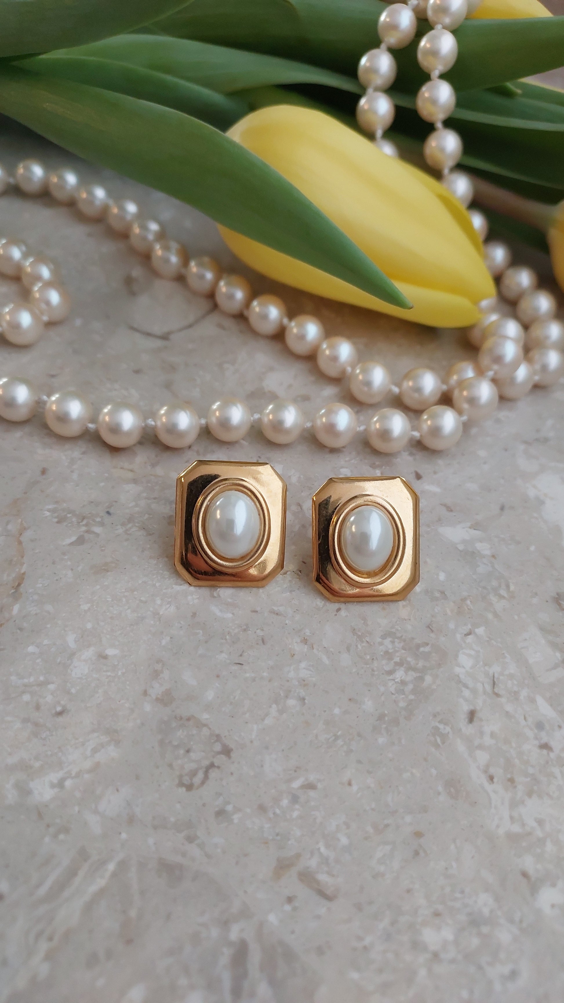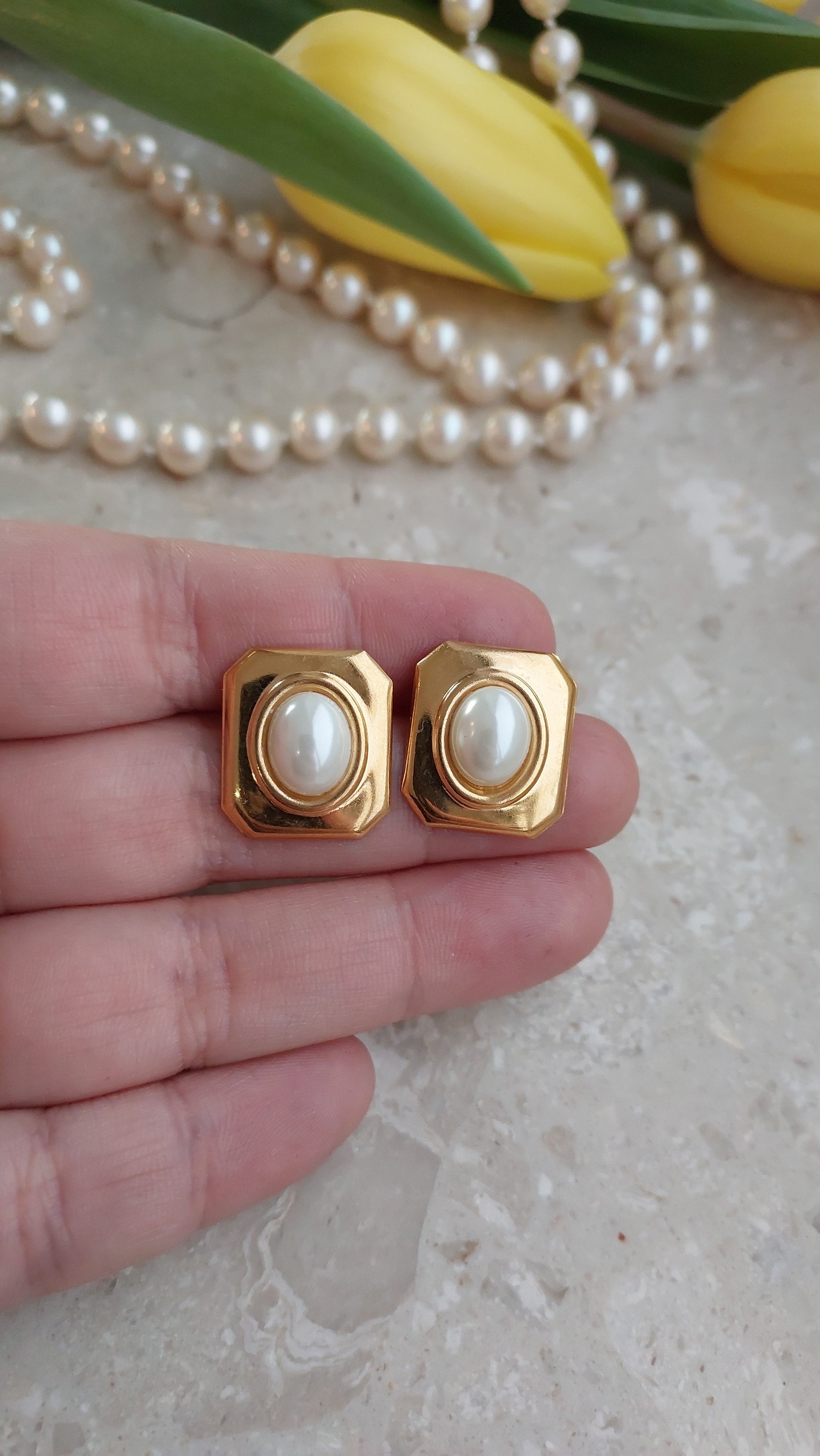 Geometryczne kolczyki Avon w ciepłym, złocistym tonie z perłowymi kaboszonami.