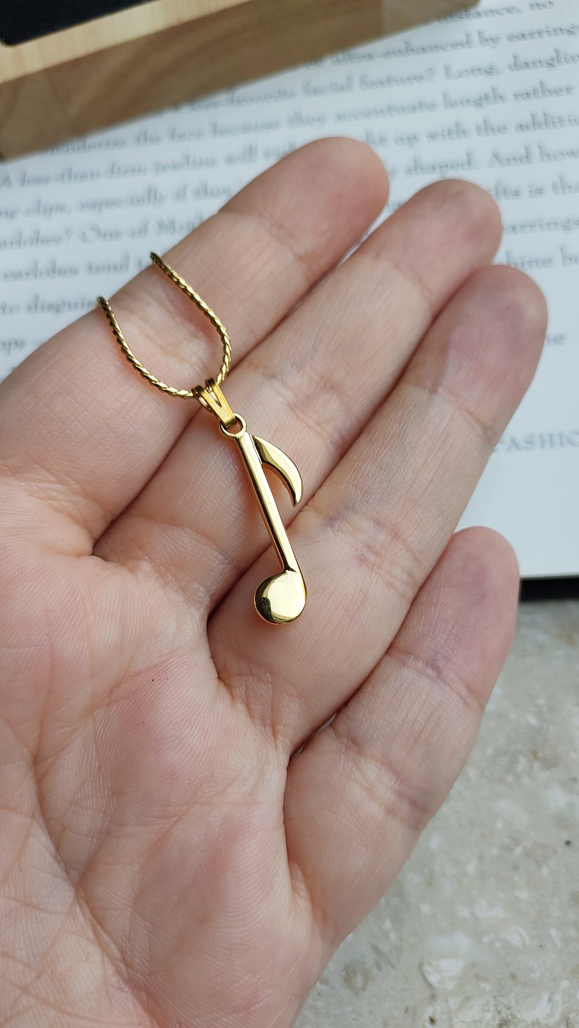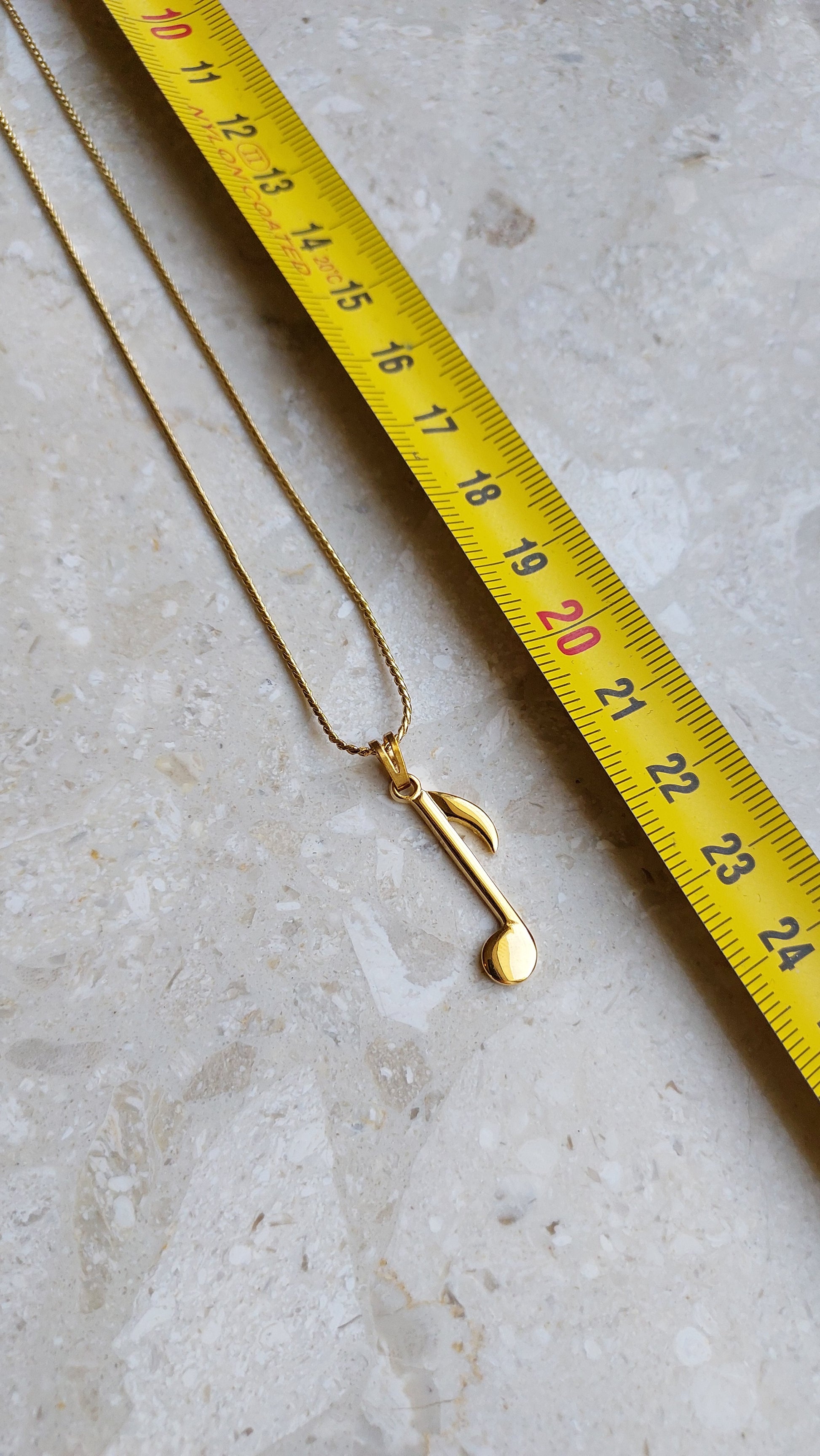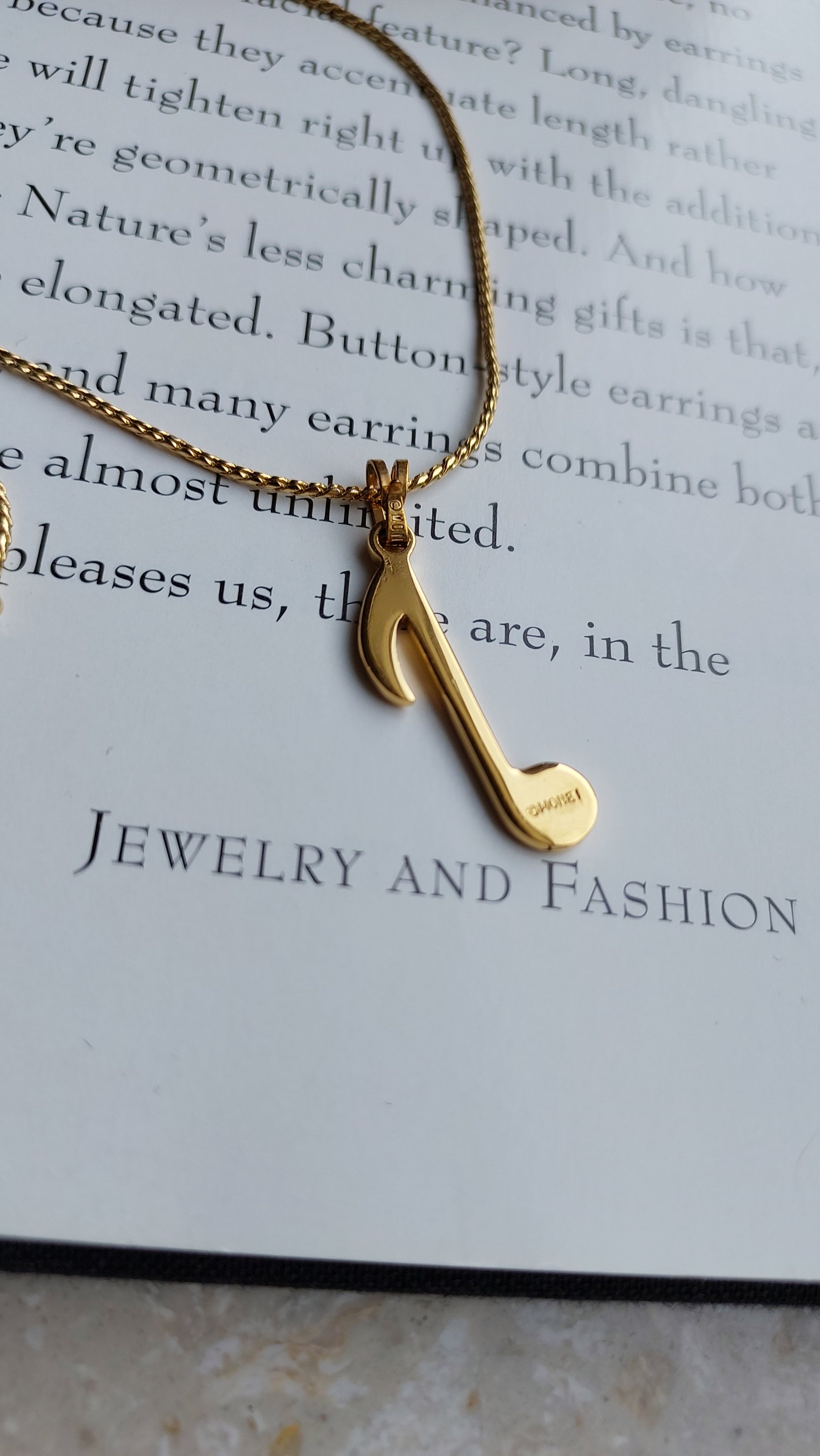 Zawieszka ma formę wydłużonej nuty w ciepłym złotym odcieniu, z gładką, lustrzaną powierzchnią i delikatnie wyprofilowanym kształtem.