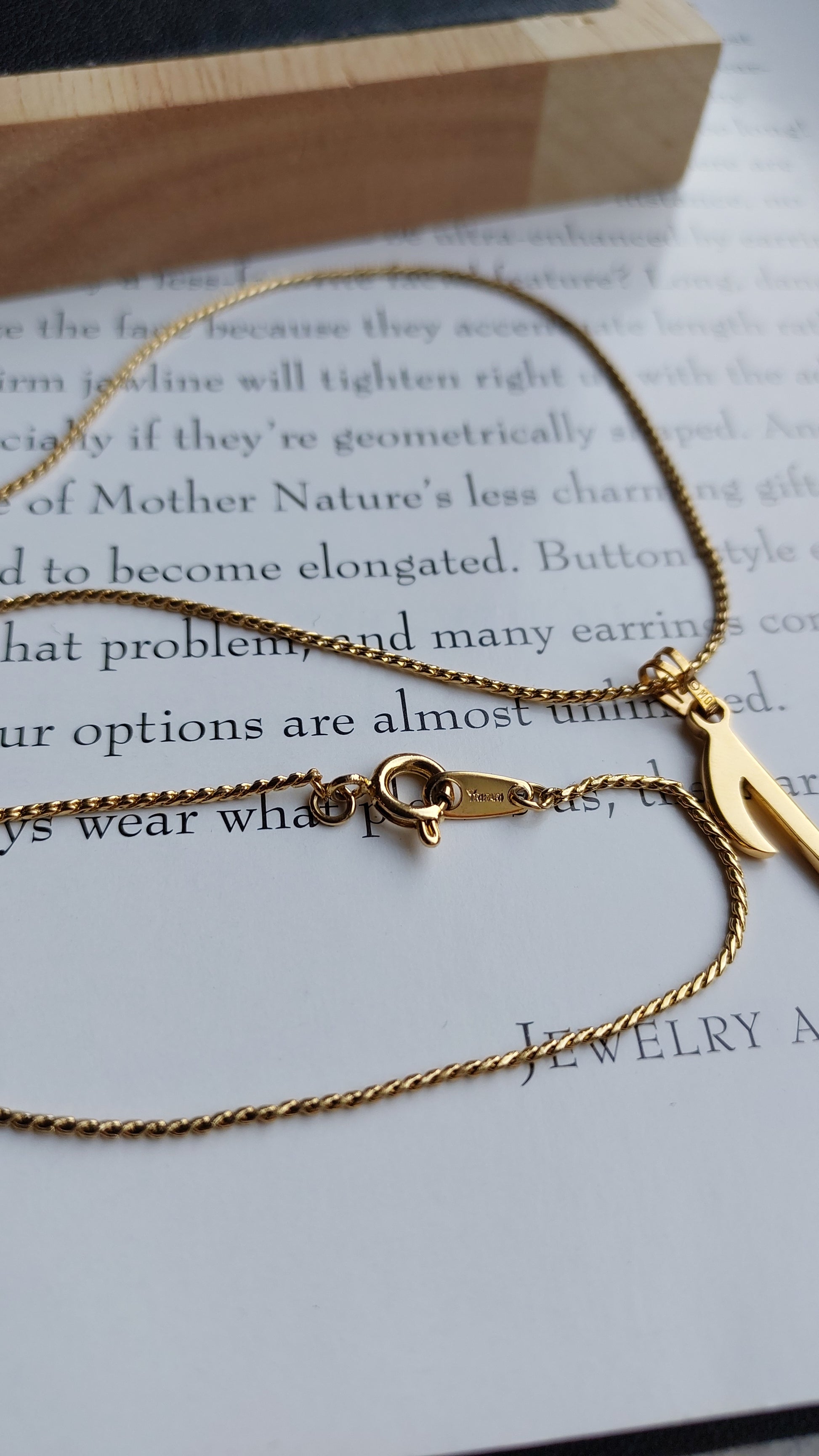 Cienki złocisty łańcuszek Trifari doskonale uzupełnia zawieszkę i podkreśla jej subtelny blask.