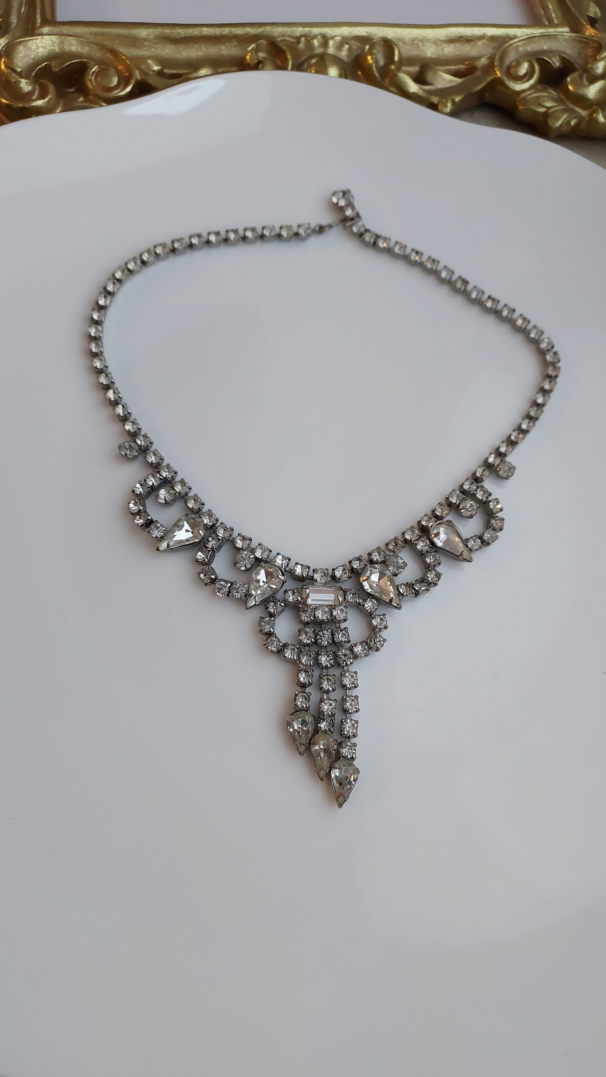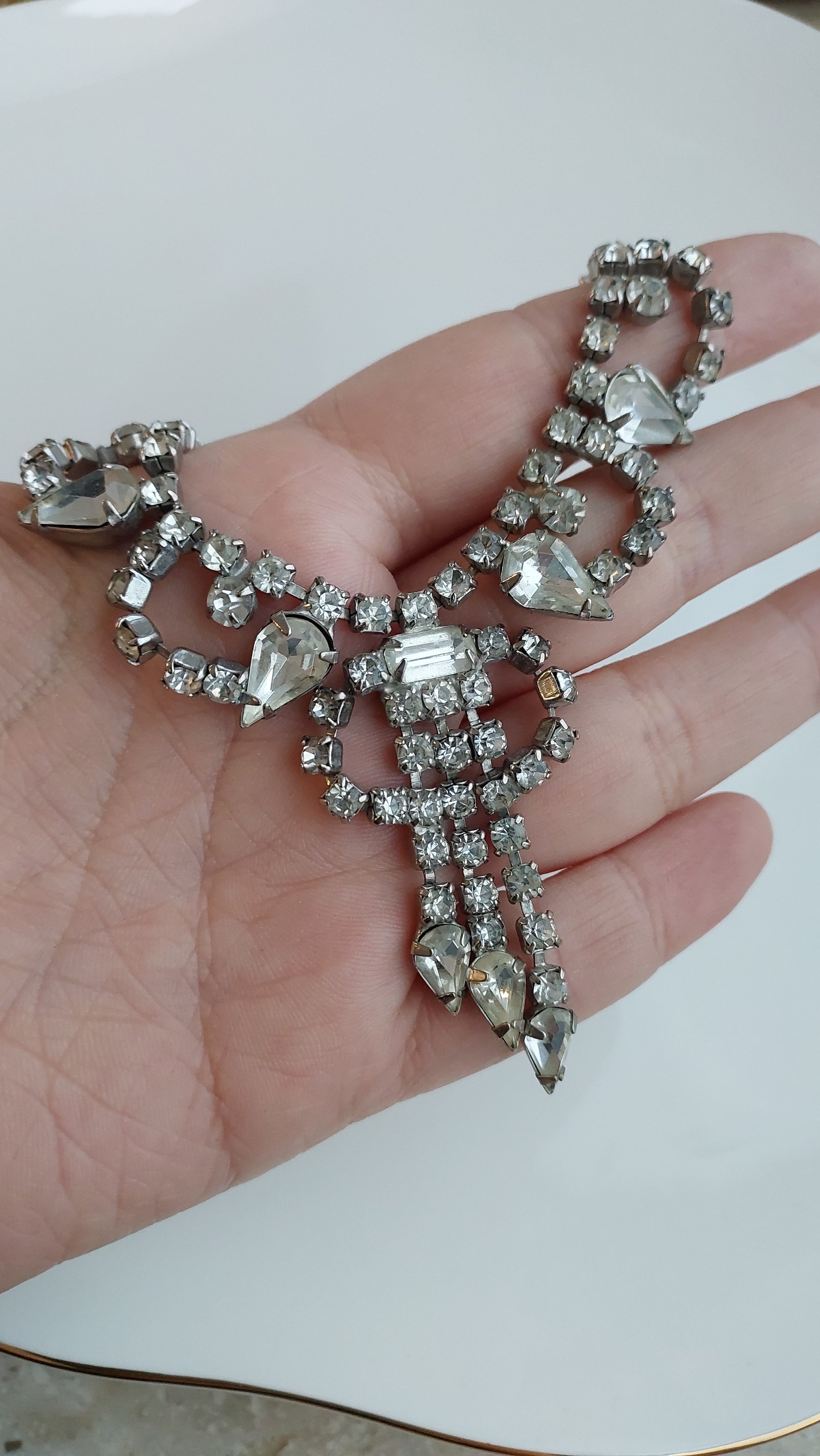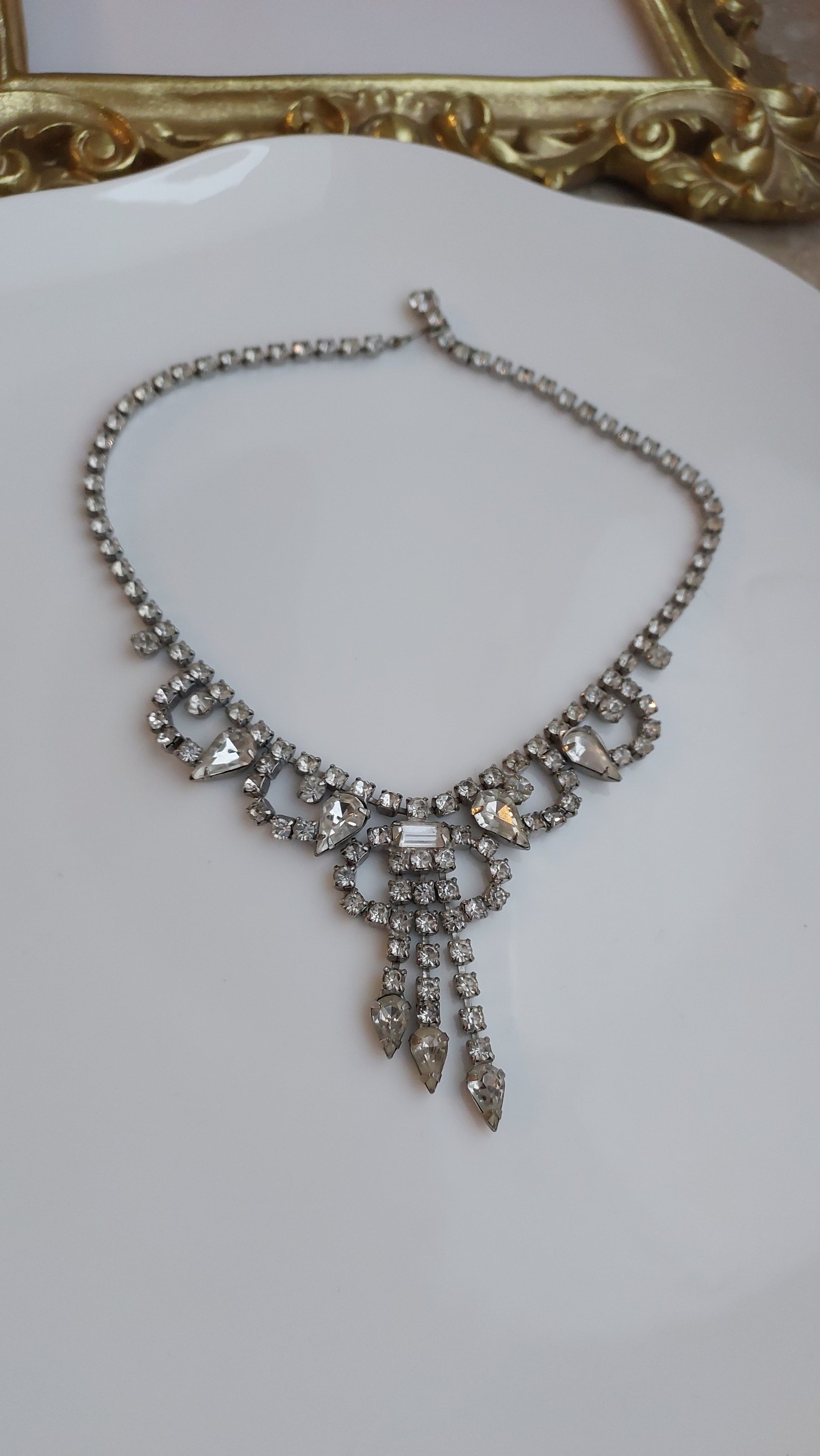 Naszyjnik vintage z centralnym, kaskadowym elementem, zdobiony przezroczystymi kryształami o różnych szlifach. Pięknie podkreśla linię dekoltu i efektownie mieni się w ruchu.