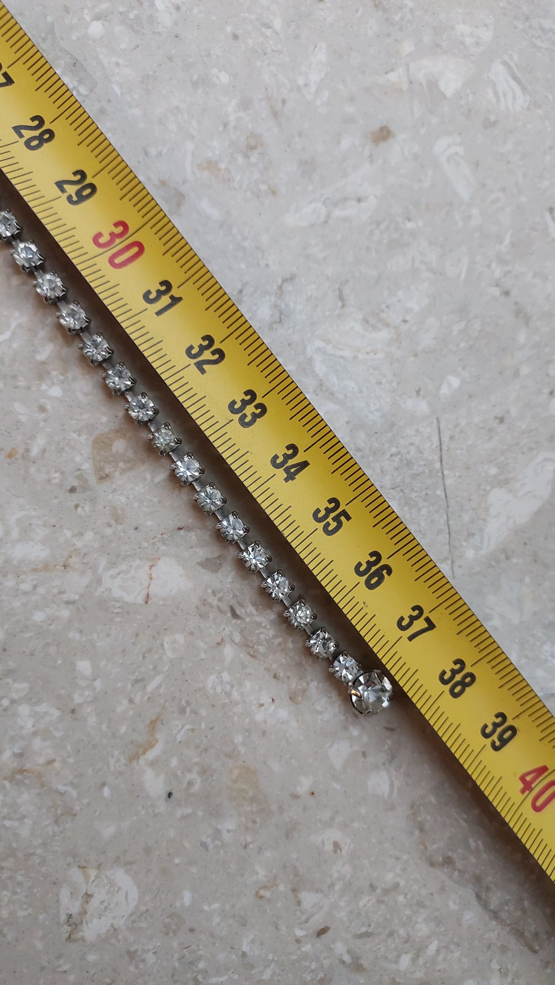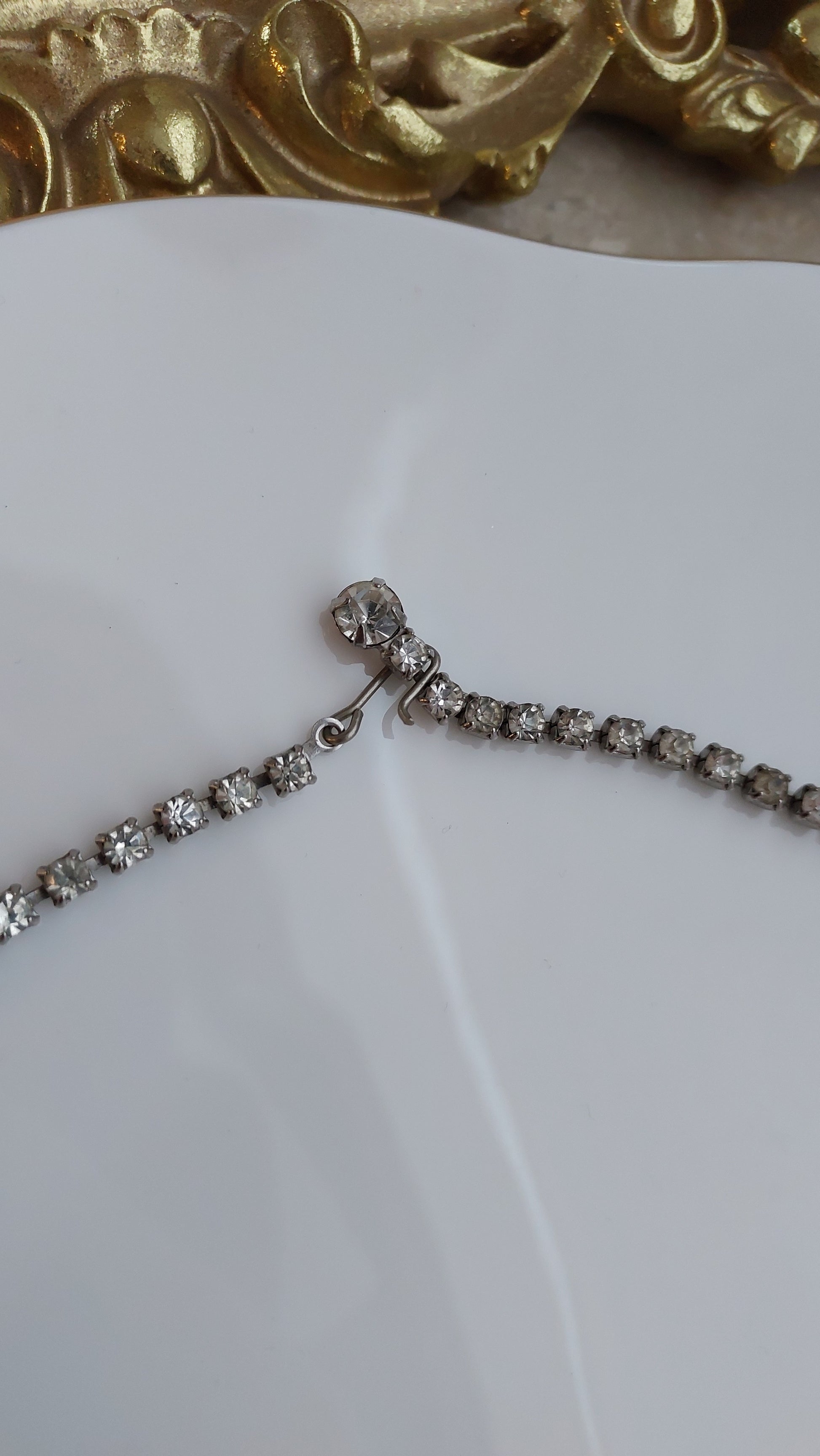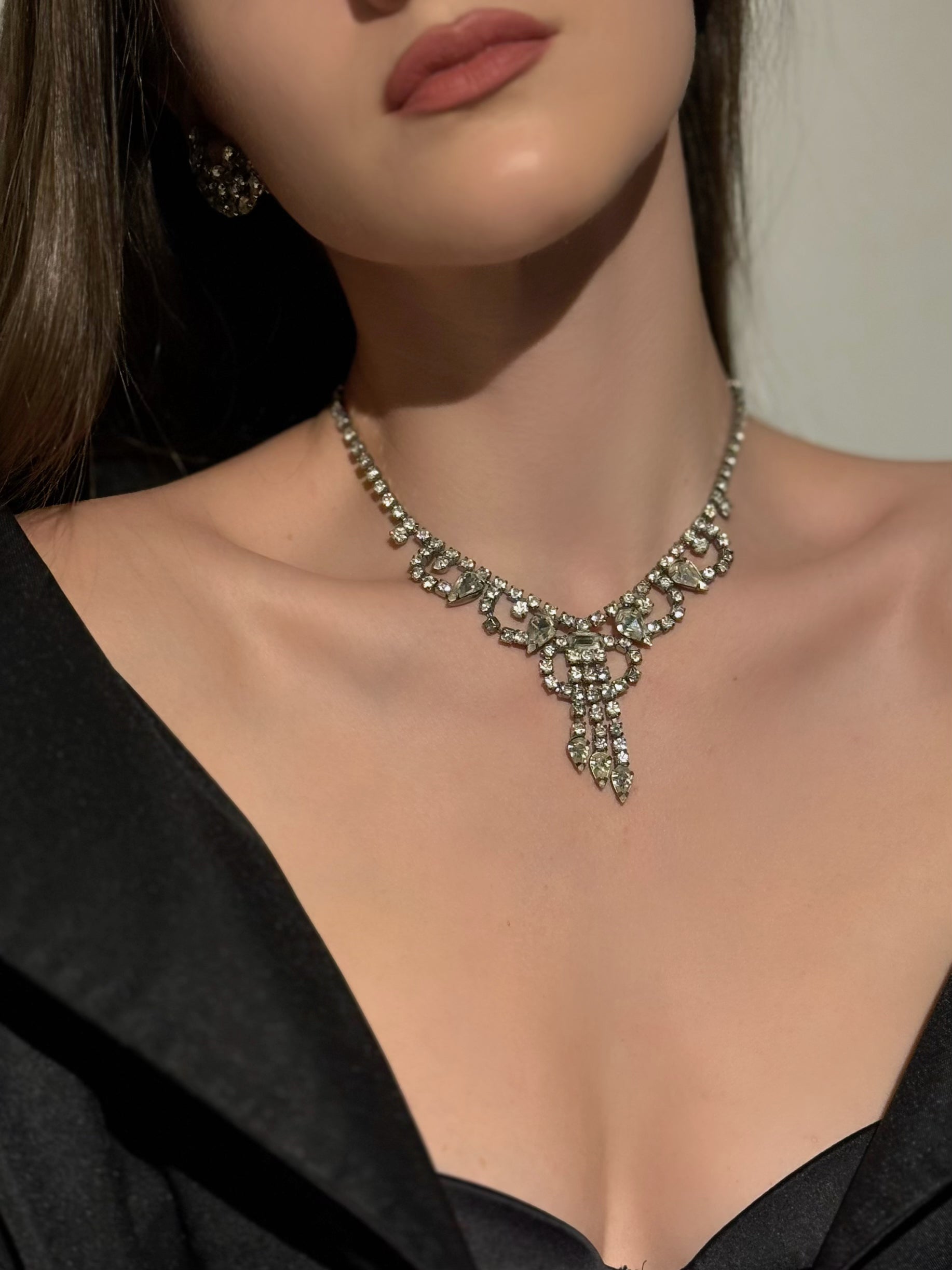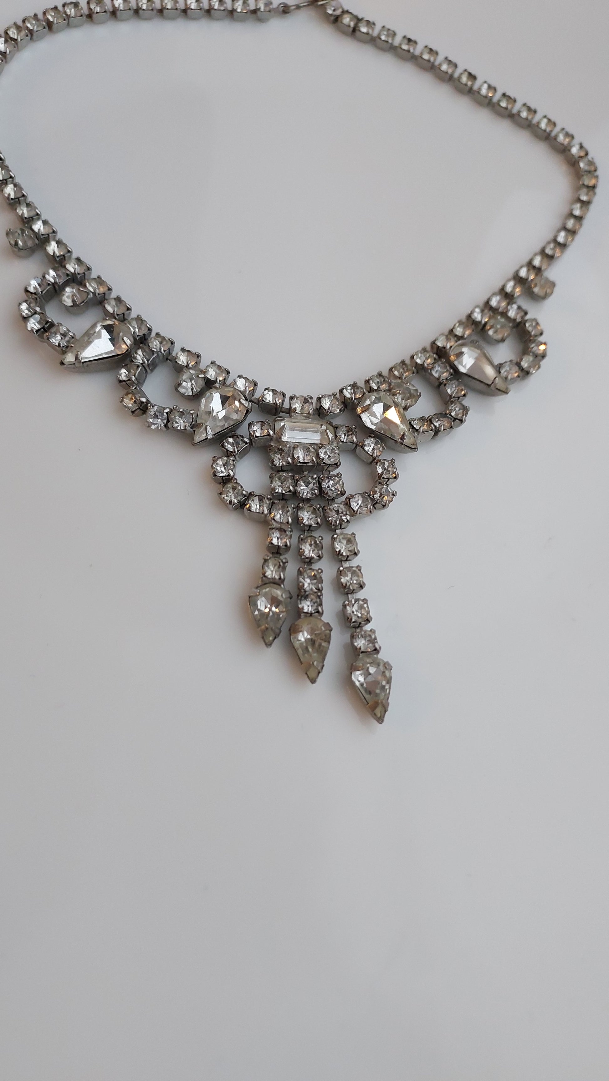 Naszyjnik vintage z centralnym, kaskadowym elementem, zdobiony przezroczystymi kryształami o różnych szlifach. Pięknie podkreśla linię dekoltu i efektownie mieni się w ruchu.
