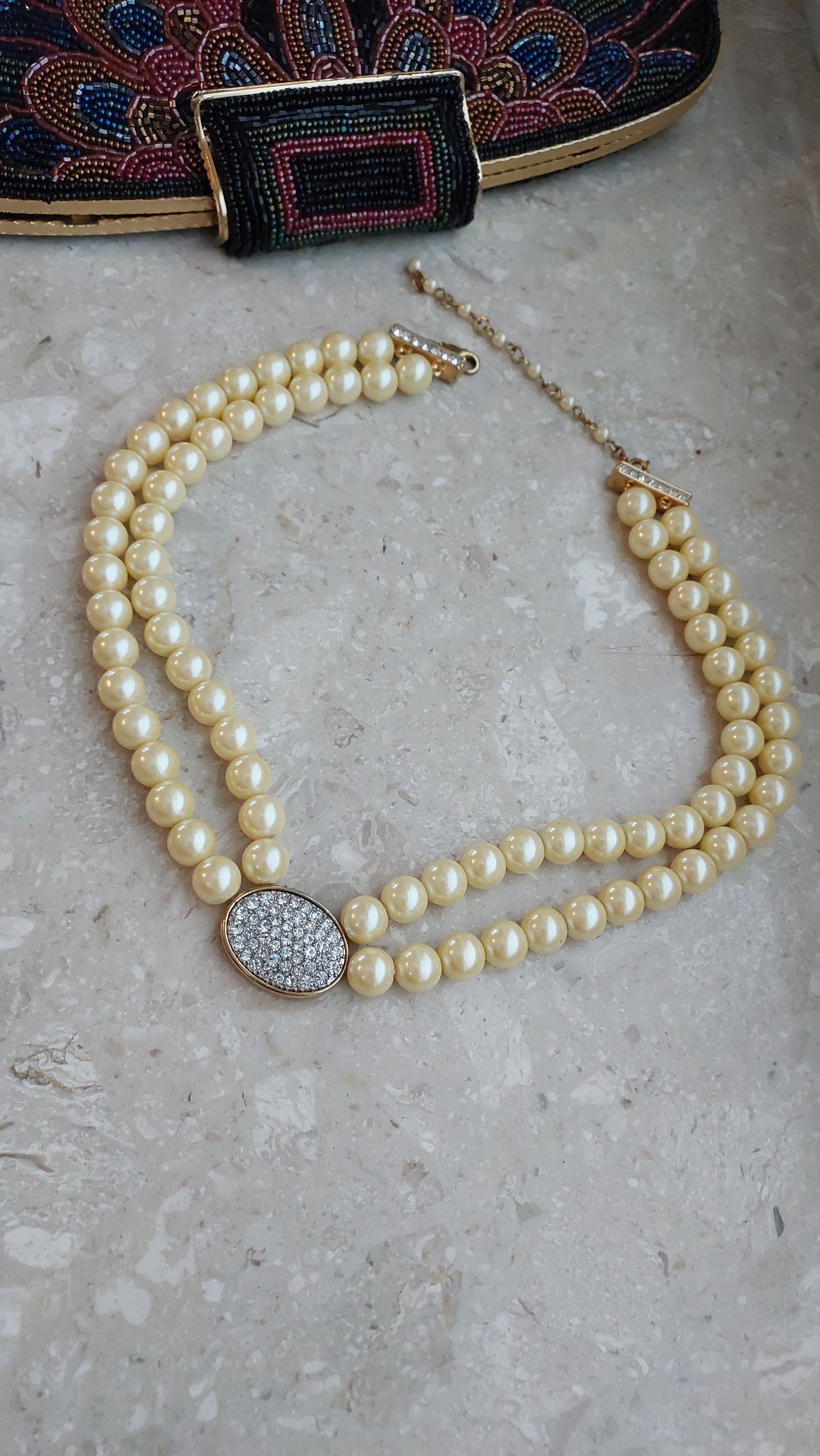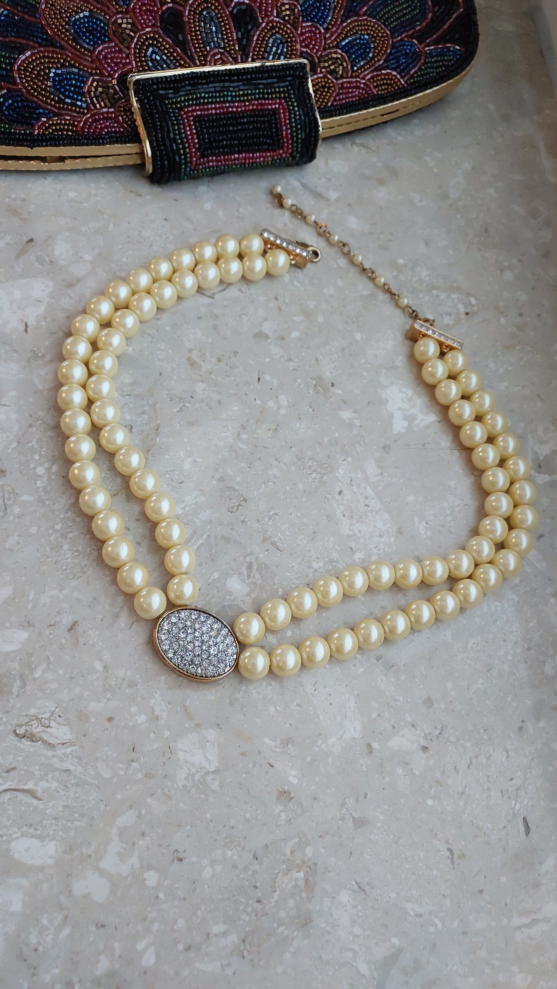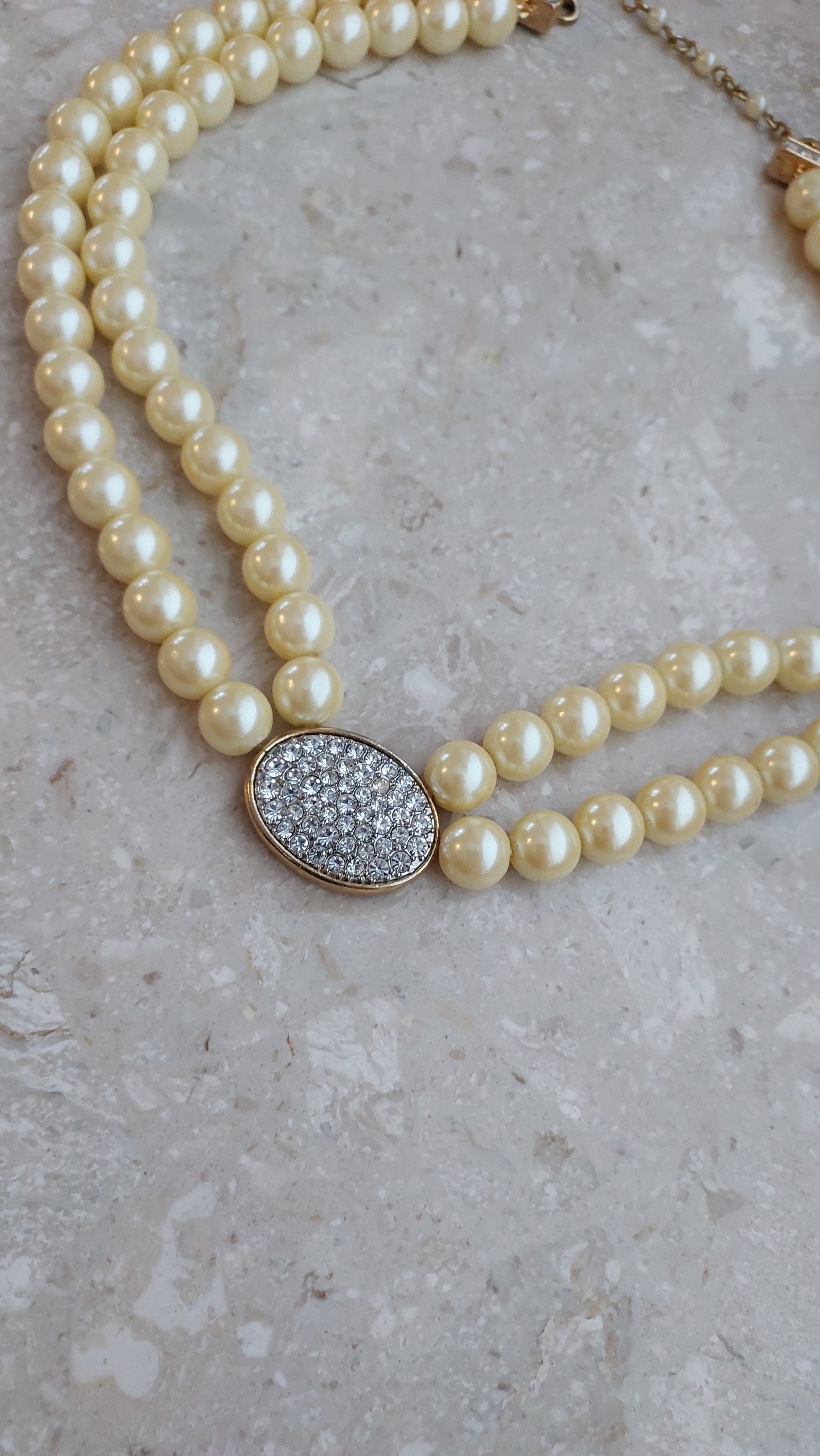 Naszyjnik Avon w formie dwurzędowej kompozycji z koralików w ciepłym kremowo-perłowym odcieniu o miękkim blasku. Centralnym elementem jest owalna wstawka wysadzana przezroczystymi kryształami, które nadają efektownego blasku i podkreślają uroczysty charakter.