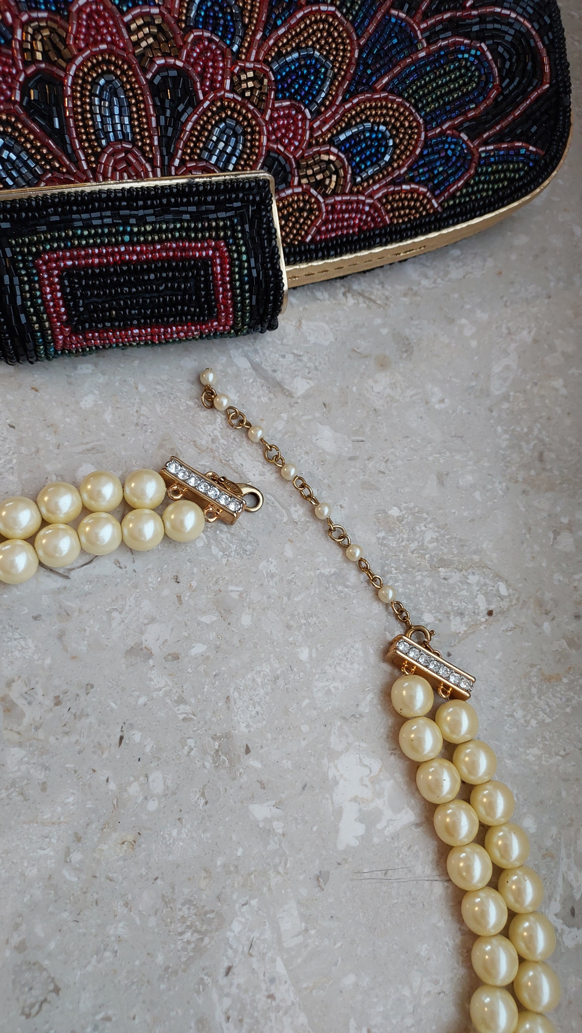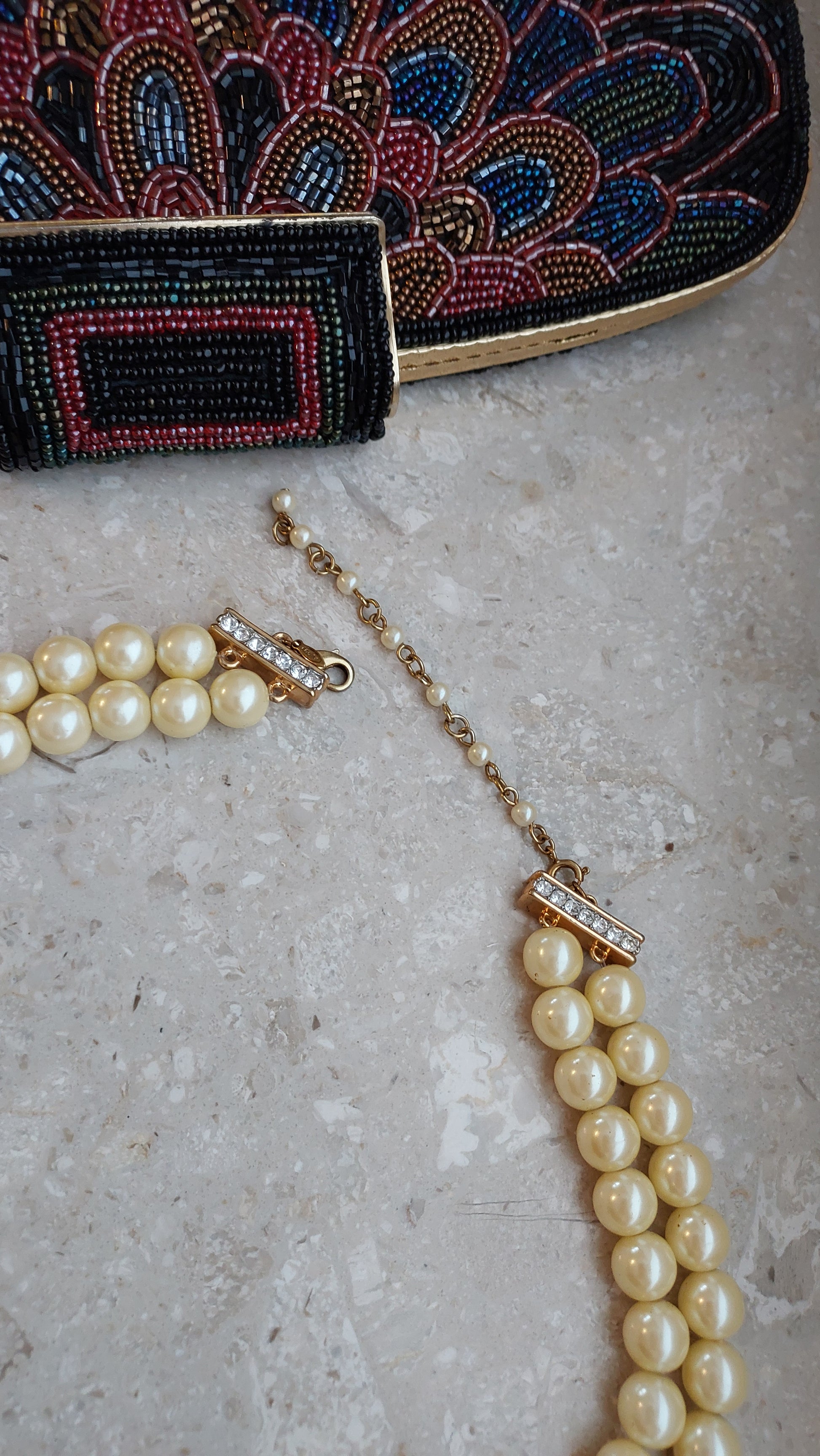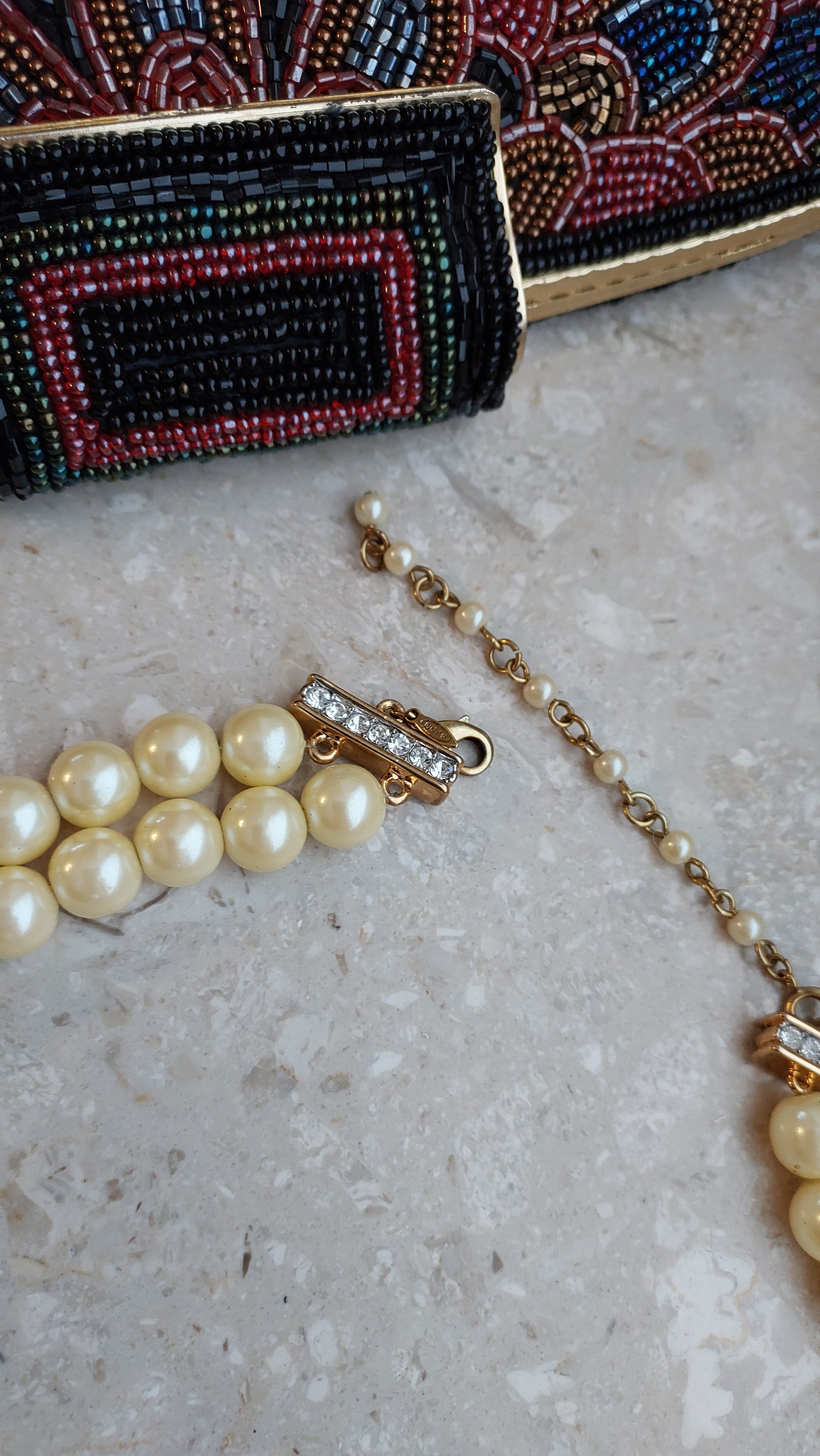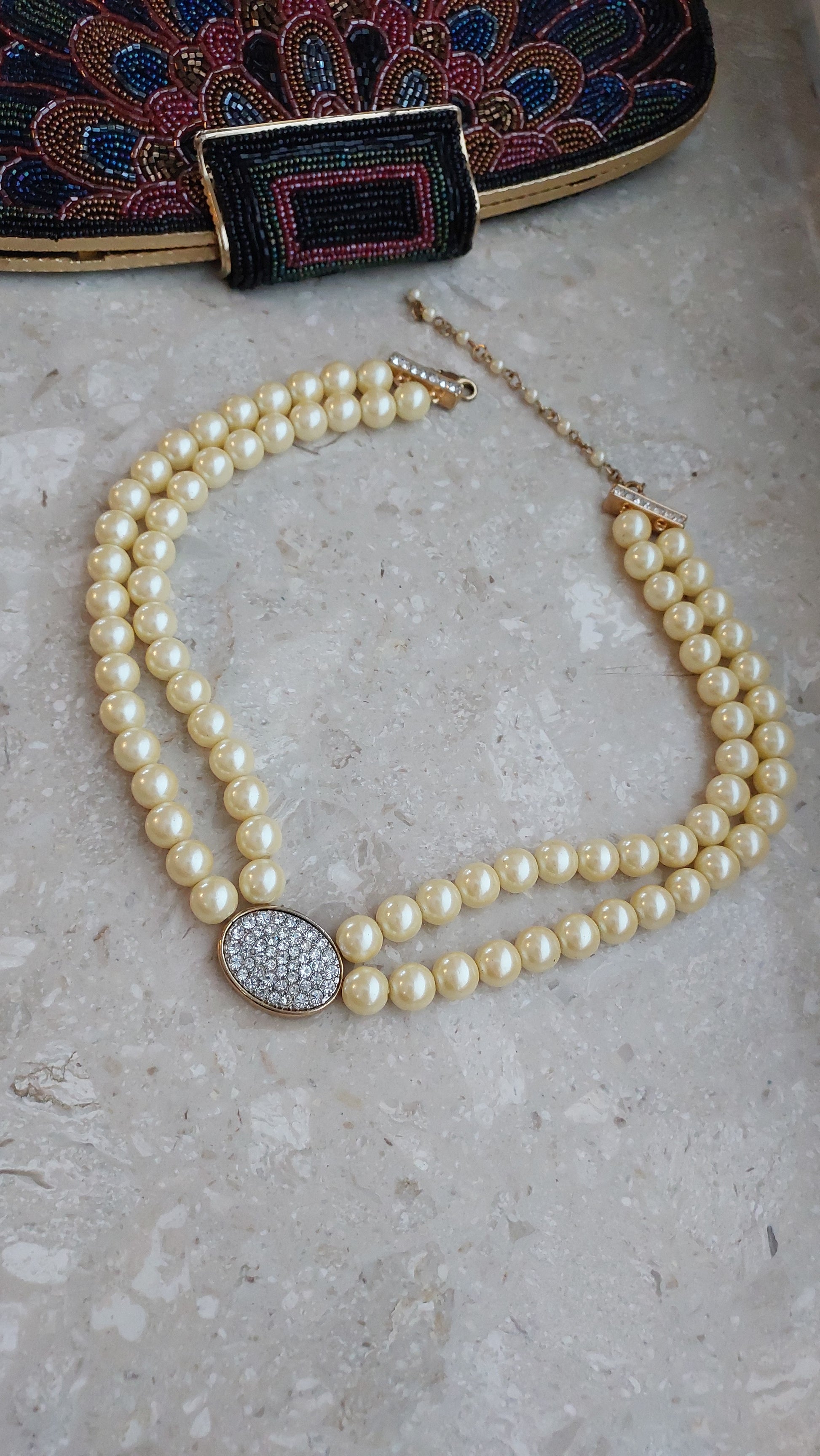 Naszyjnik Avon w formie dwurzędowej kompozycji z koralików w ciepłym kremowo-perłowym odcieniu o miękkim blasku. Centralnym elementem jest owalna wstawka wysadzana przezroczystymi kryształami, które nadają efektownego blasku i podkreślają uroczysty charakter.