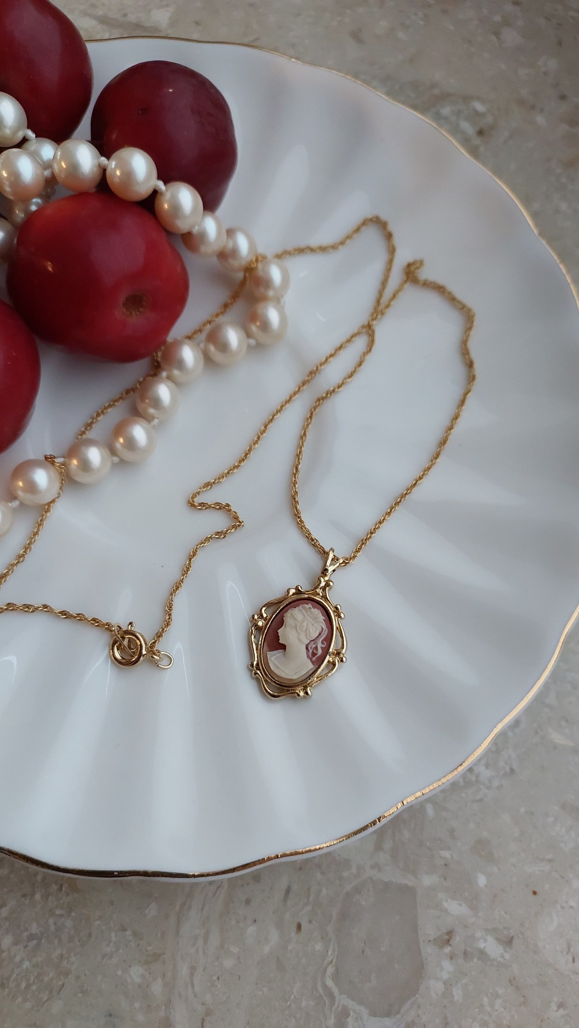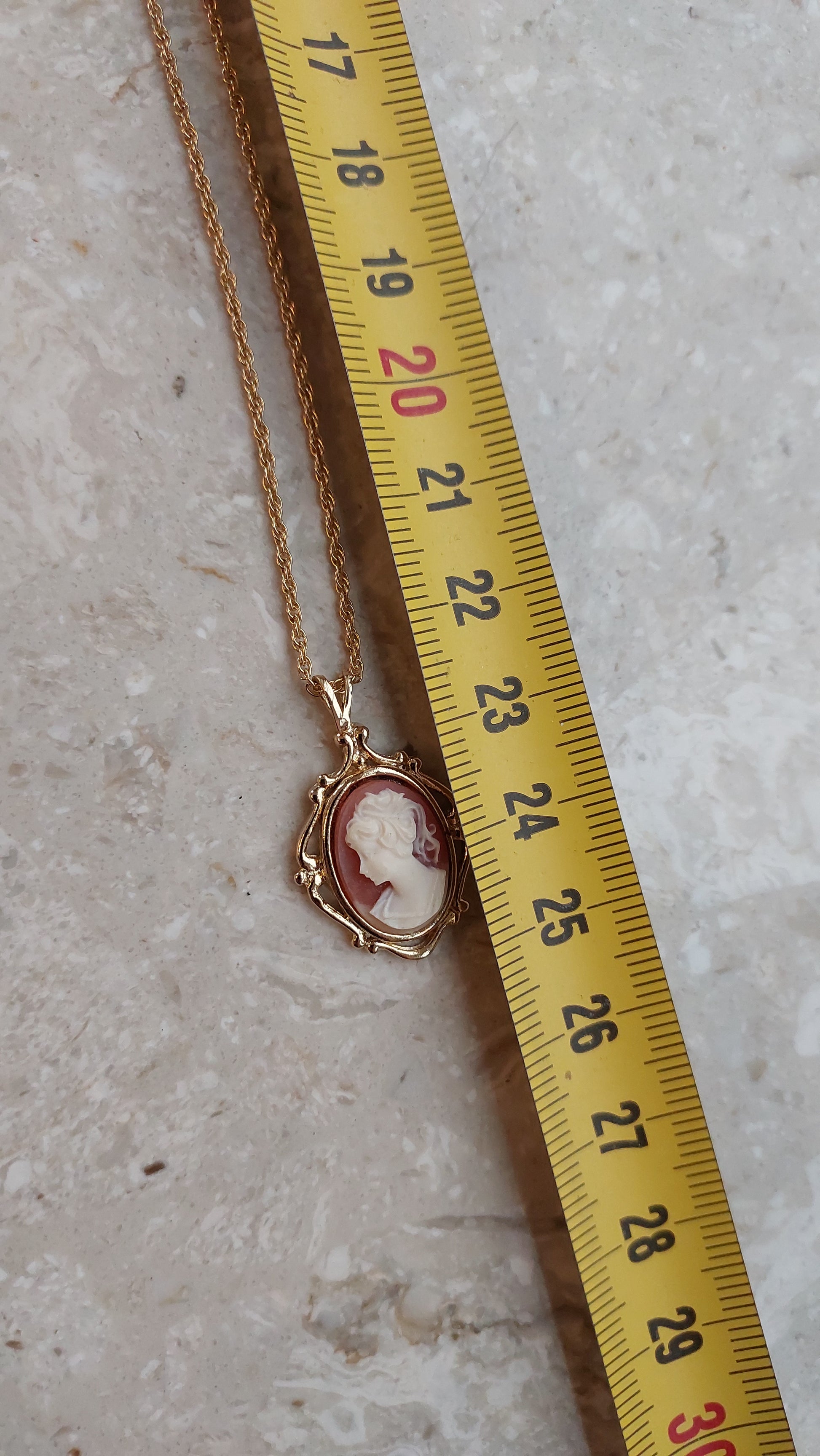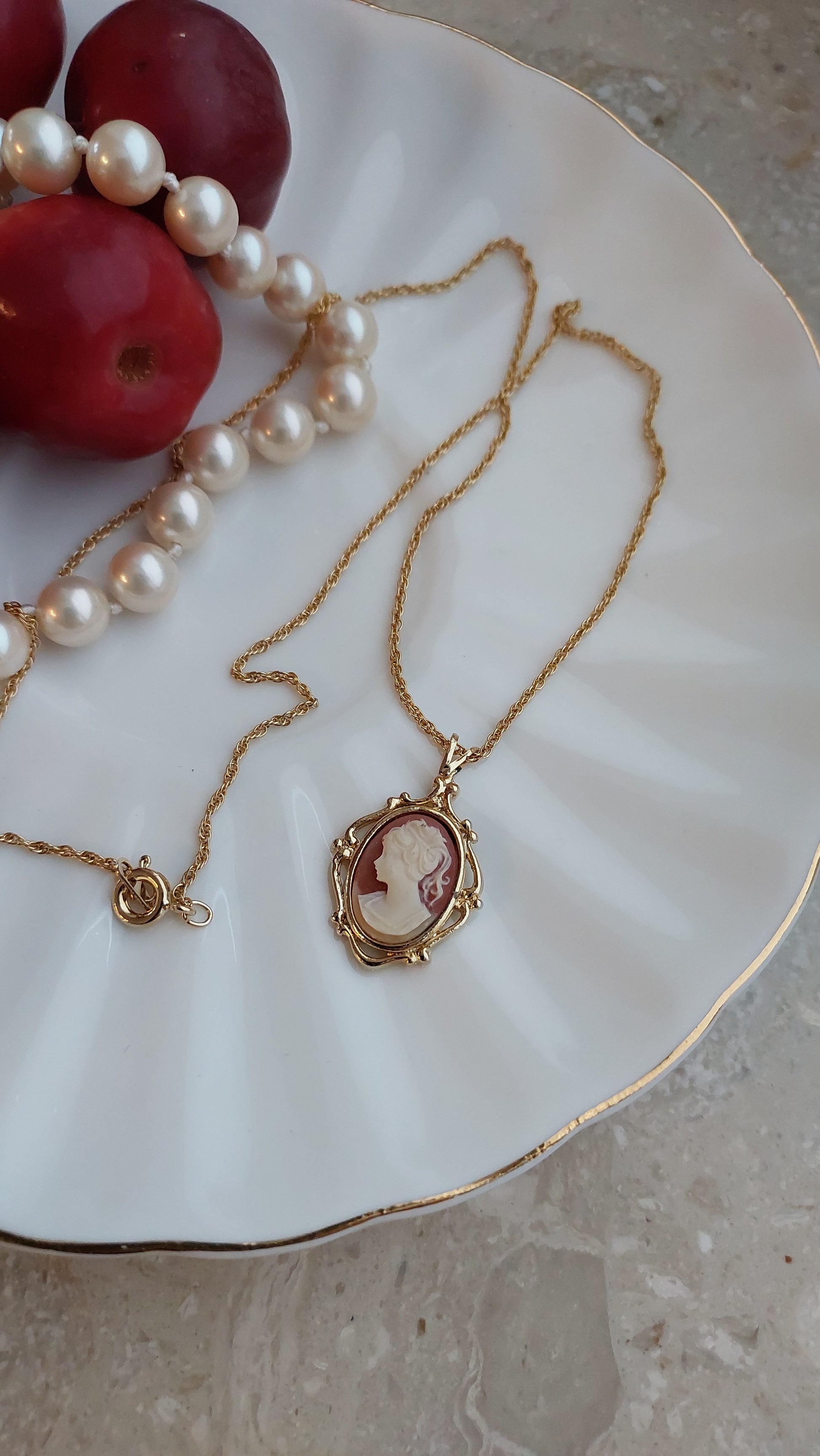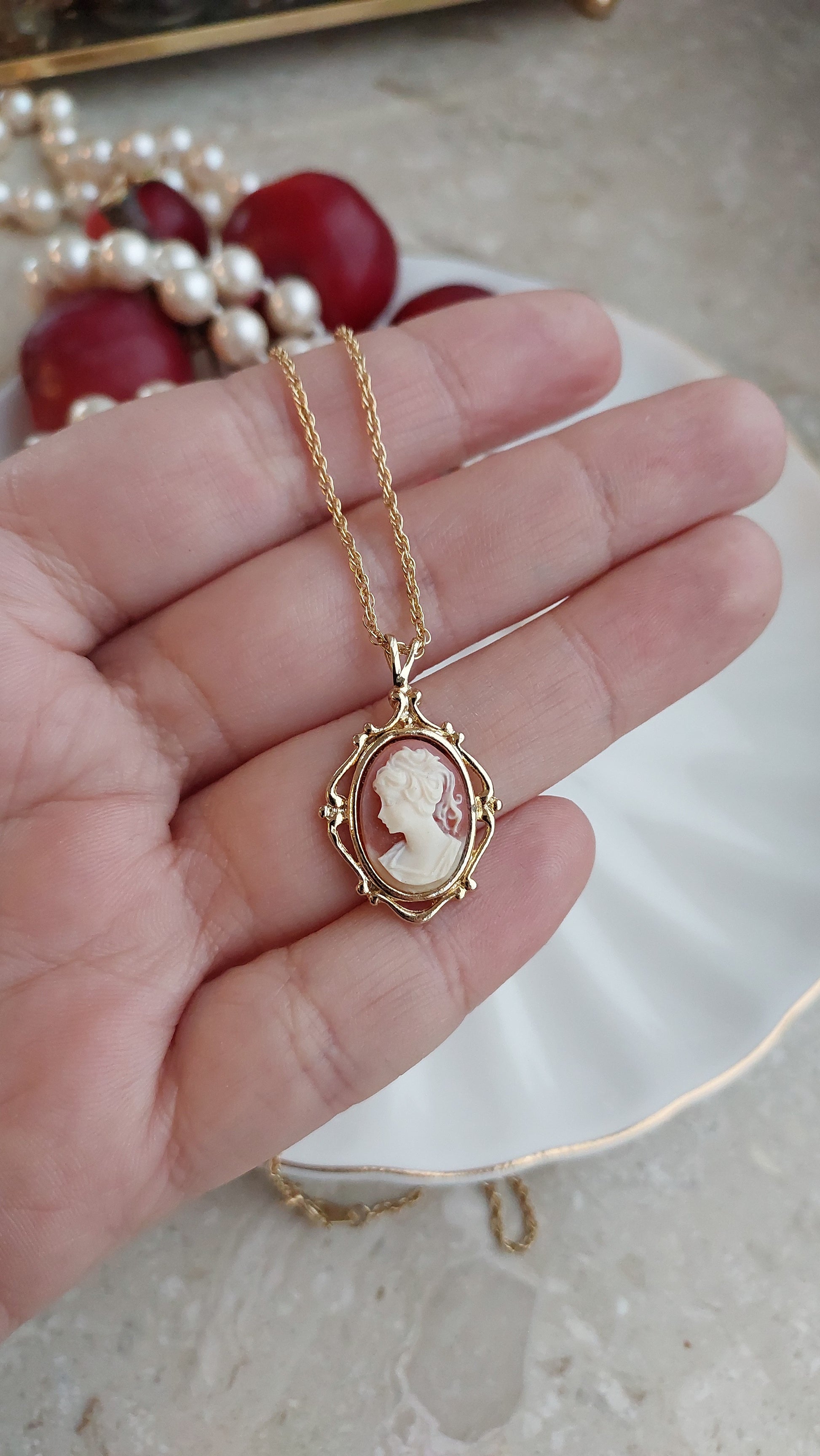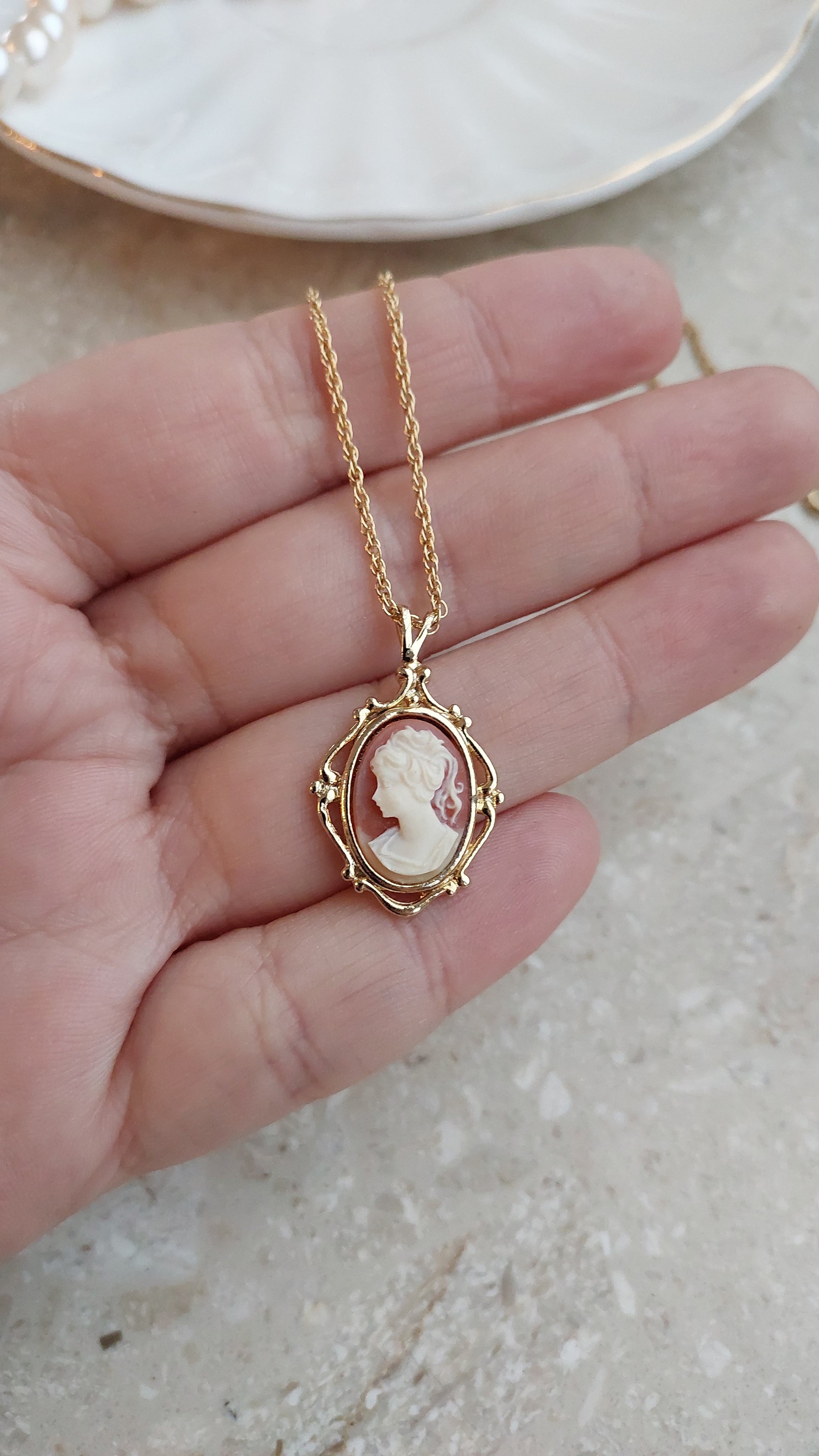 Naszyjnik Avon z subtelną zawieszką - kamea w klasycznym stylu. Centralny medalion o owalnym kształcie zdobi reliefowy profil w delikatnym, kremowym odcieniu na ciepłym, różowo-terakotowym tle. Kamea została oprawiona w dekoracyjną ramkę w złocistym tonie z miękkimi, eleganckimi liniami, które podkreślają romantyczny charakter ozdoby.