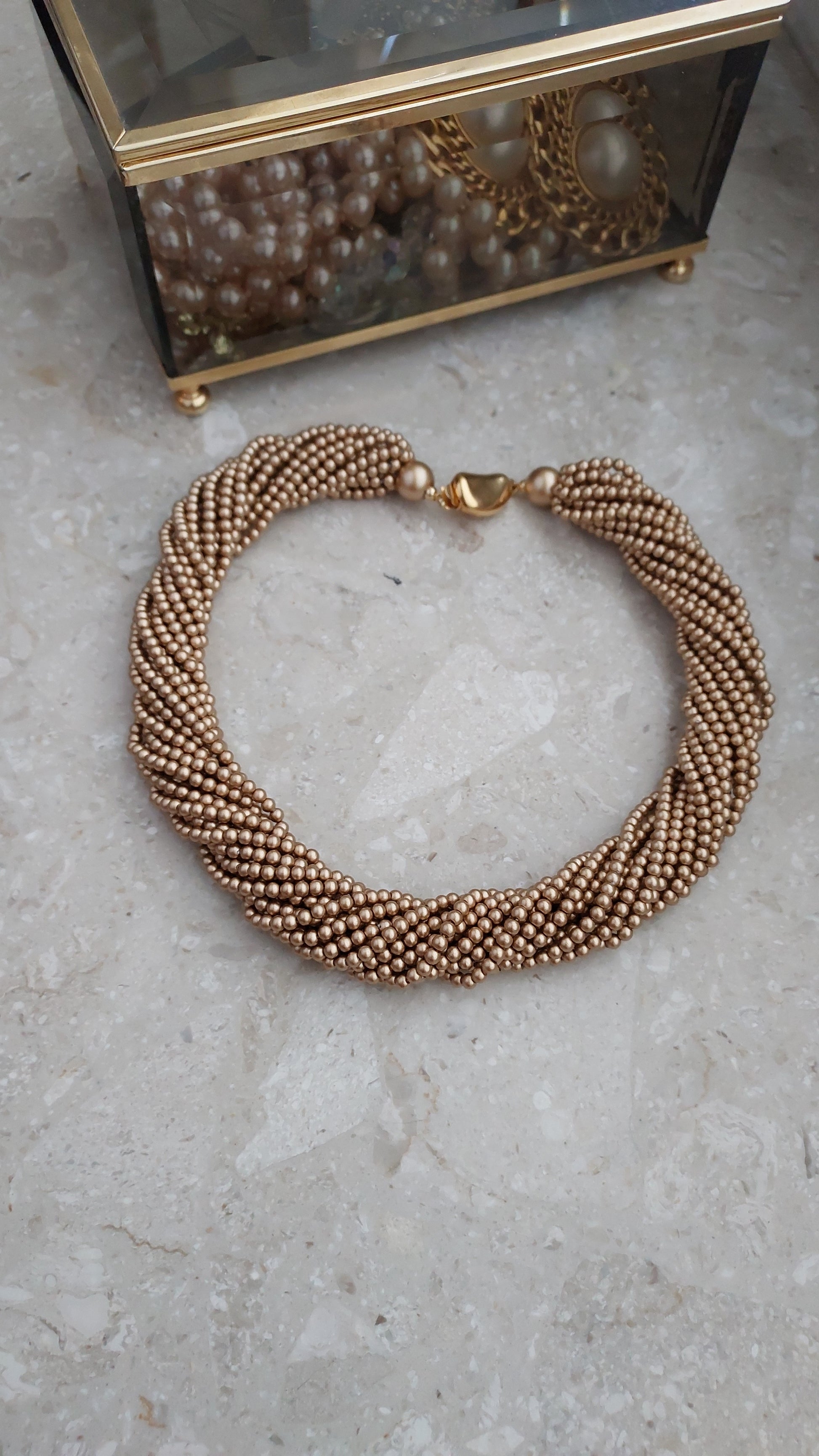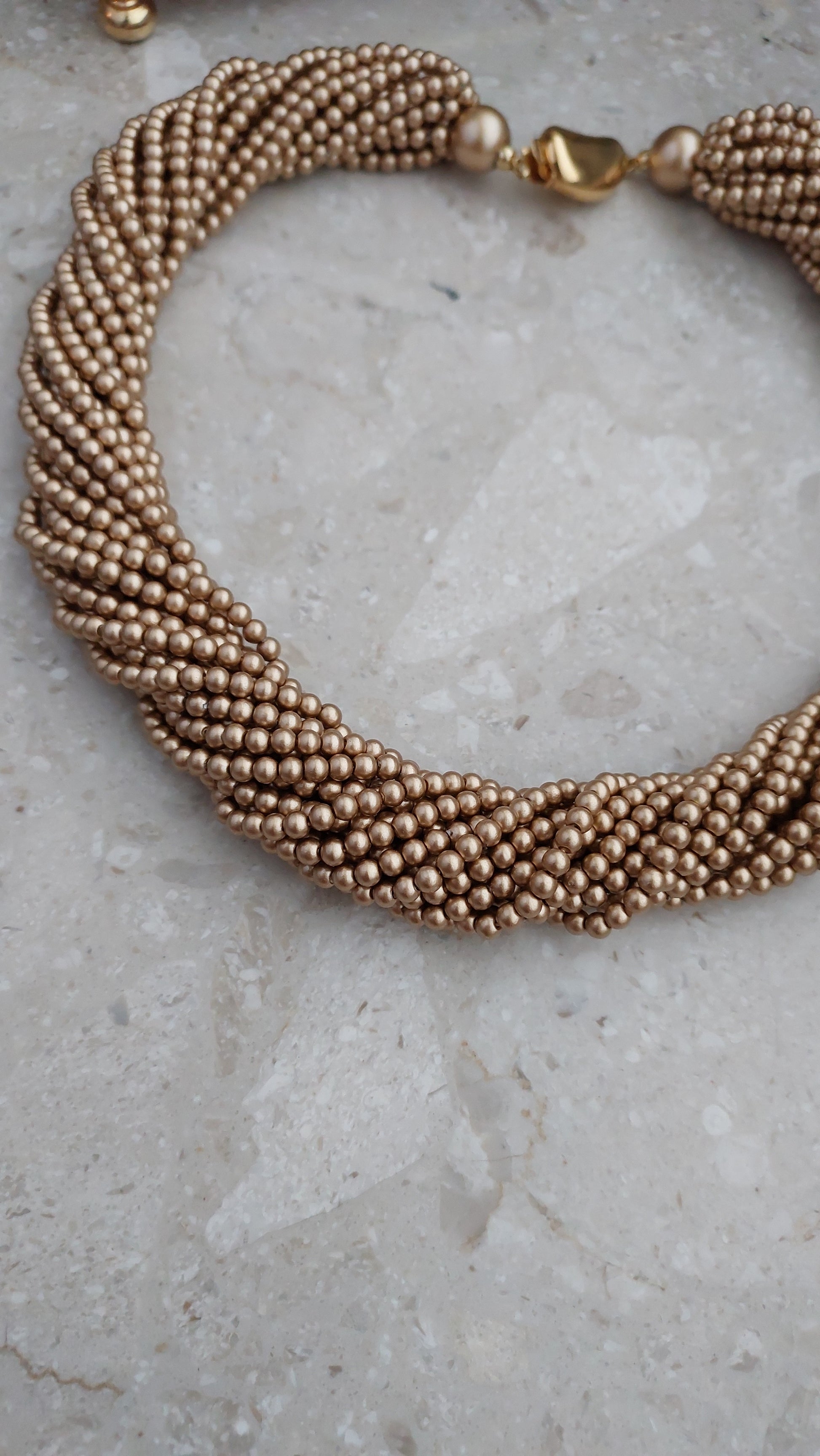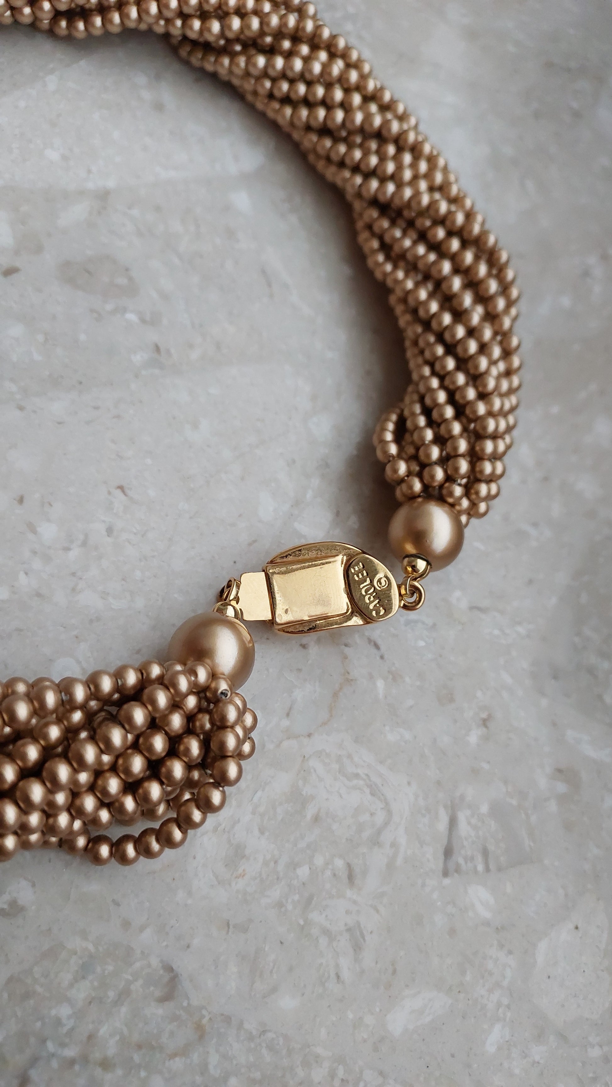 Naszyjnik Carolee złożony z wielu drobnych koralików w ciepłym, złocisto-brązowym odcieniu, splecionych w gęsty, wielorzędowy splot o miękkim blasku perełek.