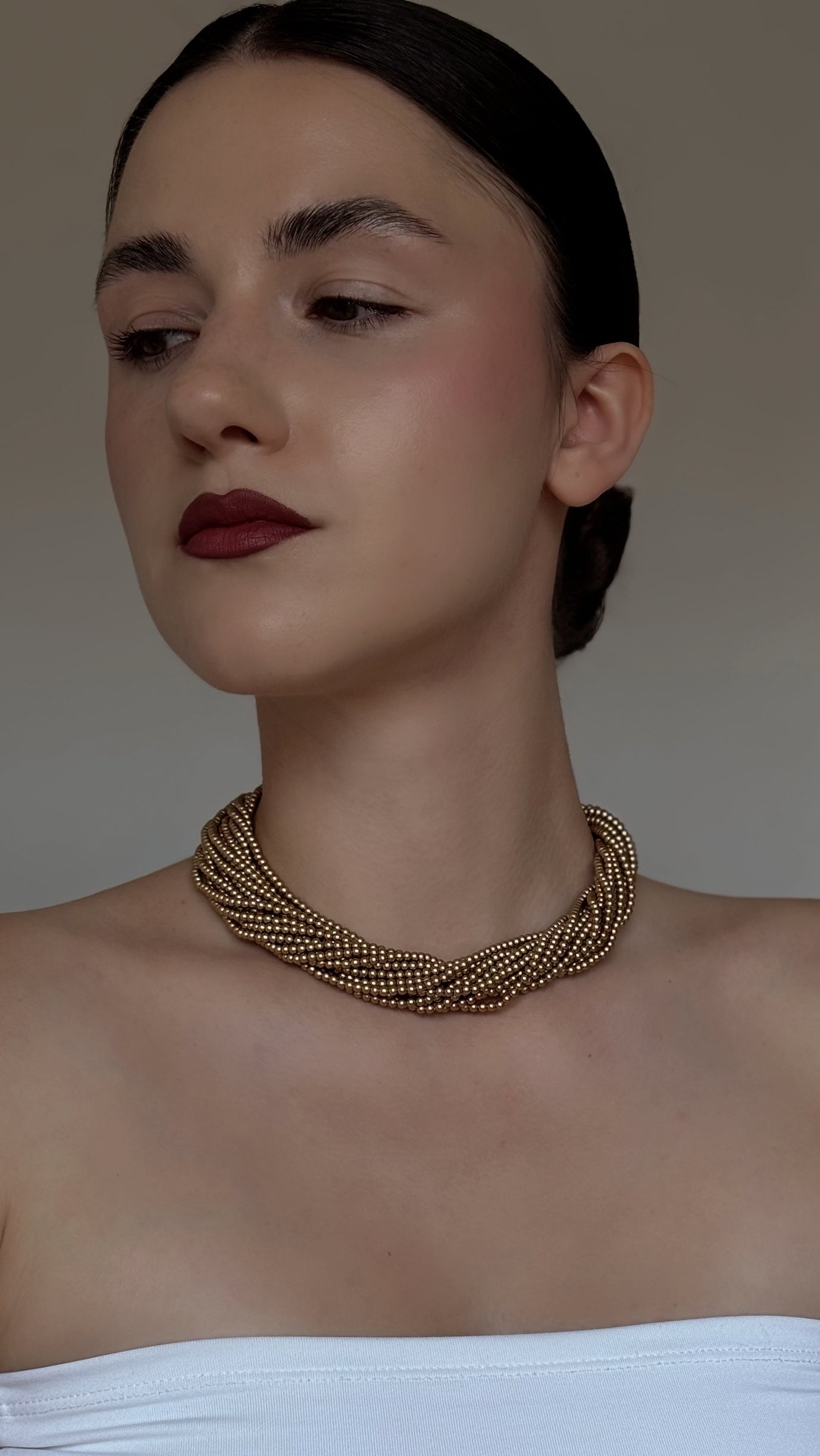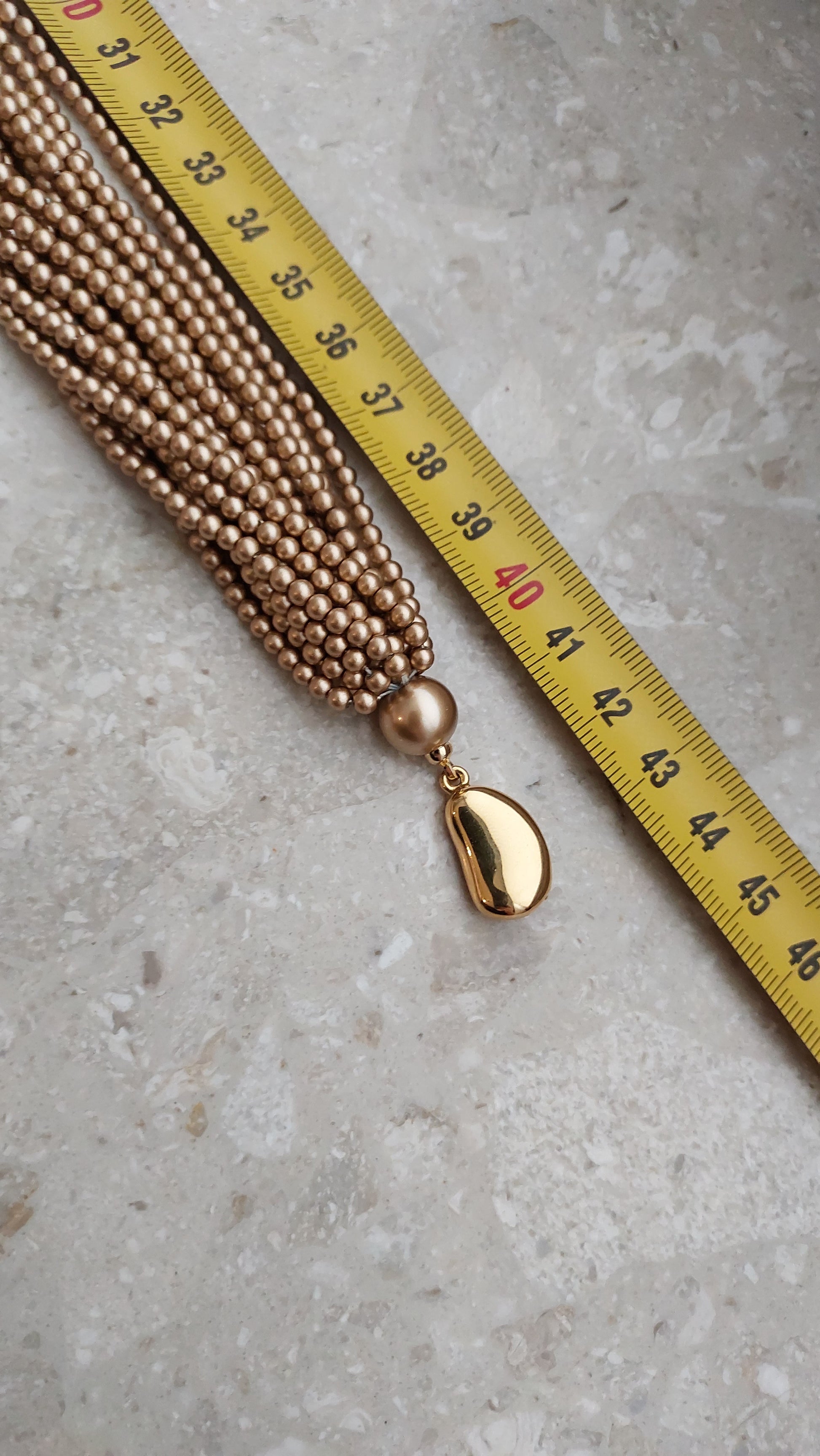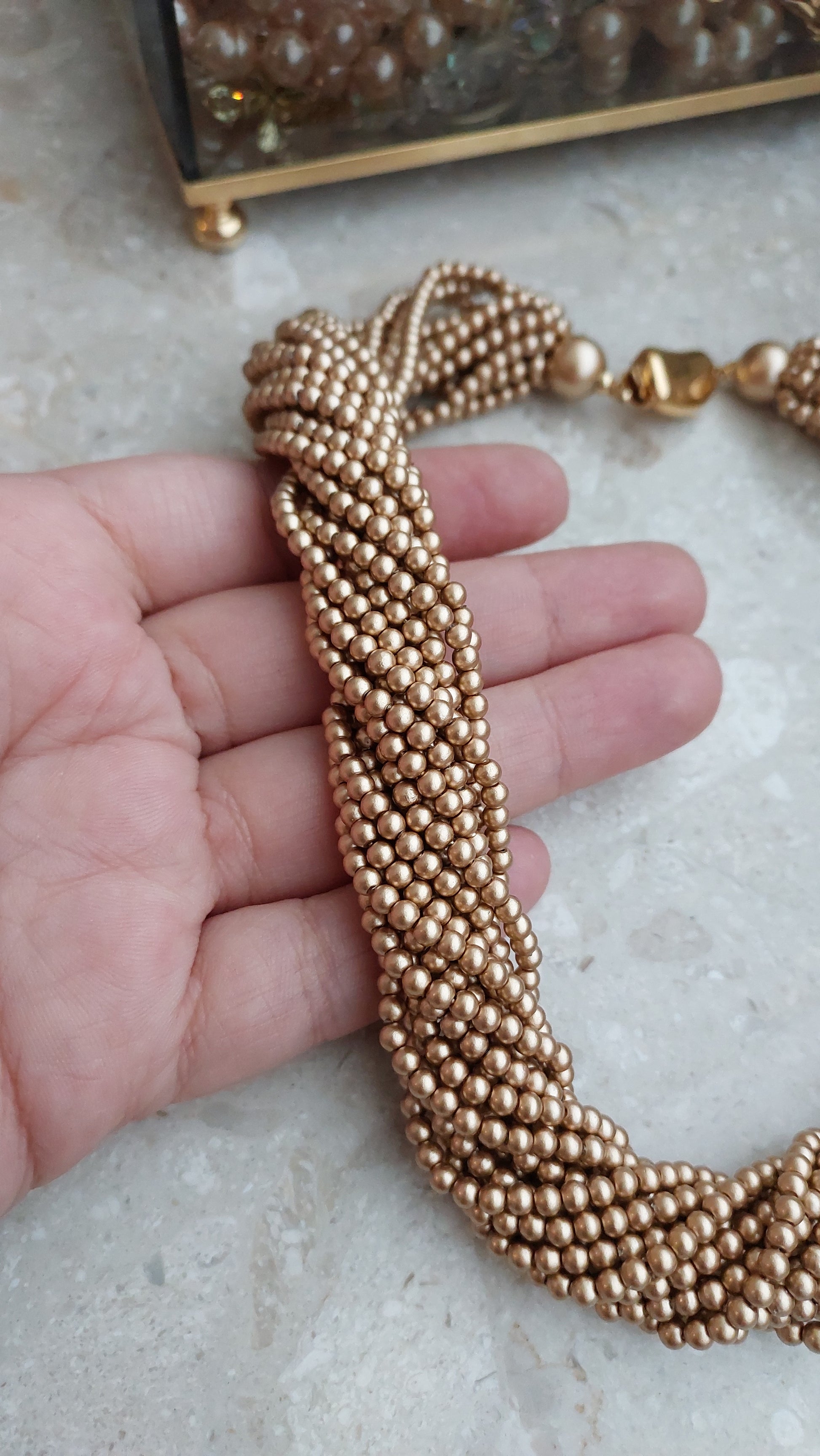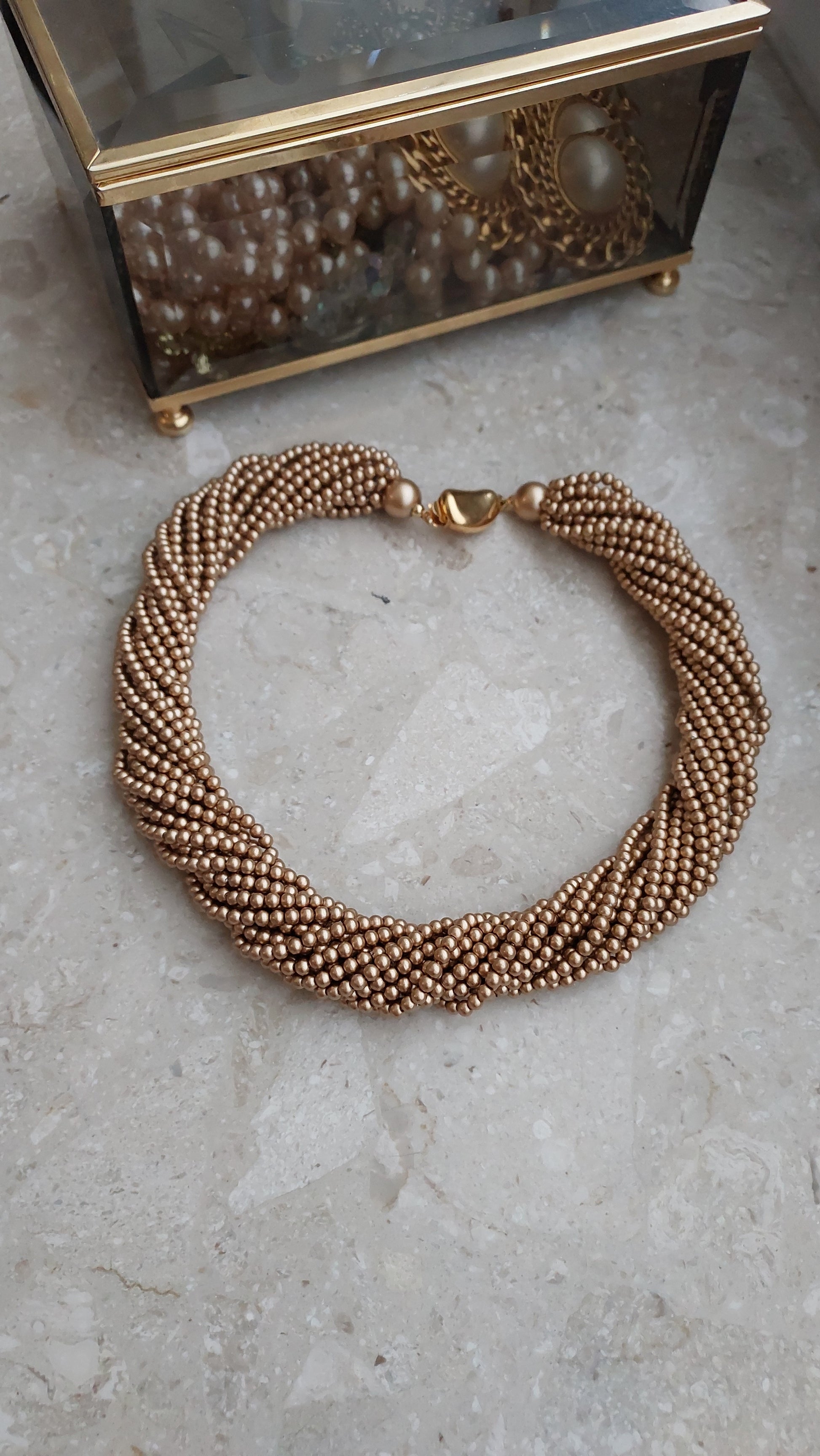 Naszyjnik Carolee złożony z wielu drobnych koralików w ciepłym, złocisto-brązowym odcieniu, splecionych w gęsty, wielorzędowy splot o miękkim blasku perełek.