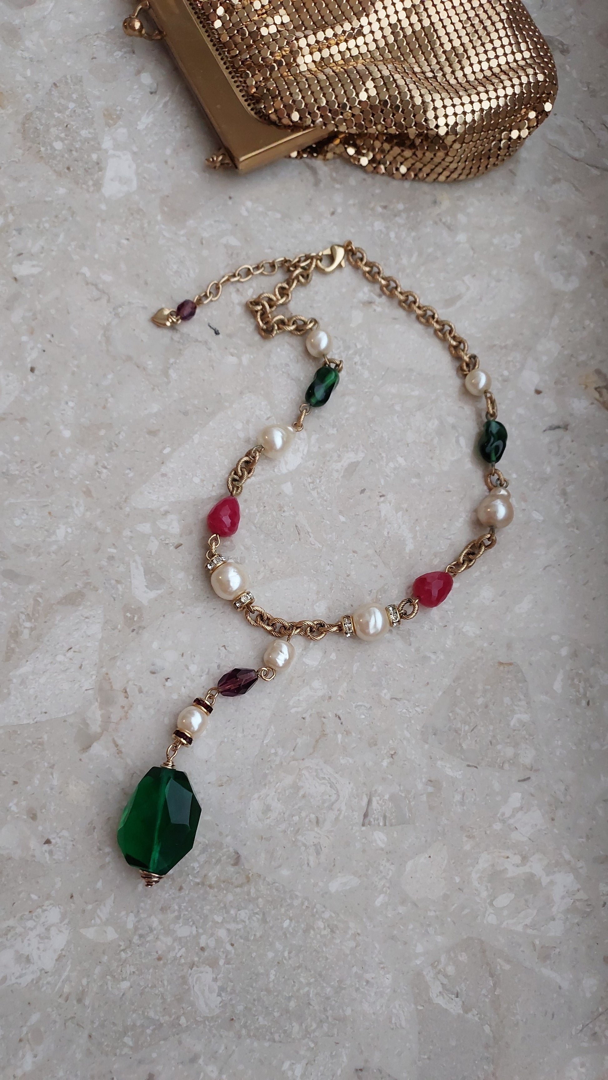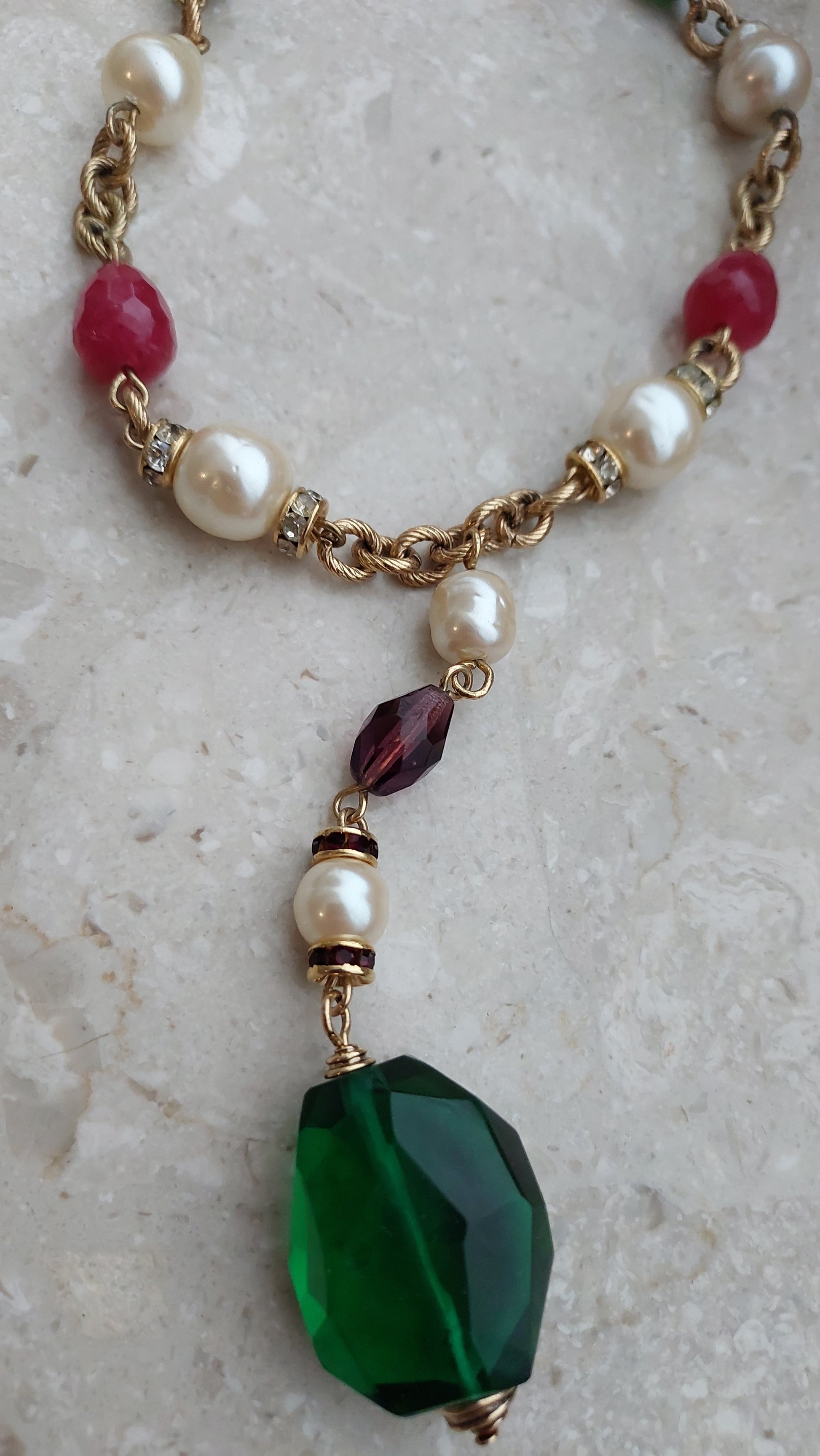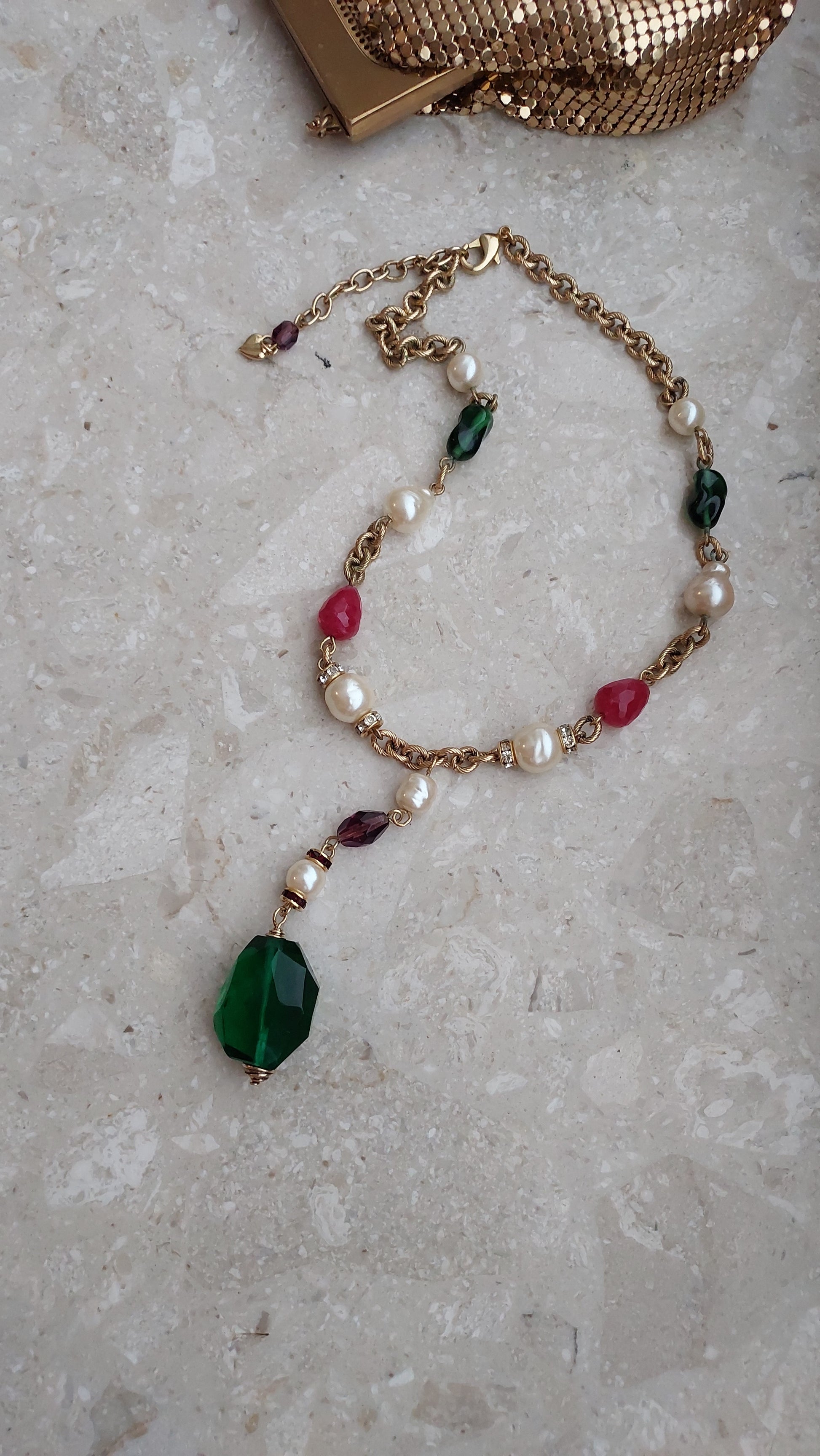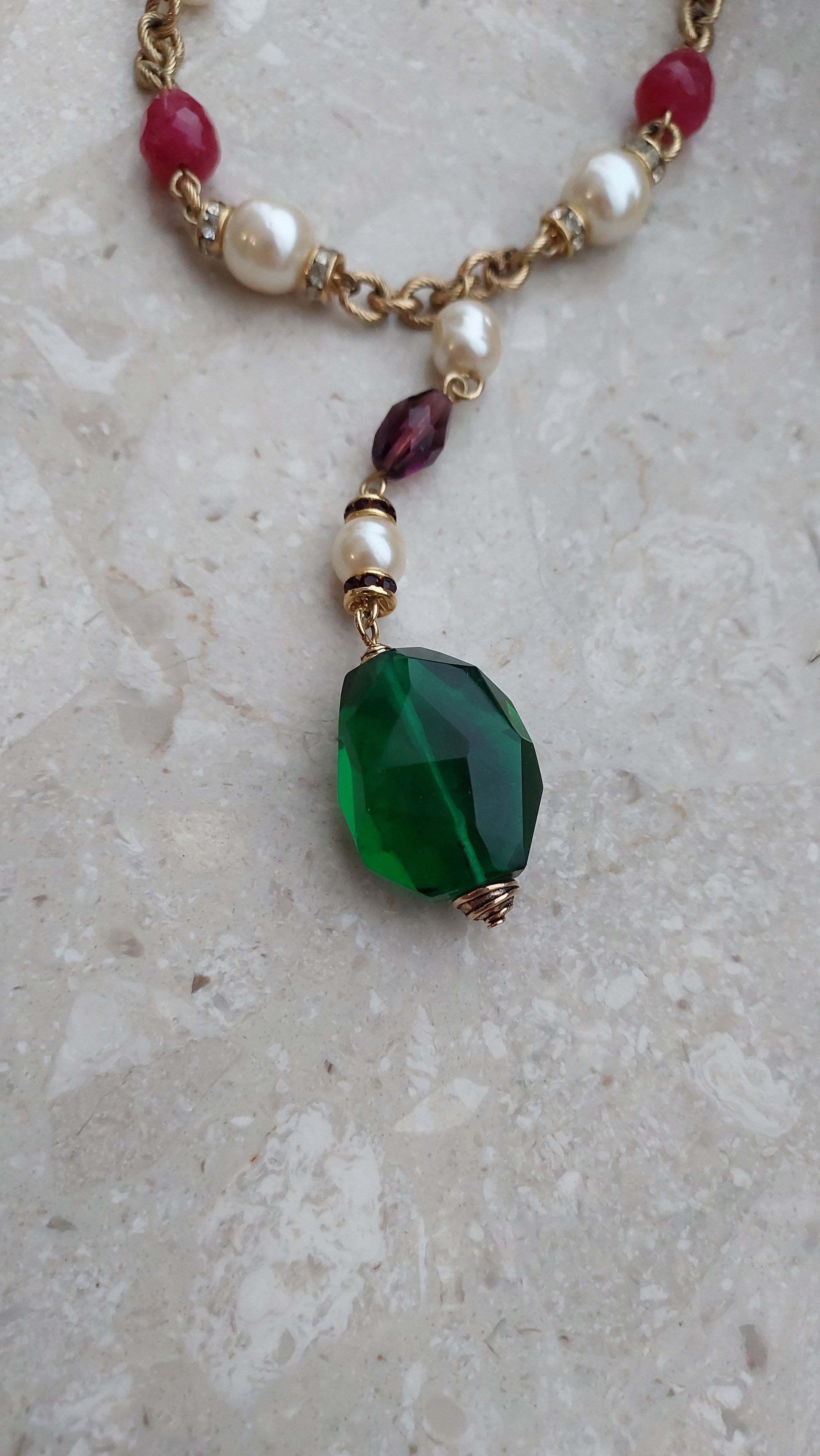 Łańcuszek zdobią naprzemiennie większe perły, elementy w szmaragdowo-zielonym, rubinowo-czerwonym i ametystowo-fioletowym odcieniu, a także drobne wstawki z cyrkoniami. Centralnym akcentem jest zawieszka z dużym, fasetowanym zielonym kryształem, który efektownie mieni się w świetle i nadaje naszyjnikowi wyrazistości.