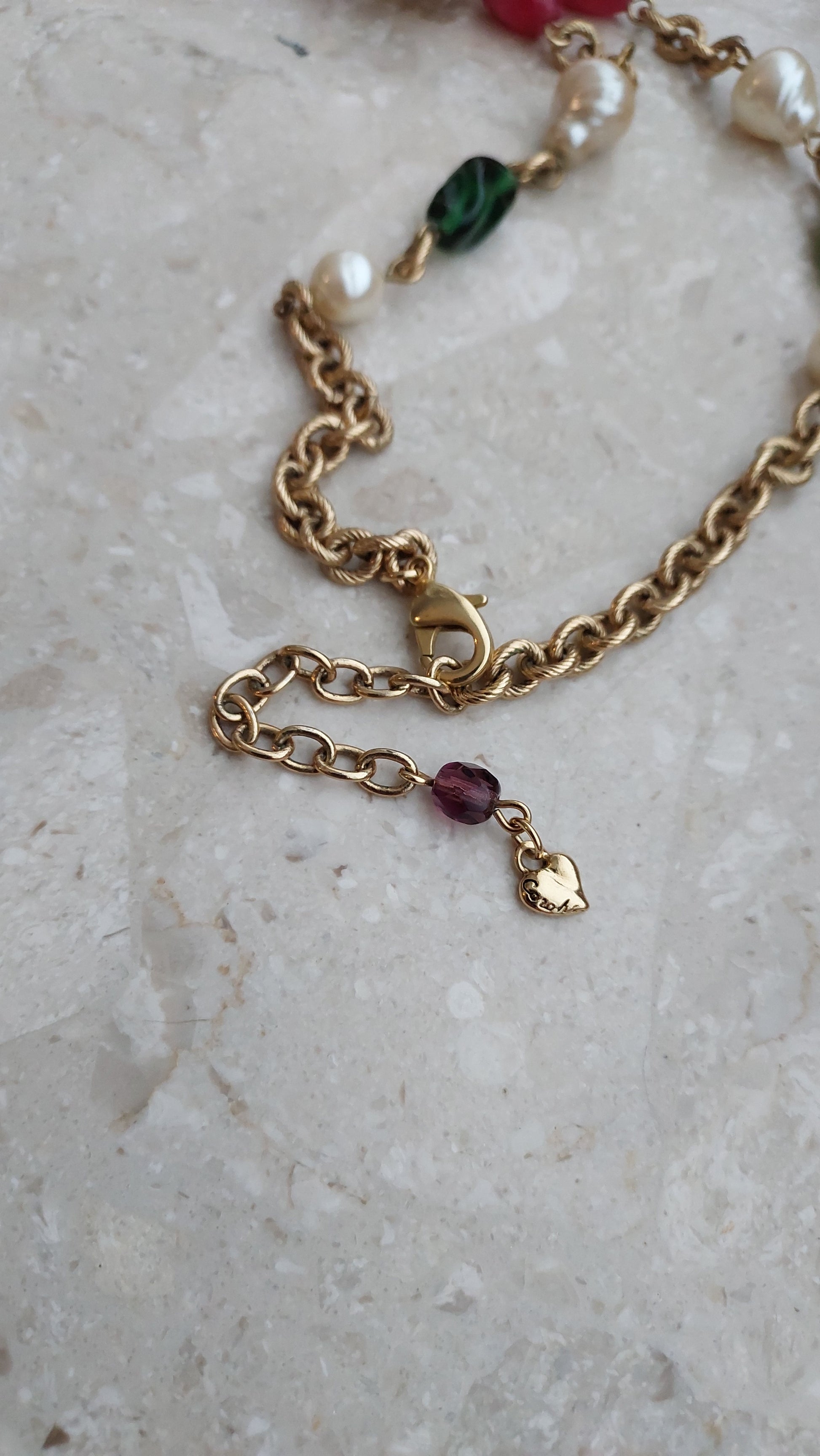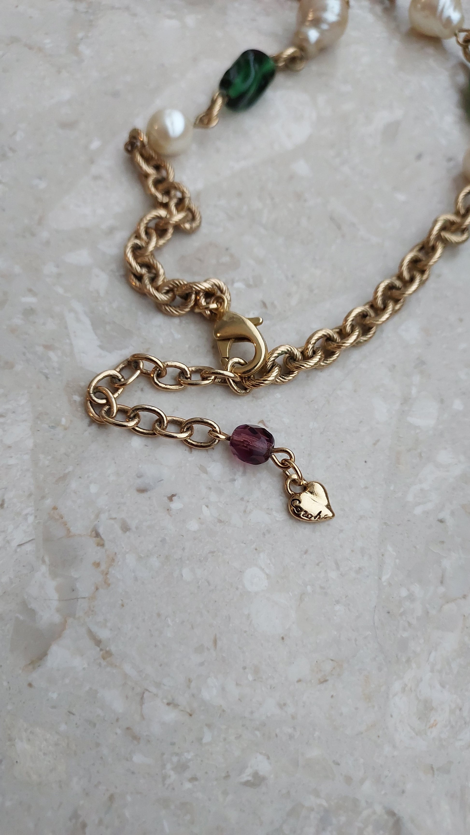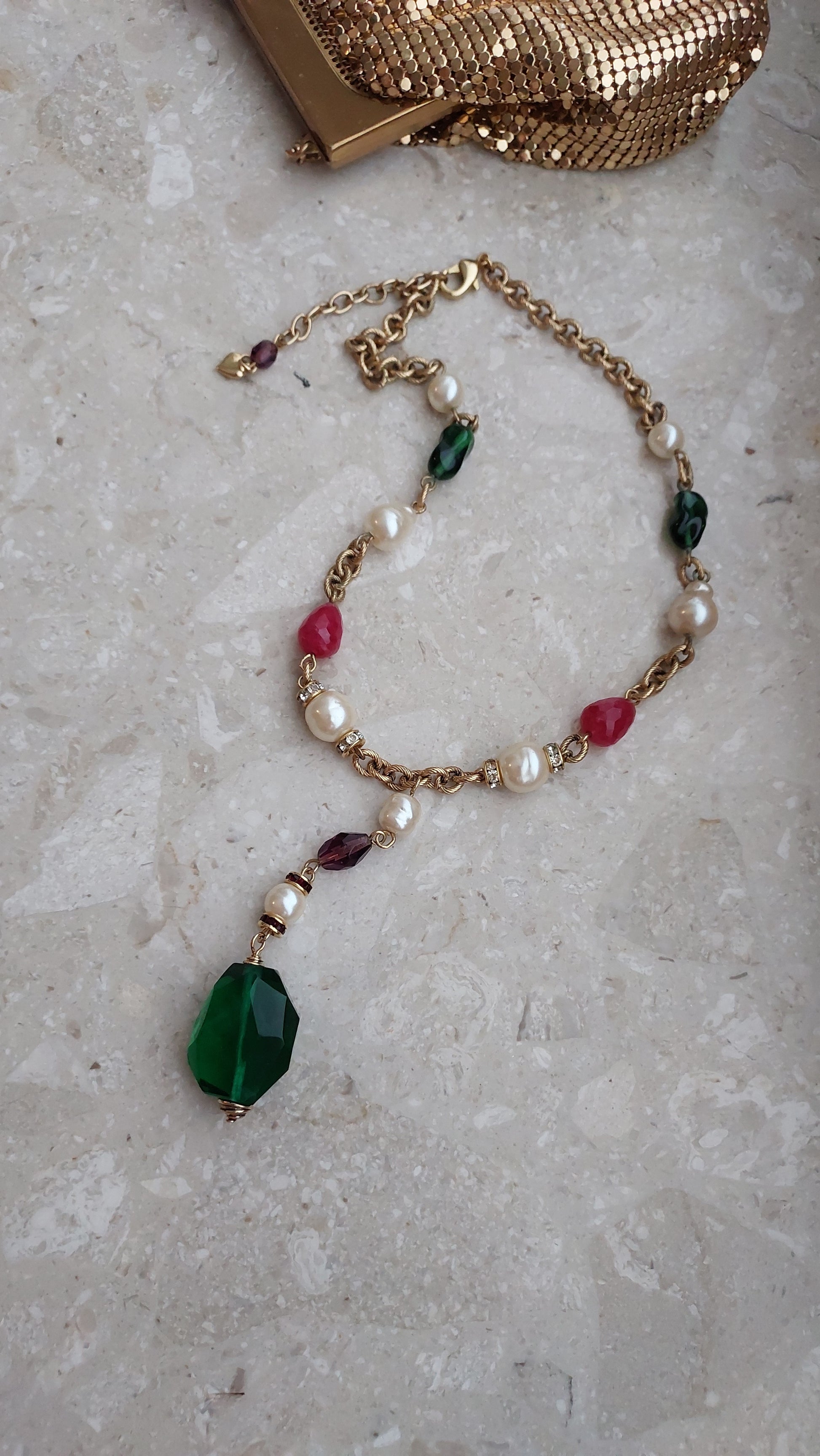 Łańcuszek zdobią naprzemiennie większe perły, elementy w szmaragdowo-zielonym, rubinowo-czerwonym i ametystowo-fioletowym odcieniu, a także drobne wstawki z cyrkoniami. Centralnym akcentem jest zawieszka z dużym, fasetowanym zielonym kryształem, który efektownie mieni się w świetle i nadaje naszyjnikowi wyrazistości.