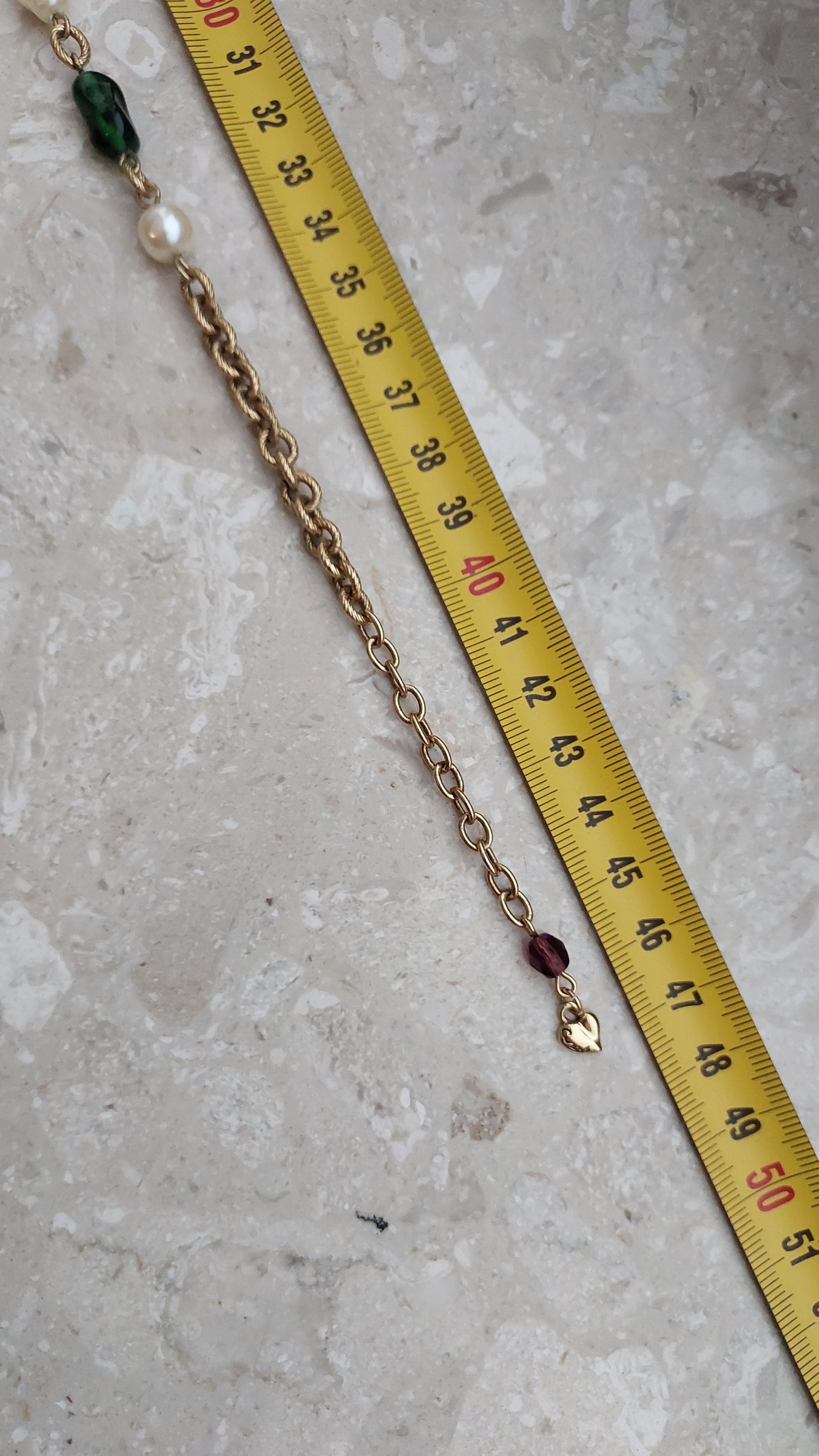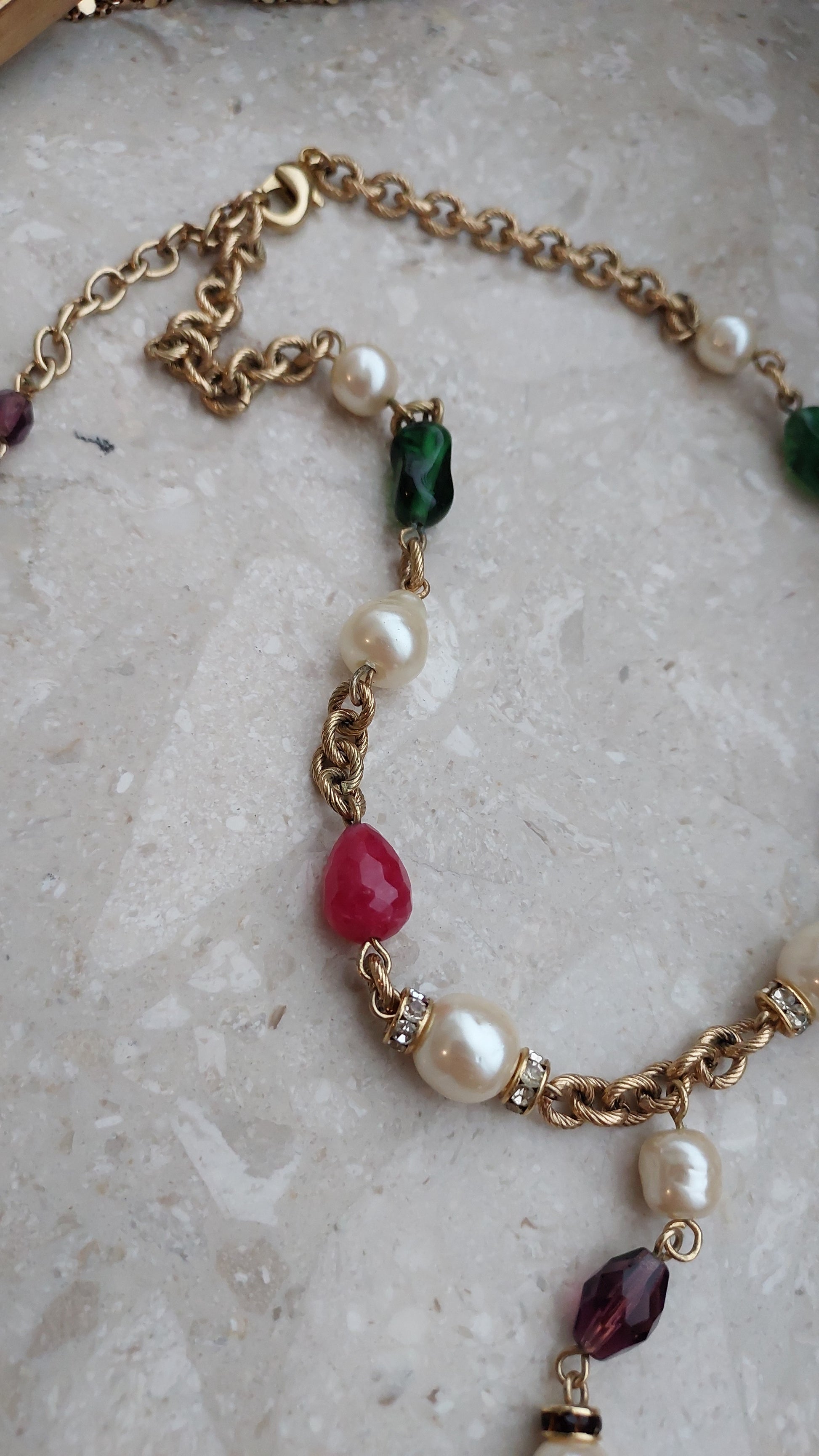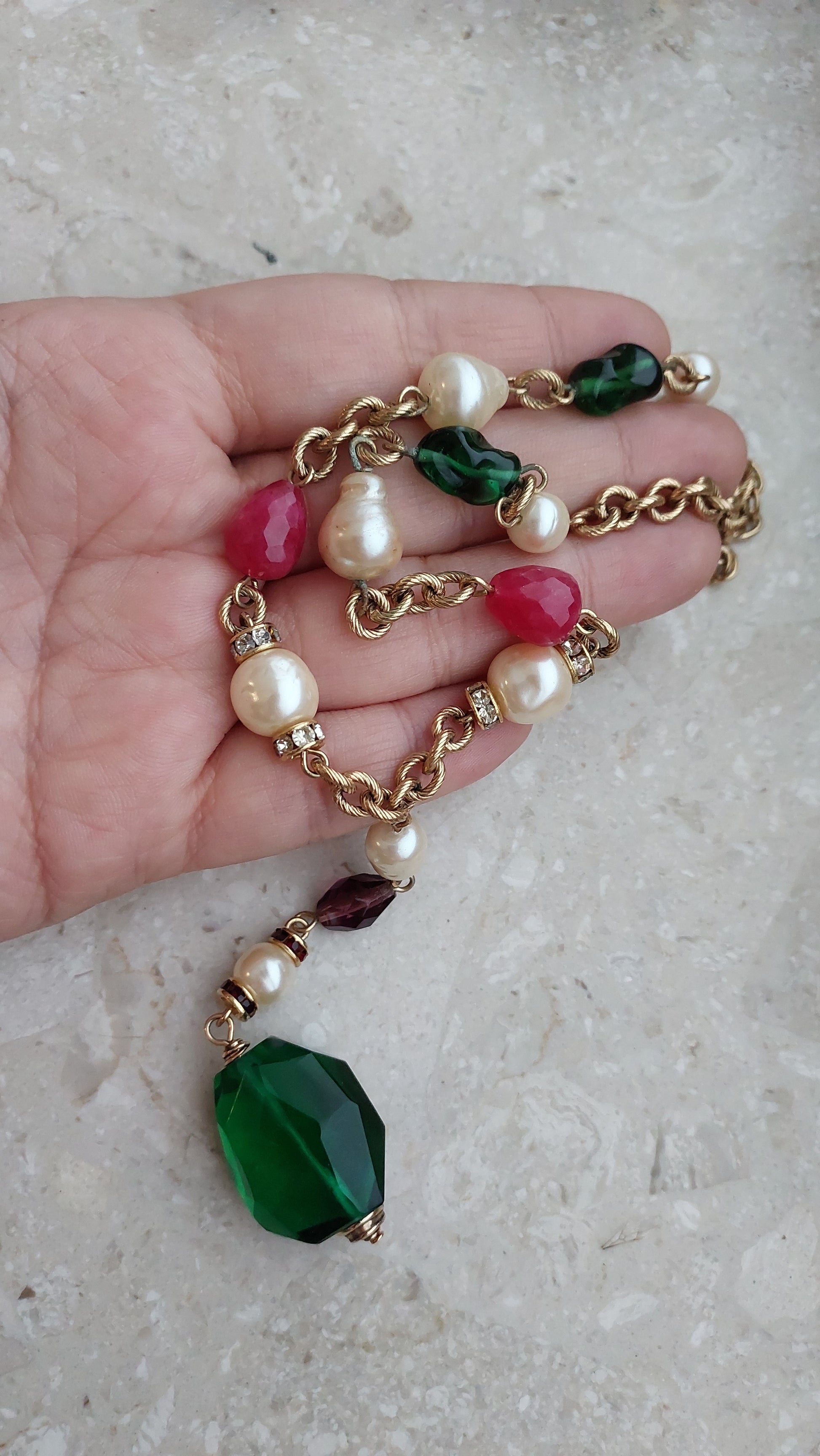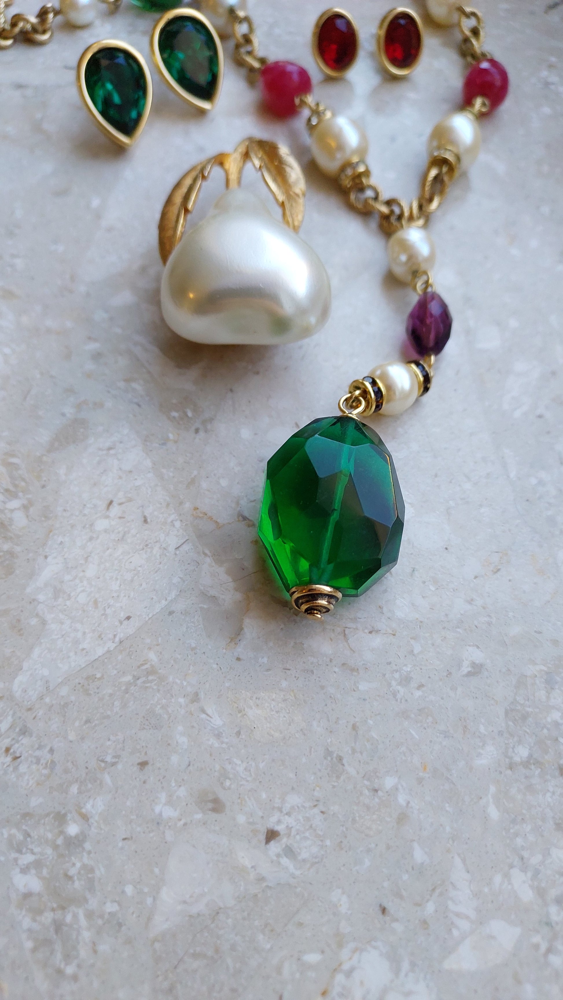 Łańcuszek zdobią naprzemiennie większe perły, elementy w szmaragdowo-zielonym, rubinowo-czerwonym i ametystowo-fioletowym odcieniu, a także drobne wstawki z cyrkoniami. Centralnym akcentem jest zawieszka z dużym, fasetowanym zielonym kryształem, który efektownie mieni się w świetle i nadaje naszyjnikowi wyrazistości.