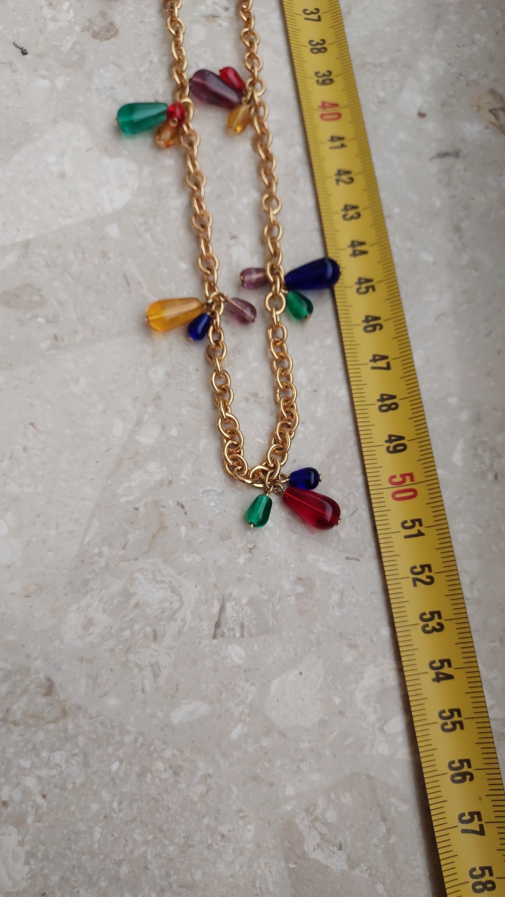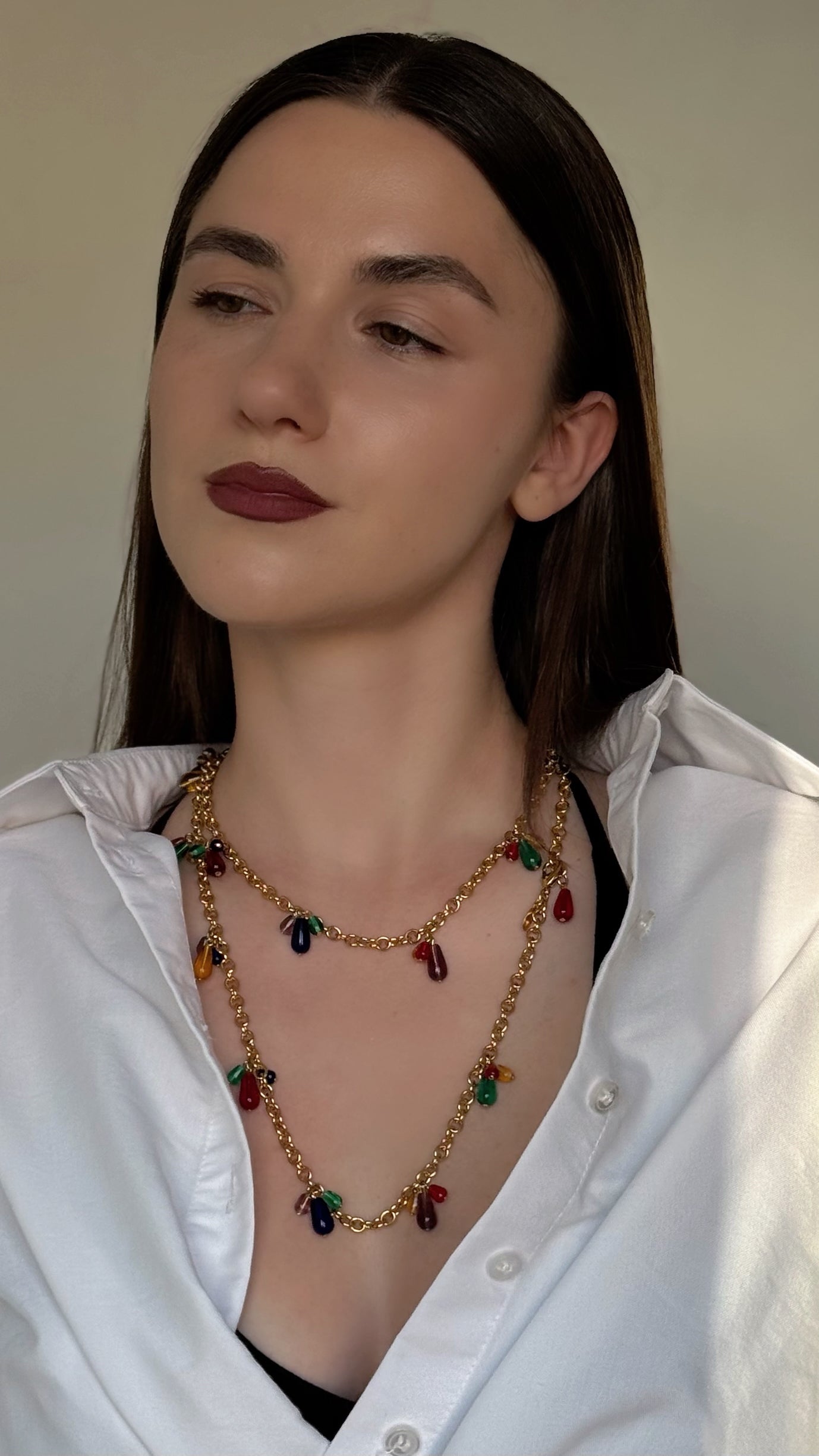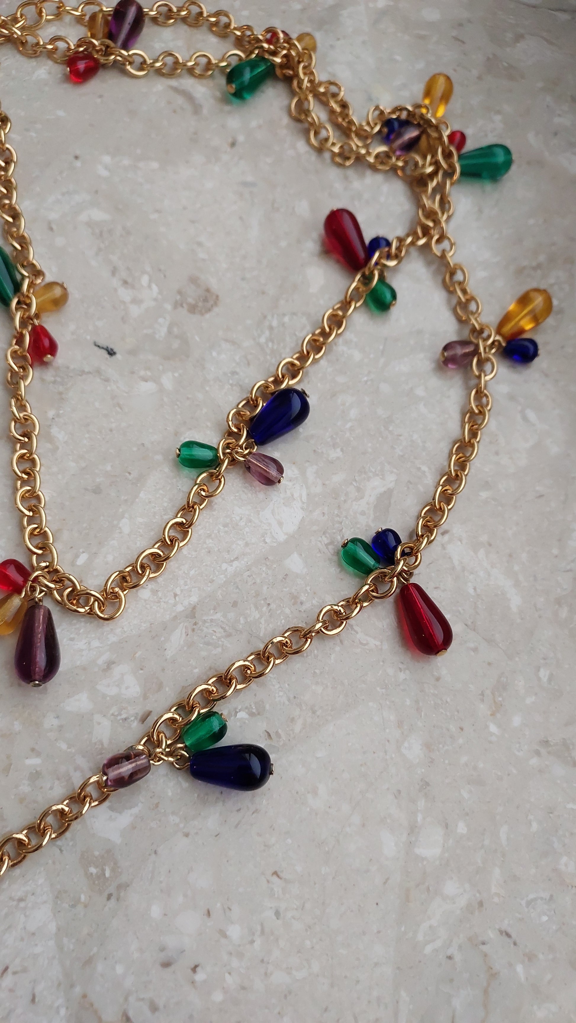 Złocisty łańcuszek o średniej grubości równomiernie ozdobiony jest drobnymi, kroplowatymi zawieszkami w odcieniach zieleni, rubinowej czerwieni, bursztynu, fioletu i ciemnego granatu. Dzięki przemyślanej długości i zapięciu, naszyjnik można nosić w jednym lub dwóch rzędach, a także łączyć z innymi — tworząc efektowne, warstwowe kompozycje.