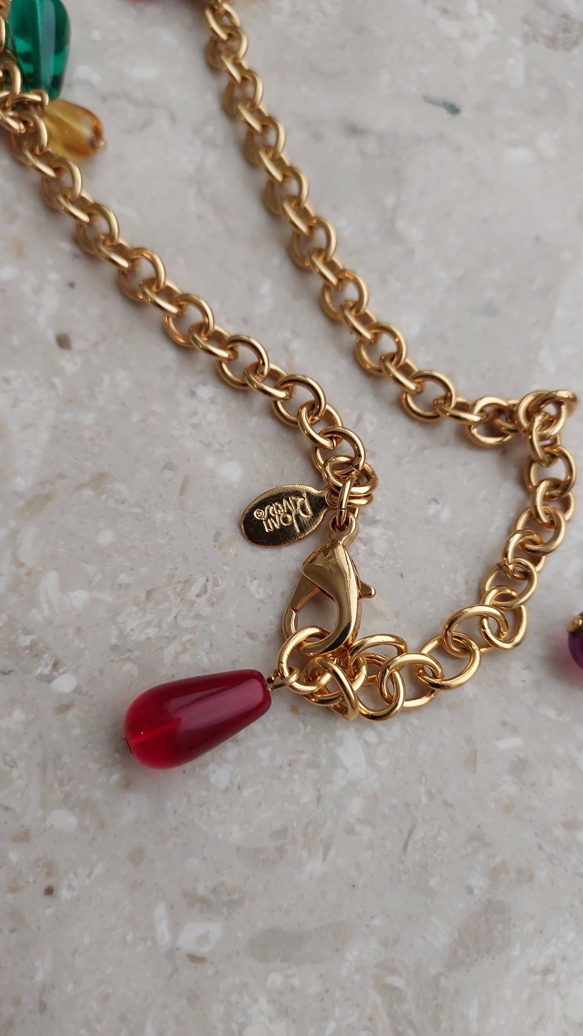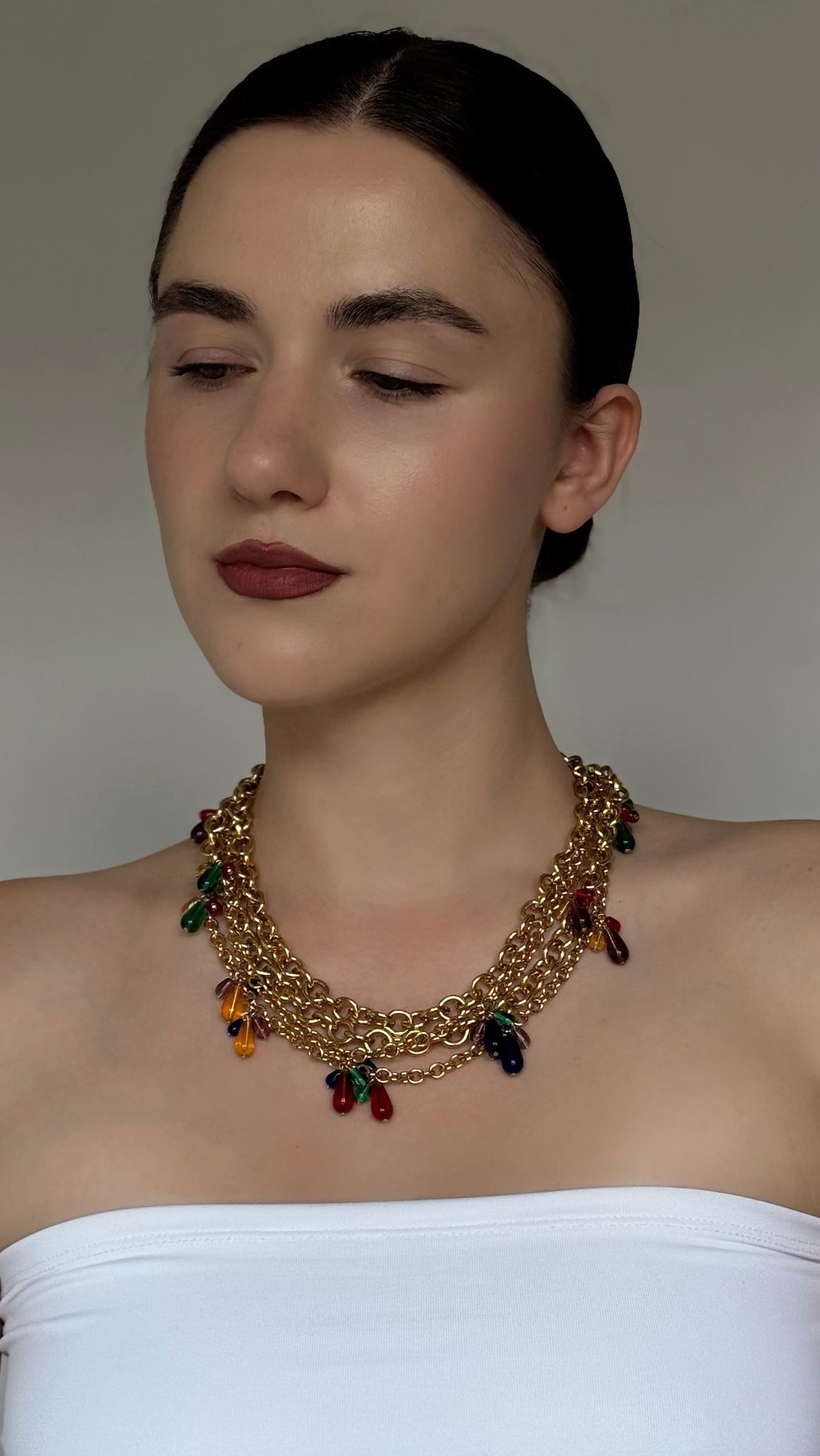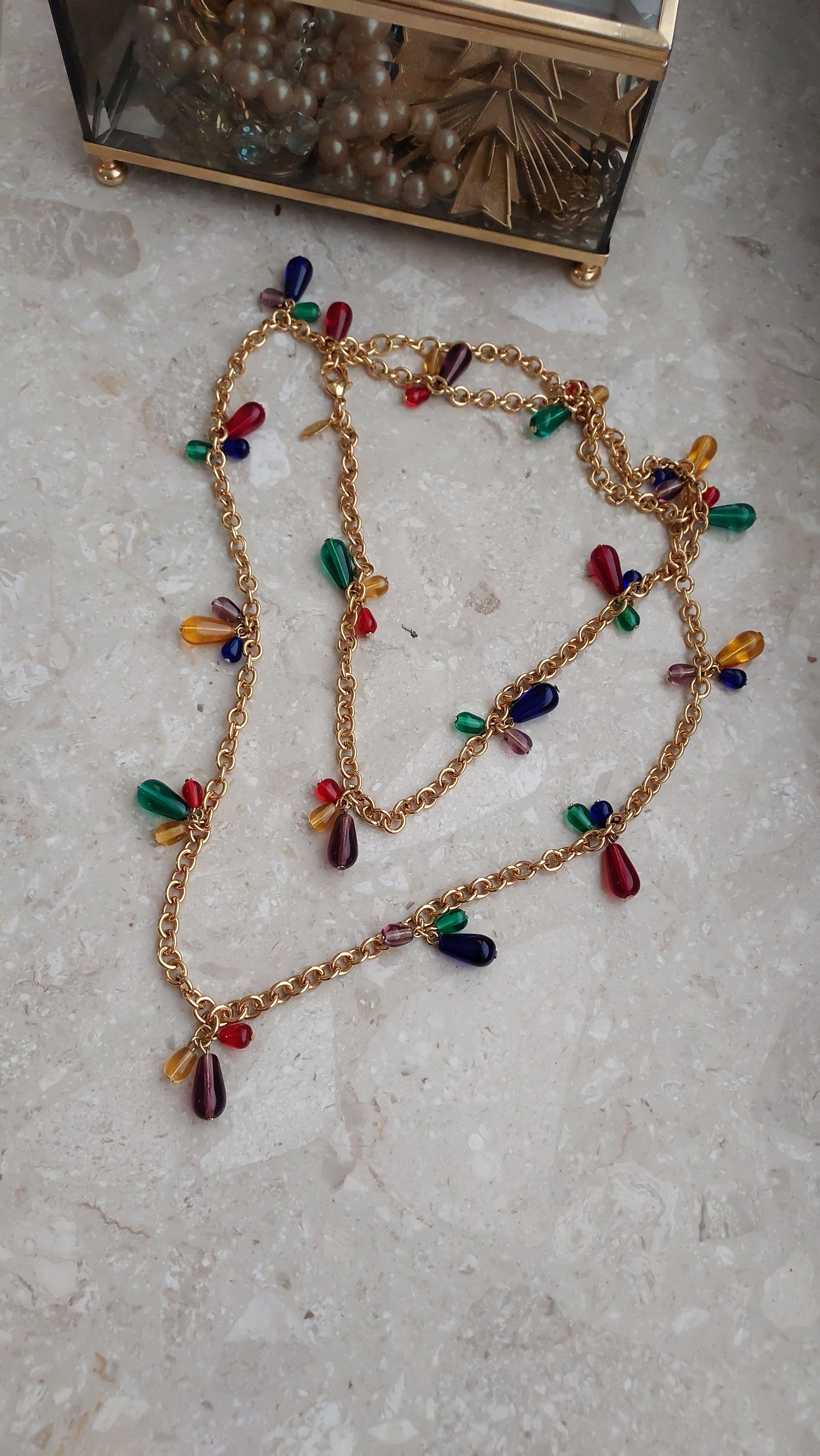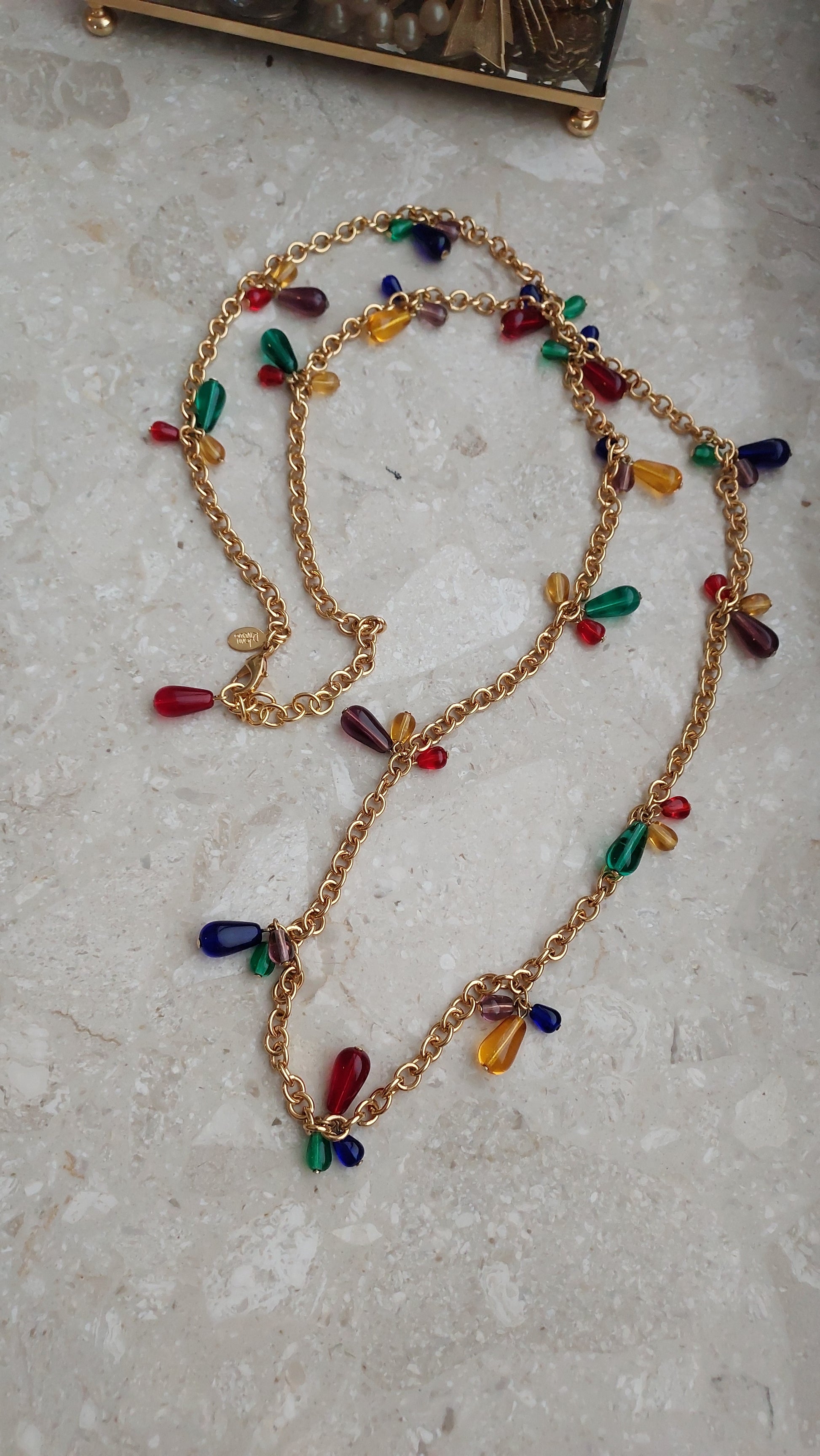 Złocisty łańcuszek o średniej grubości równomiernie ozdobiony jest drobnymi, kroplowatymi zawieszkami w odcieniach zieleni, rubinowej czerwieni, bursztynu, fioletu i ciemnego granatu. Dzięki przemyślanej długości i zapięciu, naszyjnik można nosić w jednym lub dwóch rzędach, a także łączyć z innymi — tworząc efektowne, warstwowe kompozycje.