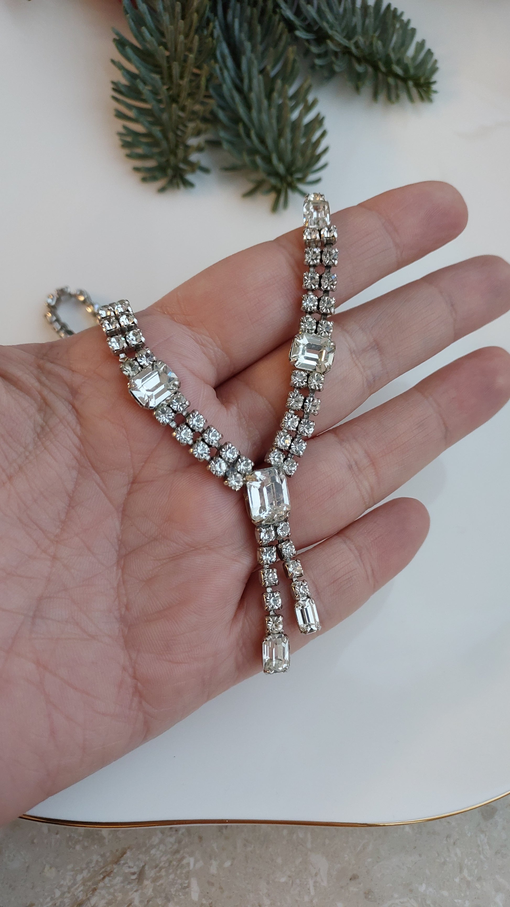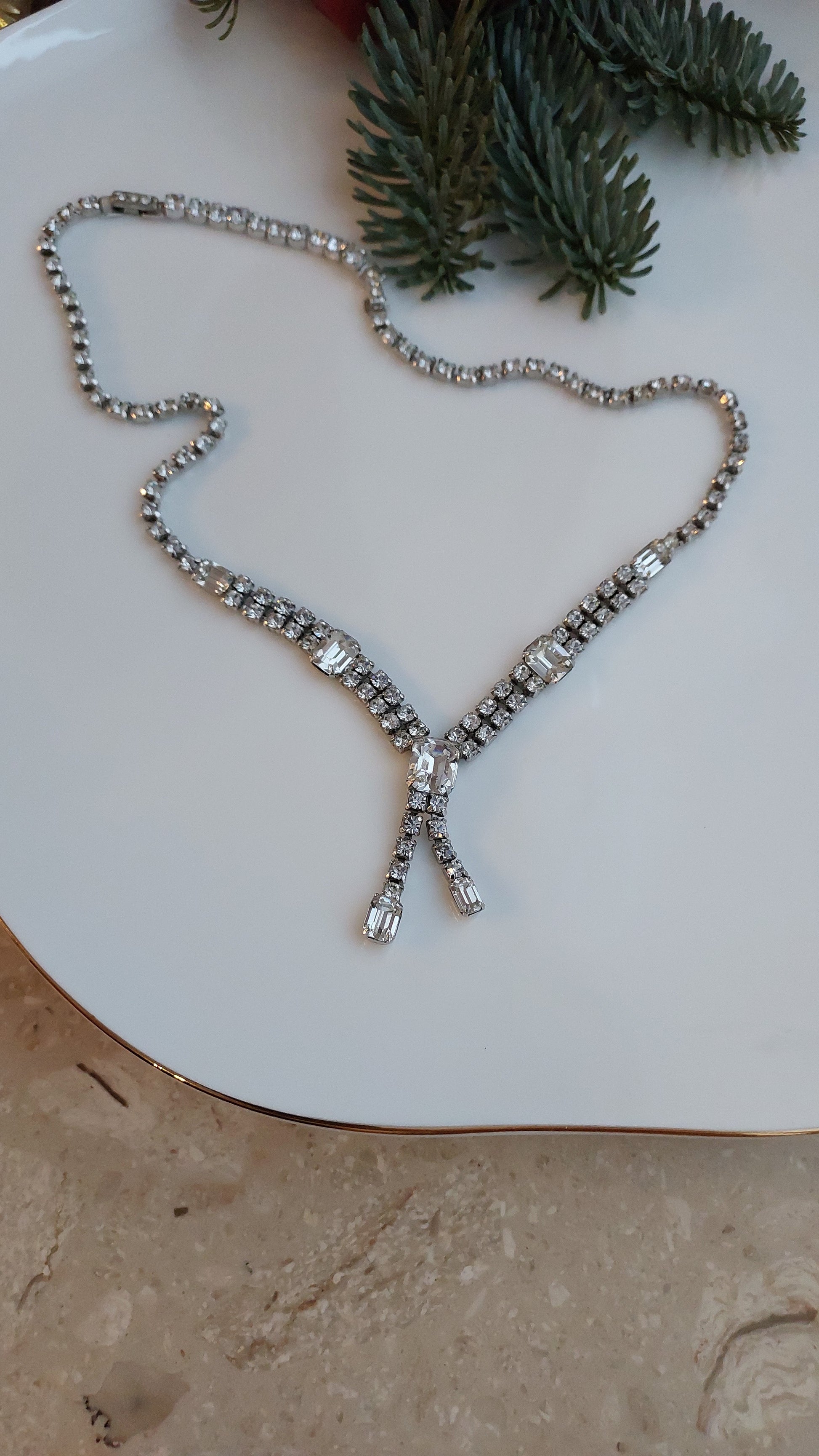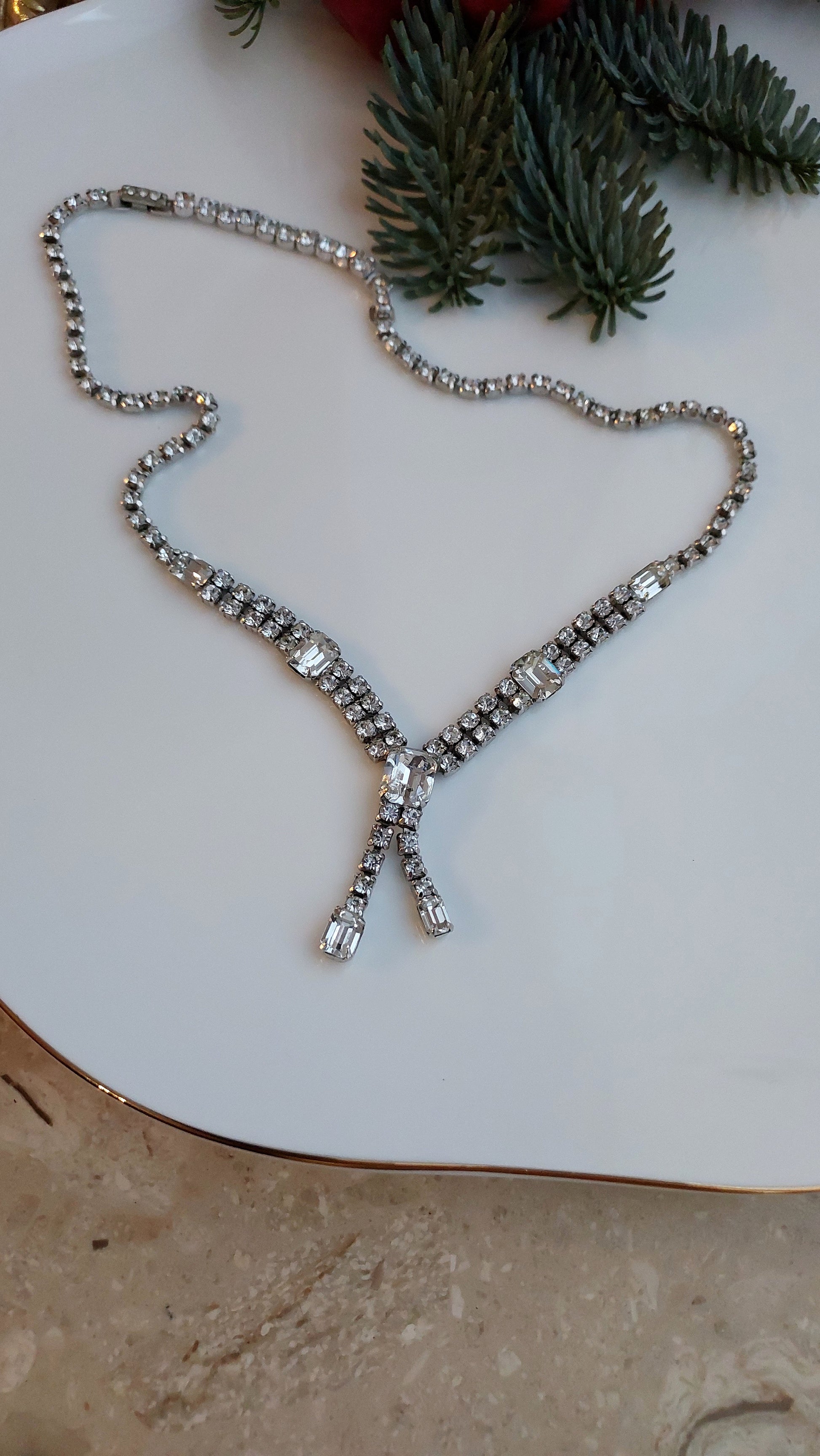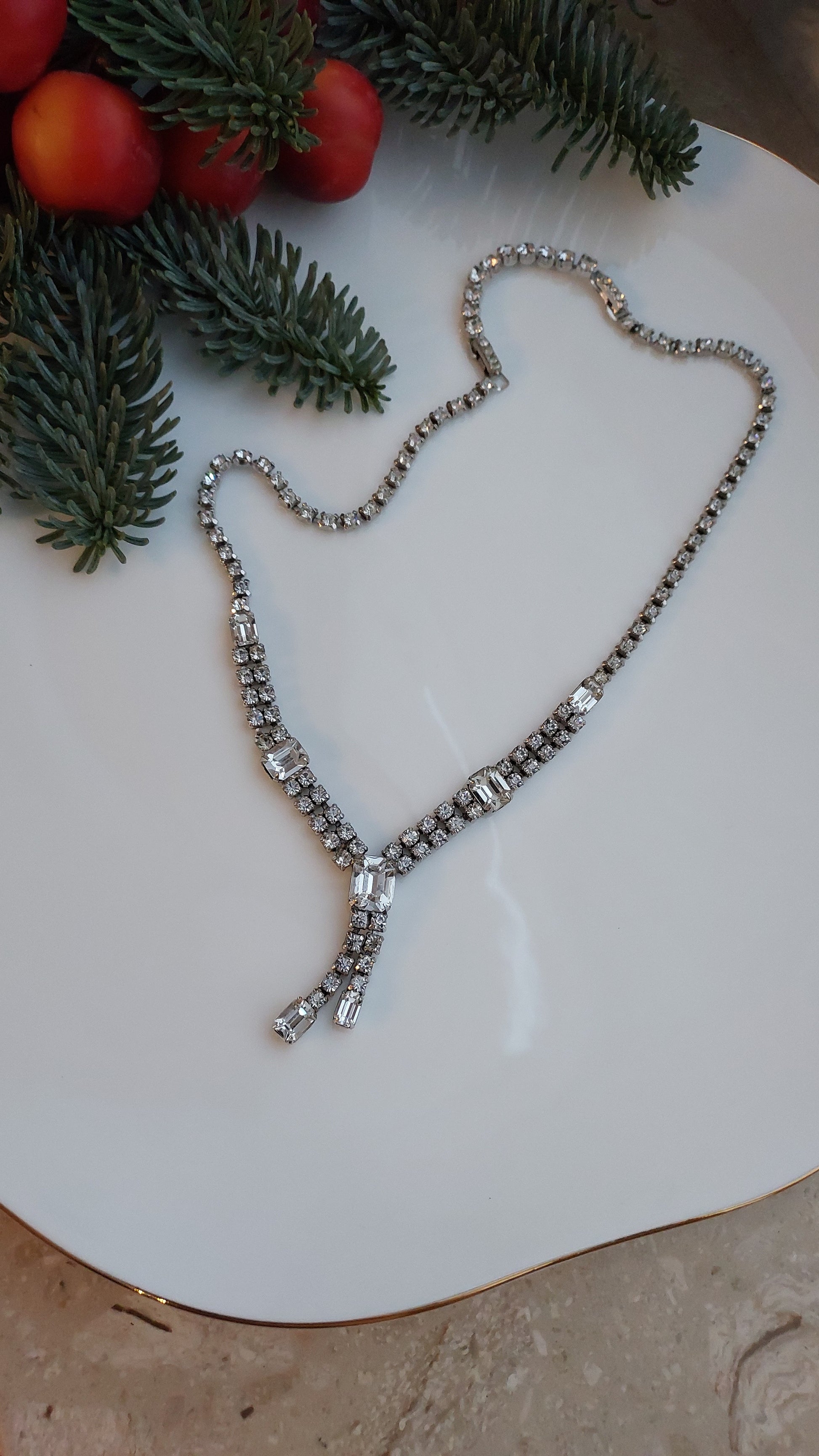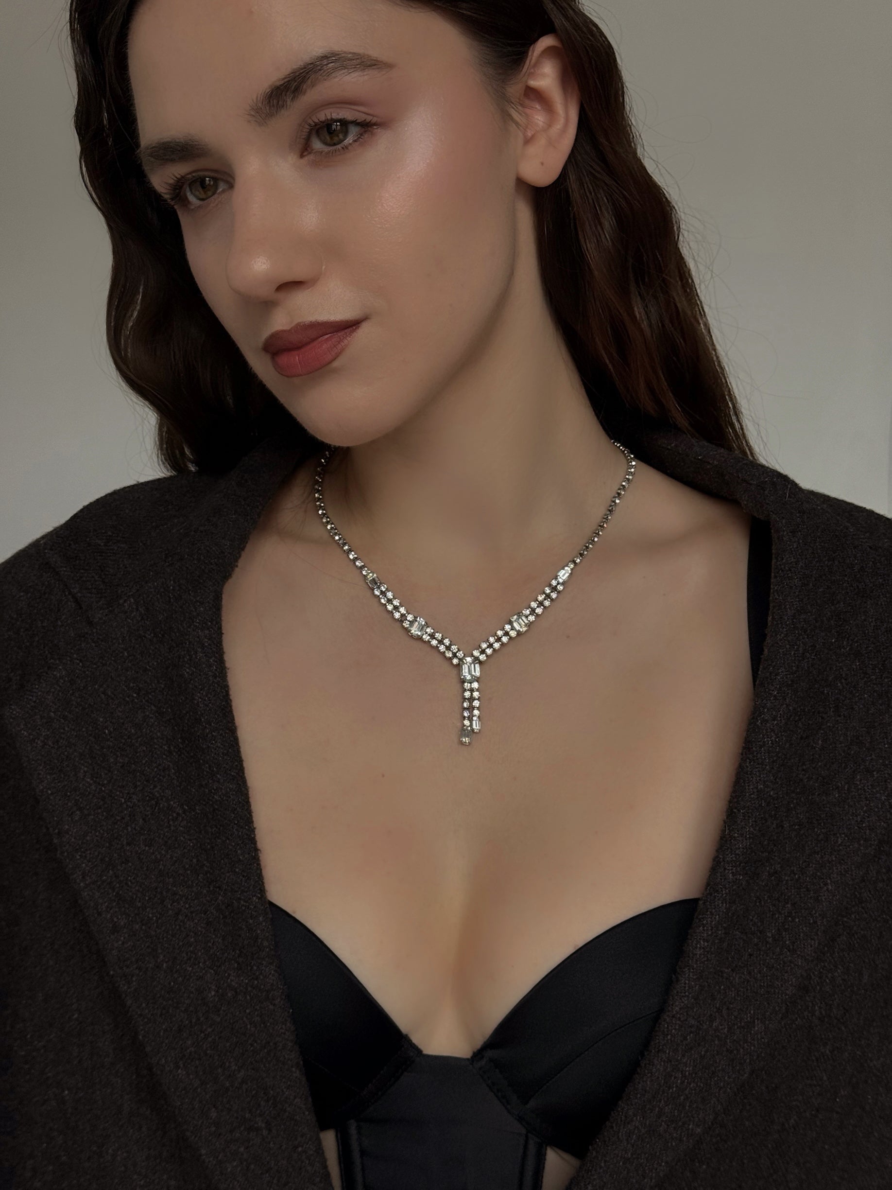 Naszyjnik Kramer o kompozycji w kształcie litery Y, utrzymany w eleganckiej, wieczorowej stylistyce. Wykonany z przezroczystych kryształów o szlifie okrągłym i bagietowym, ułożonych w precyzyjny, symetryczny rytm. Centralna kaskada z wydłużonych elementów bagietowych subtelnie wydłuża linię dekoltu, tworząc efekt wyrafinowanego blasku i optycznej smukłości.