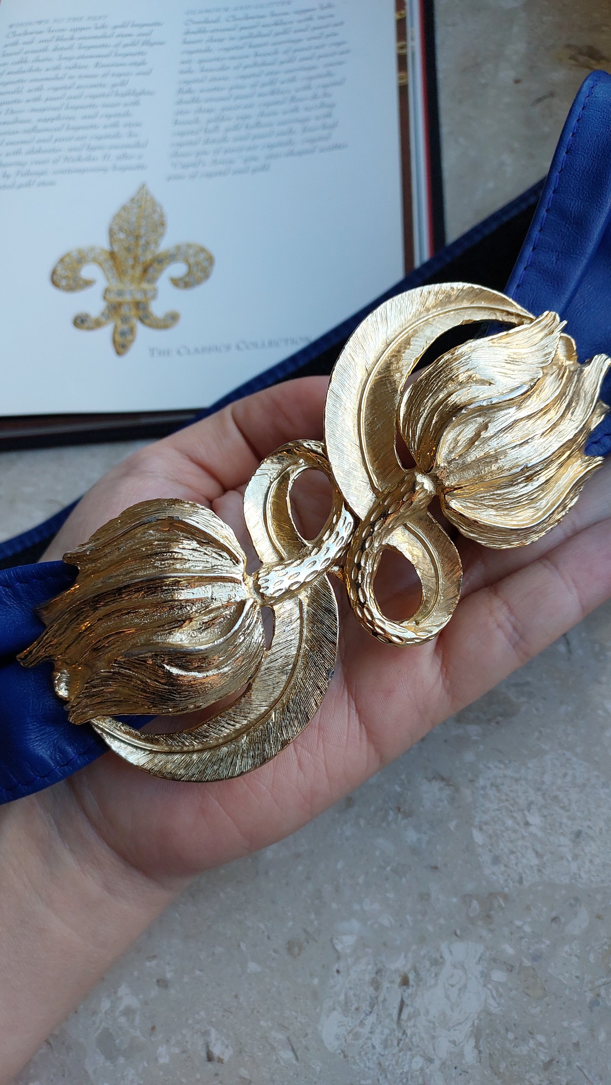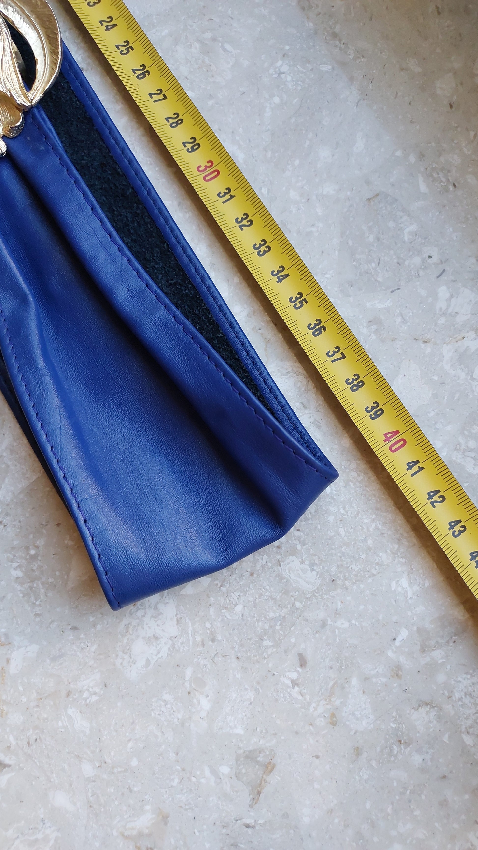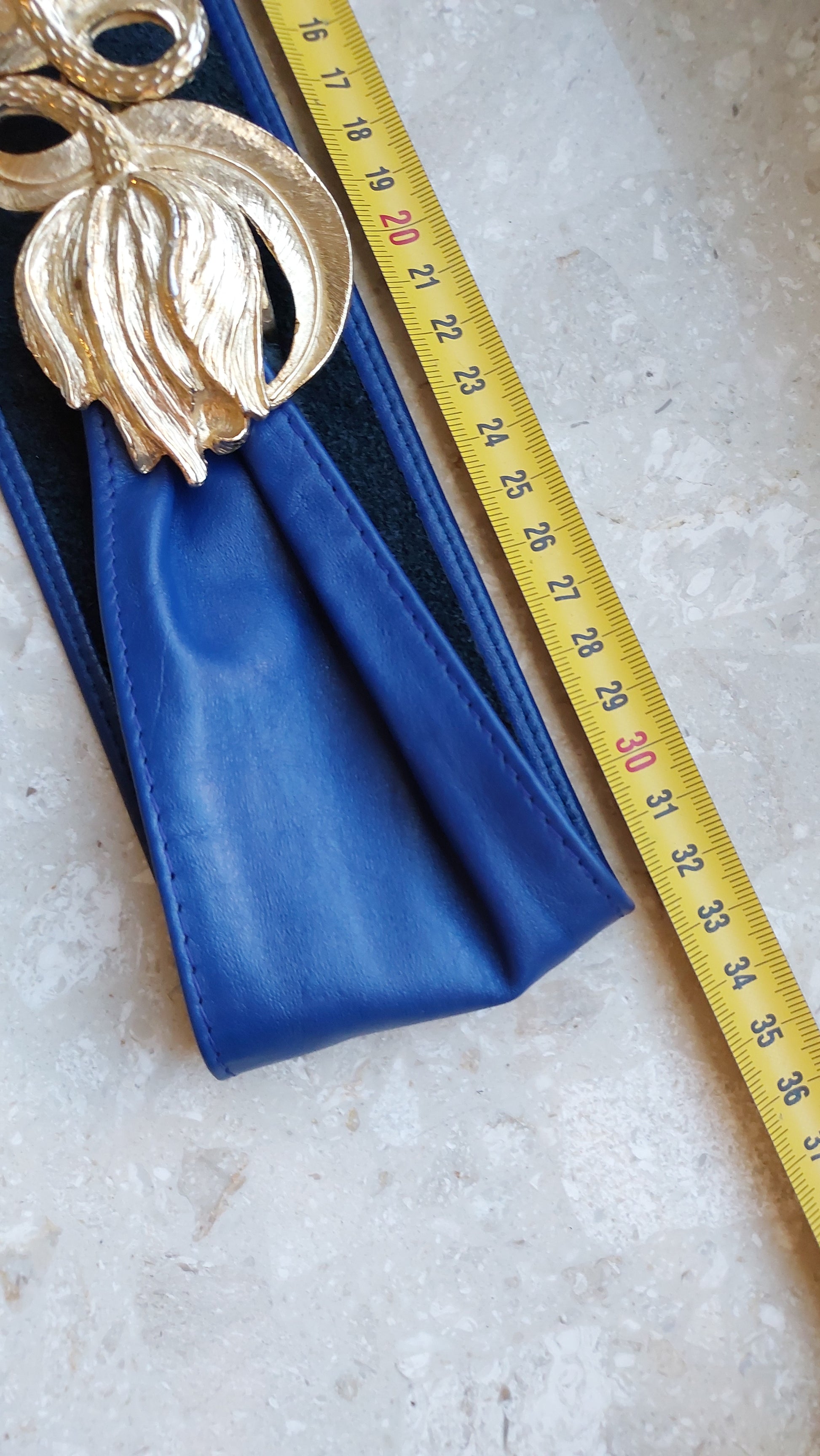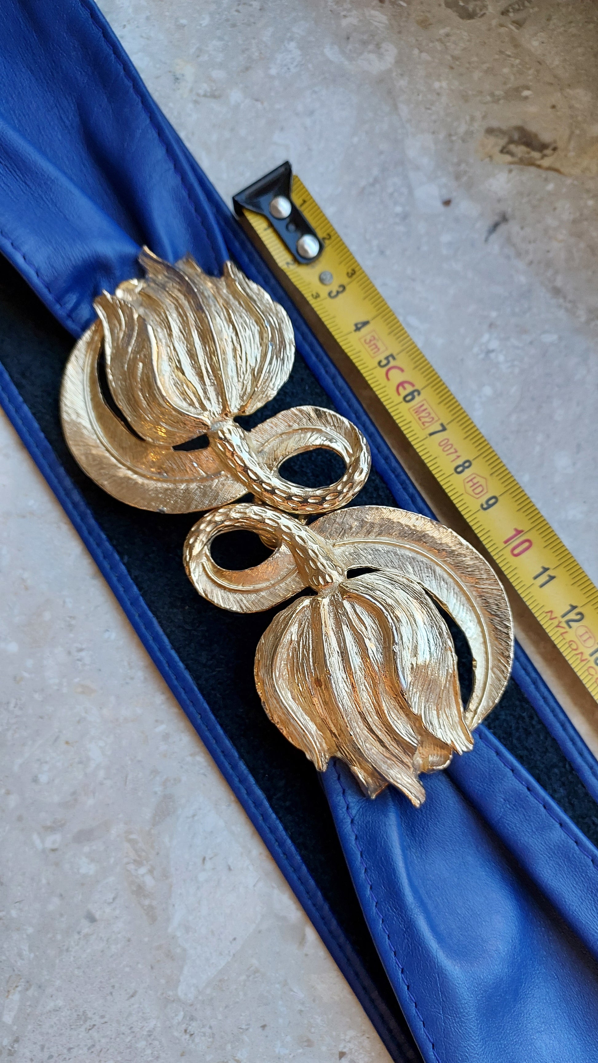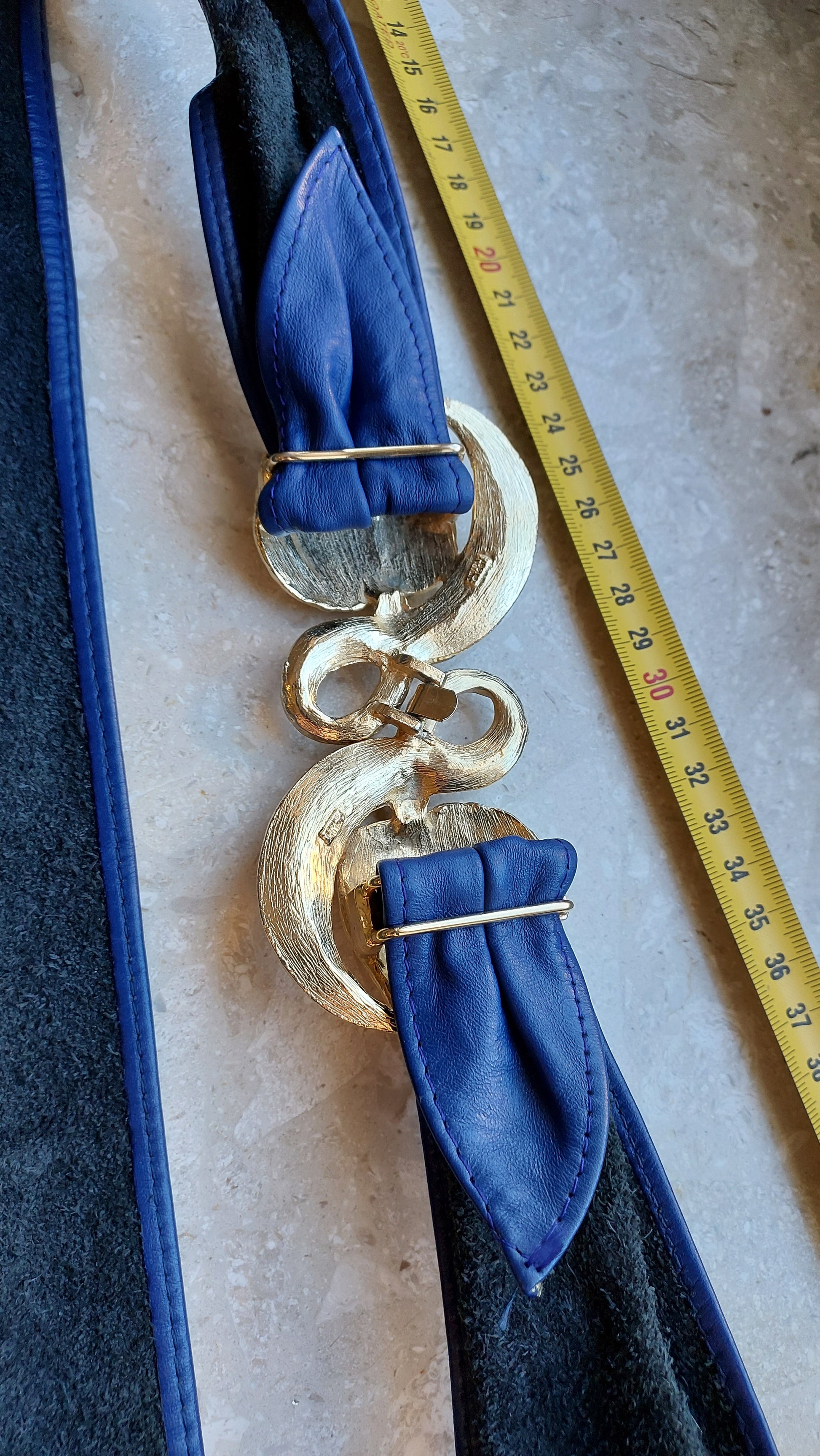 Pasek z dużą ozdobną klamrą w kształcie dwóch kwiatów od Mimi di N 1987. Klamrę można zdjąć, a można też ją nosić z dowolnym paskiem o odpowiedniej szerokości. Na filmie pod koniec pokazuję odwrotną stronę . Długość paska 84cm. Można go zmniejszyć, przesuwając nieco klamry. Stan oceniam na dobry, w kilku miejscach widać ślady użytkowania, mało widoczne