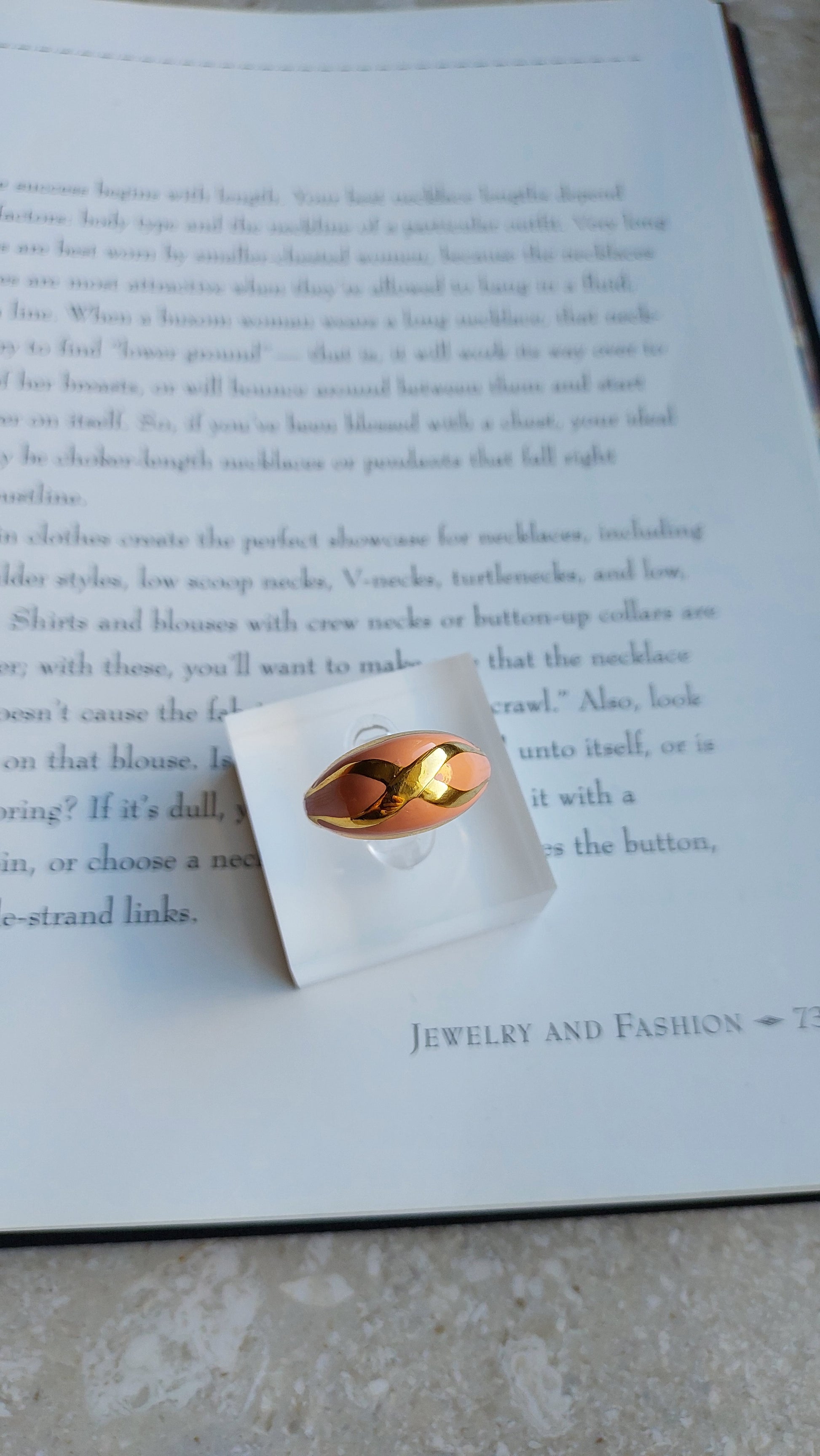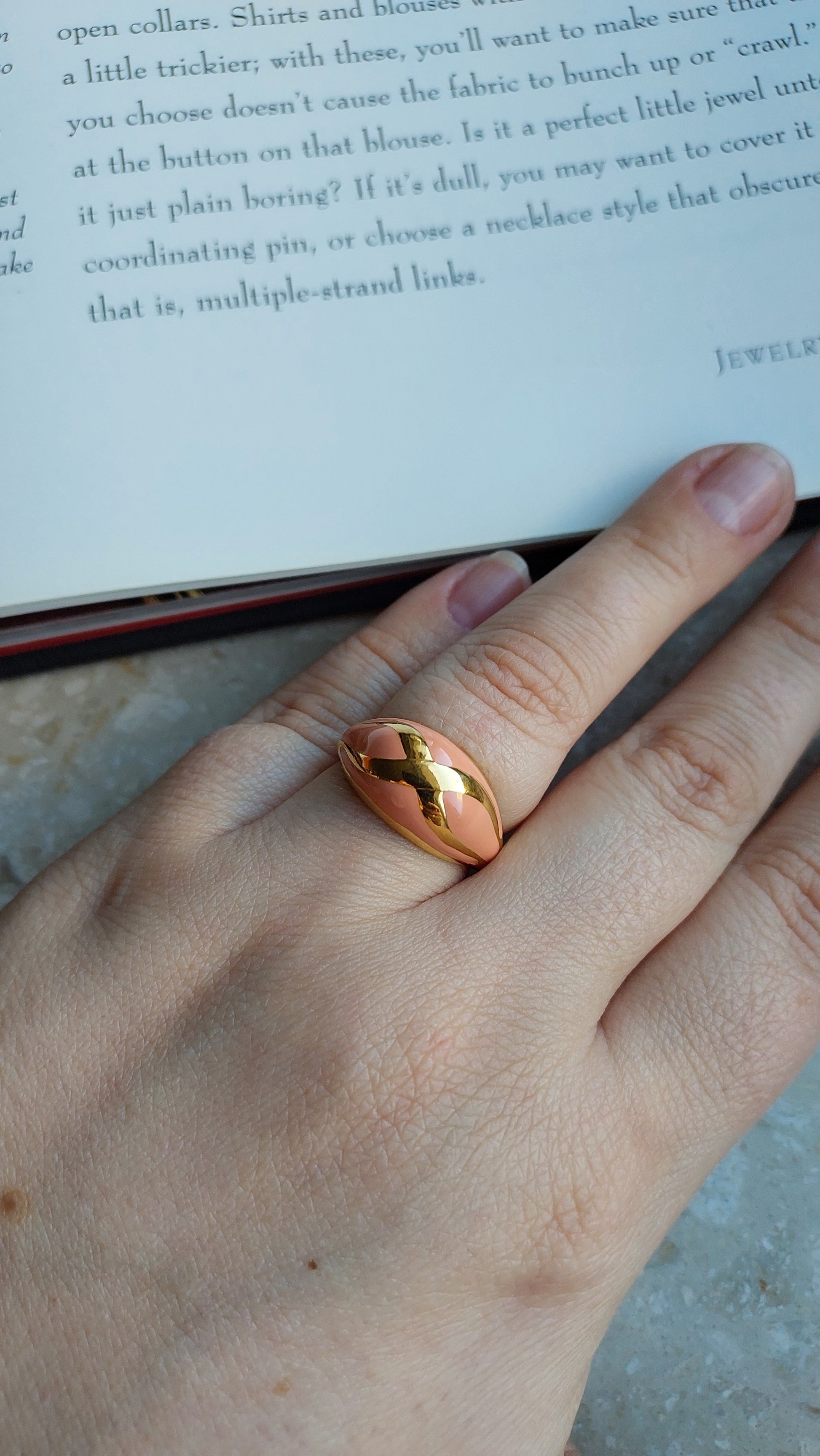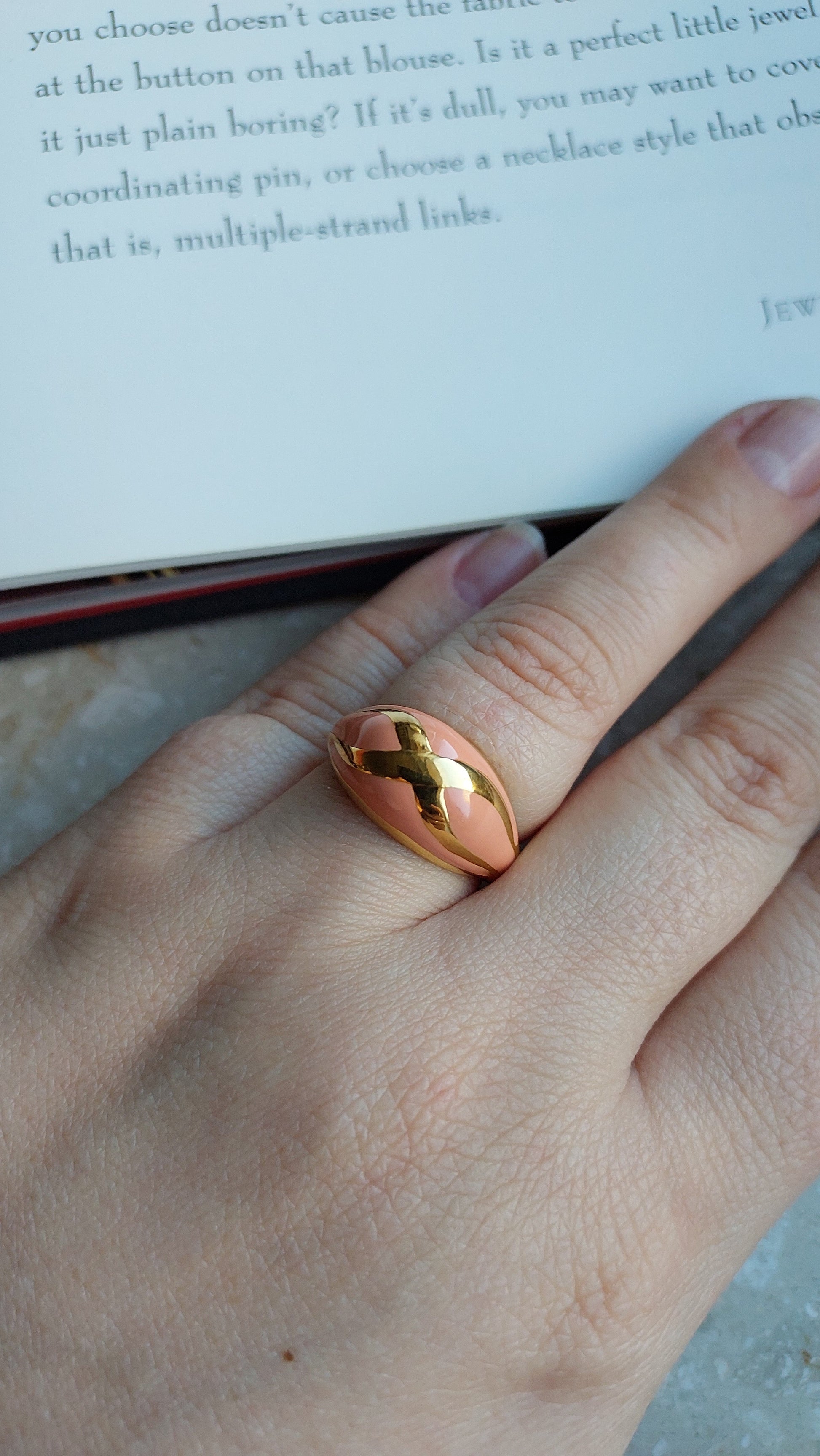 Pierścionek vintage Avon z lat 80–90., wykonany w eleganckim i minimalistycznym stylu. Ma wypukły, kopułowy kształt z gładką powierzchnią. Design łączy złoconą bazę z delikatną emalią w brzoskwiniowym odcieniu, ozdobioną subtelnym złotym wzorem w postaci przecinających się linii. W doskonałym stanie, wygodny, o opływowym kształcie.